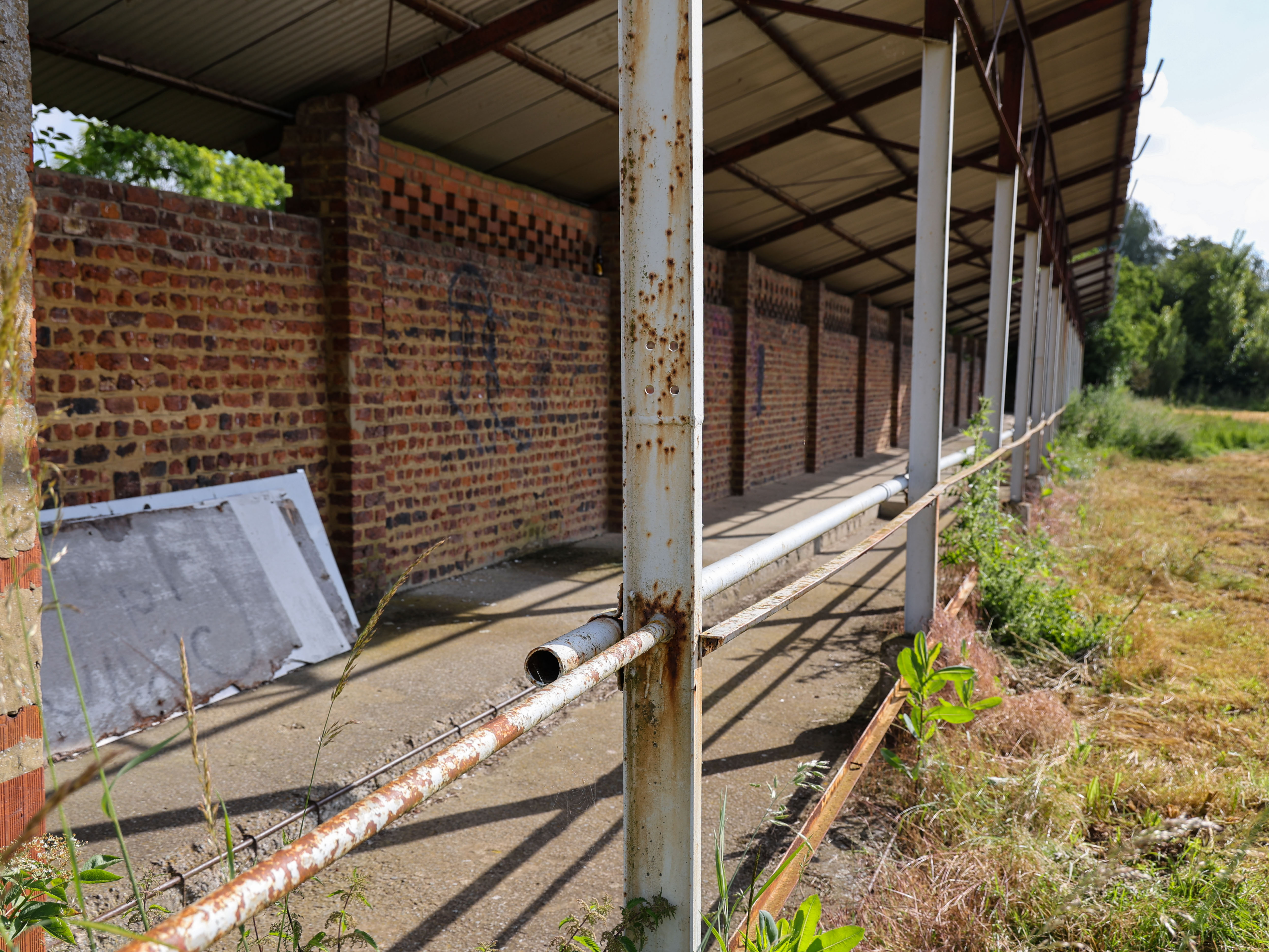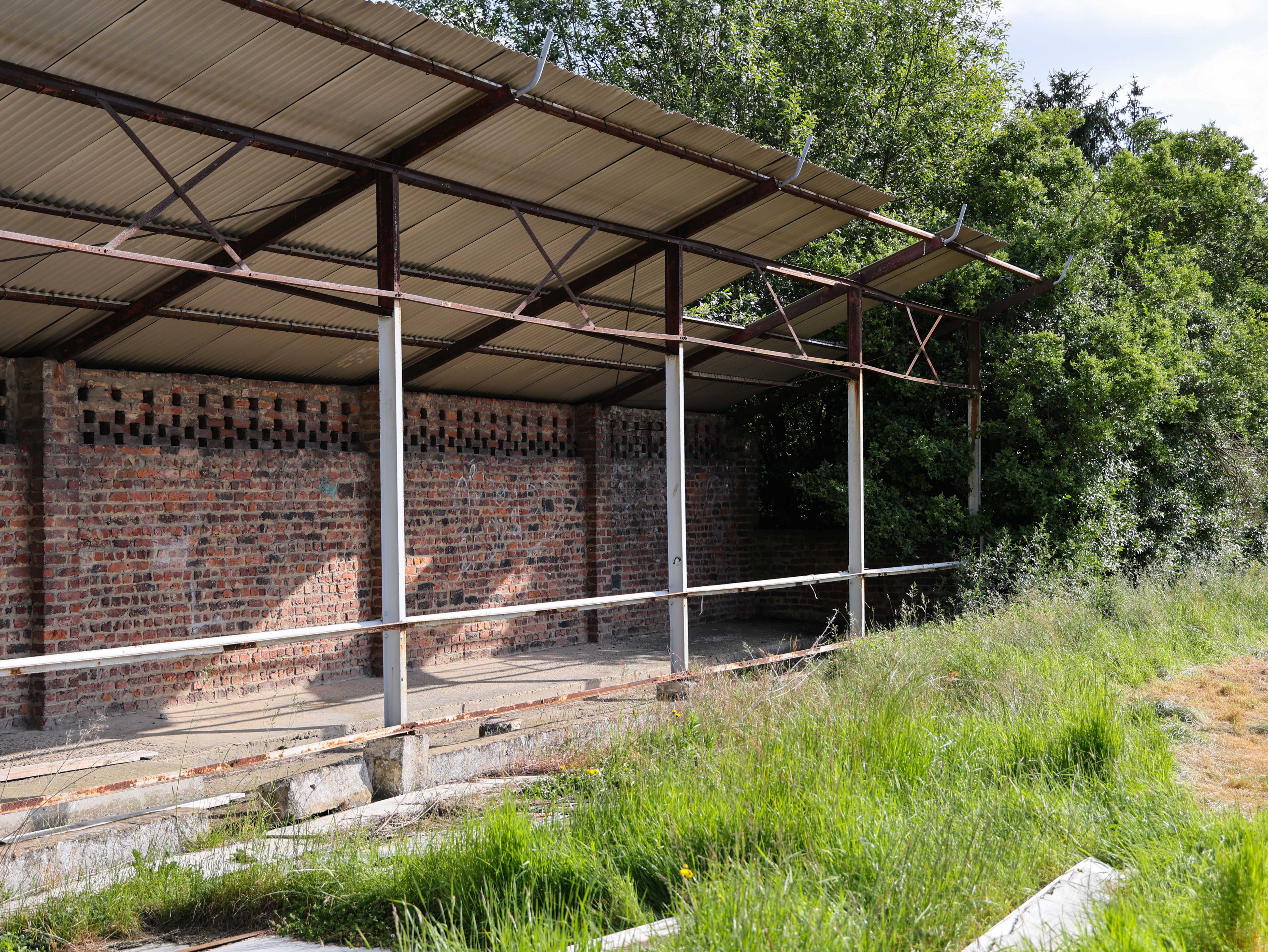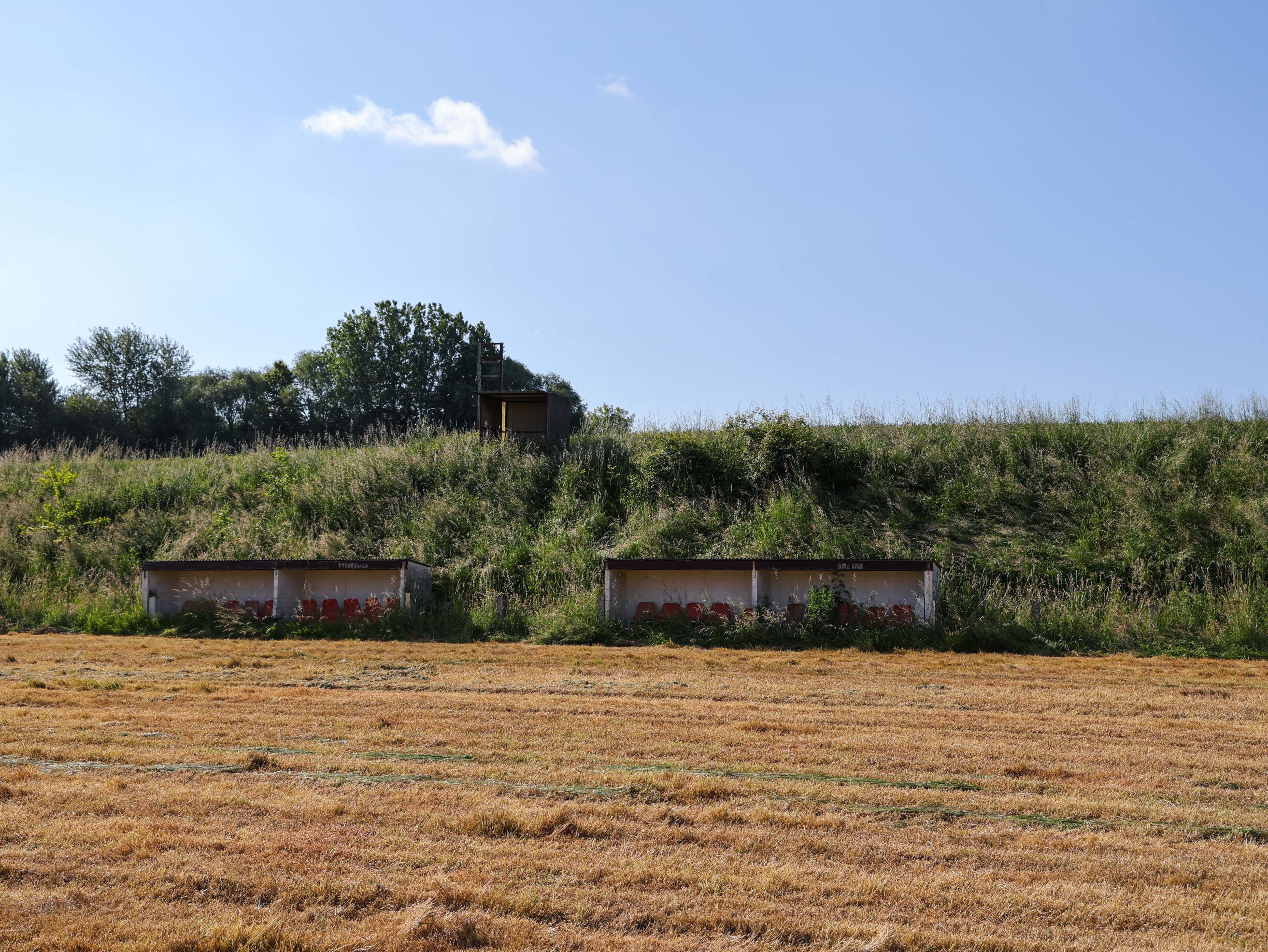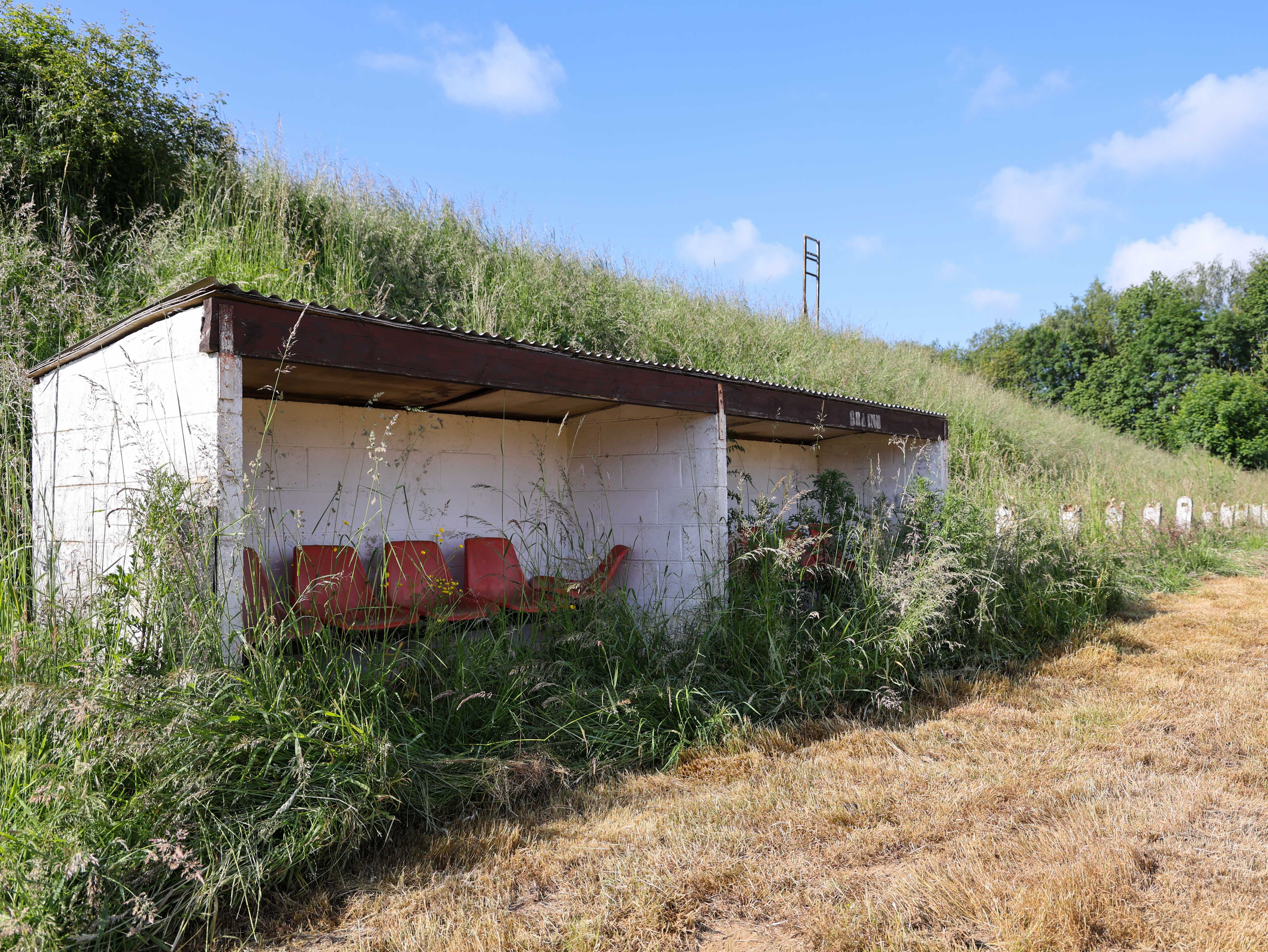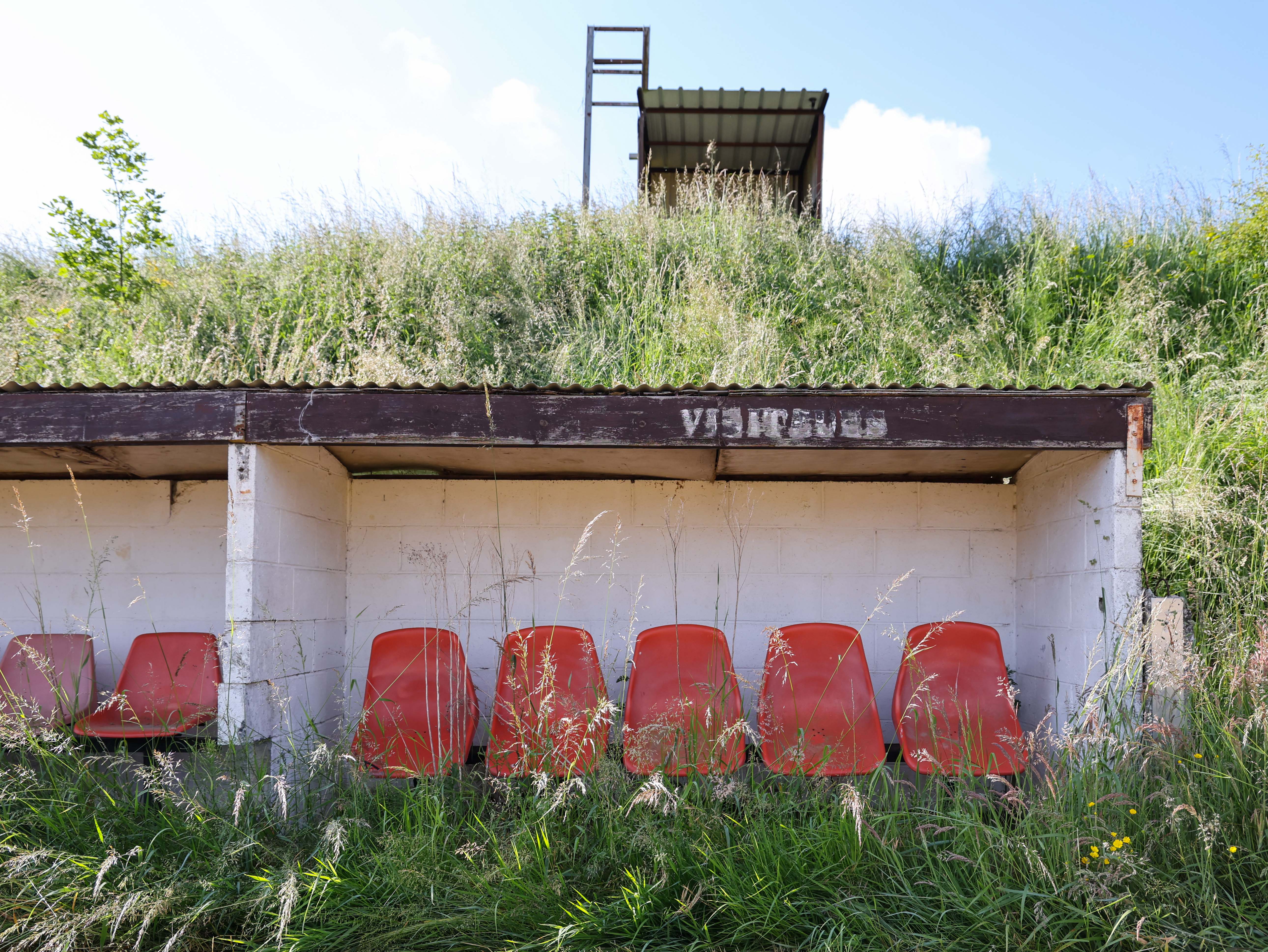 Achter het hek, tussen het wilde gras en de distels, ligt een betonnen herinnering. De dug-out met zijn rode stoelen, zeven op een rij, half verzonken in onkruid dat door de scheuren groeit. Stoelen waar trainers zaten, waar wisselspelers nerveus wachtten, waar hoop en teleurstelling naast elkaar plaatsnamen. Nu zitten er alleen nog grassprietjes tussen de spijlen.