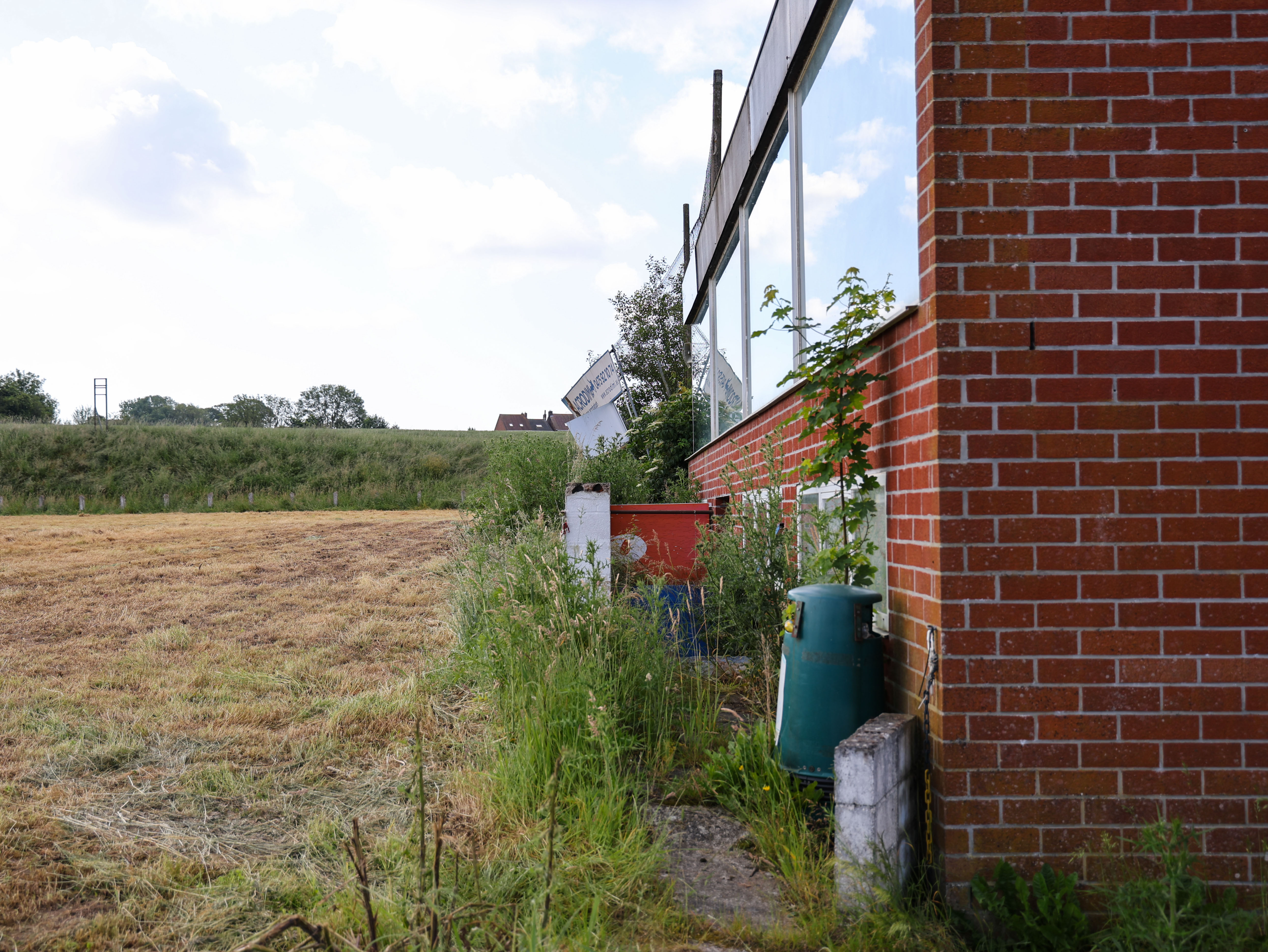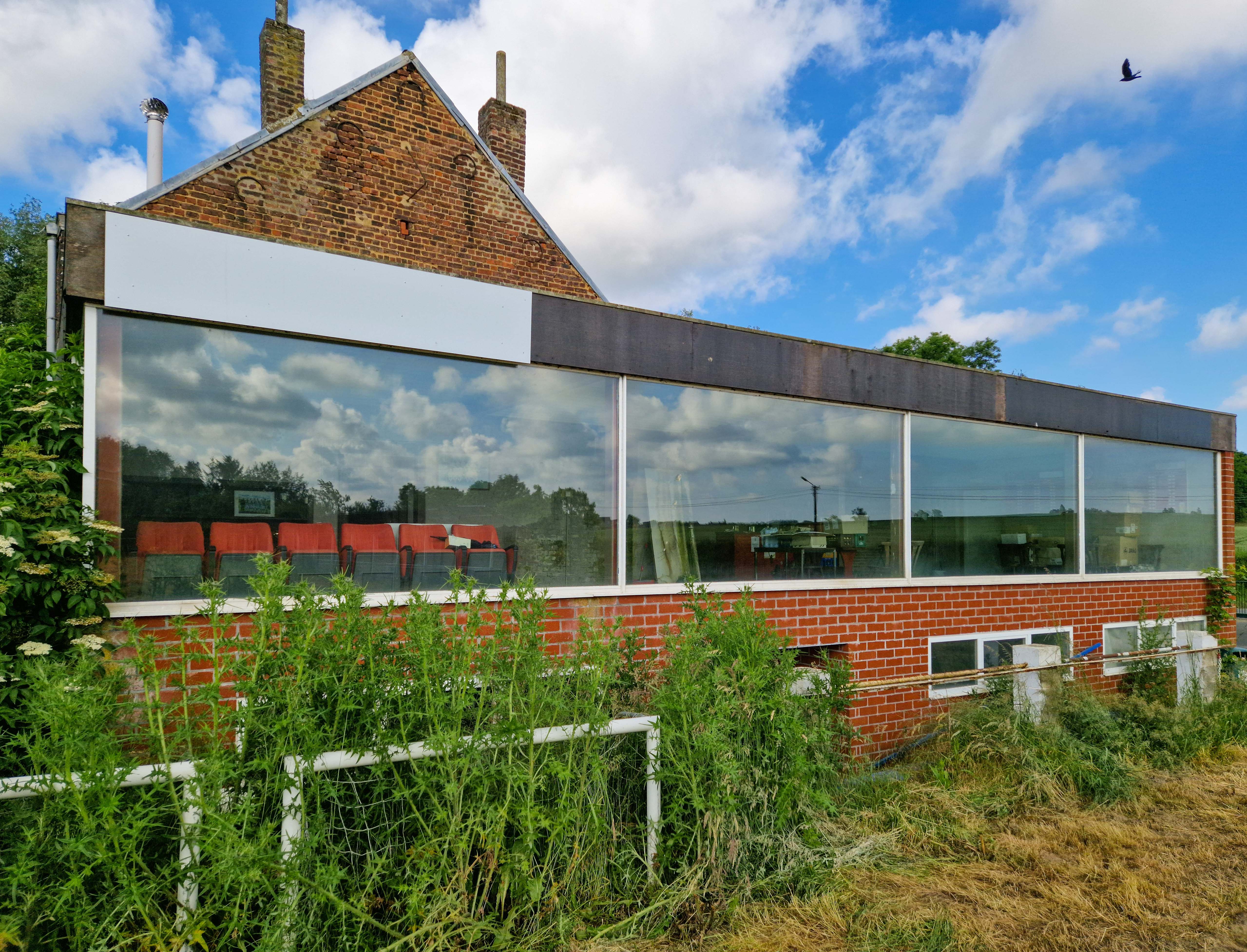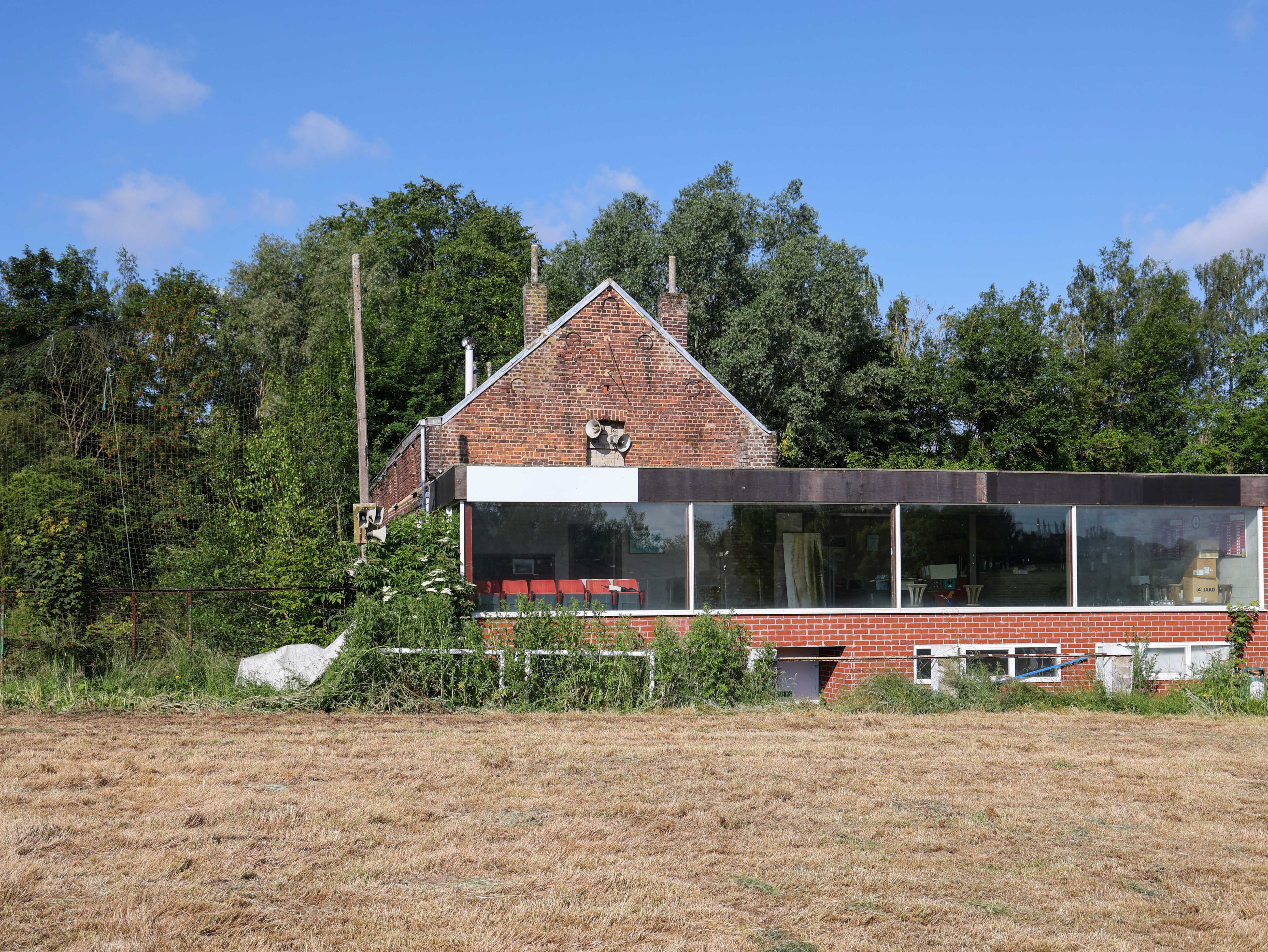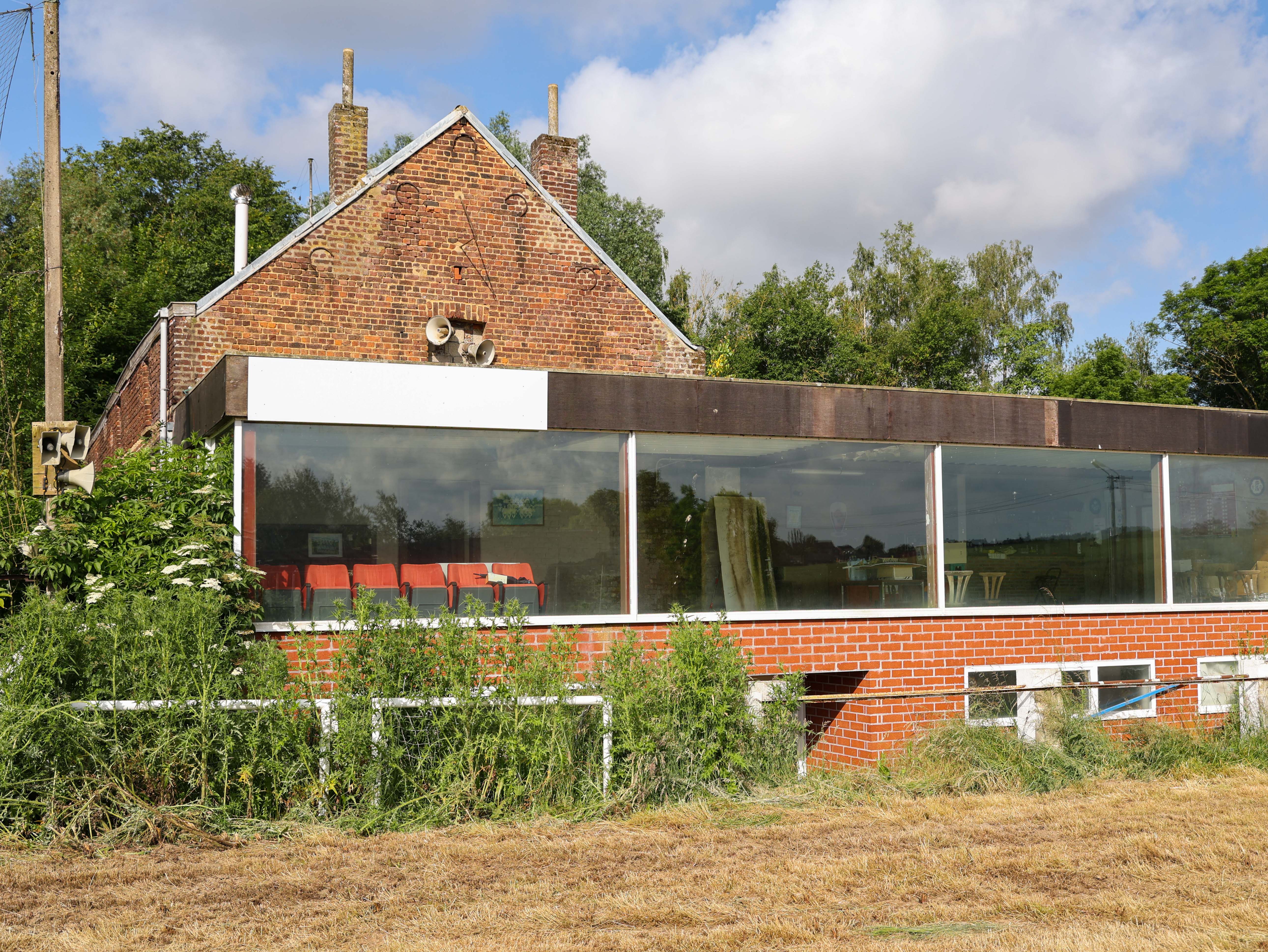 De glazen kantine heeft nog altijd panorama-uitzicht over wat ooit een glorieus veld moet zijn geweest. Rode letters op het glas, verbleekt, bijna onleesbaar. Binnen staan stoelen. Vage silhouetten achter vuil glas, wachtend op supporters die niet meer komen.