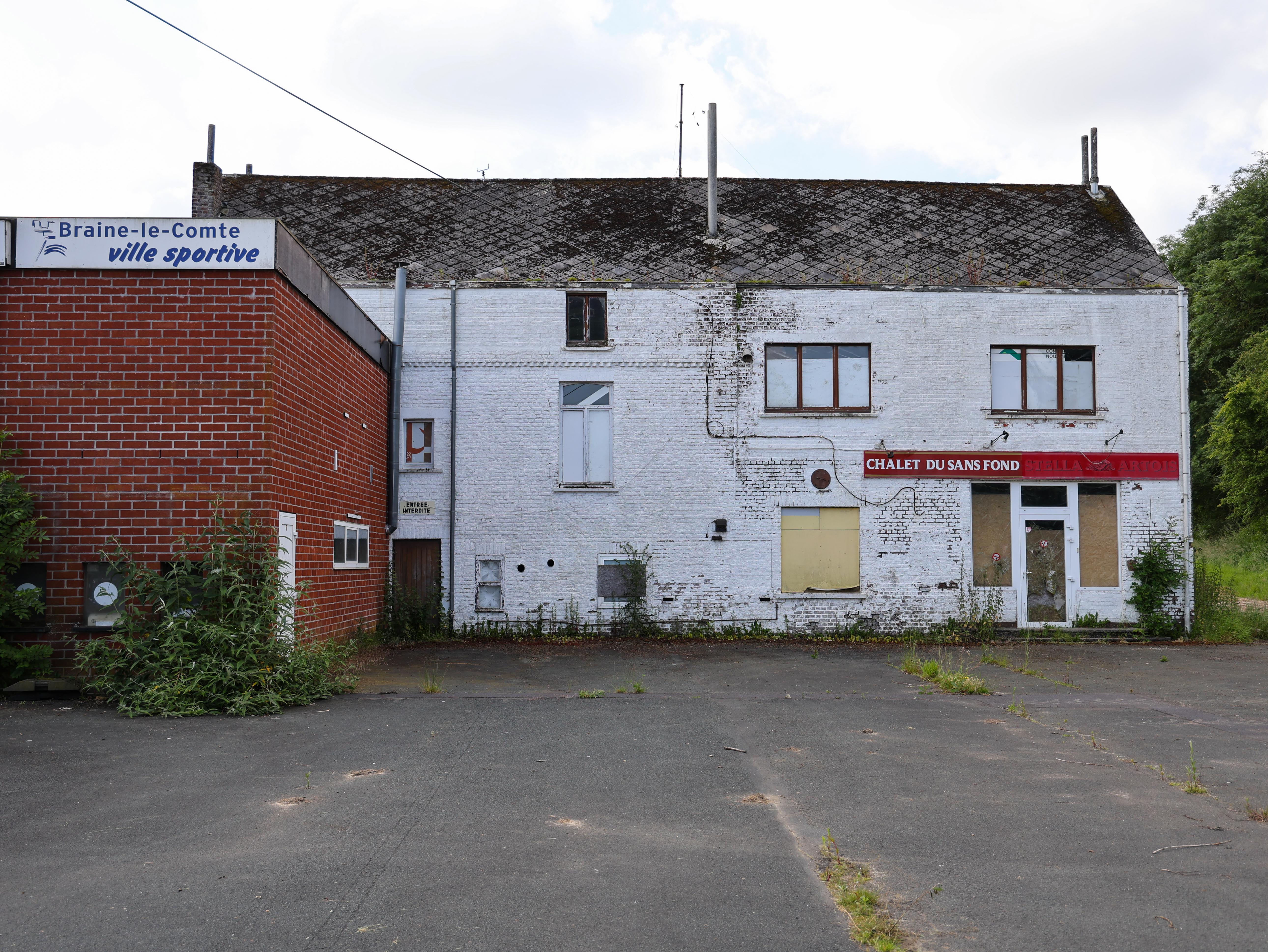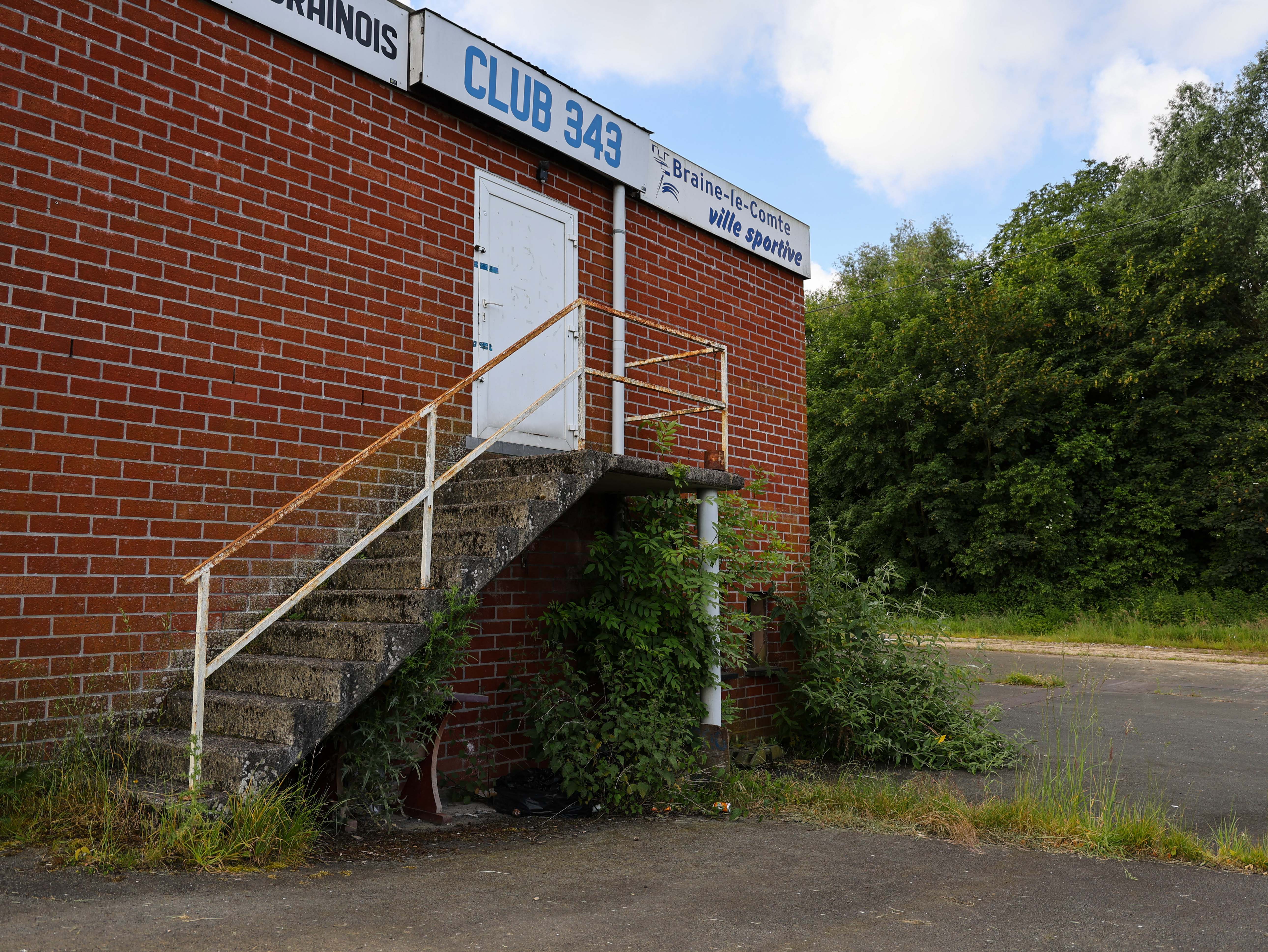Er is een trap. Roestig. Hij leidt naar een deur die niet meer opengaat. Erboven staat: “Braine-le-Comte, ville sportive.” Maar de sport is vertrokken. Alleen Braine-le-Comte bleef.