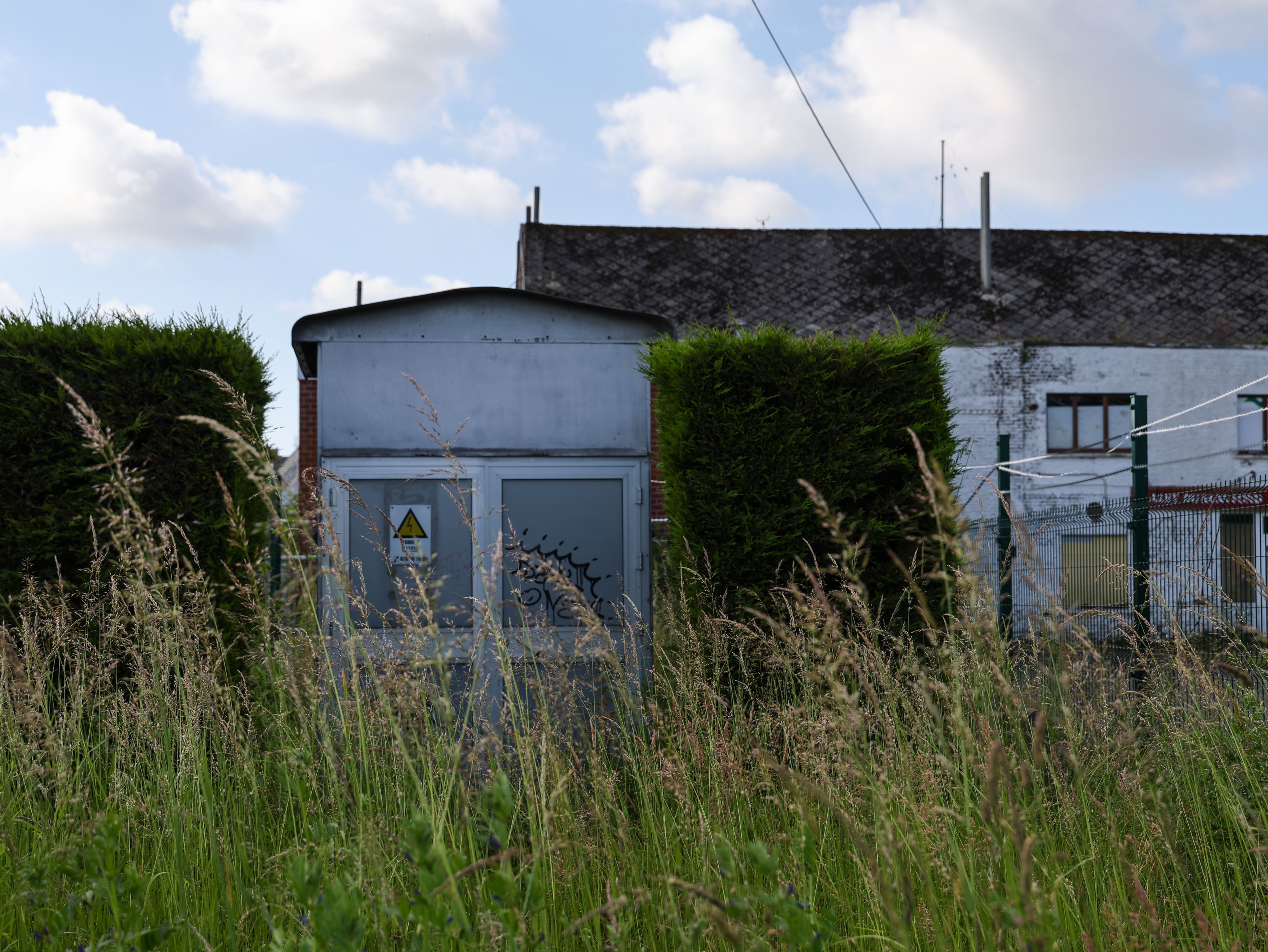 Het dak is begroeid, letterlijk. Een groene golf van wild gras en bloemen rolt over het golfplaat, alsof de natuur zelf supporter is geworden en het veld heeft overgenomen. Een ladder steekt omhoog, roestig, een toren naar nergens. Misschien klom hier ooit iemand op voor beter zicht, voor een reparatie, voor een laatste blik voordat alles stilviel.