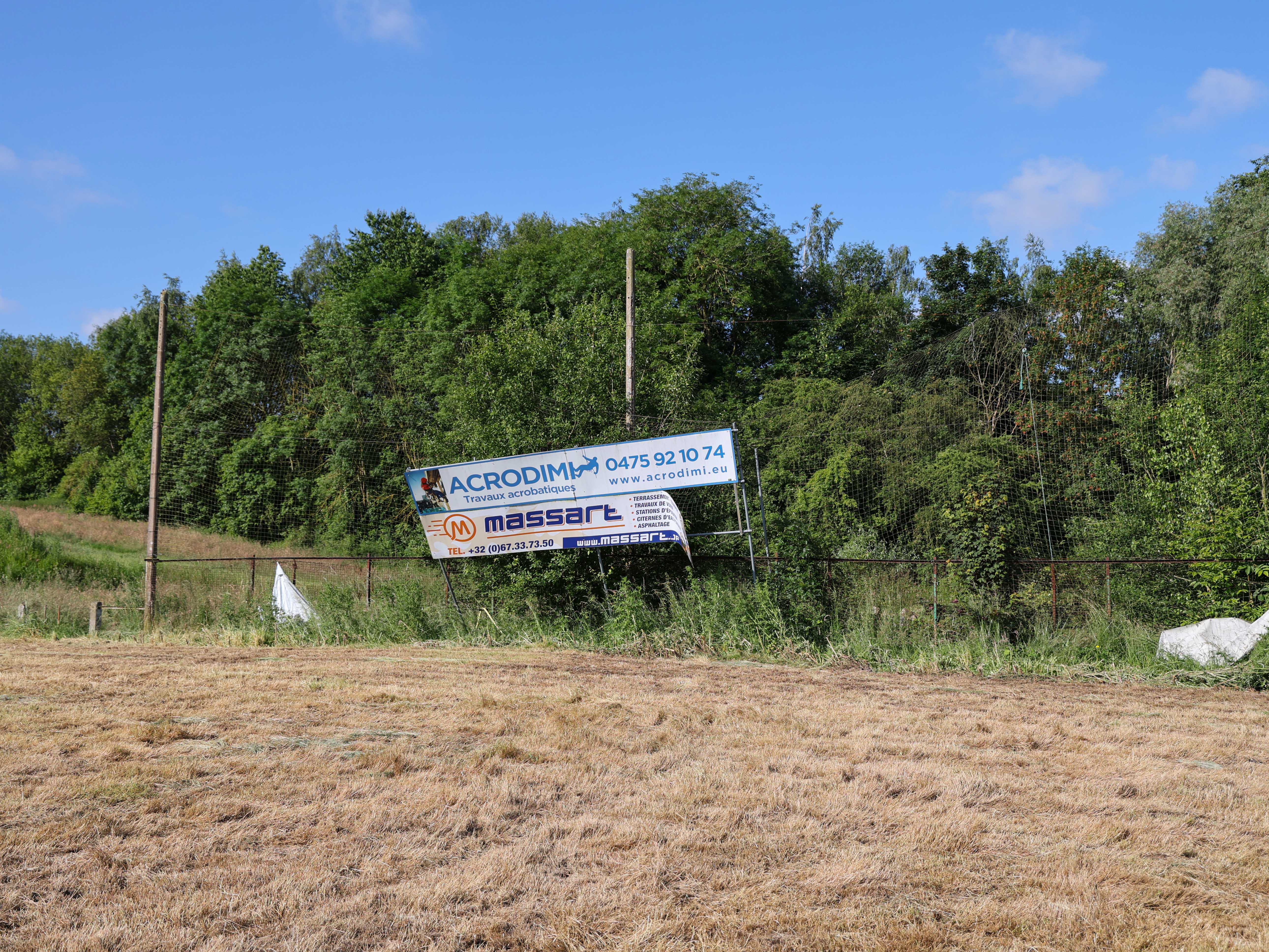 En dan het veld zelf, of wat ervan over is. Een patchwork van droog, uitgeleefd gras en kale aarde. Palen en touwen, misschien ooit doel- of trainingsmateriaal, nu kronkelige sculpturen in een openluchtmuseum van vergeten zondagen.