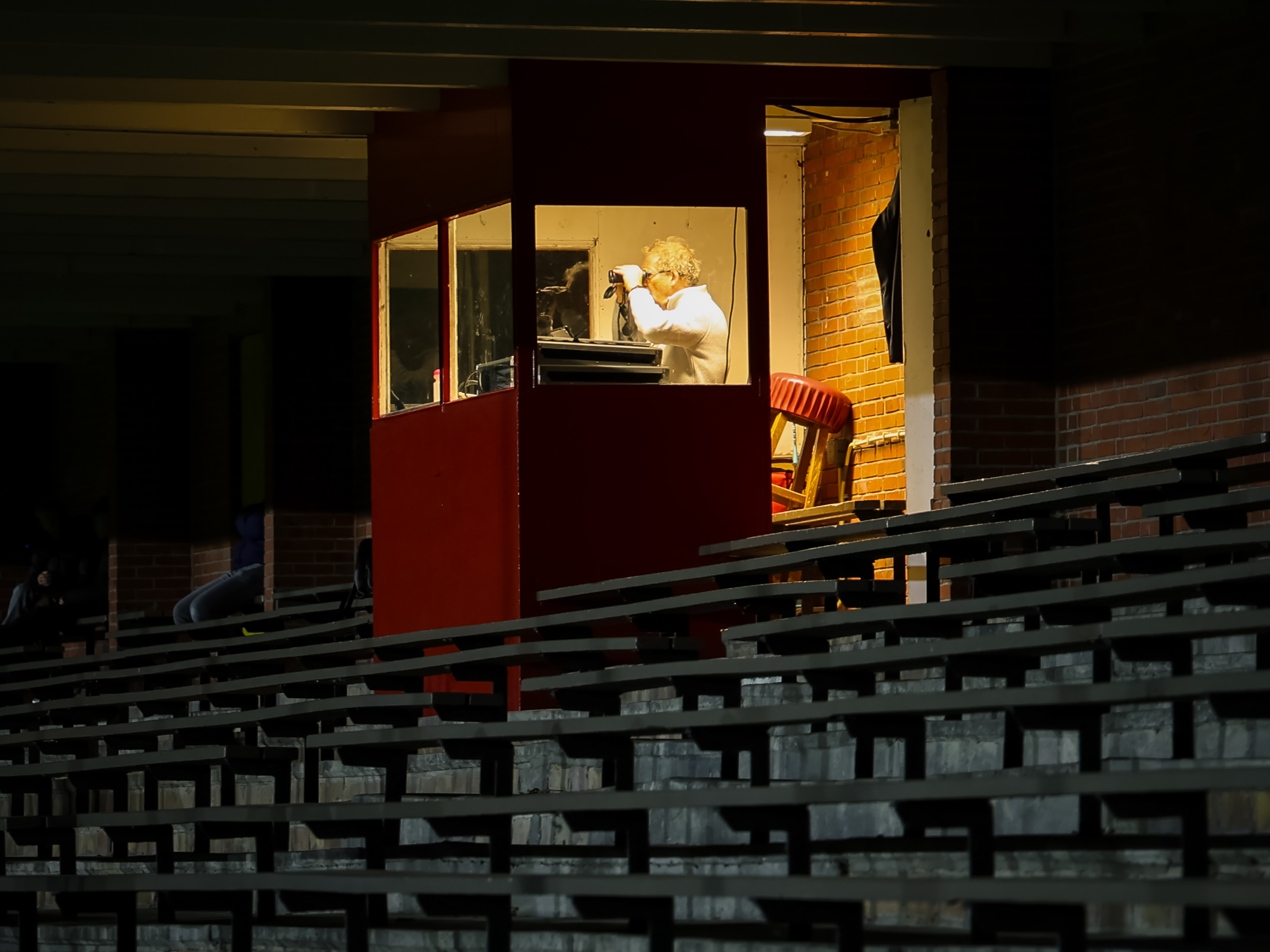 Zijn hokje is rood, hoog, een vuurtoren die niet schijnt maar spreekt.