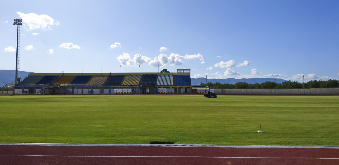 Na twee heerlijke stranddagen vindt mijn vrouw het tijd om iets van het eiland te zien. Met een streekbus kun je voor € 1,80 een deel van het (bebouwde deel) van het eiland zien. Vlak voor het eindpunt zie ik ineens een paar lichtmasten en terwijl de passagiers om mijn heen het stadje in zich op proberen te nemen, wiebel ik onrustig op mijn stoel. Vanaf de busbaan kan ik het tribunedeel wat Google mij al wekenlang kietelde zien. “Mooi, Zakynthos FC gevonden!”, denk ik hardop.