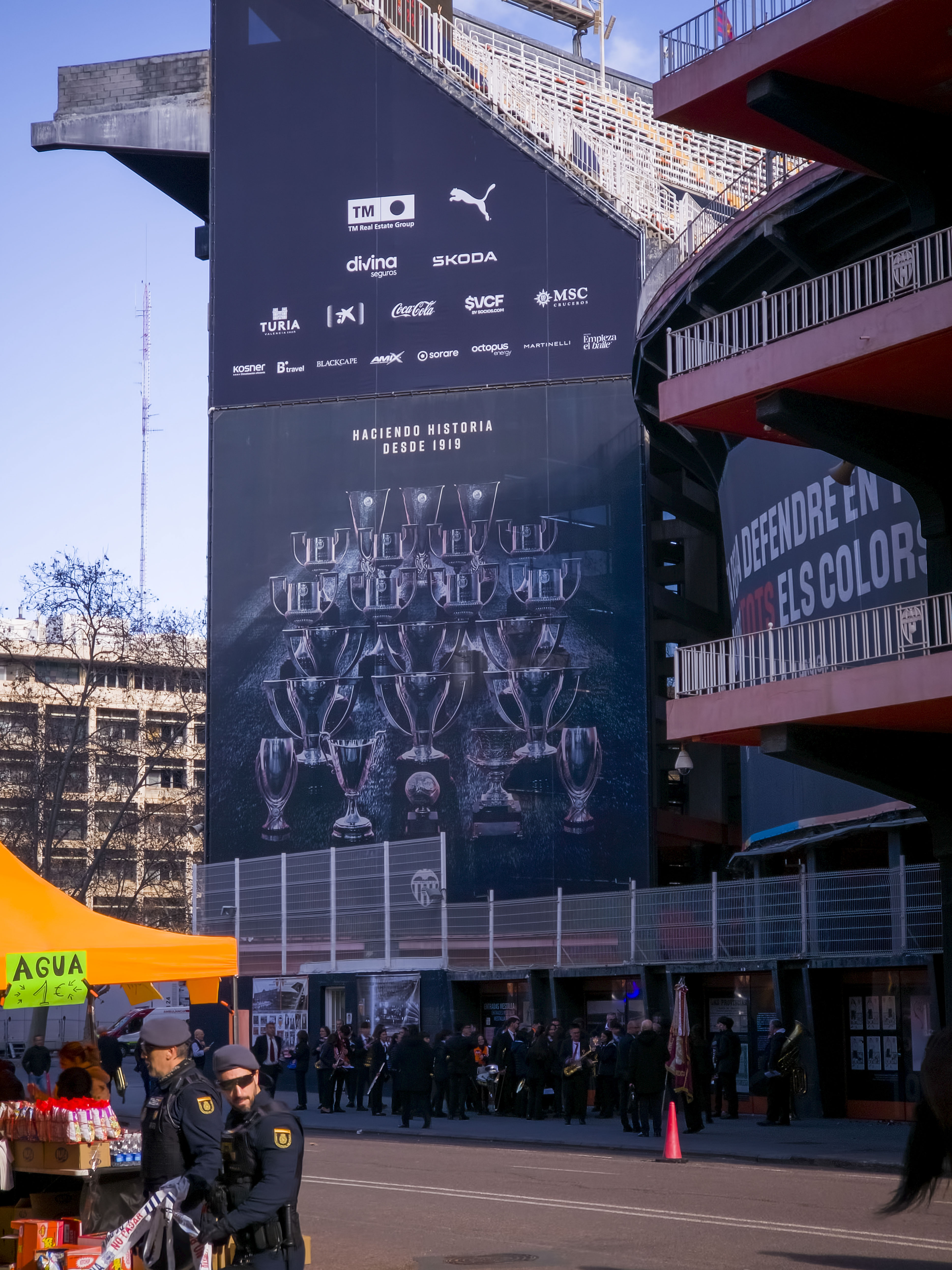 En dus stond ik nu, bijna vijf jaar later, opnieuw voor de hoofdingang. De helft van onze groep was op bierjacht, de andere helft bleef bij mij hangen in de zon. Ik stuurde een foto naar mijn groundhopmaatjes en kreeg vrijwel direct terug: “Ik mis de band!” En precies op dat moment kwam de band de hoek om. Alsof Mestalla me een knipoog gaf.