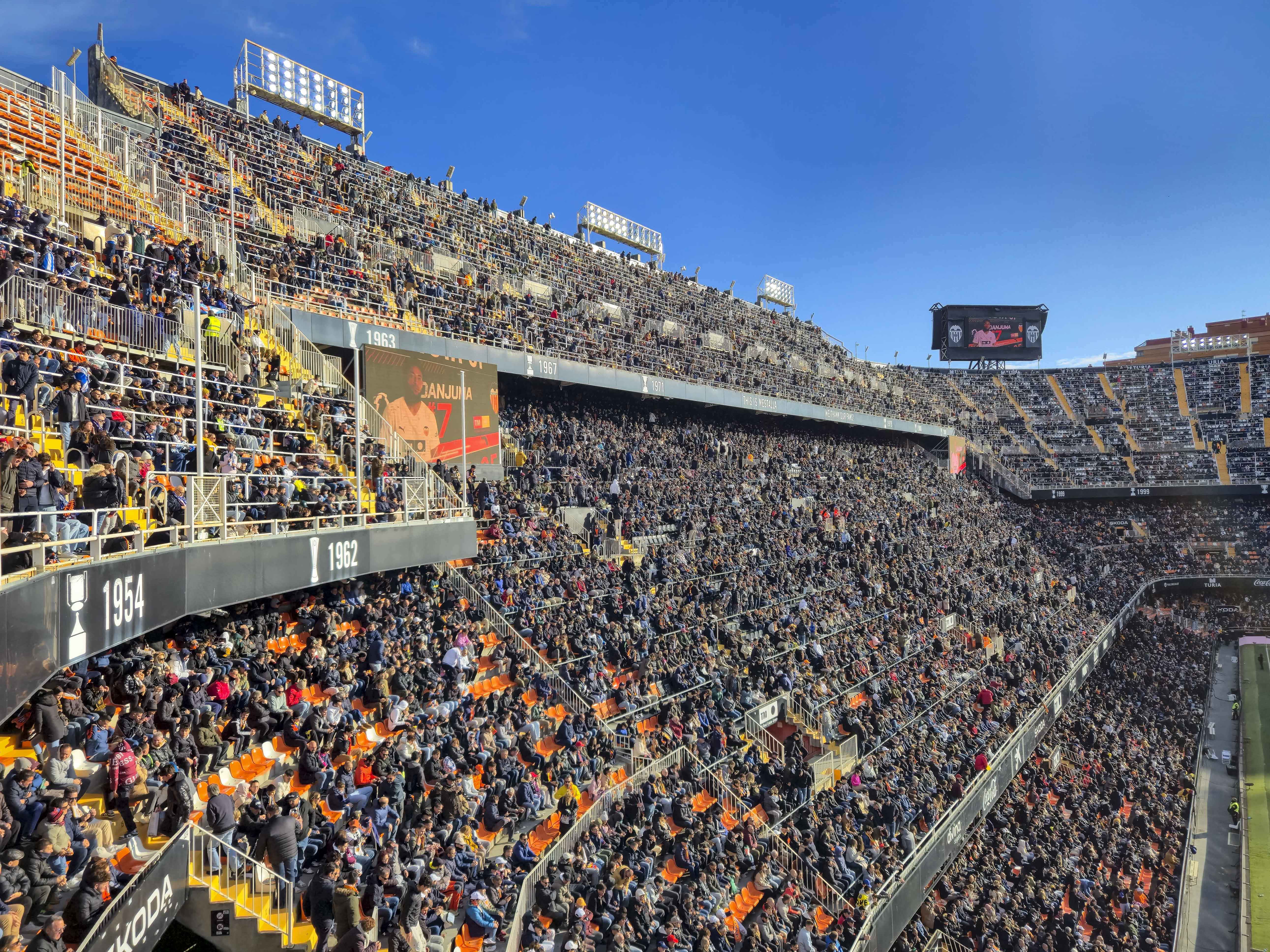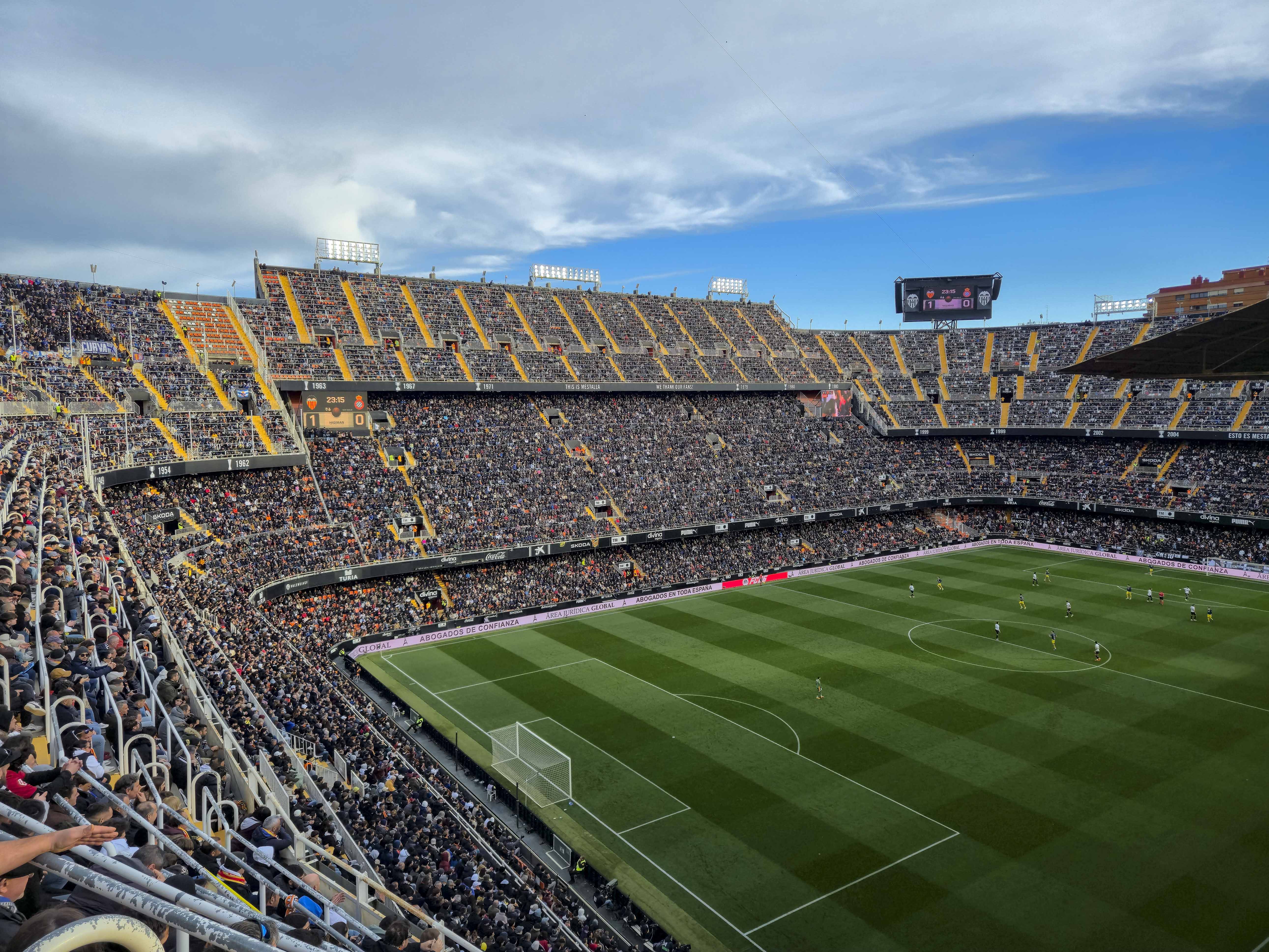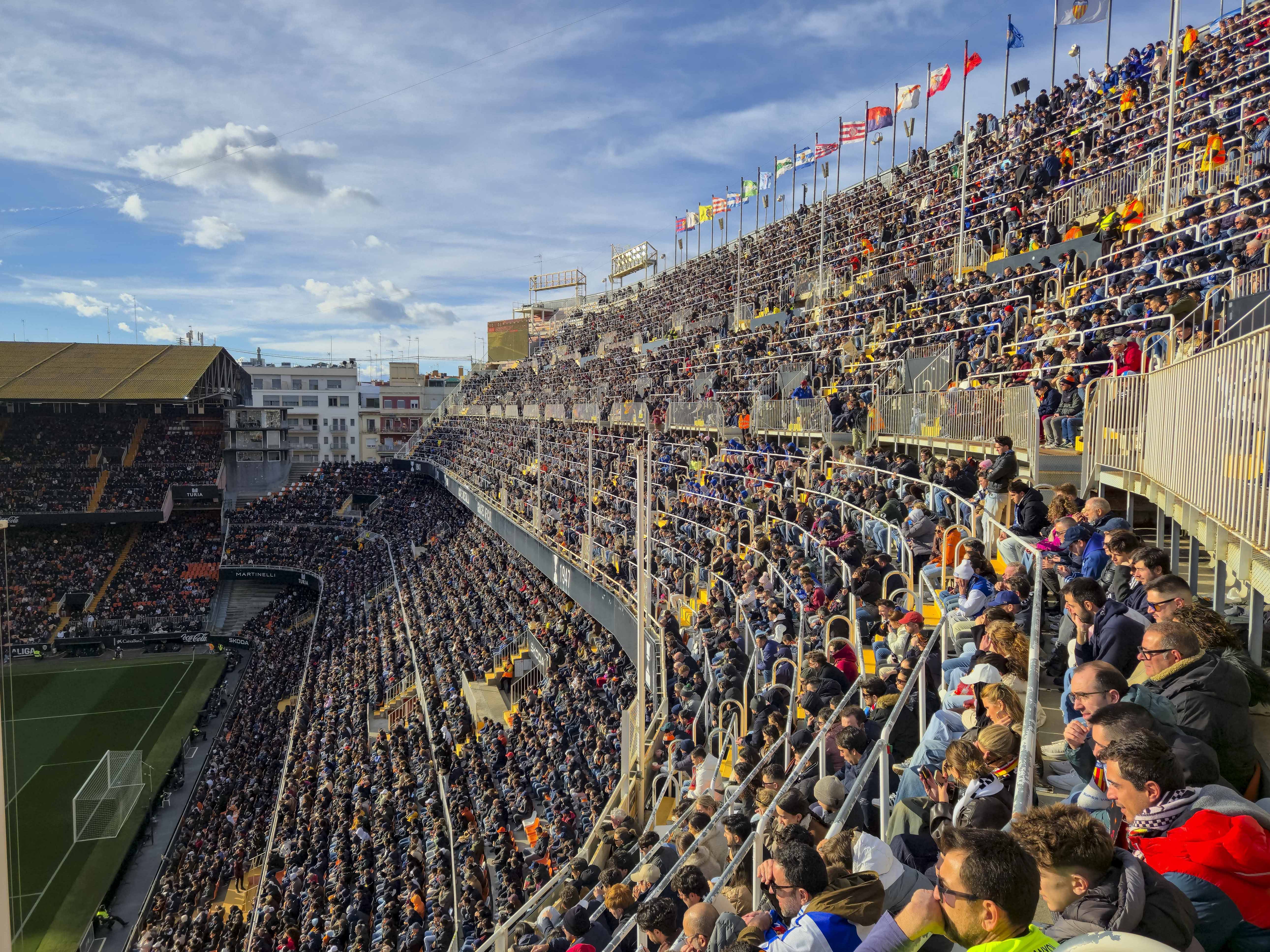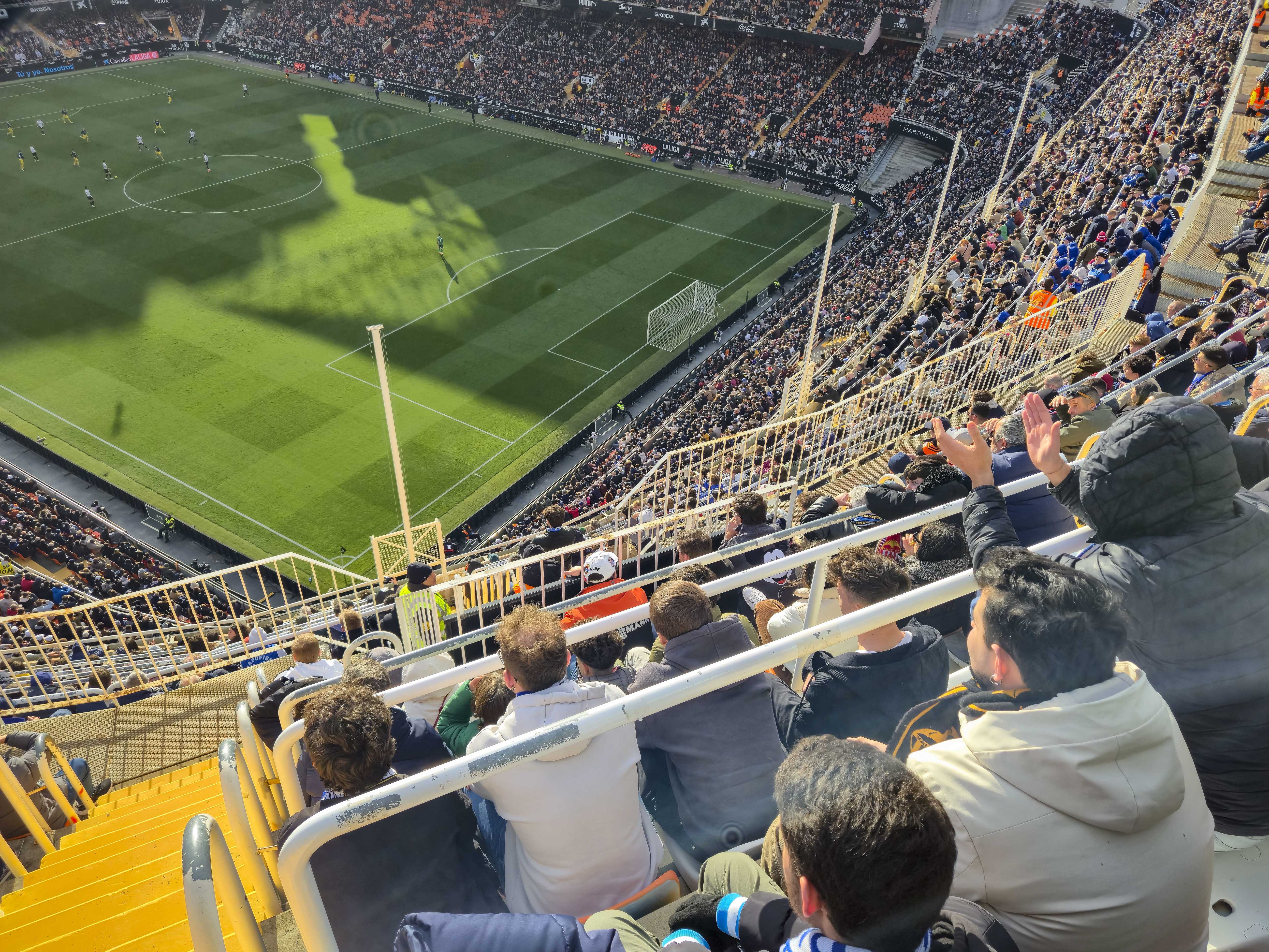 Mijn eerste bezoek, in mei 2021, was een middag die nog altijd ergens in mijn geheugen schuurt. Hier schreef ik destijds dit verhaal over. De protesten tegen Peter Lim hadden het stadion leeggetrokken en de straat ervoor juist volgestroomd. Duizenden supporters met gele borden, zingend, roepend, maar zonder wanklank, terwijl binnen acht uitsupporters, een paar familieleden en vier Nederlandse groundhoppers zich afvroegen of ze per ongeluk een besloten oefenpotje hadden bijgewoond. Ik zat hoog, bijna tegen de hemel aan, en keek meer naar de protesterende massa buiten dan naar het veld. Het was voetbal als decorstuk, en de echte wedstrijd speelde zich op straat af. Het voelde onaf. Alsof Mestalla me nog iets verschuldigd was. Of ik het stadion.