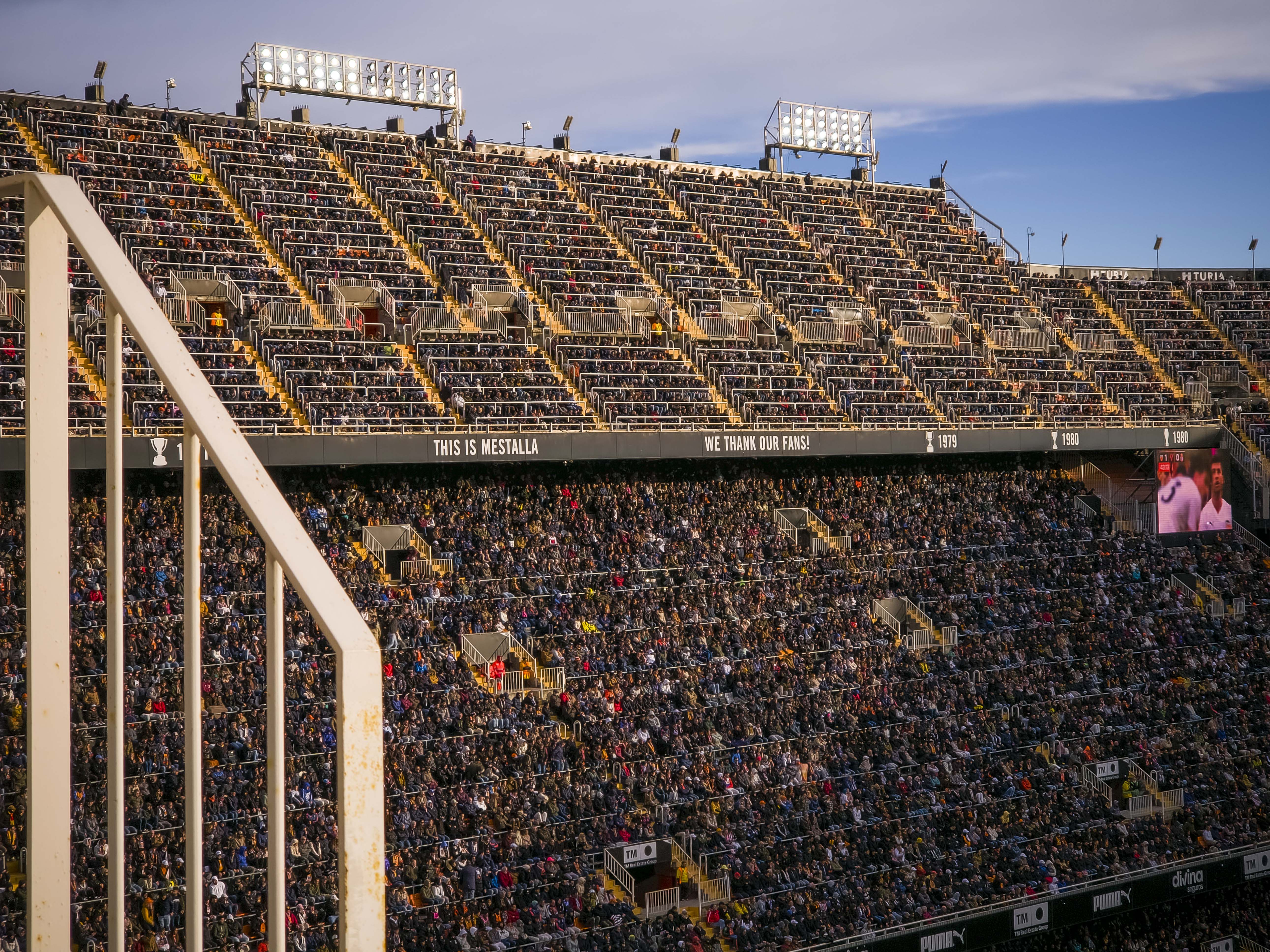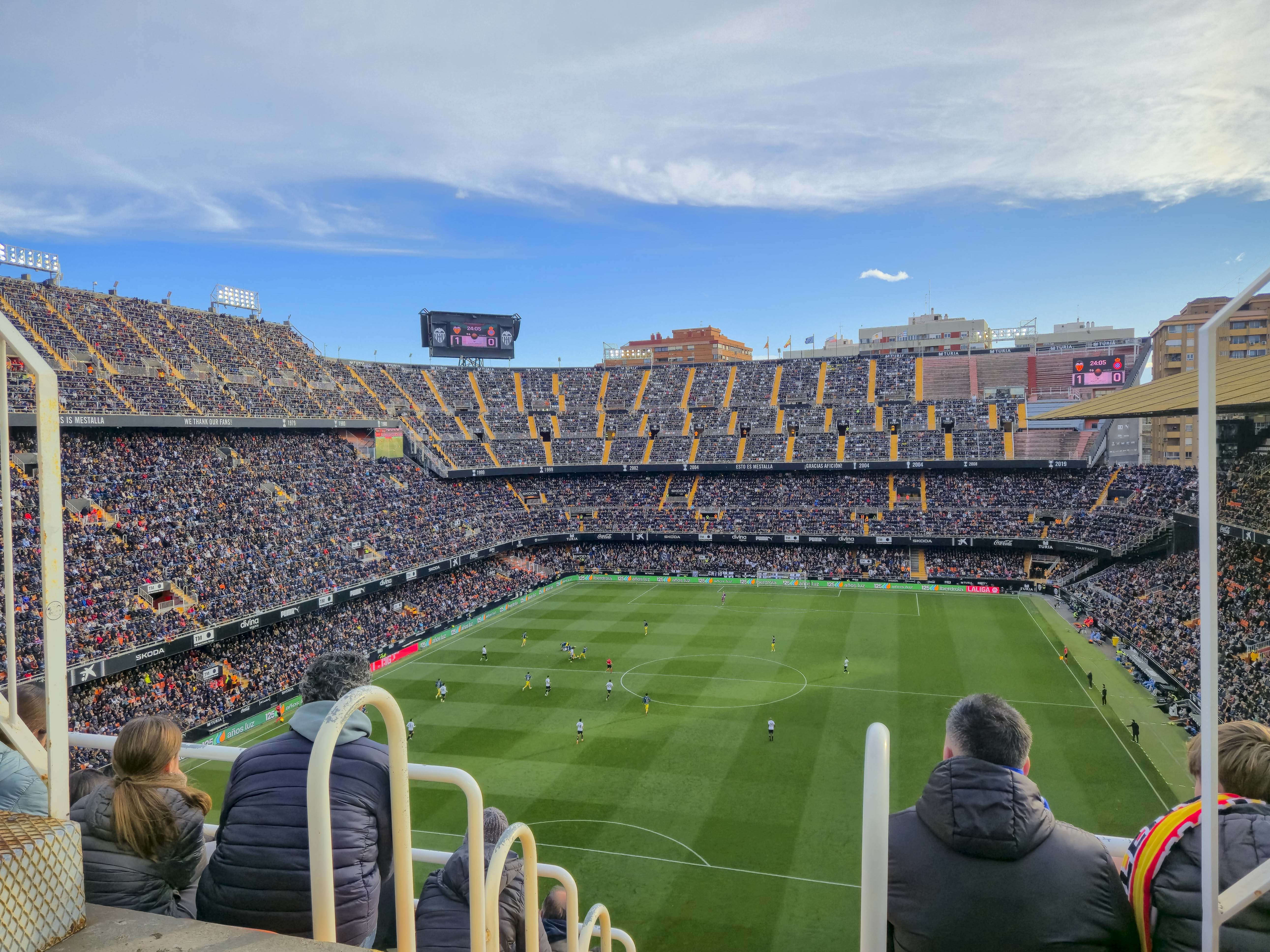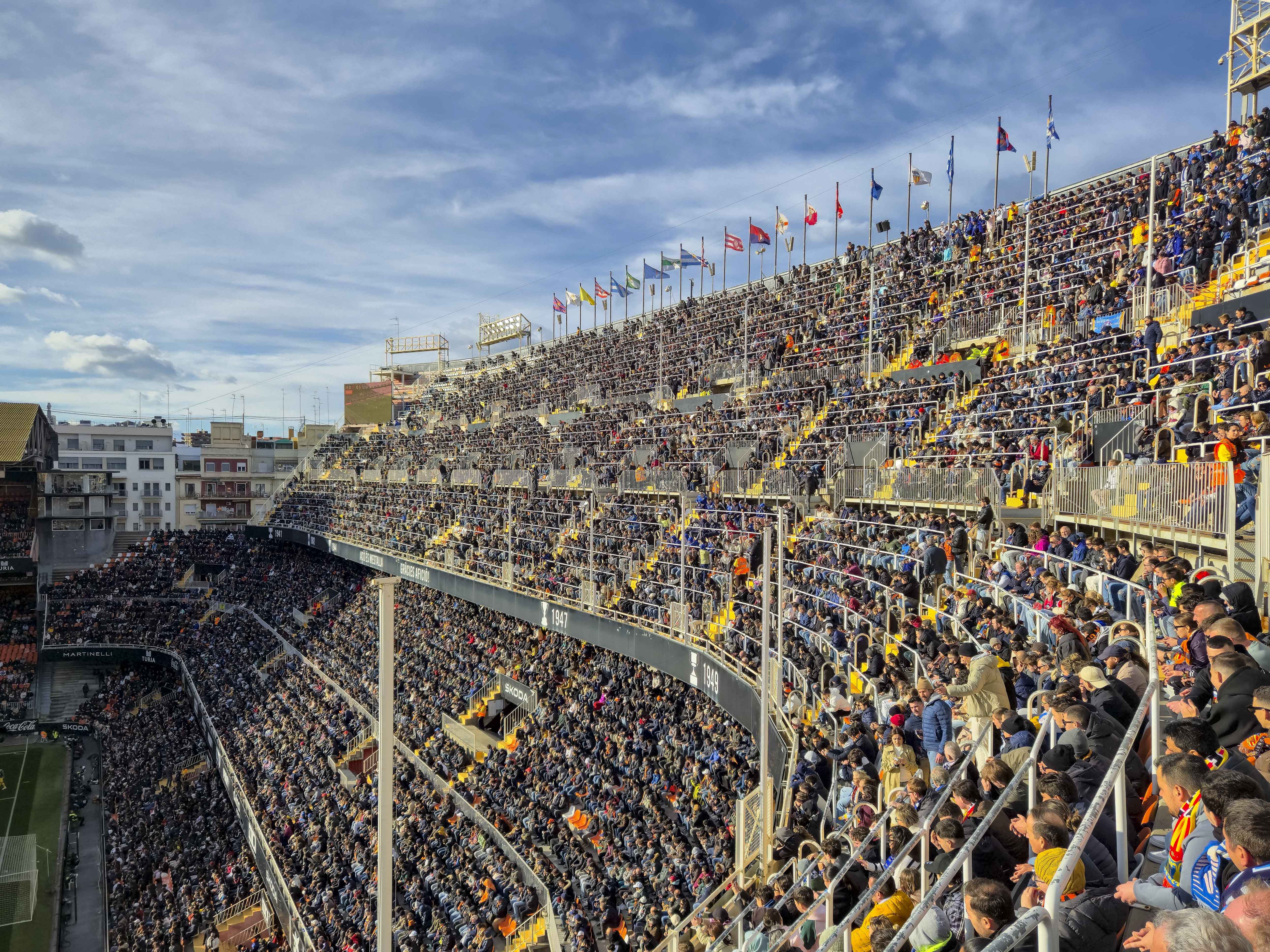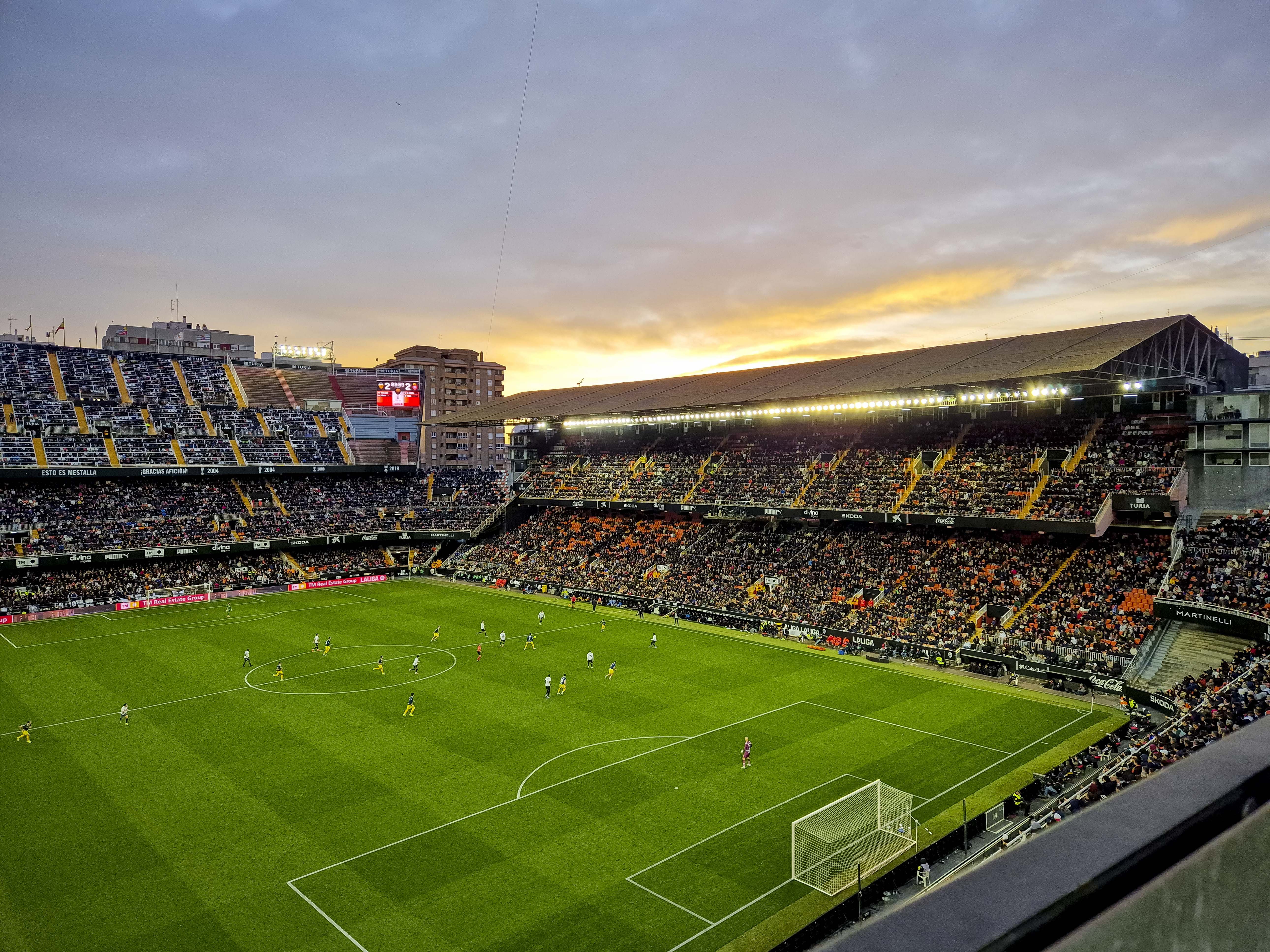Mijn eerste bezoek, in mei 2021, was een middag die nog altijd ergens in mijn geheugen schuurt. Hier schreef ik destijds dit verhaal over. De protesten tegen Peter Lim hadden het stadion leeggetrokken en de straat ervoor juist volgestroomd. Duizenden supporters met gele borden, zingend, roepend, maar zonder wanklank, terwijl binnen acht uitsupporters, een paar familieleden en vier Nederlandse groundhoppers zich afvroegen of ze per ongeluk een besloten oefenpotje hadden bijgewoond. Ik zat hoog, bijna tegen de hemel aan, en keek meer naar de protesterende massa buiten dan naar het veld. Het was voetbal als decorstuk, en de echte wedstrijd speelde zich op straat af. Het voelde onaf. Alsof Mestalla me nog iets verschuldigd was. Of ik het stadion.
