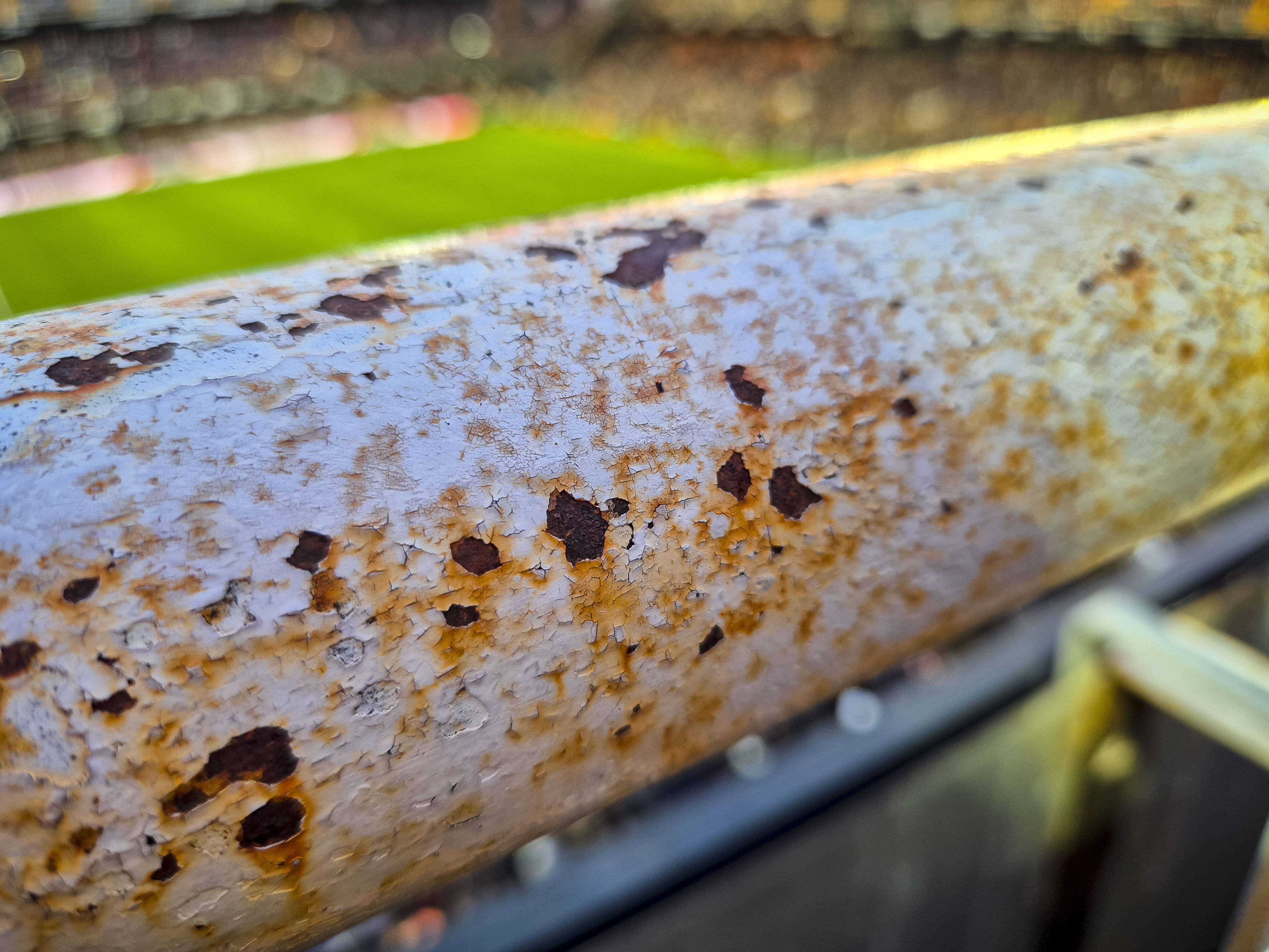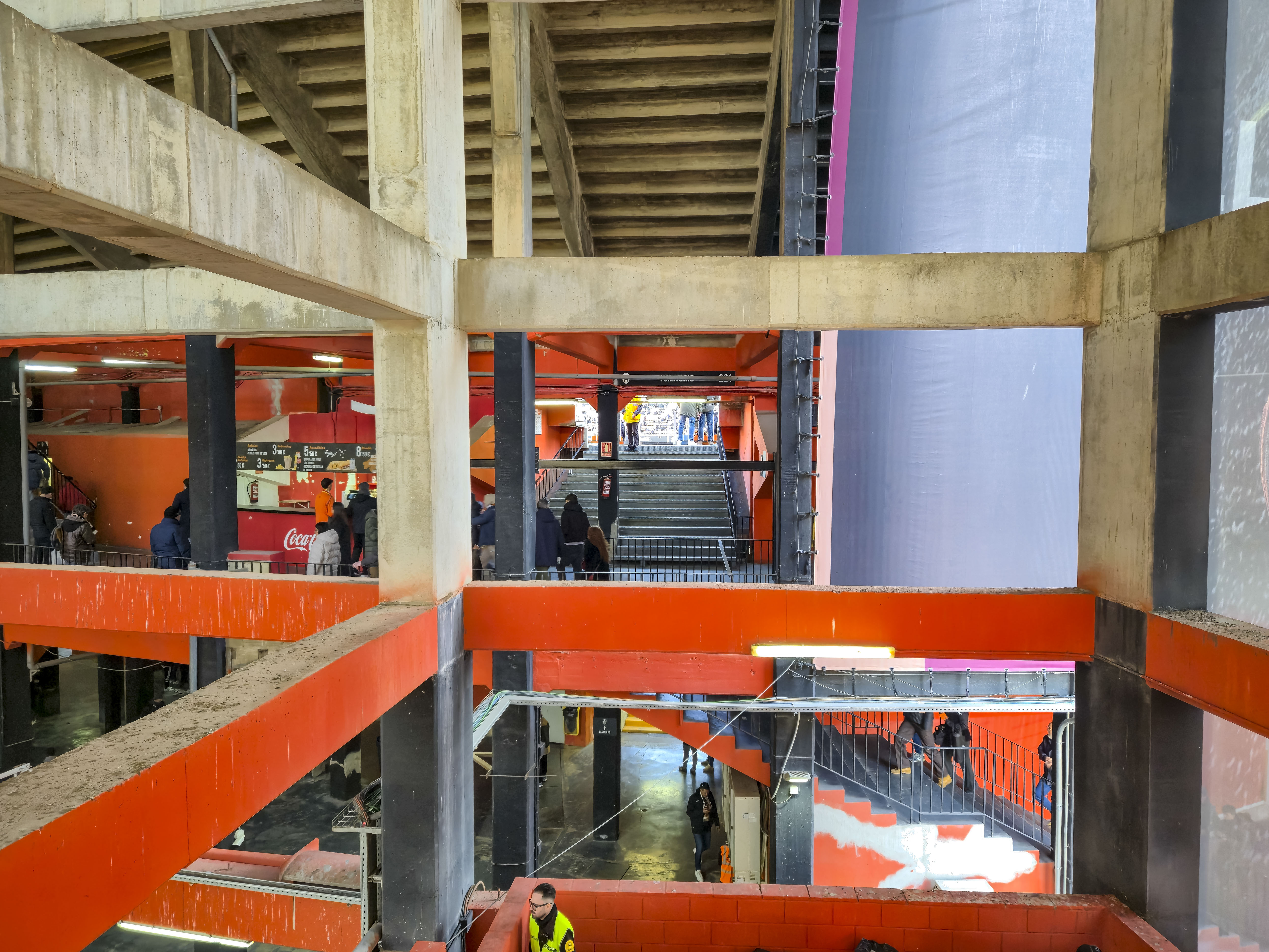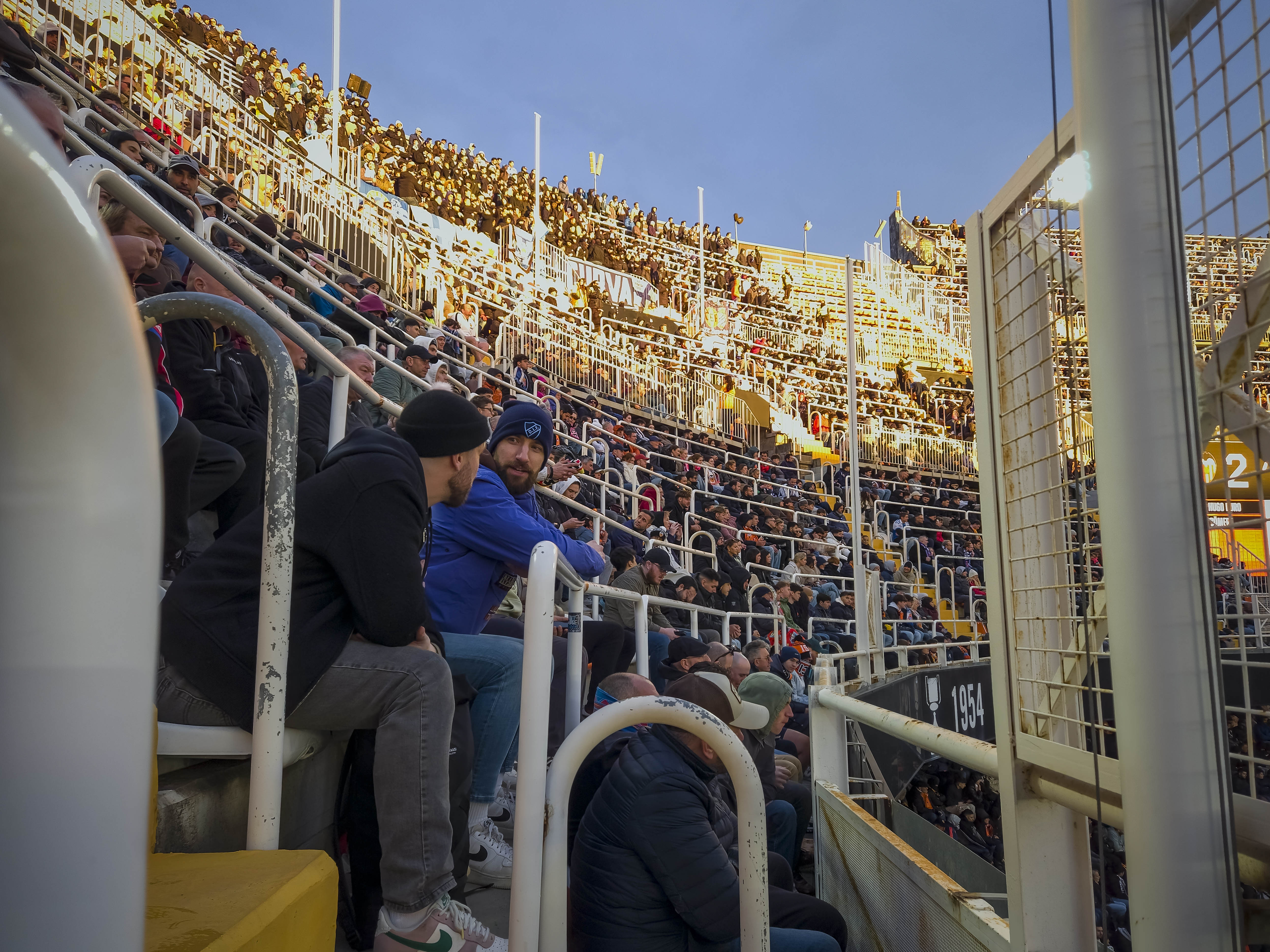 Na nog een biertje zochten we onze ingang en begon de klim. Mestalla is steil, maar niet zomaar steil. Het is een stadion dat je uitlacht terwijl je naar boven klautert, alsof het wil zeggen: kom maar, laat maar zien wat je waard bent. Met de tong op de schoenen bereikte ik de tweede ring. Eerste rij. Klinkt mooi. Is het niet. Precies op ooghoogte liep een stalen buis, waarschijnlijk bedoeld als extra veiligheid, maar vooral een reminder dat romantiek en realiteit elkaar in Spaanse stadions nog weleens kruisen.
