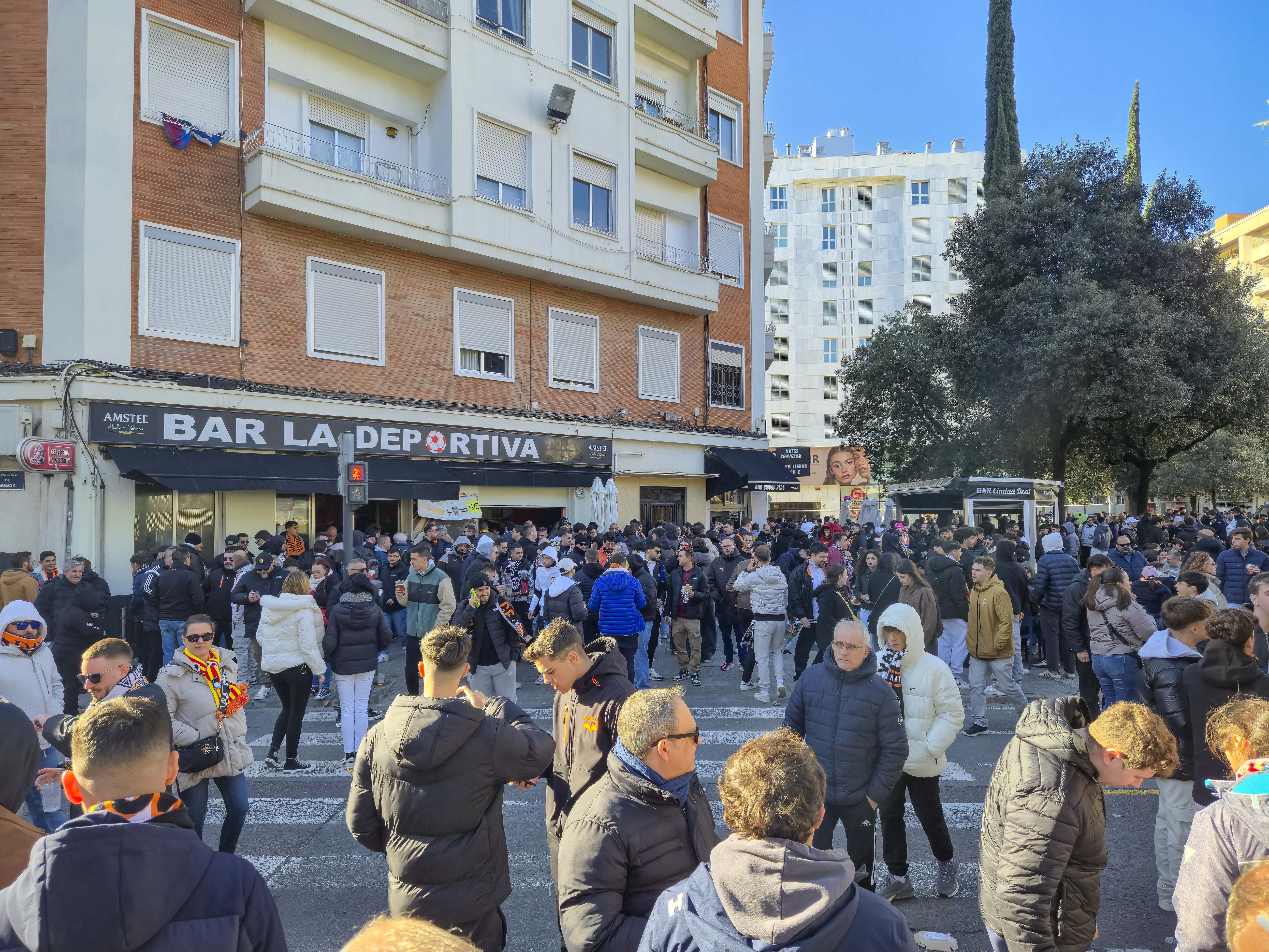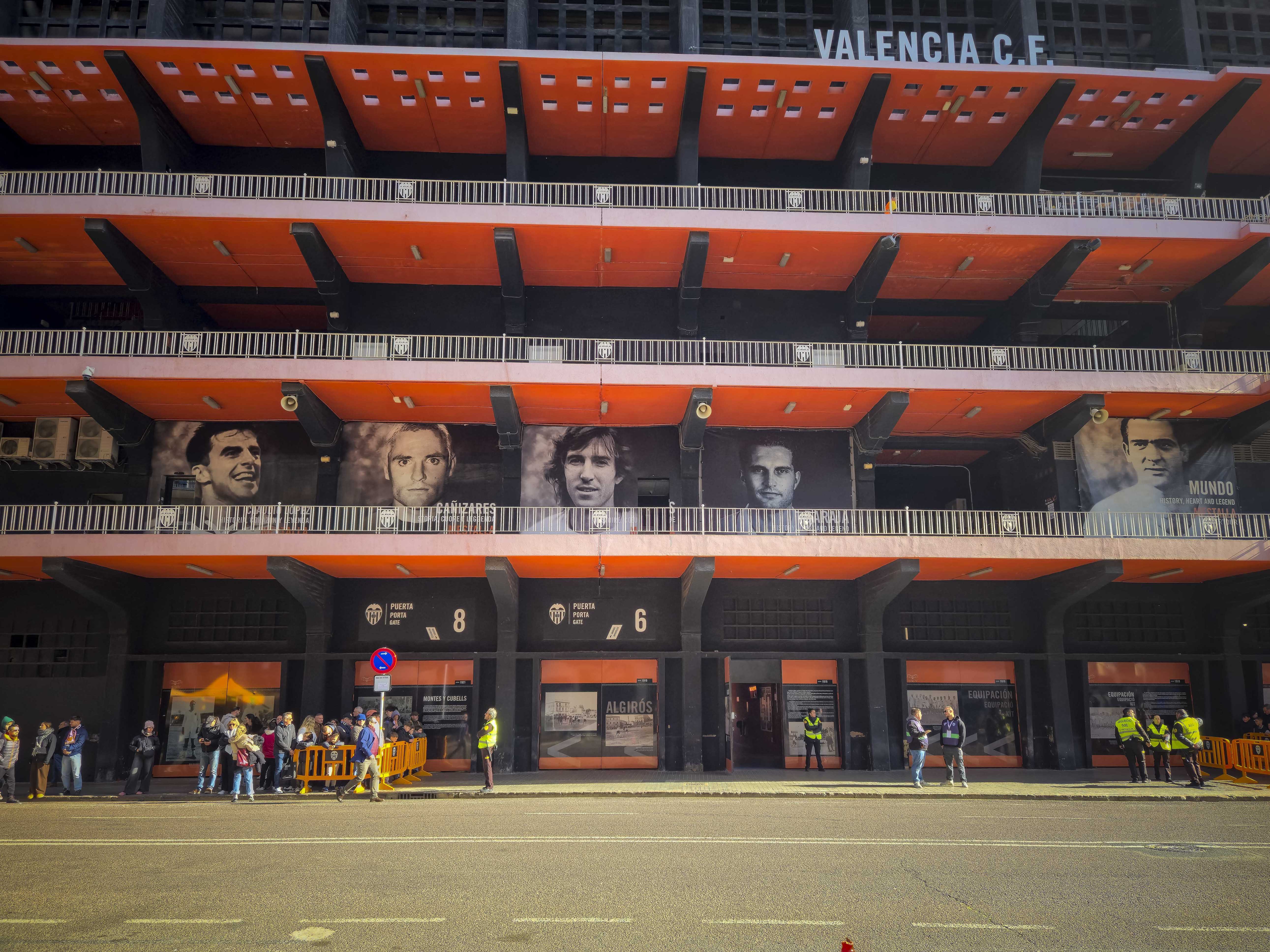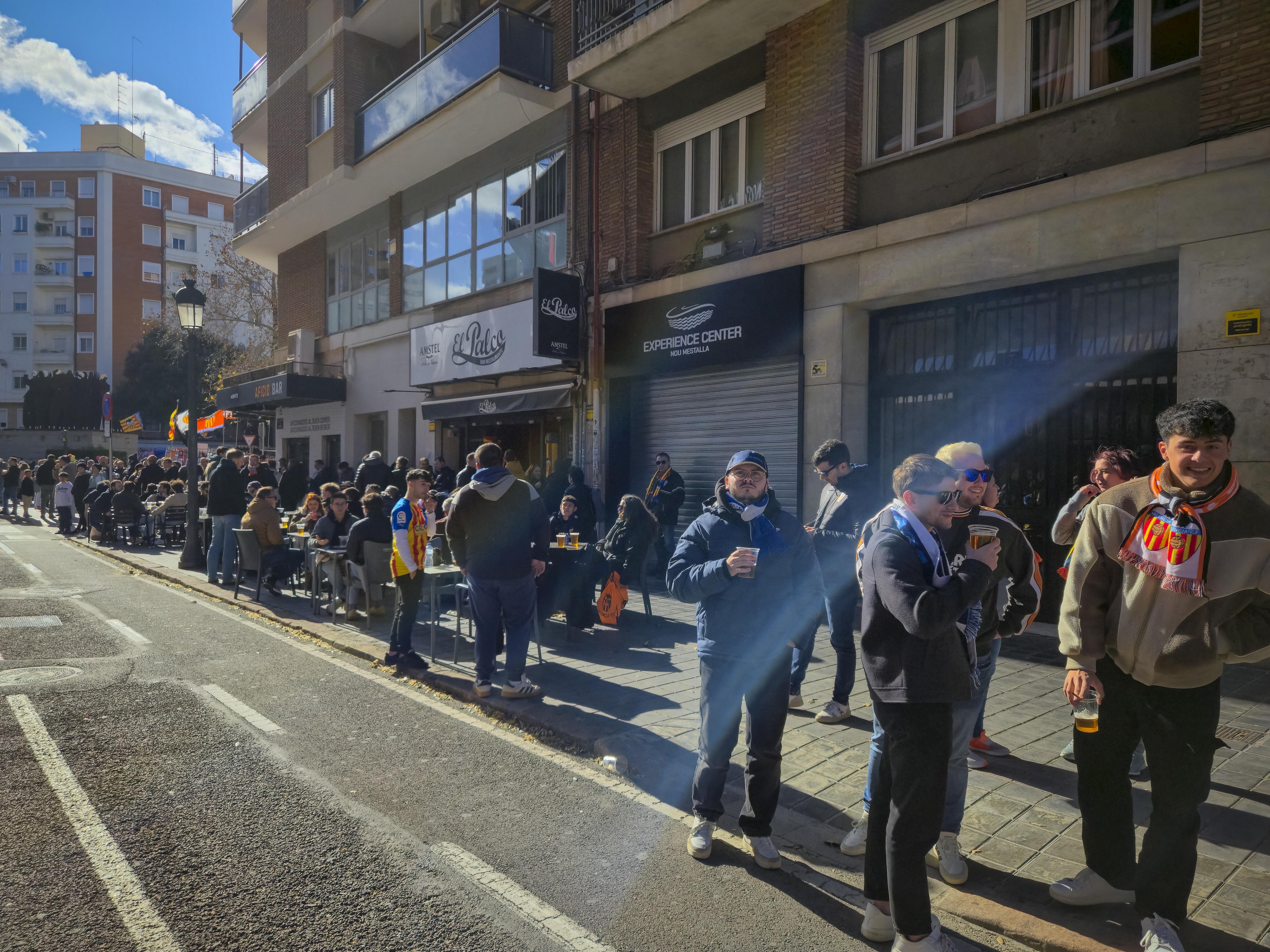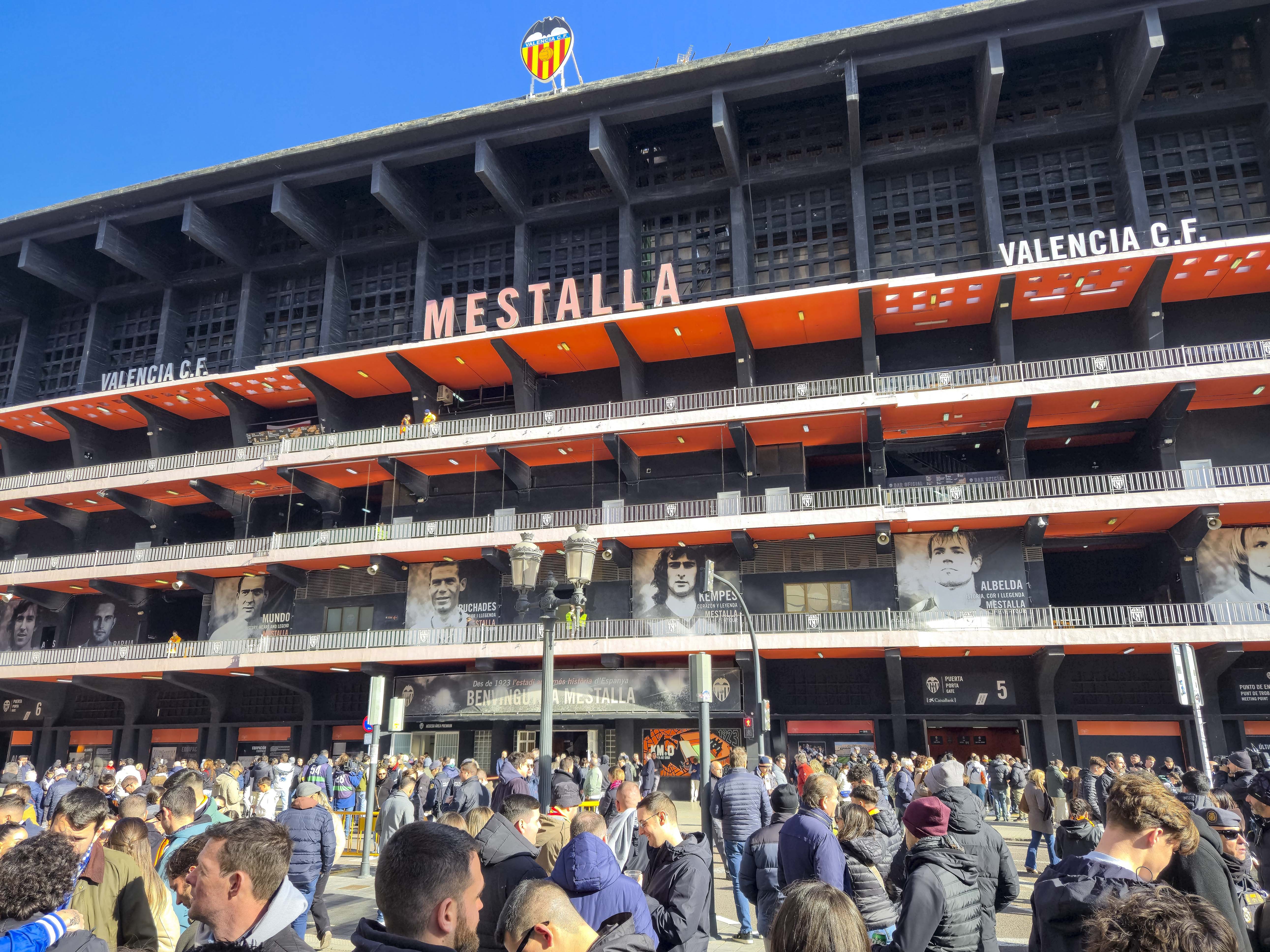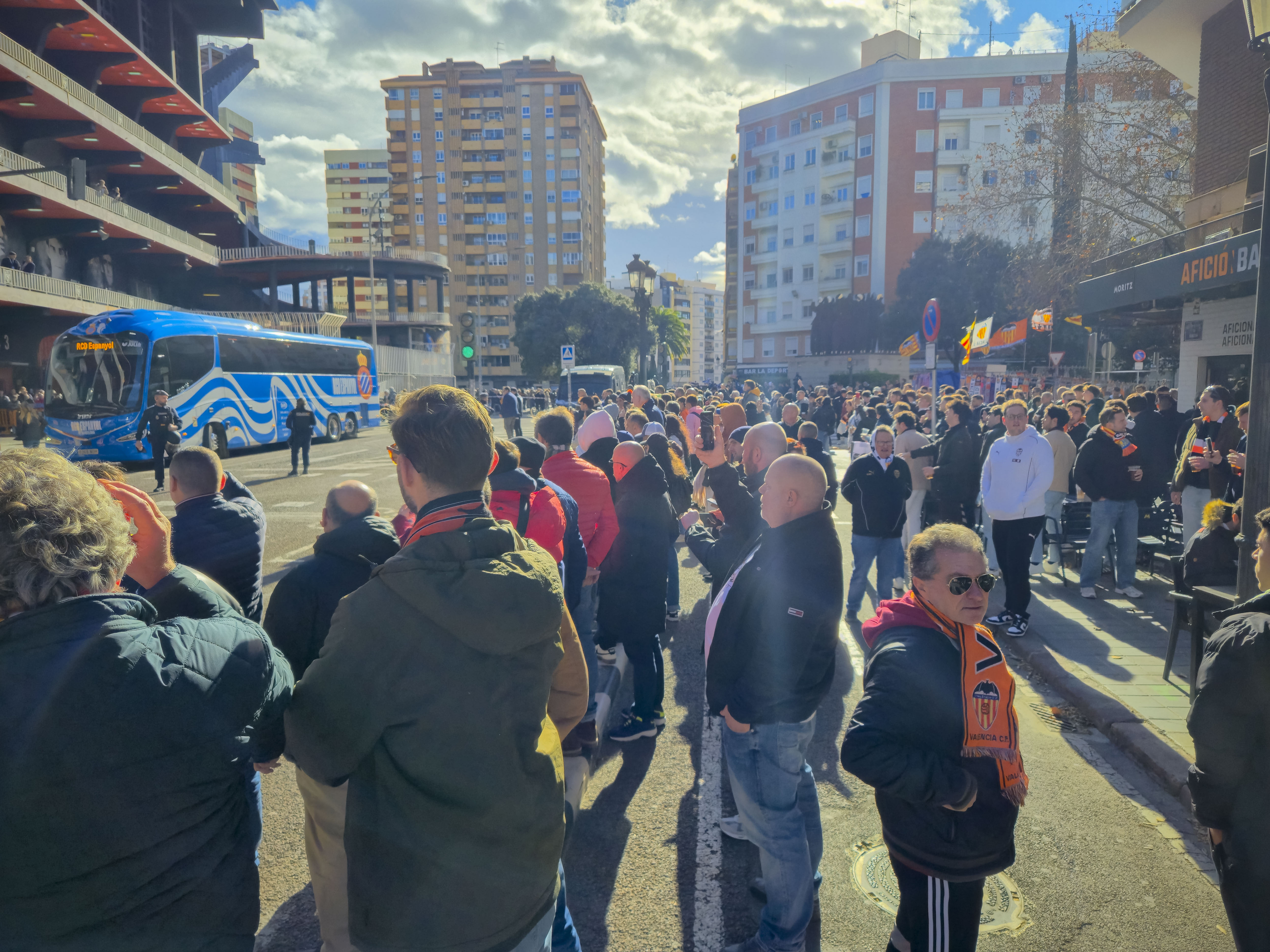 Ze verzamelden zich voor de ingang, klommen het balkon op en begonnen te spelen. Geen monotone trommels, maar een vrolijke, opzwepende mix van ritmes die door de straat rolden en de gevels deden trillen. Een dweilorkest met trots, met een soort zelfbewuste charme die alleen in Valencia werkt. De anderen kwamen terug met bier, de zon brandde zacht, en terwijl we samen wachtten op de spelersbus voelde ik hoe de spanning zich als vanzelf opbouwde. Dit hele voorspel — de band op het balkon, de muziek die door de straat golft, de mensen die dichterbij komen staan, het moment waarop de bus de hoek om draait en wordt onthaald alsof er een finale gespeeld wordt — is precies wat Mestalla zo eigen maakt. Het is een ritueel dat elke thuiswedstrijd opnieuw wordt uitgevoerd, een ceremonie die je nergens anders in Spanje op deze manier ziet, en het was dit deel dat ik de vorige keer nauwelijks had kunnen ervaren door alle protesten. Nu kon ik het eindelijk proeven zoals het bedoeld is: als het theaterstuk vóór de wedstrijd, de voorpret die bijna belangrijker voelt dan het voetbal zelf.