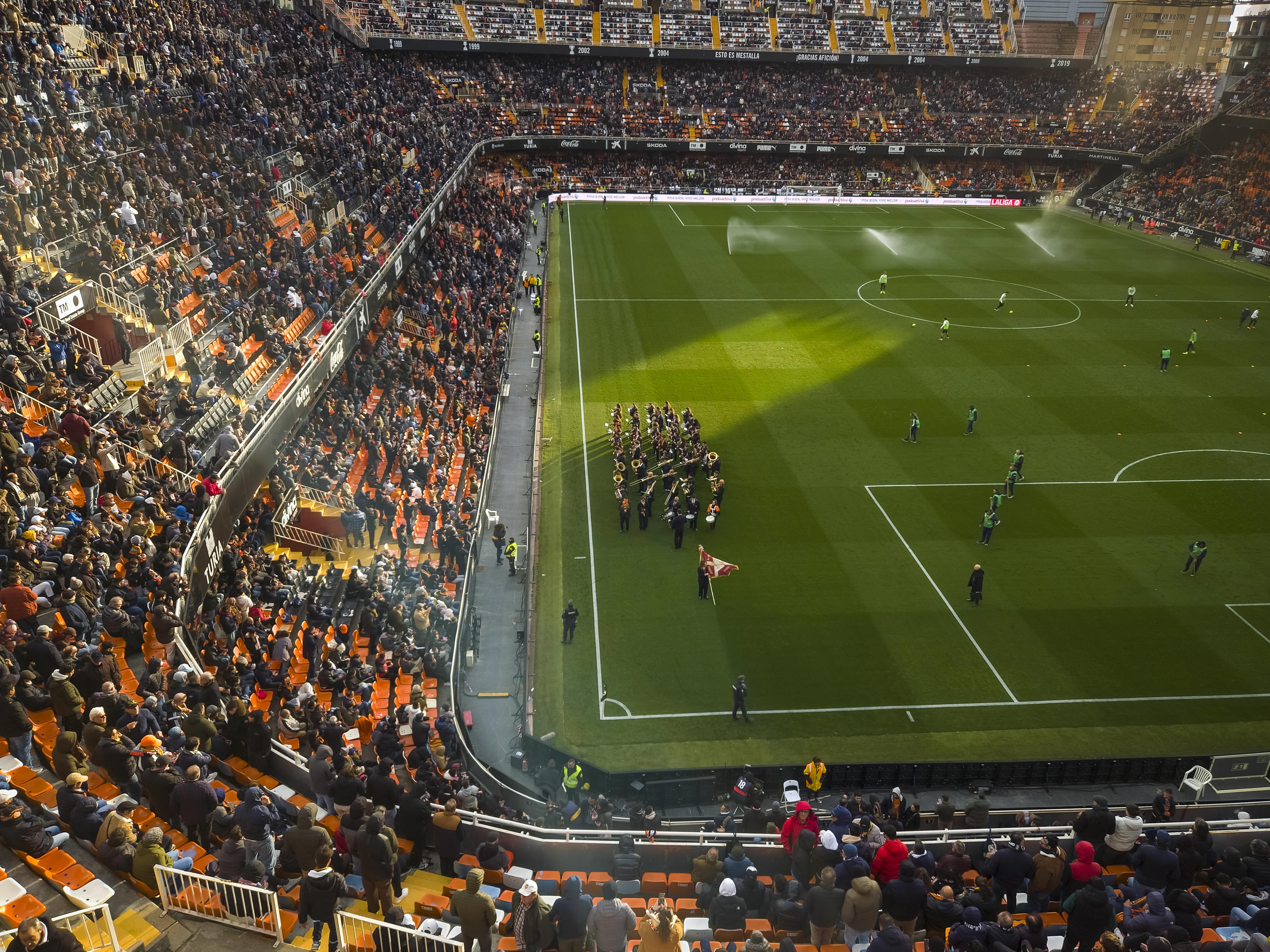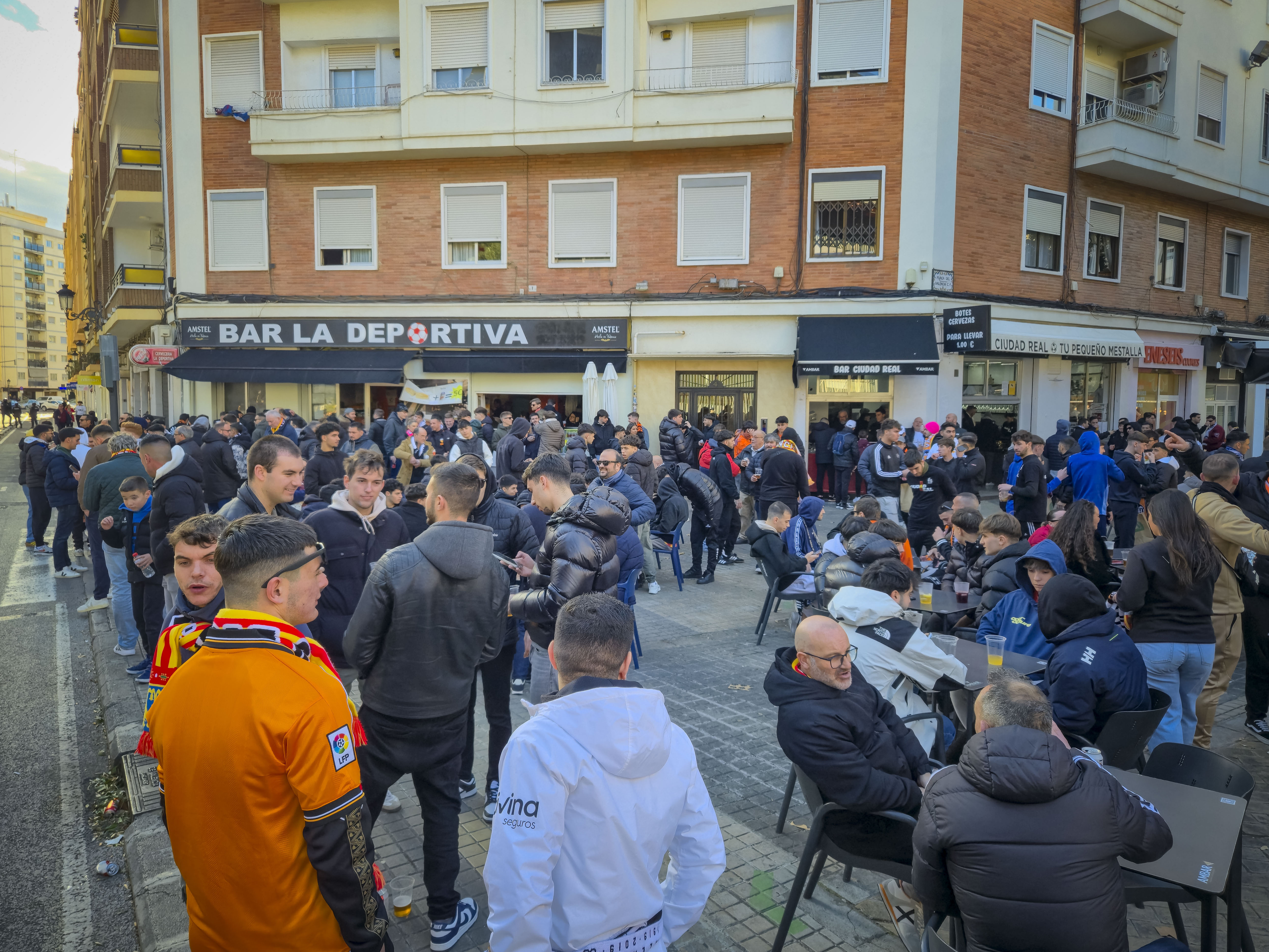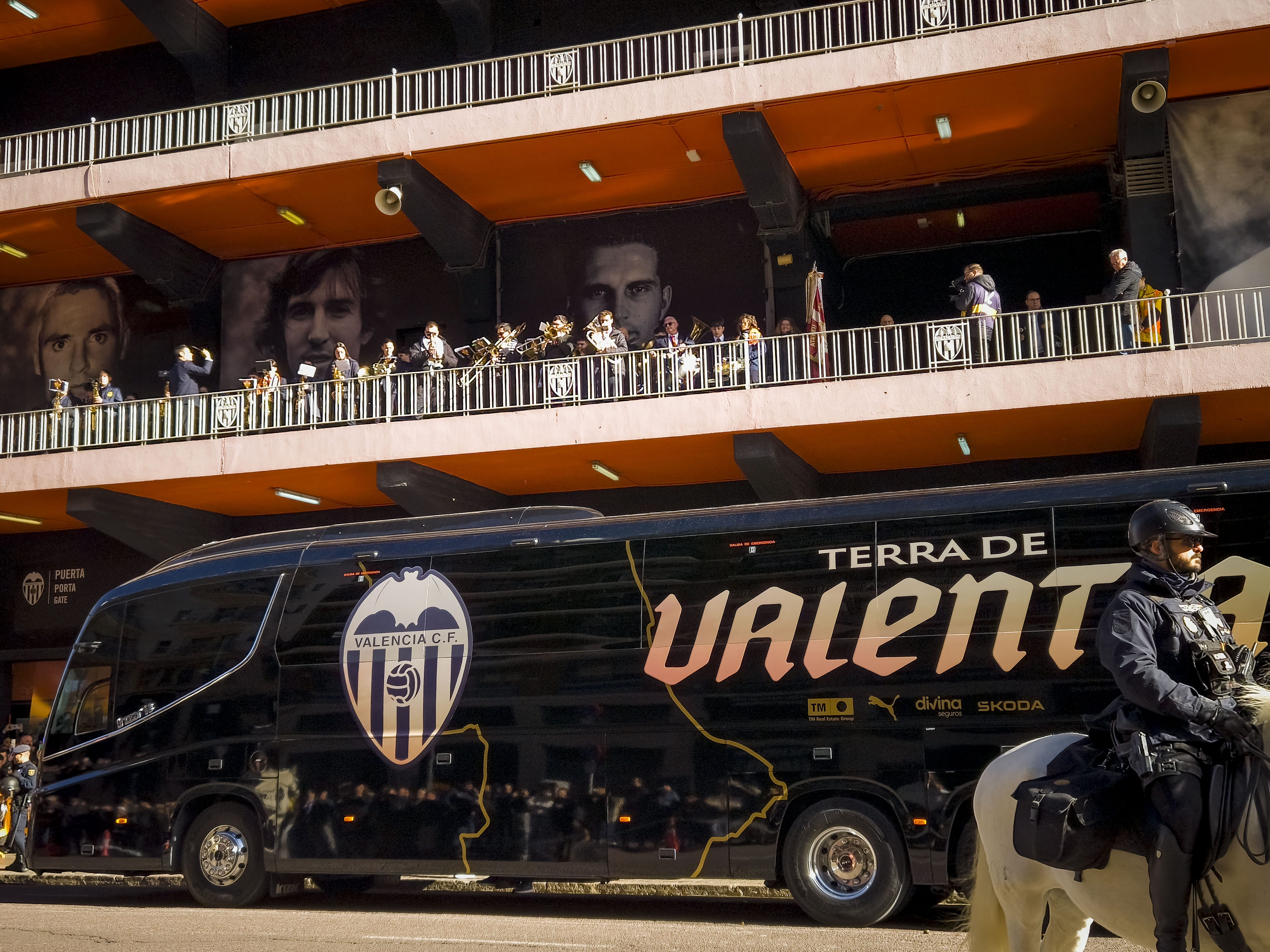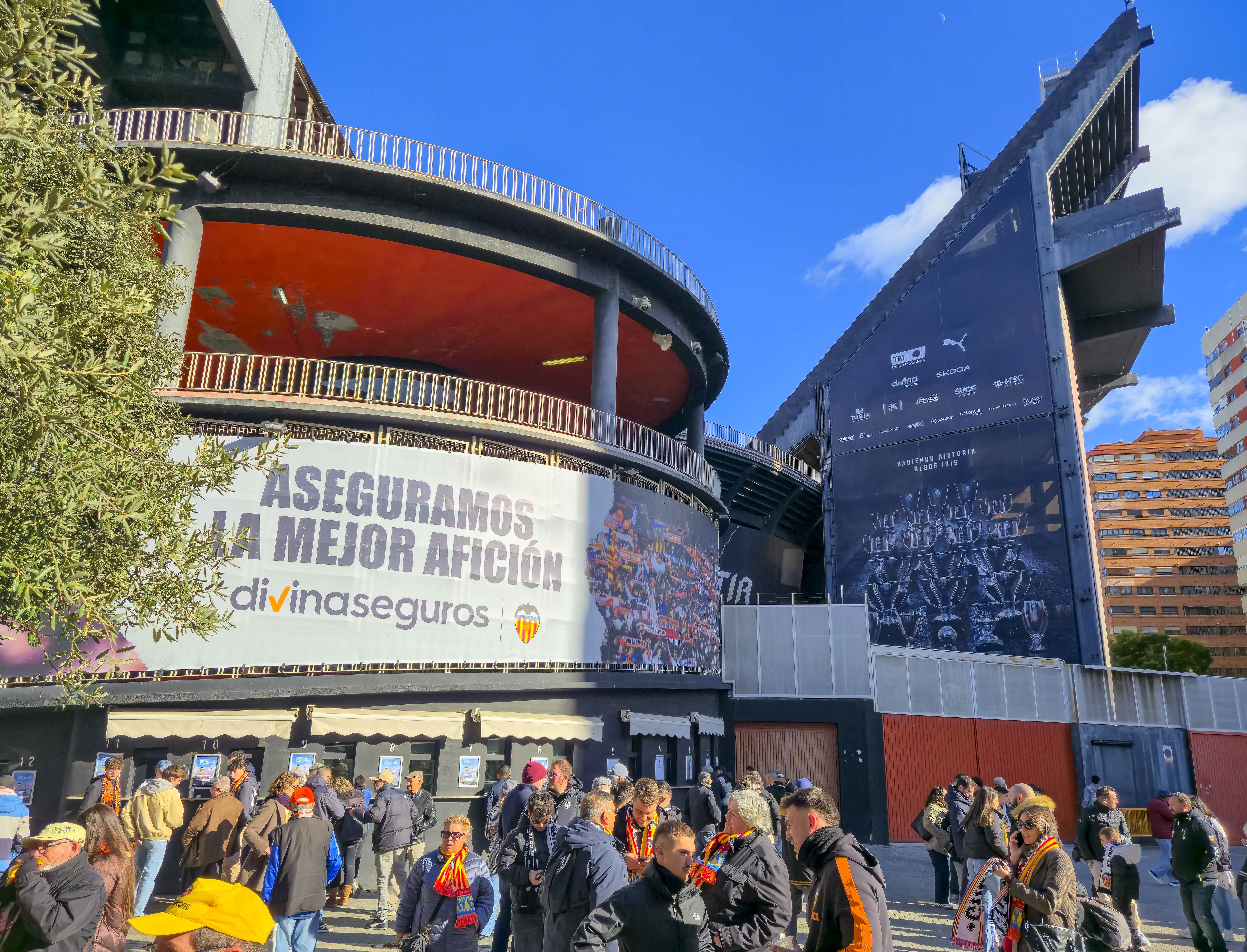 Ze verzamelden zich voor de ingang, klommen het balkon op en begonnen te spelen. Geen monotone trommels, maar een vrolijke, opzwepende mix van ritmes die door de straat rolden en de gevels deden trillen. Een dweilorkest met trots, met een soort zelfbewuste charme die alleen in Valencia werkt. De anderen kwamen terug met bier, de zon brandde zacht, en terwijl we samen wachtten op de spelersbus voelde ik hoe de spanning zich als vanzelf opbouwde. Dit hele voorspel — de band op het balkon, de muziek die door de straat golft, de mensen die dichterbij komen staan, het moment waarop de bus de hoek om draait en wordt onthaald alsof er een finale gespeeld wordt — is precies wat Mestalla zo eigen maakt. Het is een ritueel dat elke thuiswedstrijd opnieuw wordt uitgevoerd, een ceremonie die je nergens anders in Spanje op deze manier ziet, en het was dit deel dat ik de vorige keer nauwelijks had kunnen ervaren door alle protesten. Nu kon ik het eindelijk proeven zoals het bedoeld is: als het theaterstuk vóór de wedstrijd, de voorpret die bijna belangrijker voelt dan het voetbal zelf.