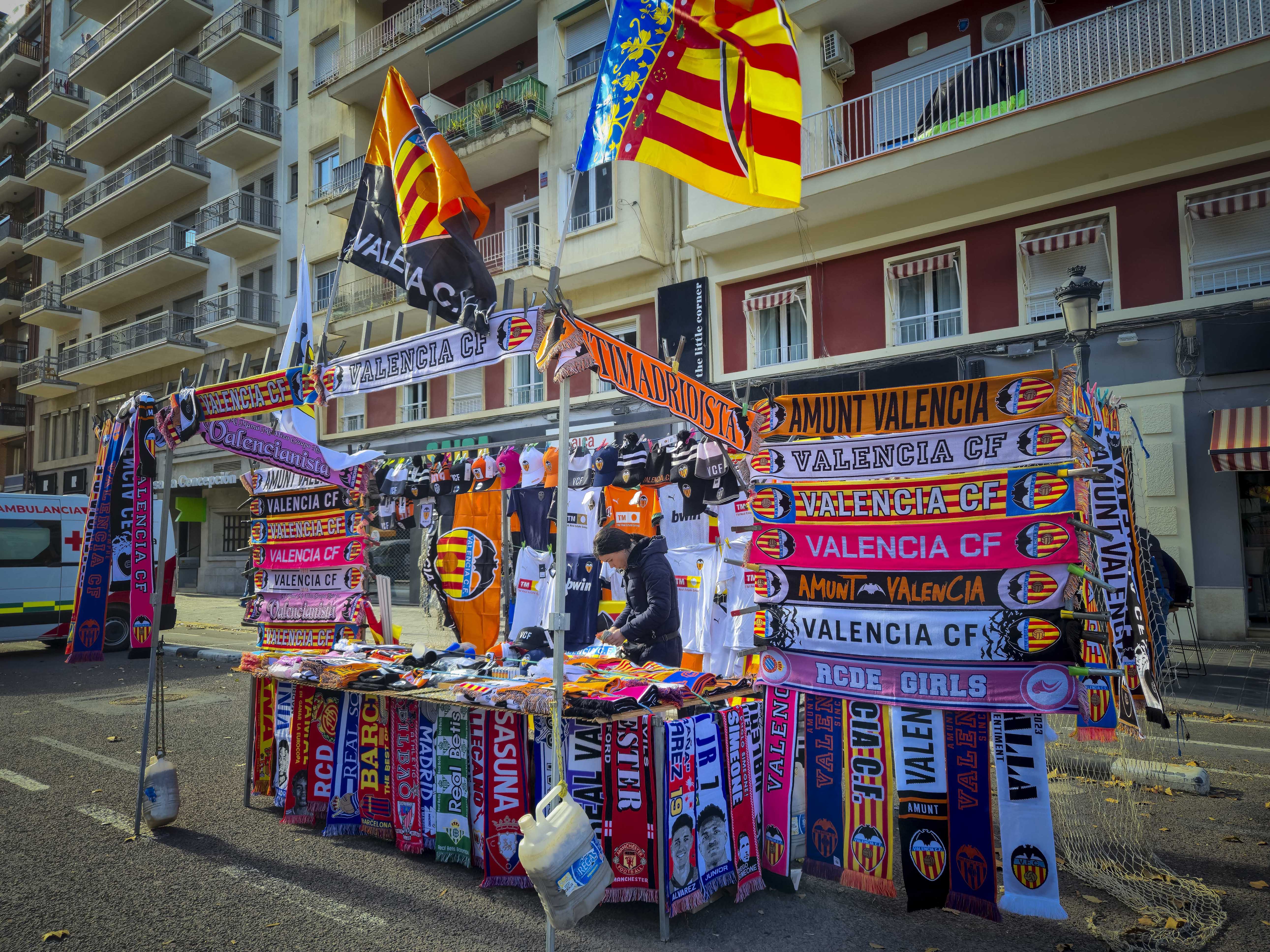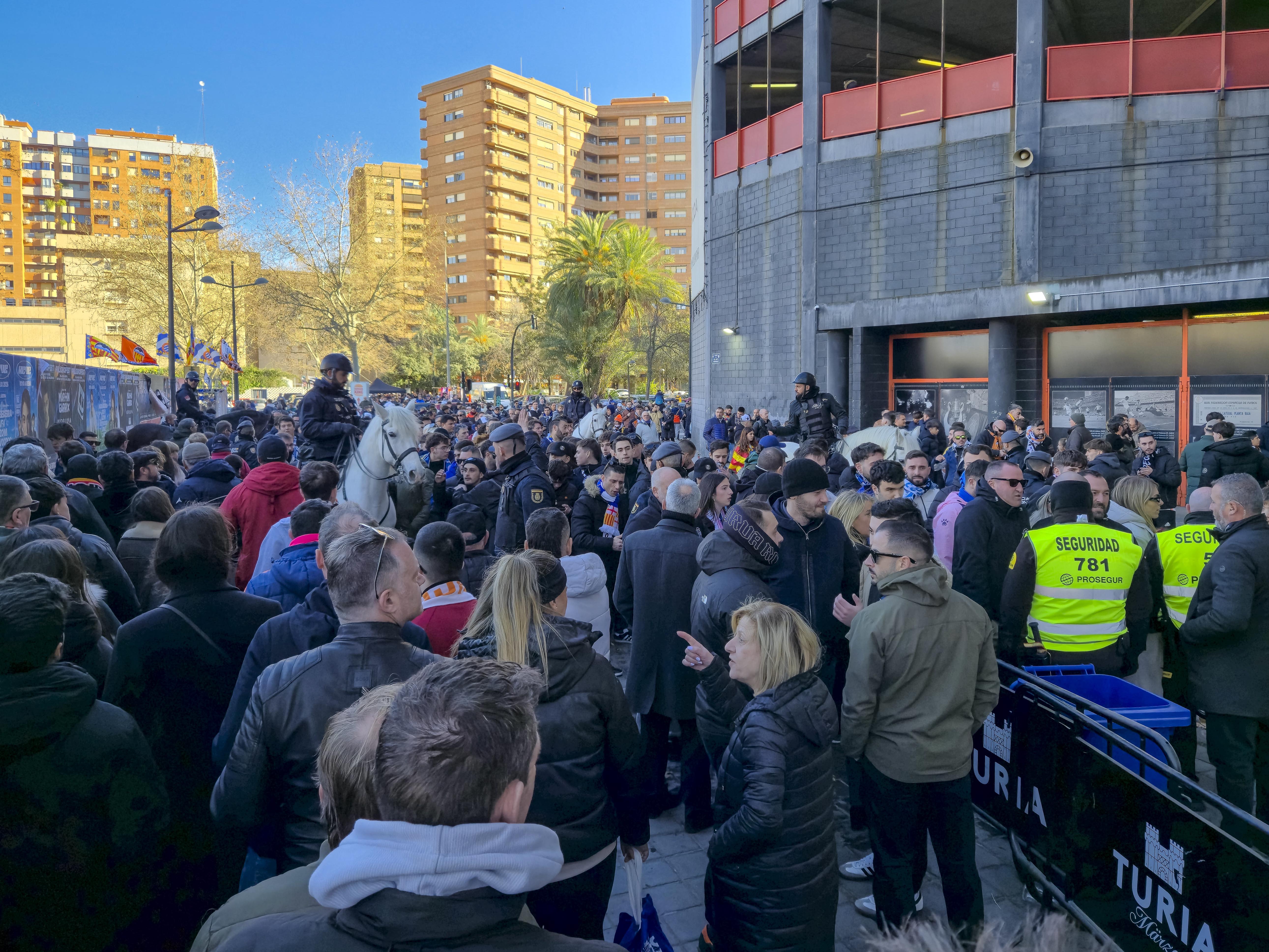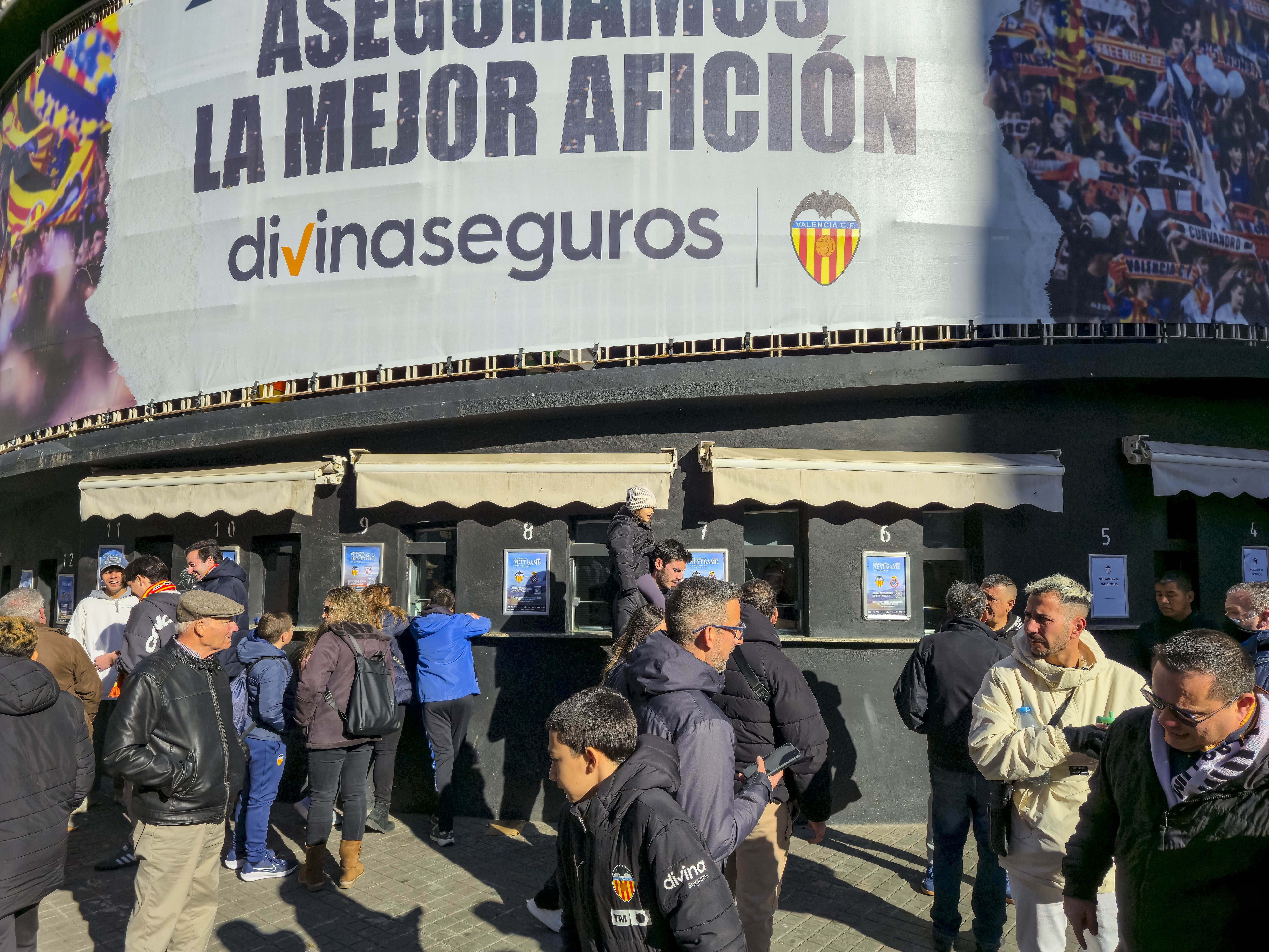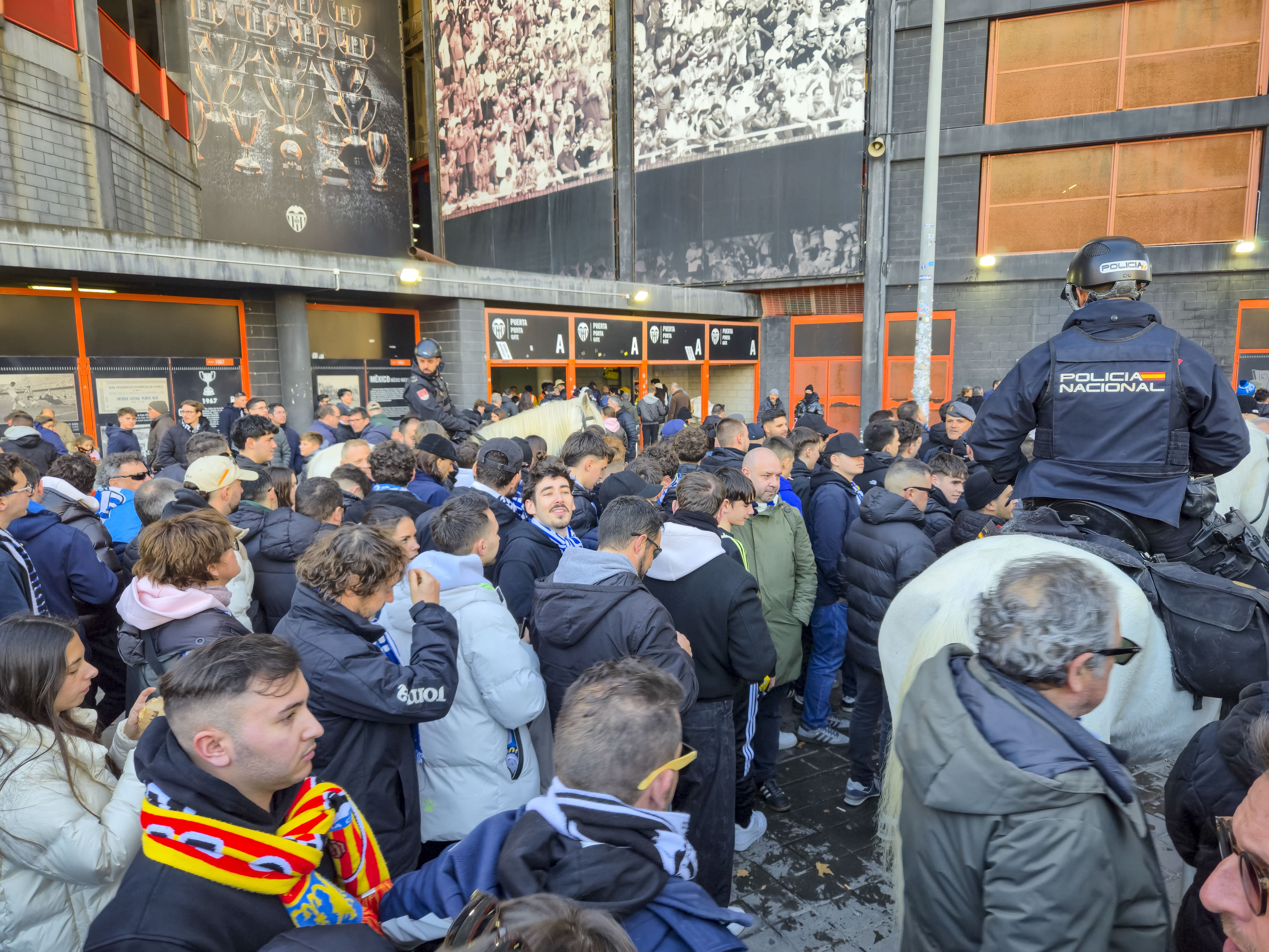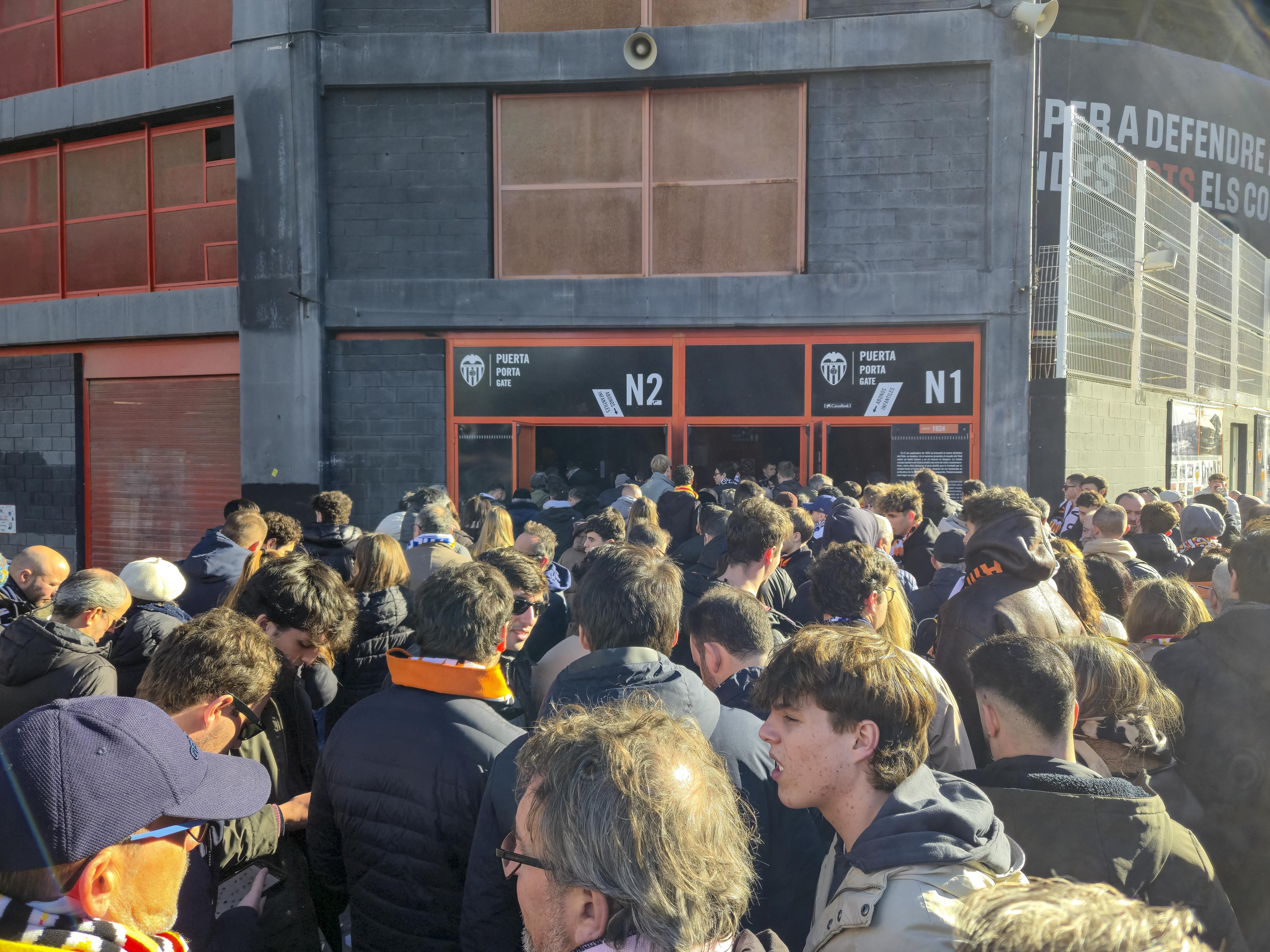 Ze verzamelden zich voor de ingang, klommen het balkon op en begonnen te spelen. Geen monotone trommels, maar een vrolijke, opzwepende mix van ritmes die door de straat rolden en de gevels deden trillen. Een dweilorkest met trots, met een soort zelfbewuste charme die alleen in Valencia werkt. De anderen kwamen terug met bier, de zon brandde zacht, en terwijl we samen wachtten op de spelersbus voelde ik hoe de spanning zich als vanzelf opbouwde. Dit hele voorspel — de band op het balkon, de muziek die door de straat golft, de mensen die dichterbij komen staan, het moment waarop de bus de hoek om draait en wordt onthaald alsof er een finale gespeeld wordt — is precies wat Mestalla zo eigen maakt. Het is een ritueel dat elke thuiswedstrijd opnieuw wordt uitgevoerd, een ceremonie die je nergens anders in Spanje op deze manier ziet, en het was dit deel dat ik de vorige keer nauwelijks had kunnen ervaren door alle protesten. Nu kon ik het eindelijk proeven zoals het bedoeld is: als het theaterstuk vóór de wedstrijd, de voorpret die bijna belangrijker voelt dan het voetbal zelf.