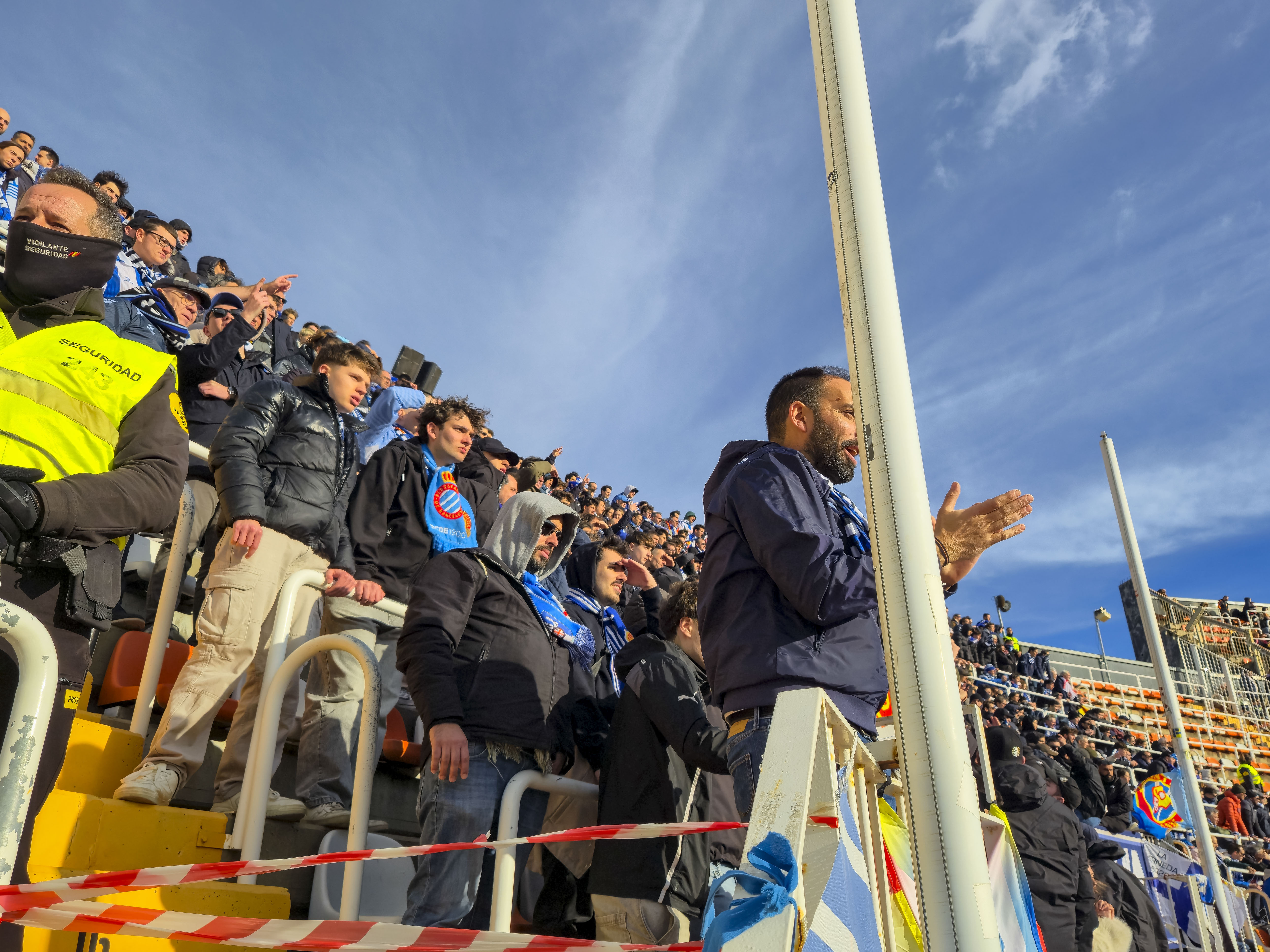 Staan was onmogelijk, en dus keek ik jaloers naar links, naar het uitvak van Espanyol, waar zo’n tweeduizend man zich had verzameld in een zee van blauw-wit lawaai. “Denk je dat je daar tussen kunt staan?” vroeg ik aan een vriend. “Geen schijn van kans.” “Tien euro dat het wel kan.” Tien minuten later zag ik hem de anderen aanstoten en naar mij wijzen. Weddenschap gewonnen.