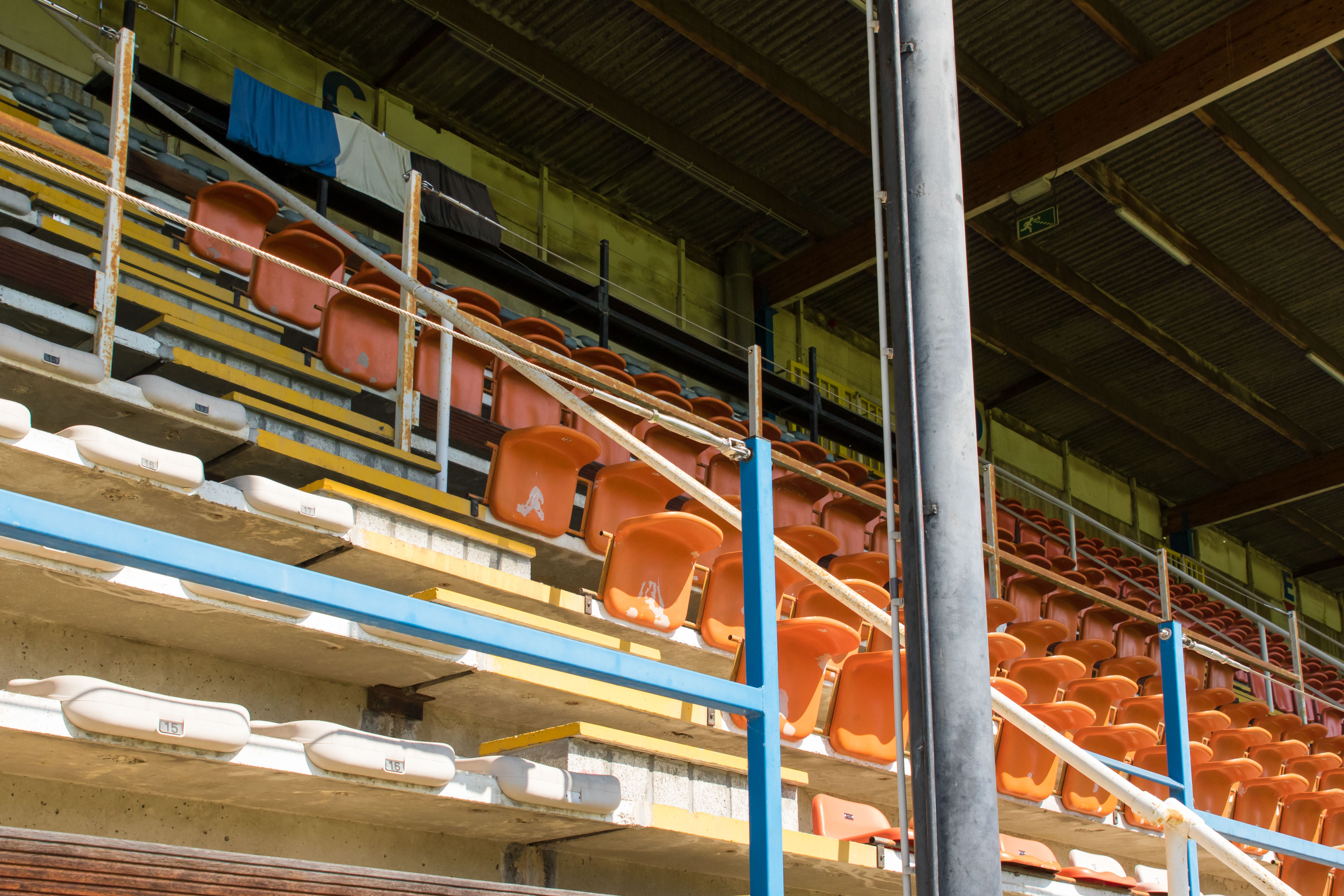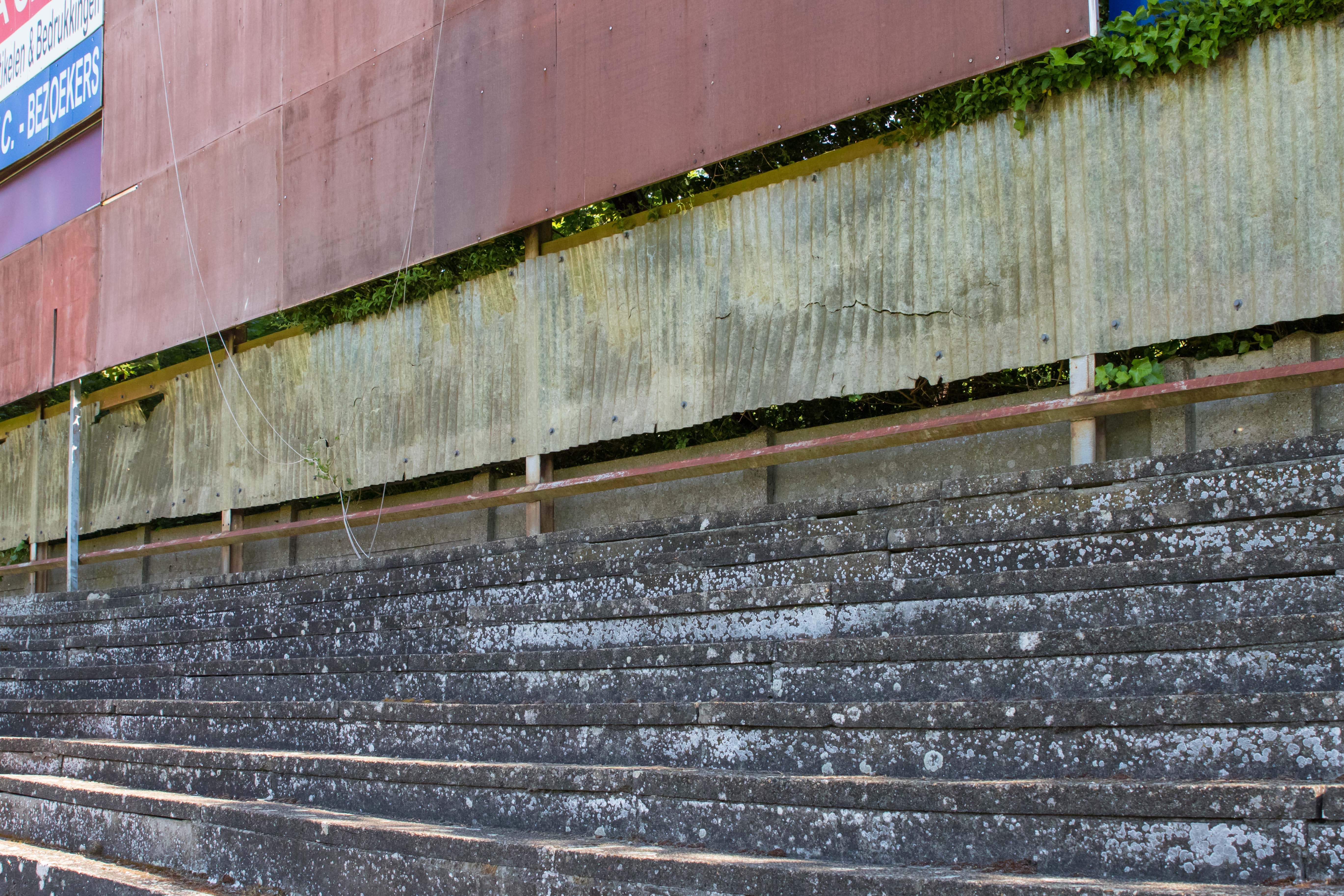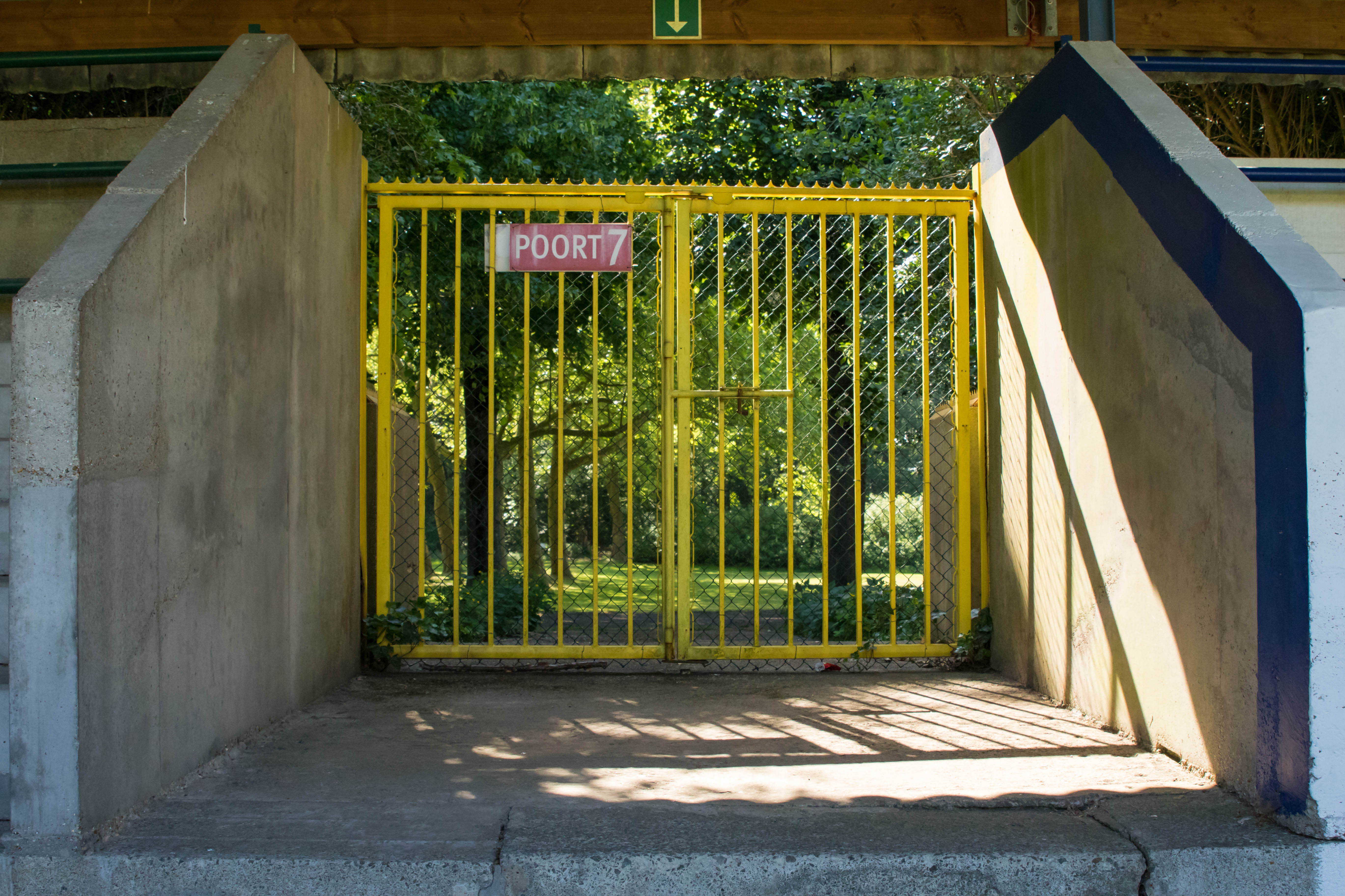 Het beton is warm van de zon. Niet doods, niet moe, maar in rust. Alsof het stadion even pauze neemt tussen twee speeldagen in. Tussen twee elftallen door. Je voelt dat hier is geschreeuwd, gezwegen, gevloekt en gejuicht. Dat soort energie verdwijnt niet. Het zakt in de treden. Het blijft hangen. Het wacht.
