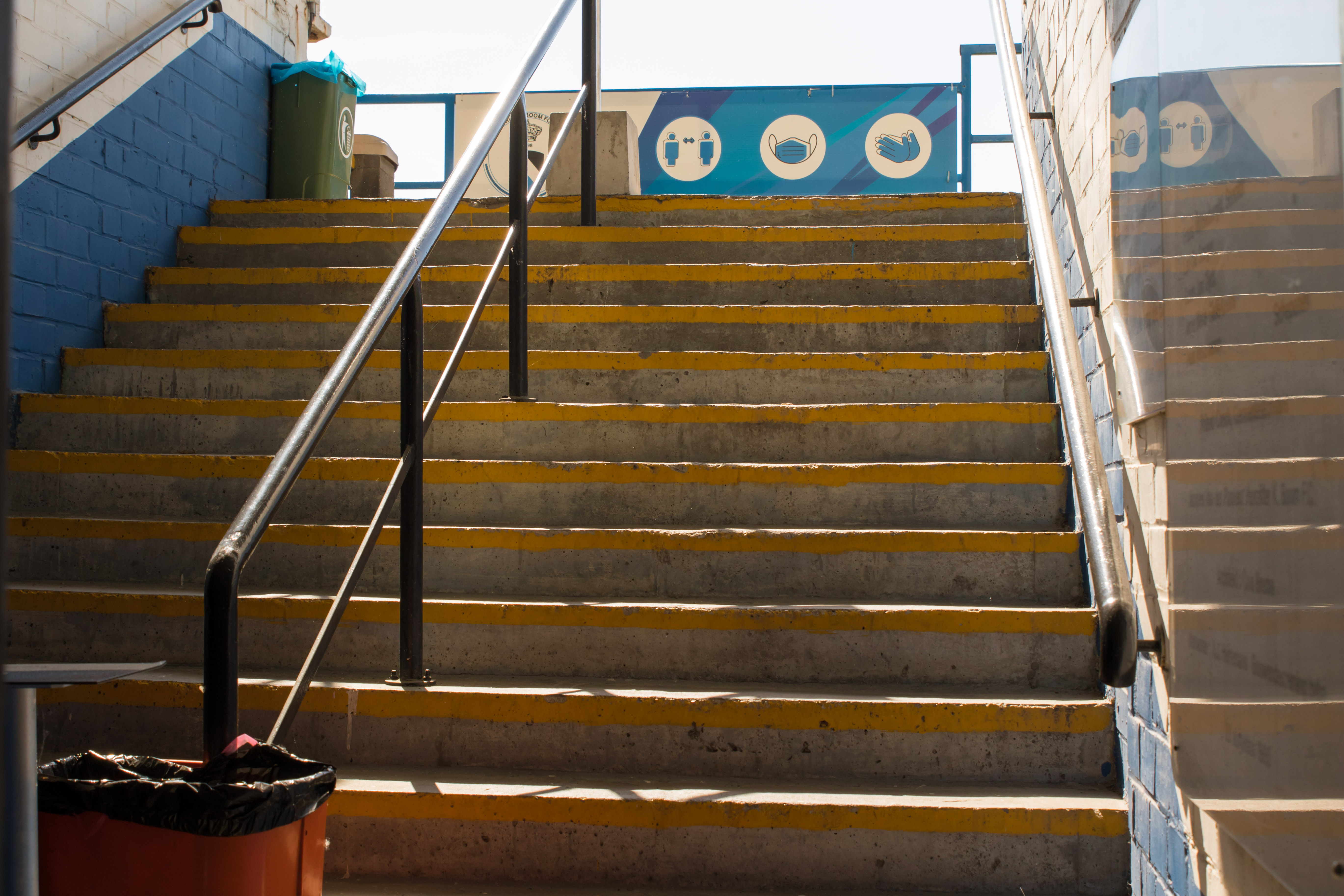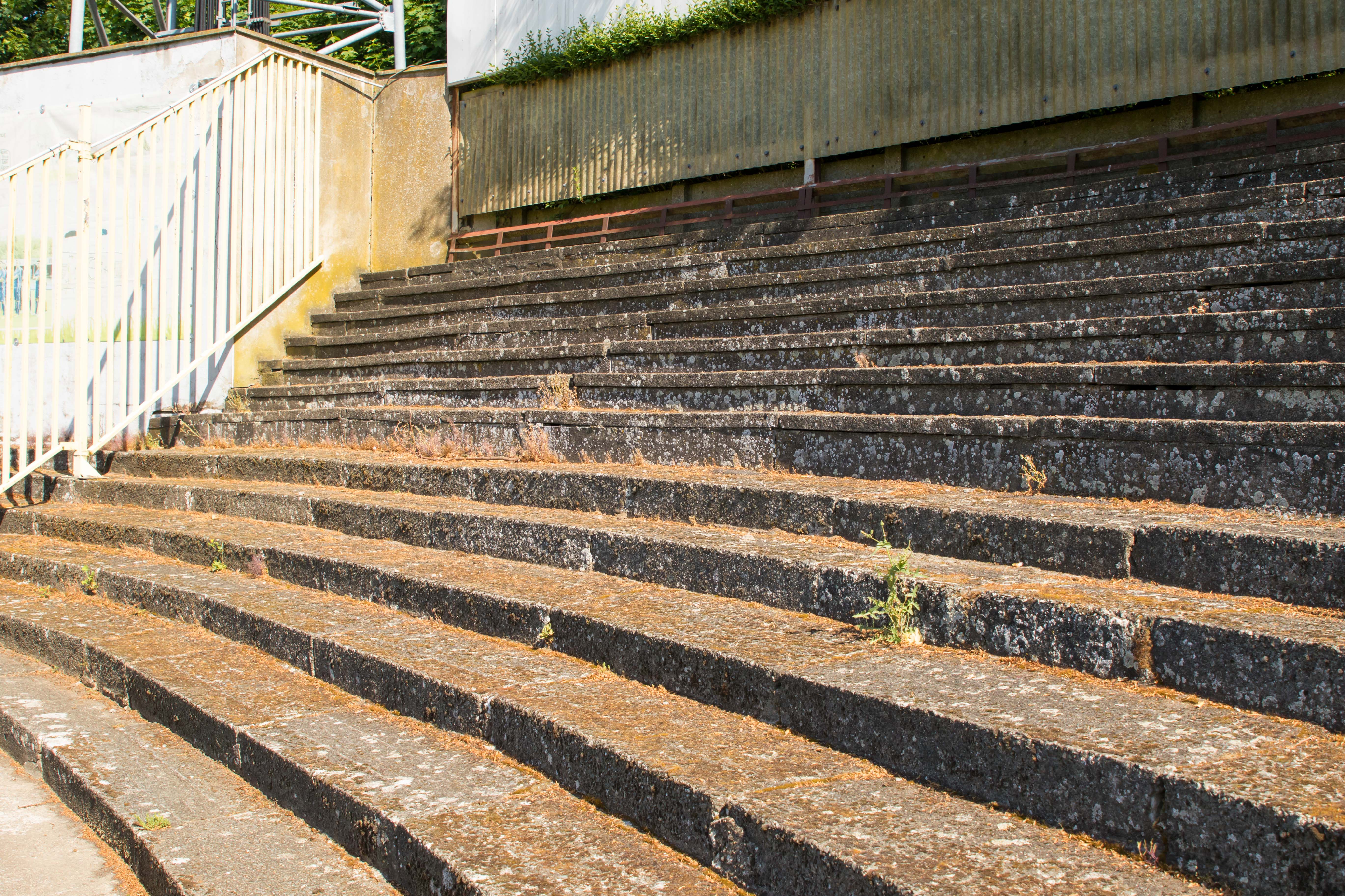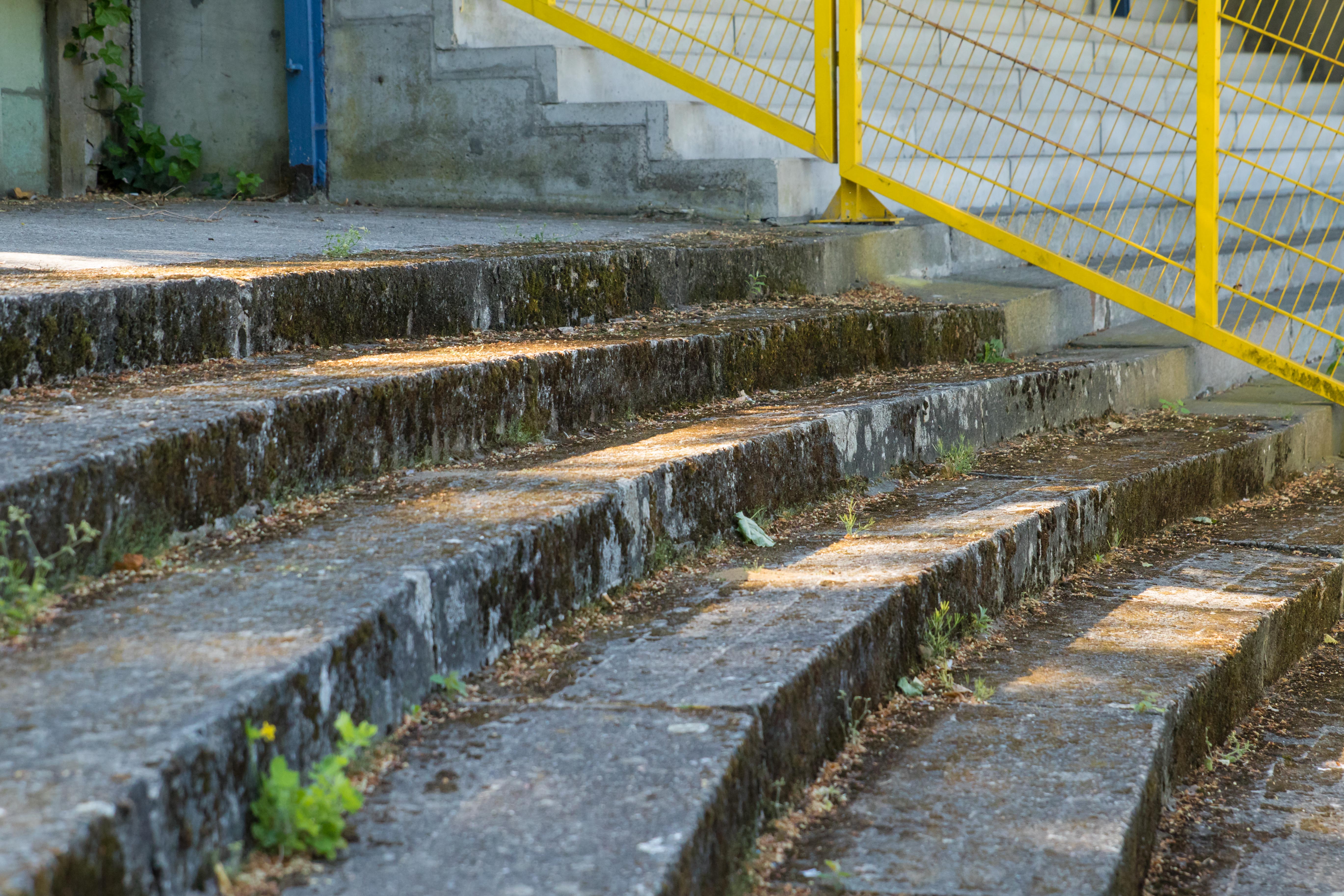 Het beton is warm van de zon. Niet doods, niet moe, maar in rust. Alsof het stadion even pauze neemt tussen twee speeldagen in. Tussen twee elftallen door. Je voelt dat hier is geschreeuwd, gezwegen, gevloekt en gejuicht. Dat soort energie verdwijnt niet. Het zakt in de treden. Het blijft hangen. Het wacht.