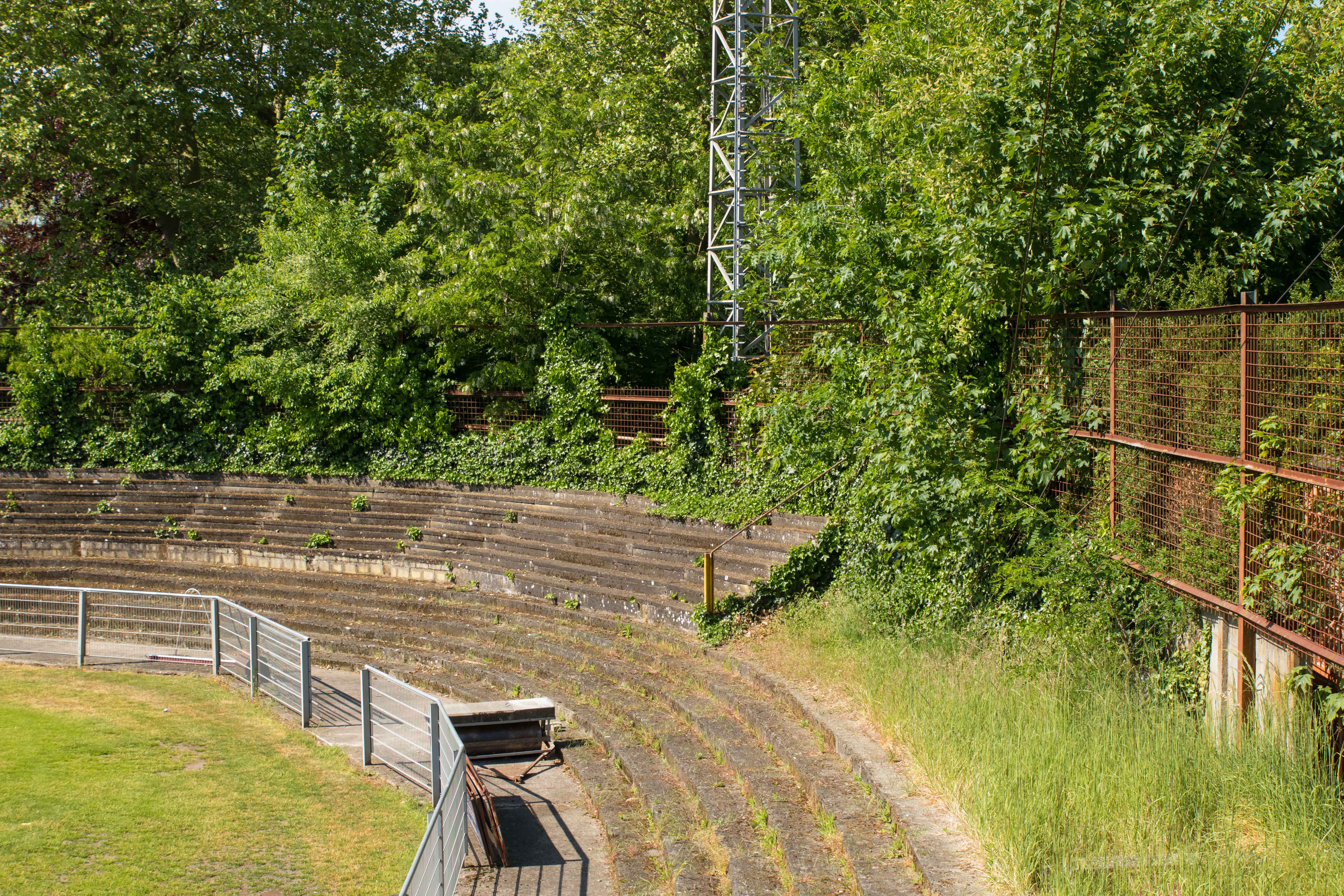 Langs de doelzijden liggen de staanplaatsen. Beton in bochten gegoten, treden met geheugen. Hier staan mensen die elkaar niet hoeven aan te kijken om gesprekken te voeren. Hier wordt het leven besproken terwijl het spel voorbijtrekt. Werk, kinderen, blessures, de scheidsrechter, de maandag. Het gras groeit door de kieren, klimop zoekt zijn weg omhoog alsof het zich voorzichtig tussen het publiek wil mengen. De natuur neemt niets over. Ze sluit aan.