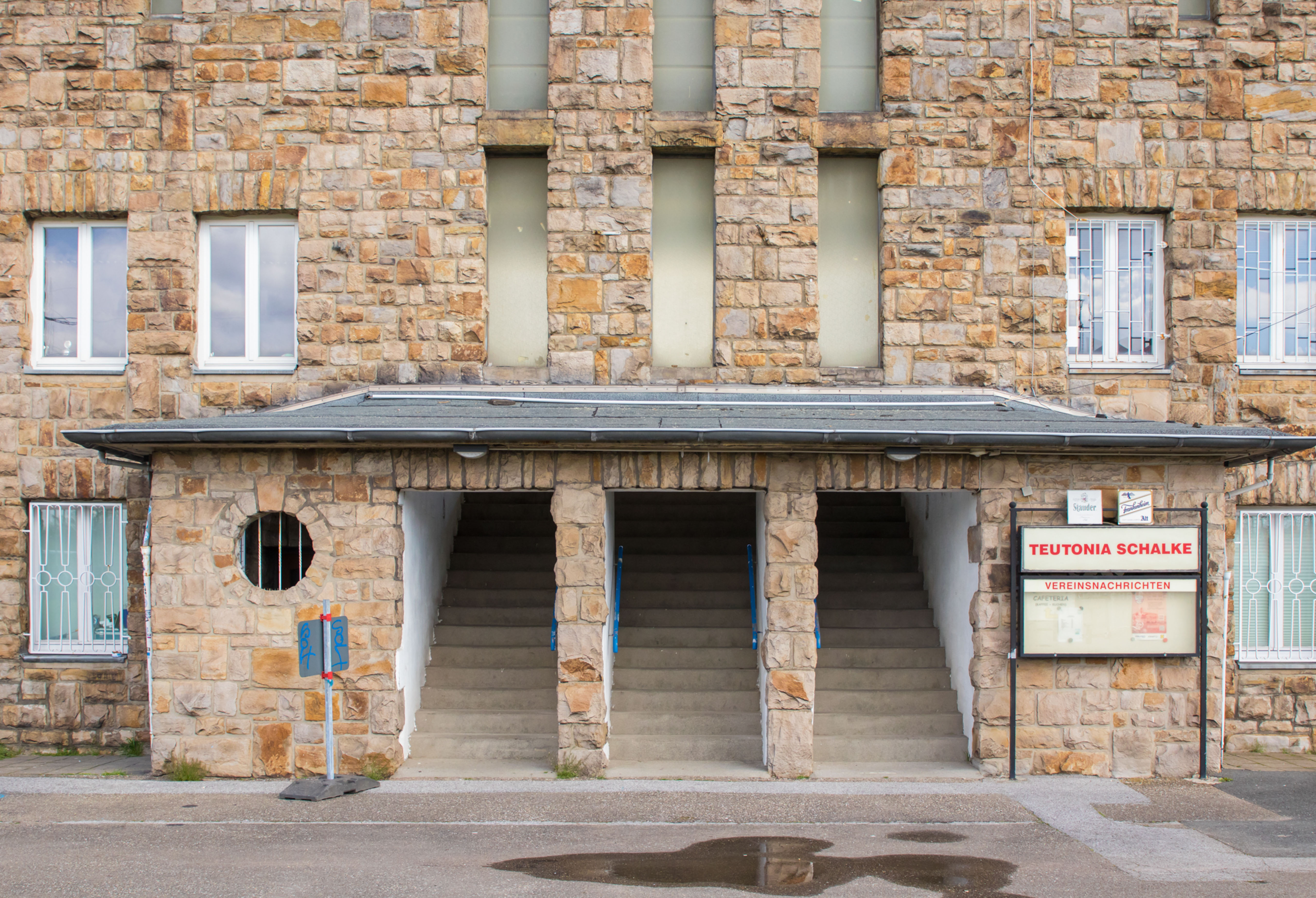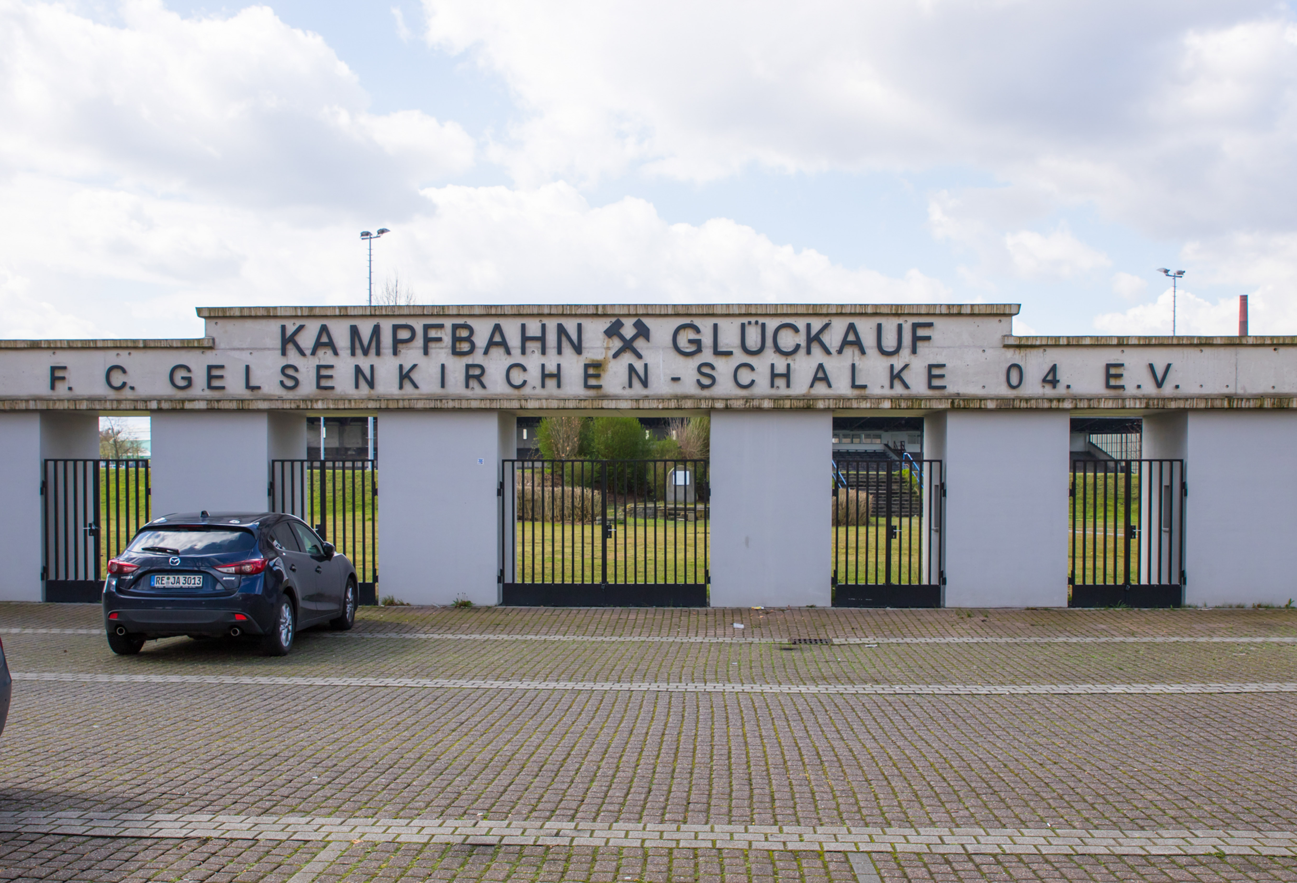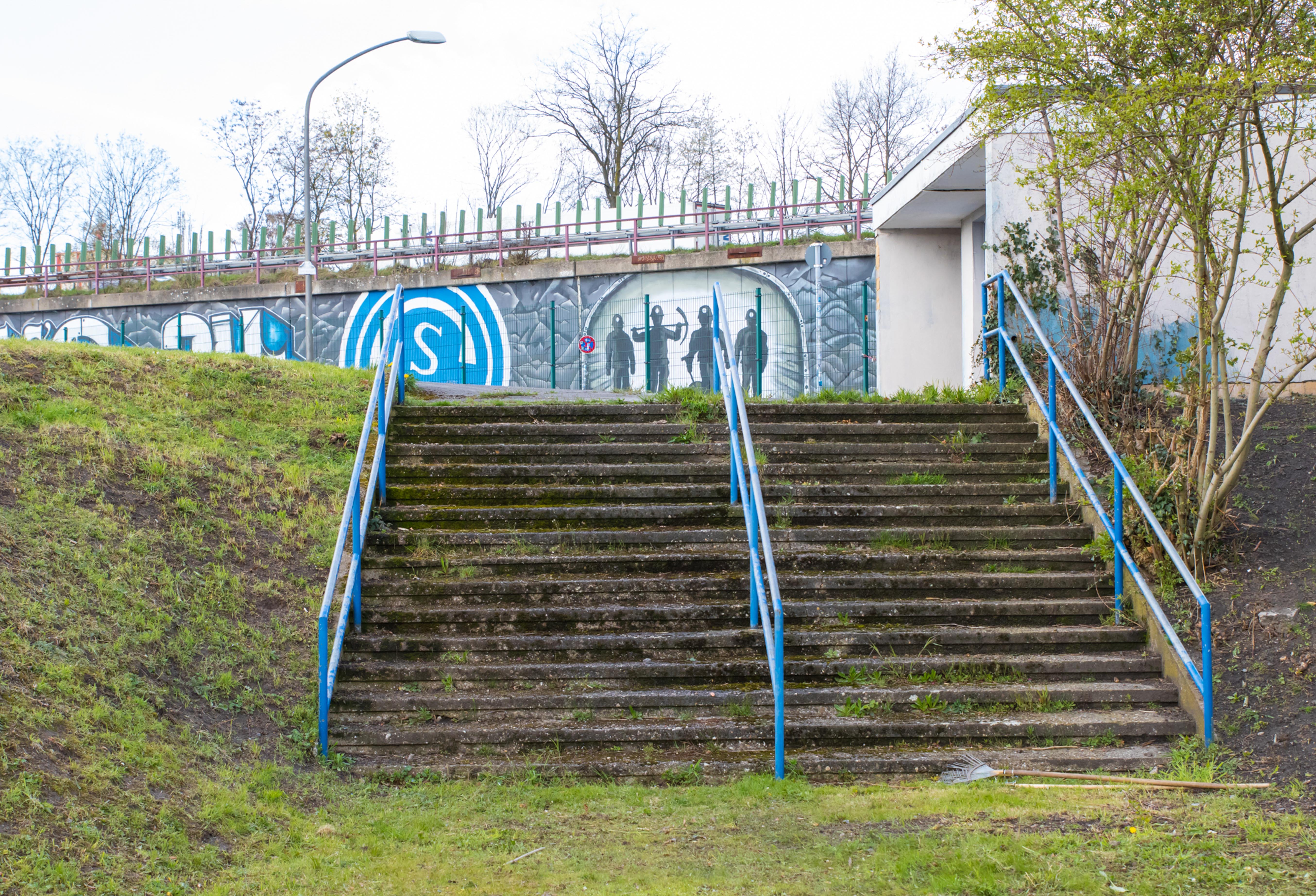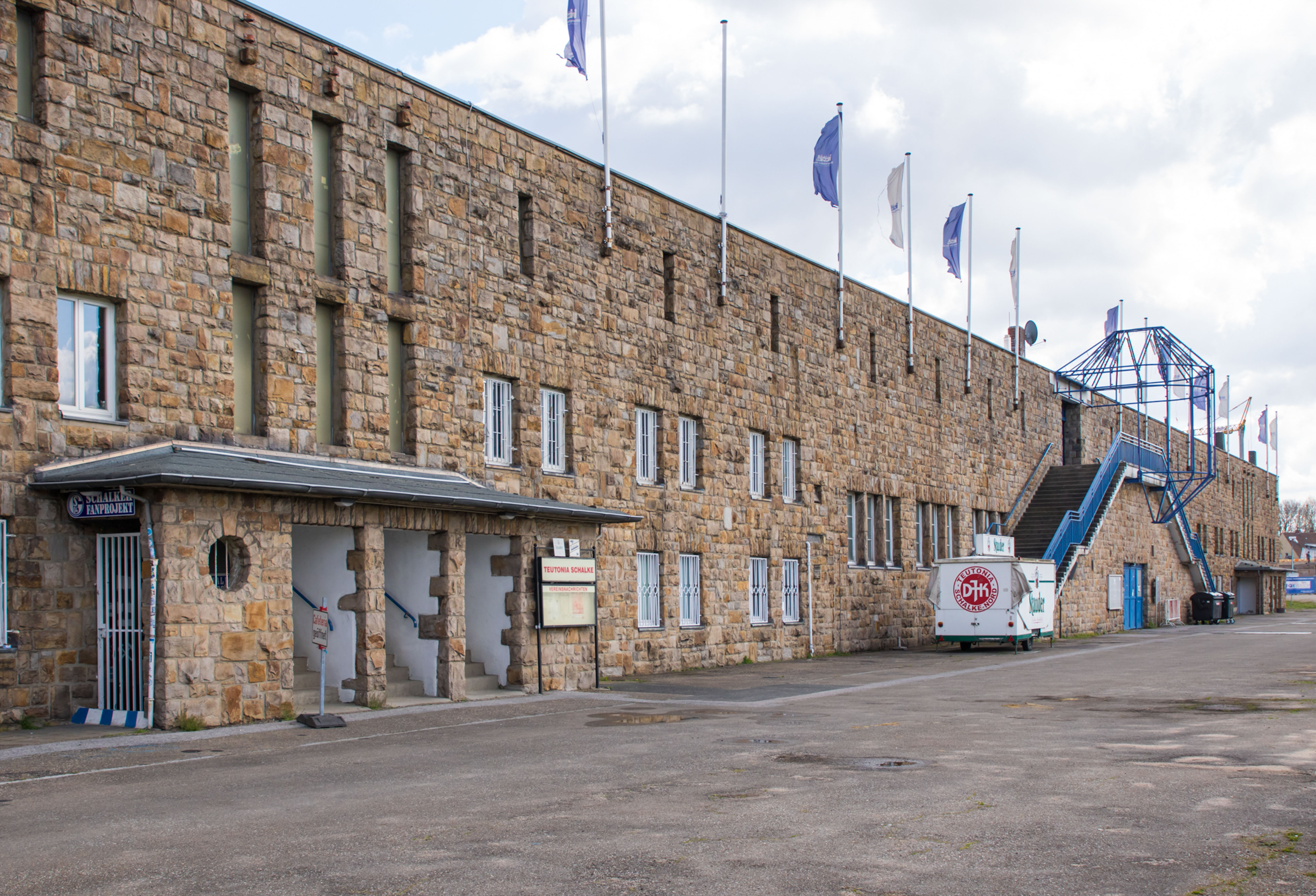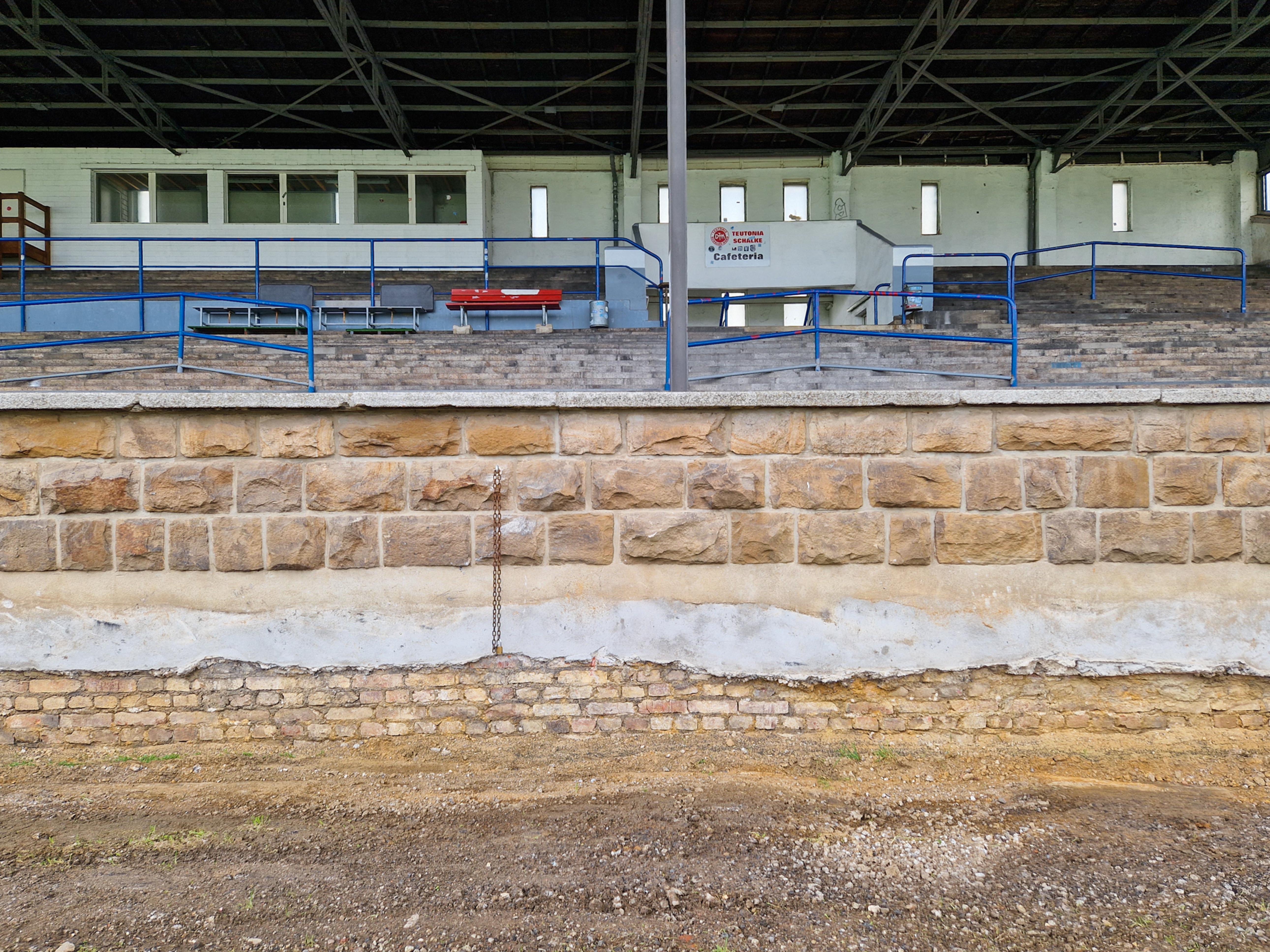 De man fotografeerde alles. De betonnen opstapjes. De oude stenen toegangspoort met de teksten Kampfbahn Glückauf en F.C. Gelsenkirchen-Schalke 04 E.V. De eigenaardige uitkijktoren aan de zijkant, die eruitzag alsof hij ooit meer had gezien dan hij nog mocht vertellen. Hij bleef hangen bij het contrast tussen de stenen hoofdtribune met haar houten bankjes en blauwe metalen steunen, en de kleine staantribune waarboven flatgebouwen en bouwkranen de horizon bezetten.