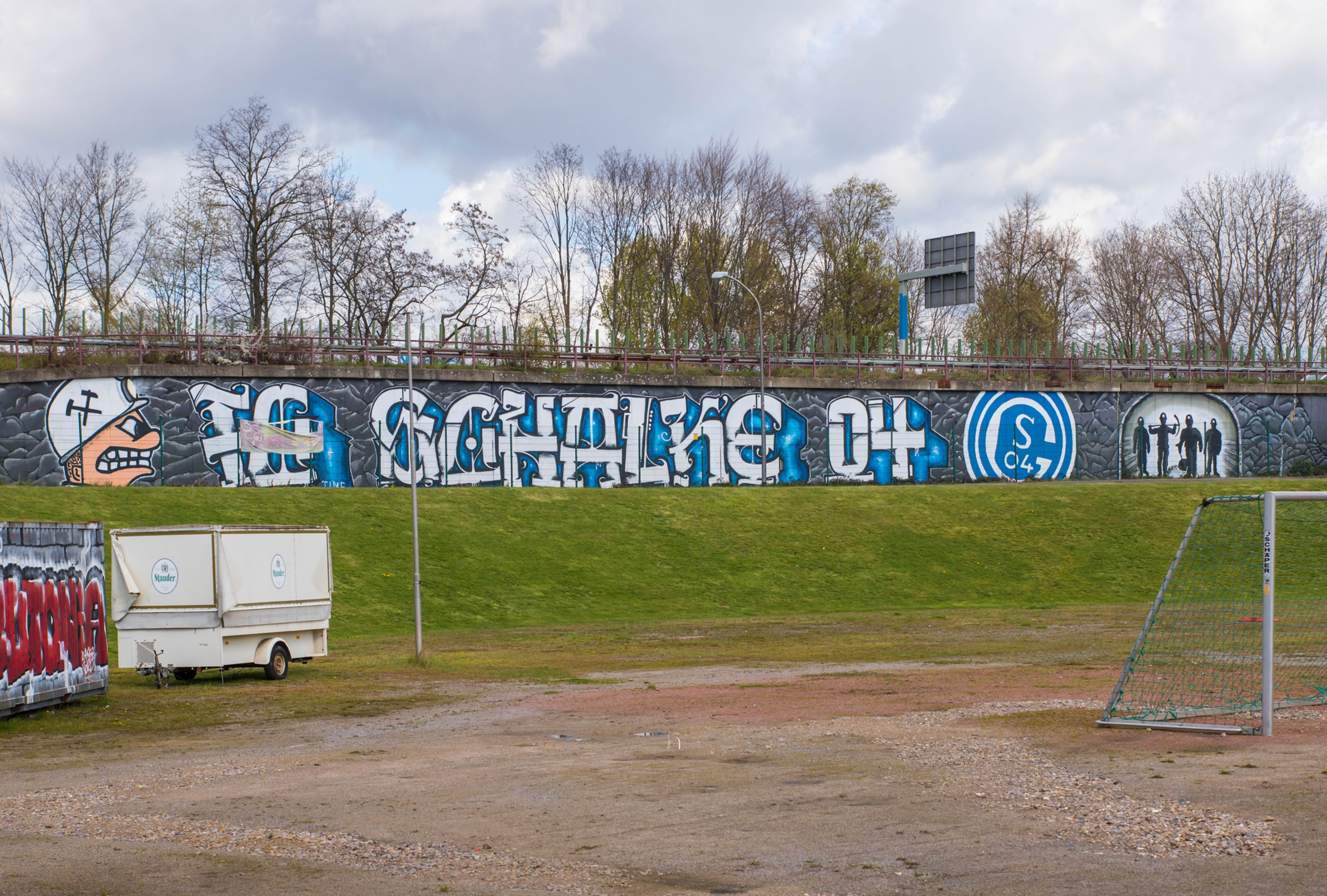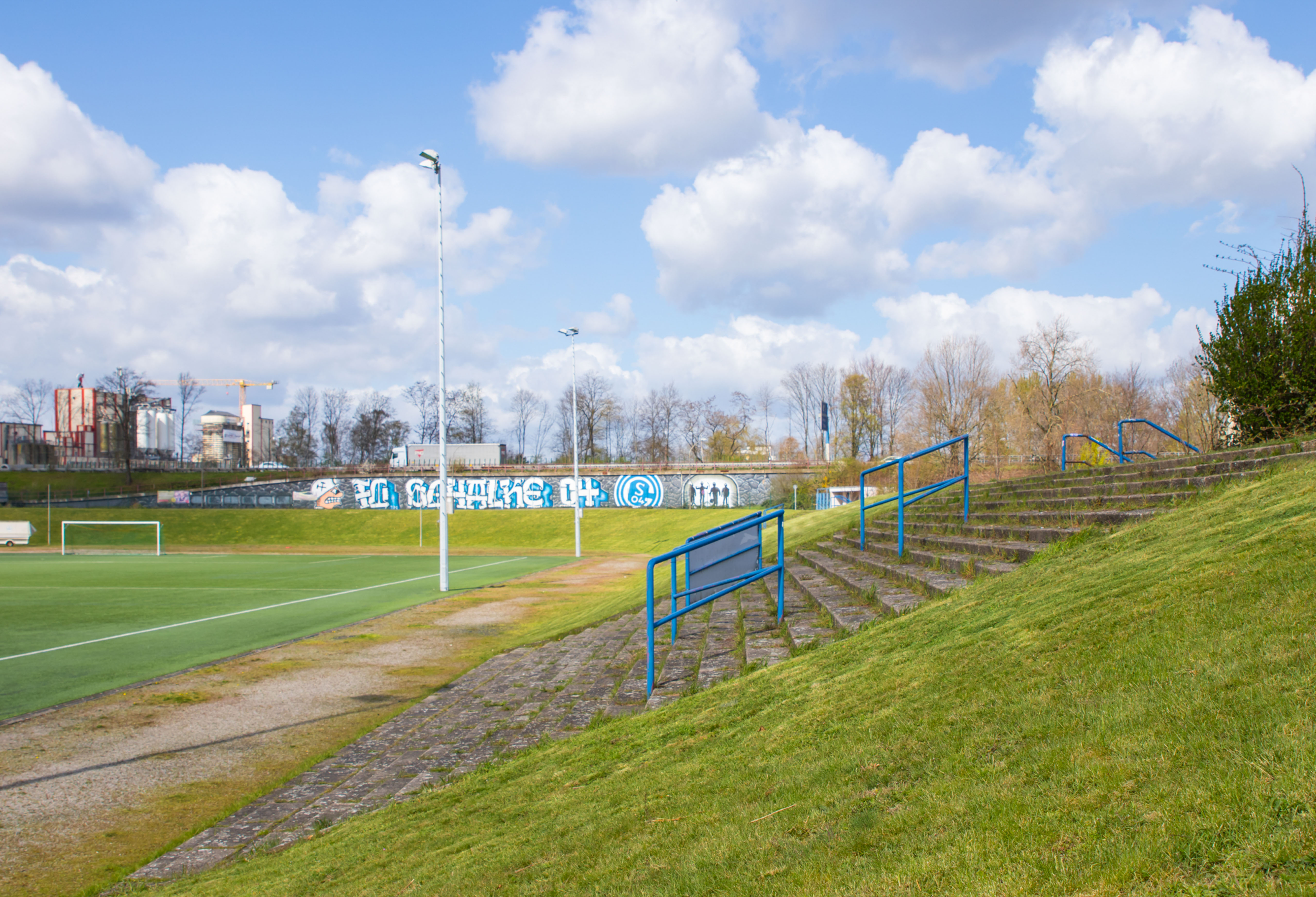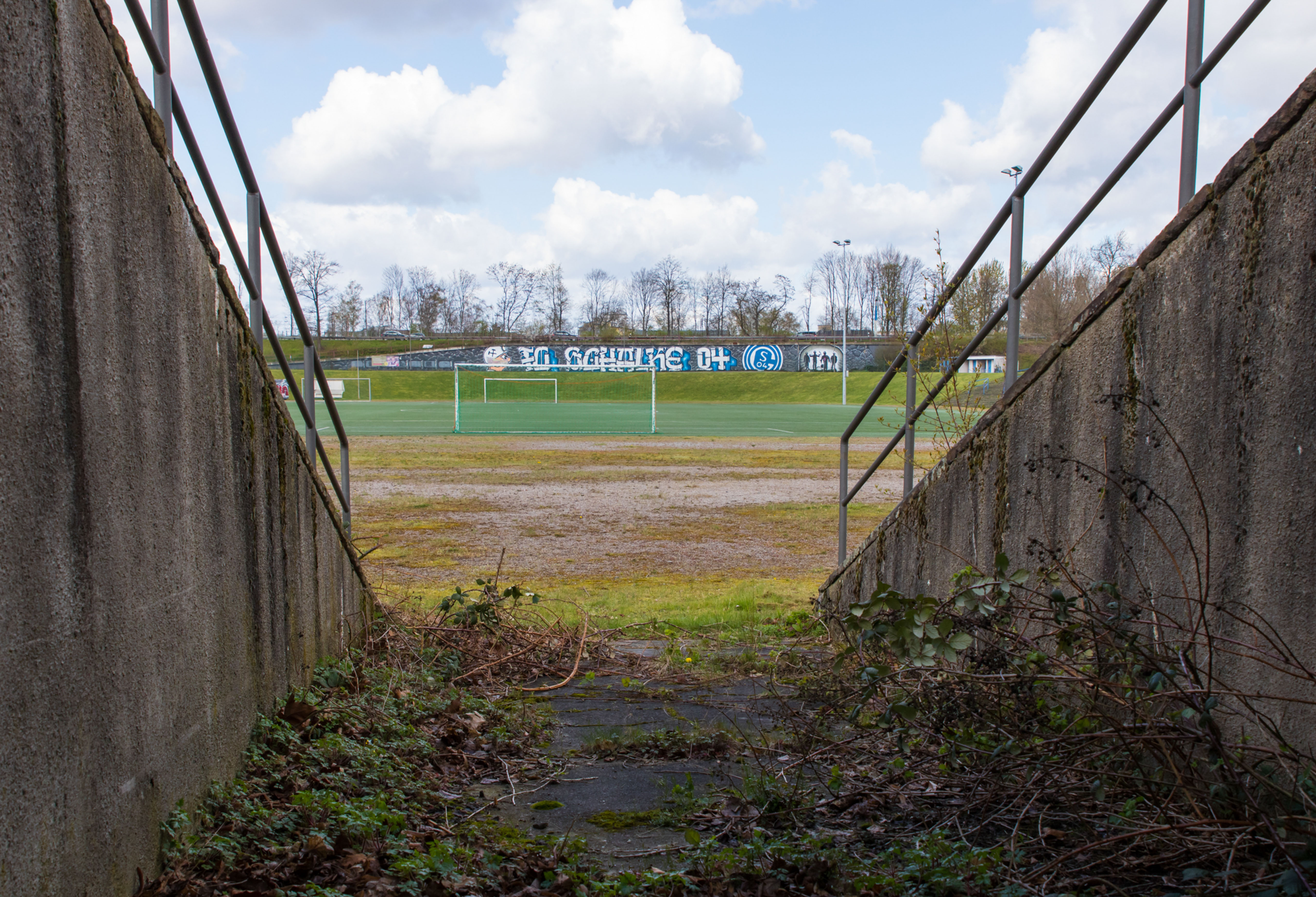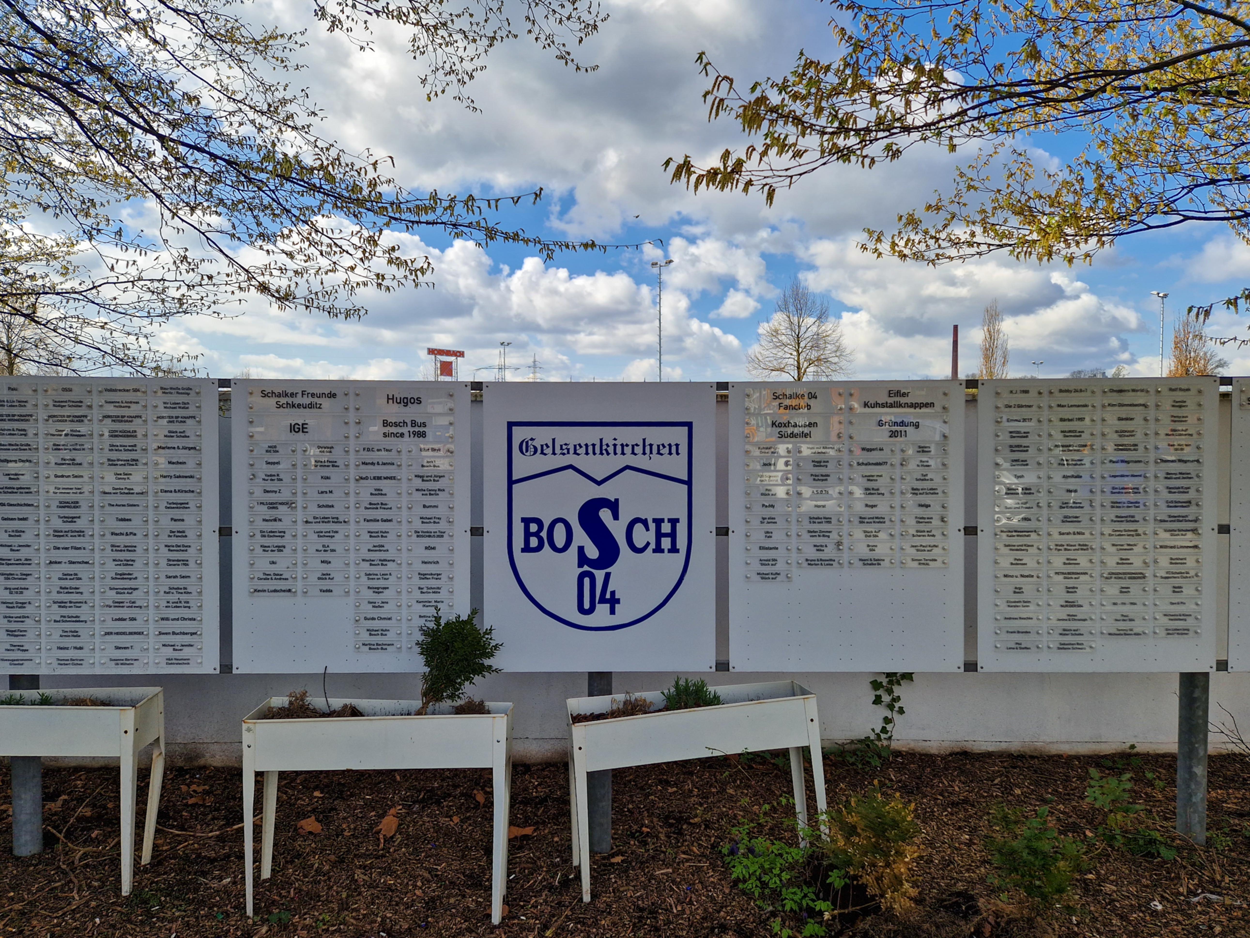 De man fotografeerde alles. De betonnen opstapjes. De oude stenen toegangspoort met de teksten Kampfbahn Glückauf en F.C. Gelsenkirchen-Schalke 04 E.V. De eigenaardige uitkijktoren aan de zijkant, die eruitzag alsof hij ooit meer had gezien dan hij nog mocht vertellen. Hij bleef hangen bij het contrast tussen de stenen hoofdtribune met haar houten bankjes en blauwe metalen steunen, en de kleine staantribune waarboven flatgebouwen en bouwkranen de horizon bezetten.