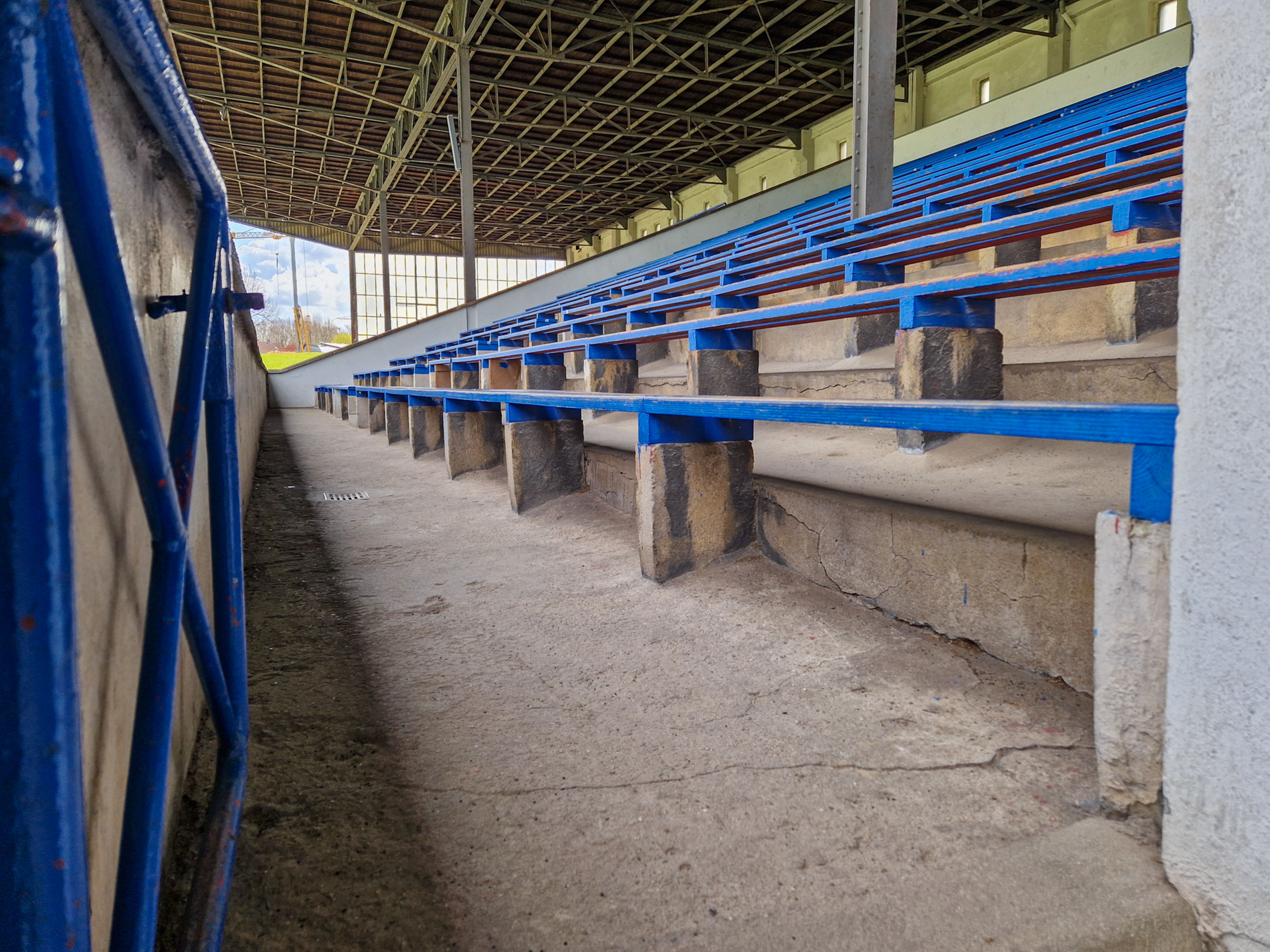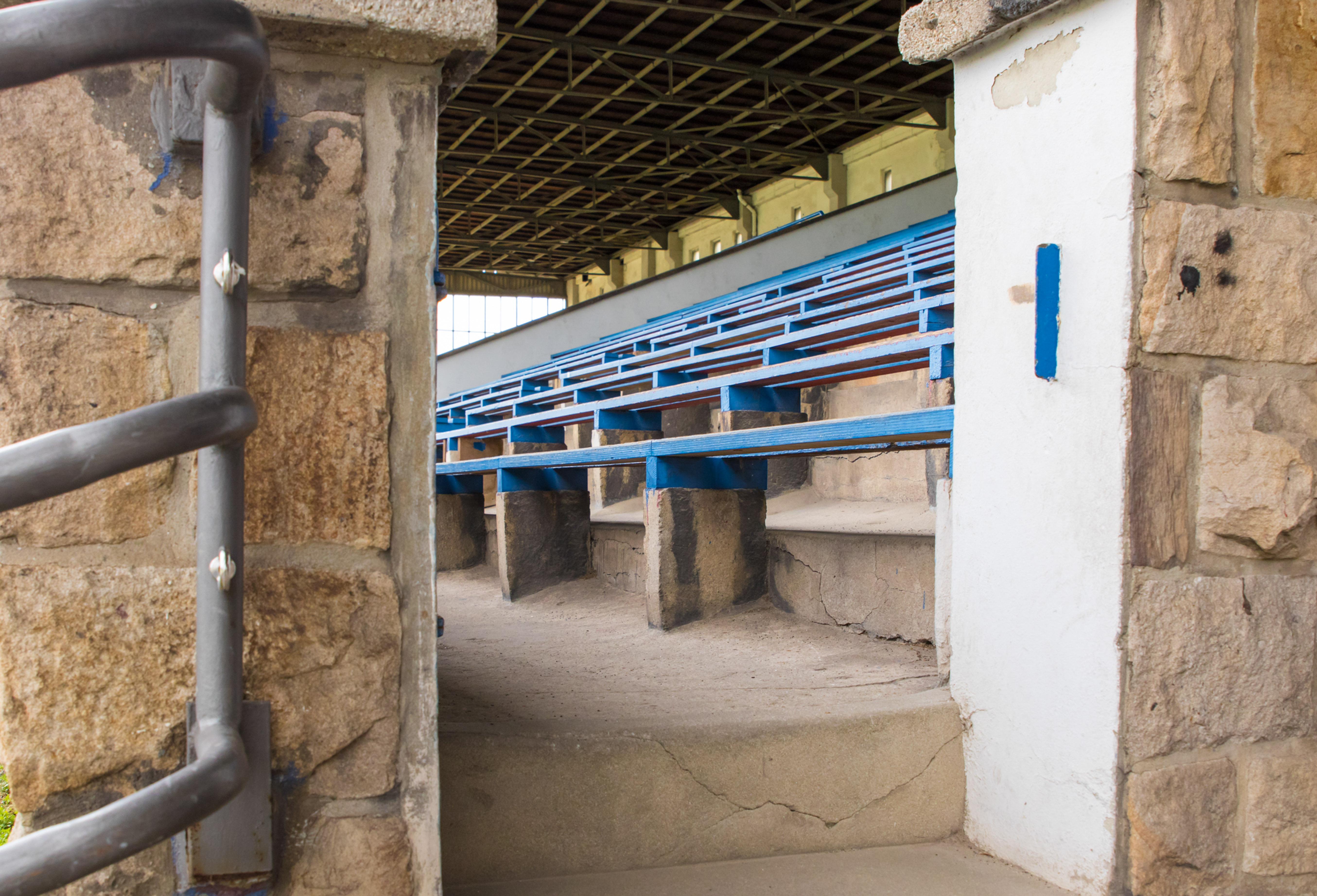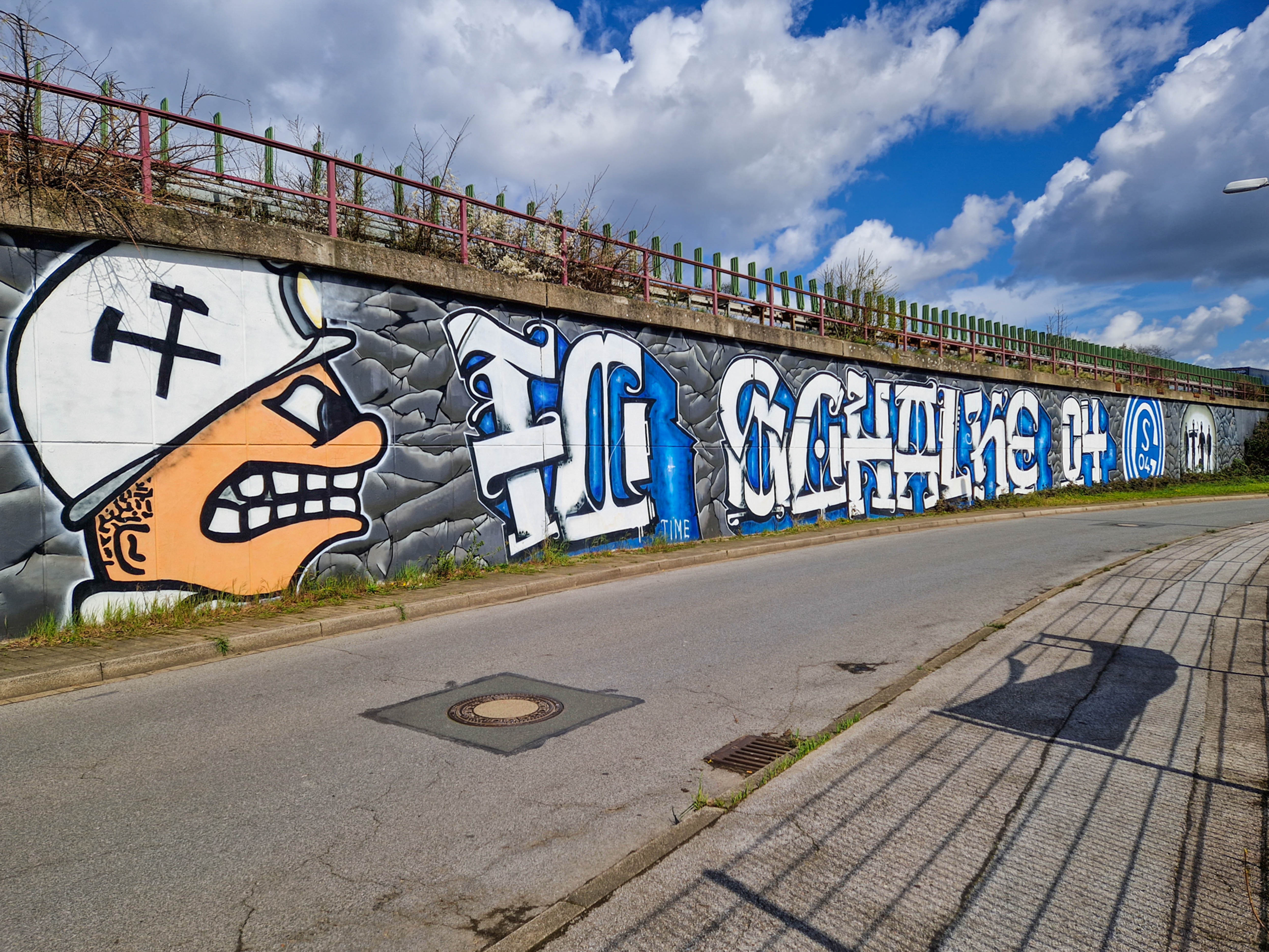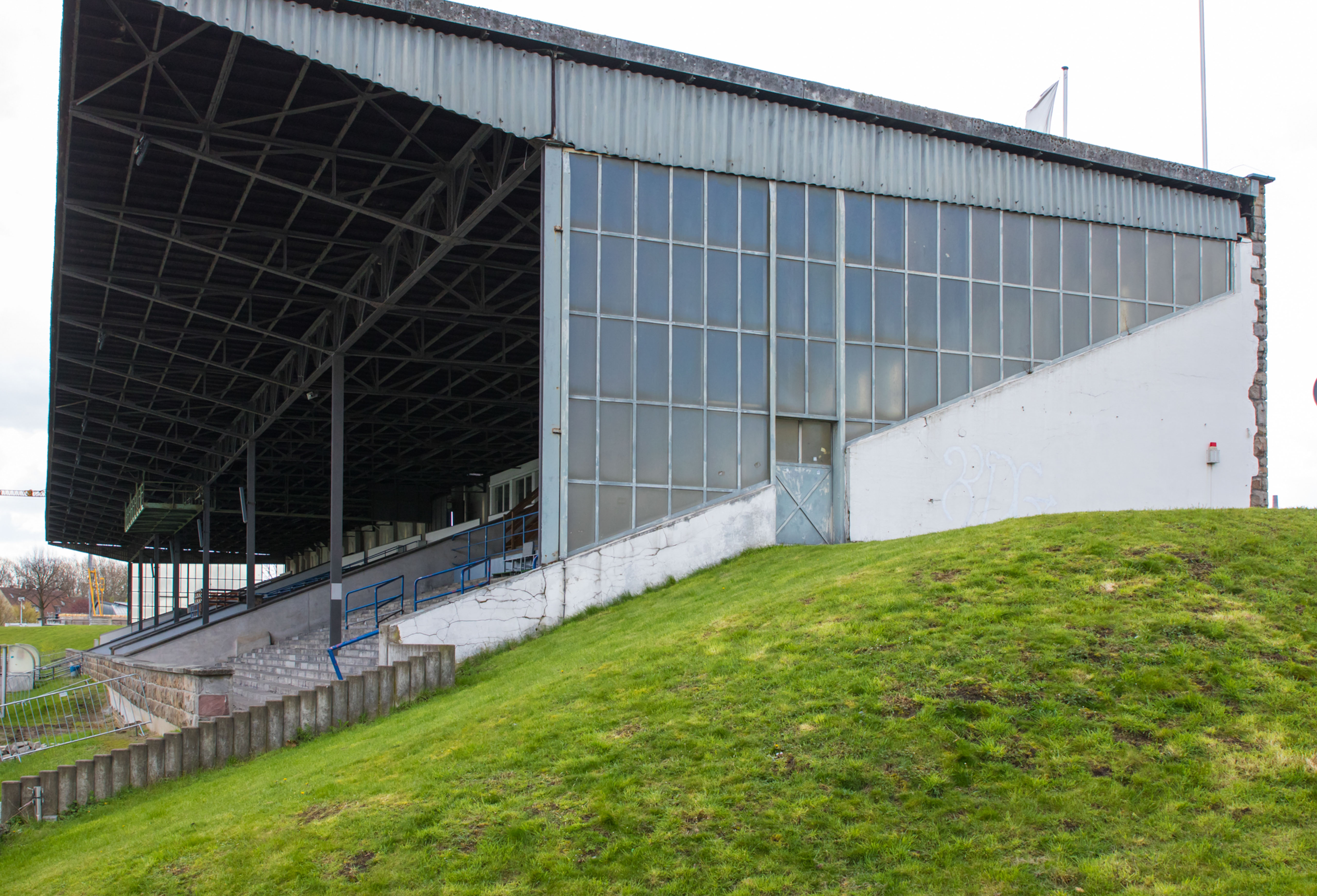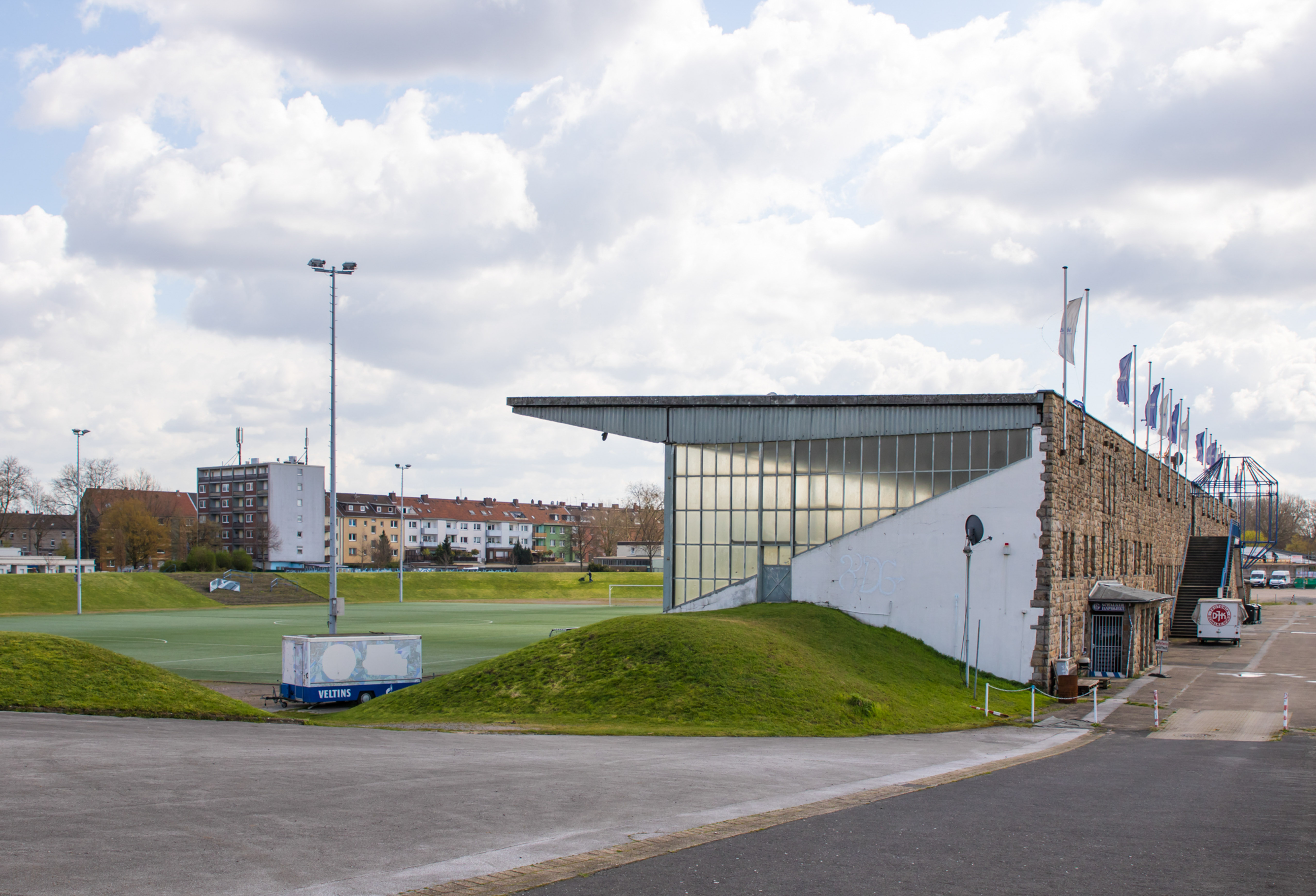 De man fotografeerde alles. De betonnen opstapjes. De oude stenen toegangspoort met de teksten Kampfbahn Glückauf en F.C. Gelsenkirchen-Schalke 04 E.V. De eigenaardige uitkijktoren aan de zijkant, die eruitzag alsof hij ooit meer had gezien dan hij nog mocht vertellen. Hij bleef hangen bij het contrast tussen de stenen hoofdtribune met haar houten bankjes en blauwe metalen steunen, en de kleine staantribune waarboven flatgebouwen en bouwkranen de horizon bezetten.