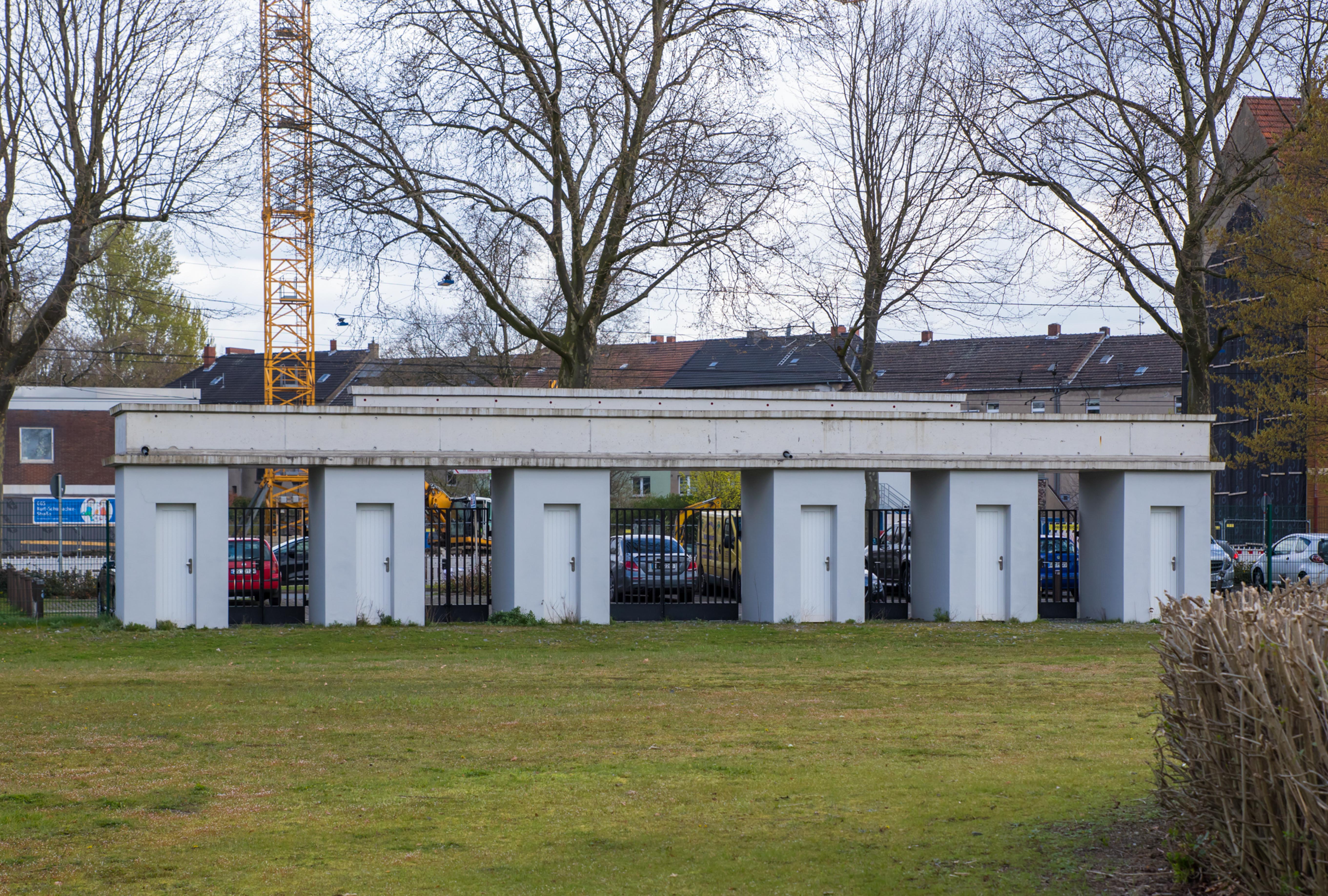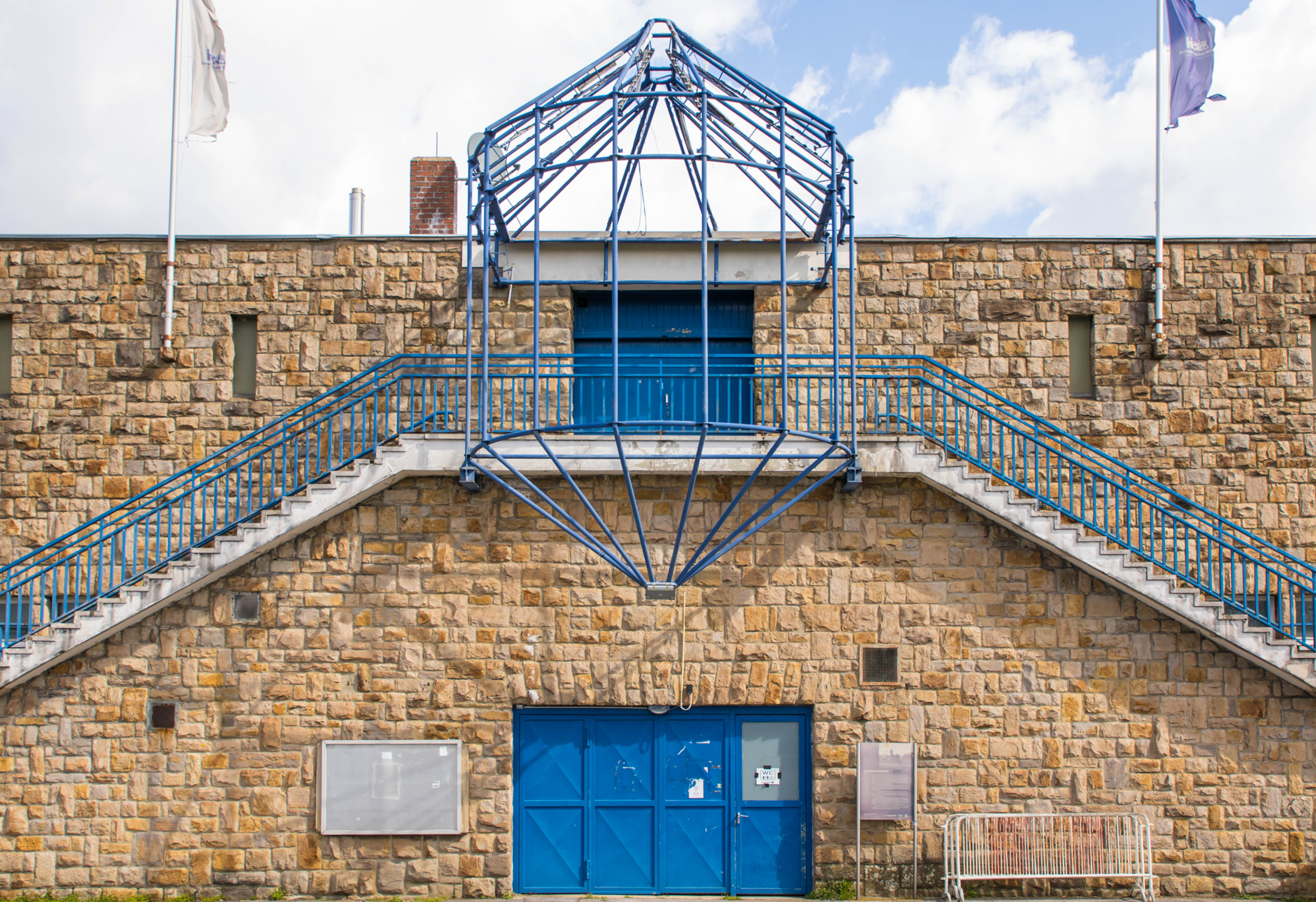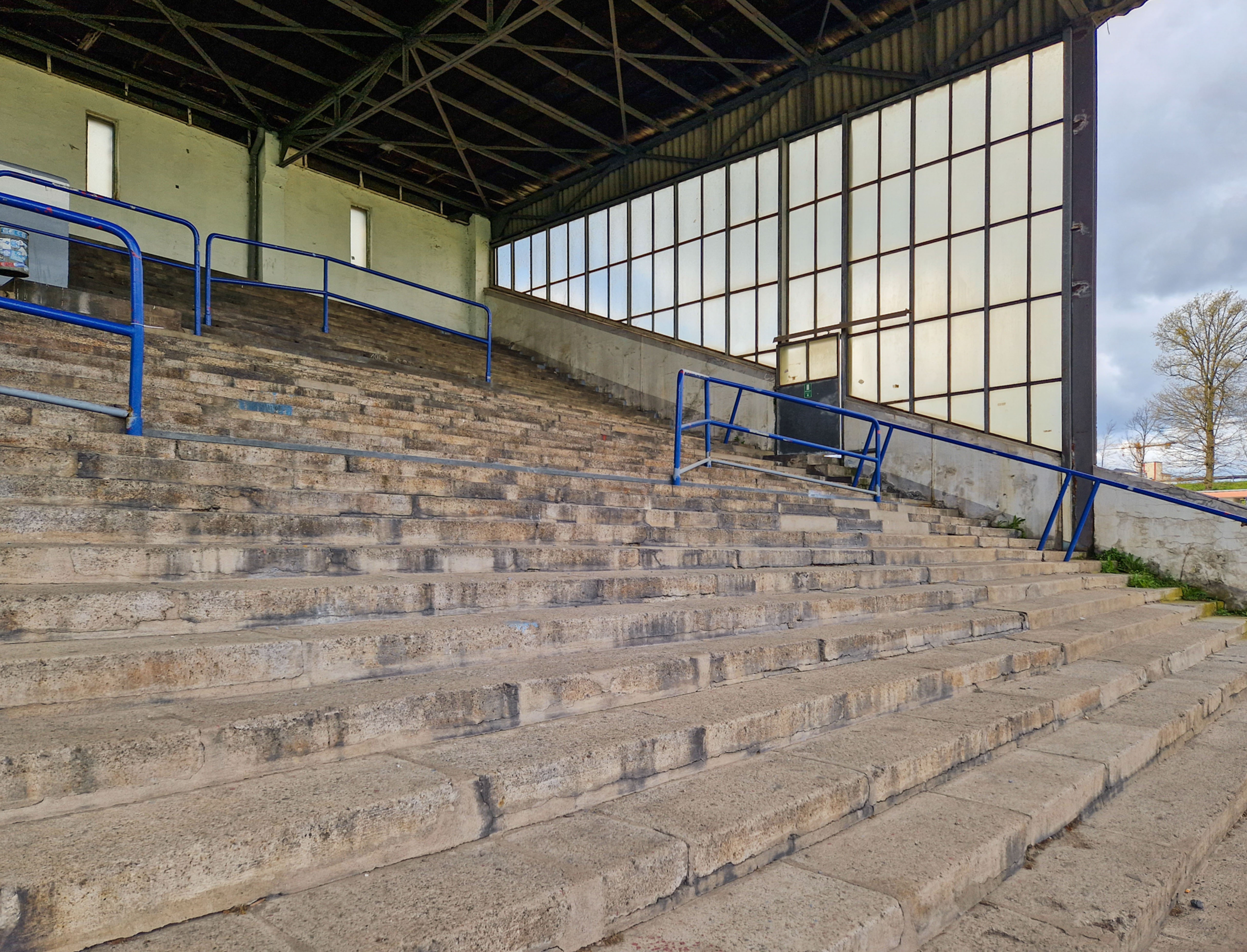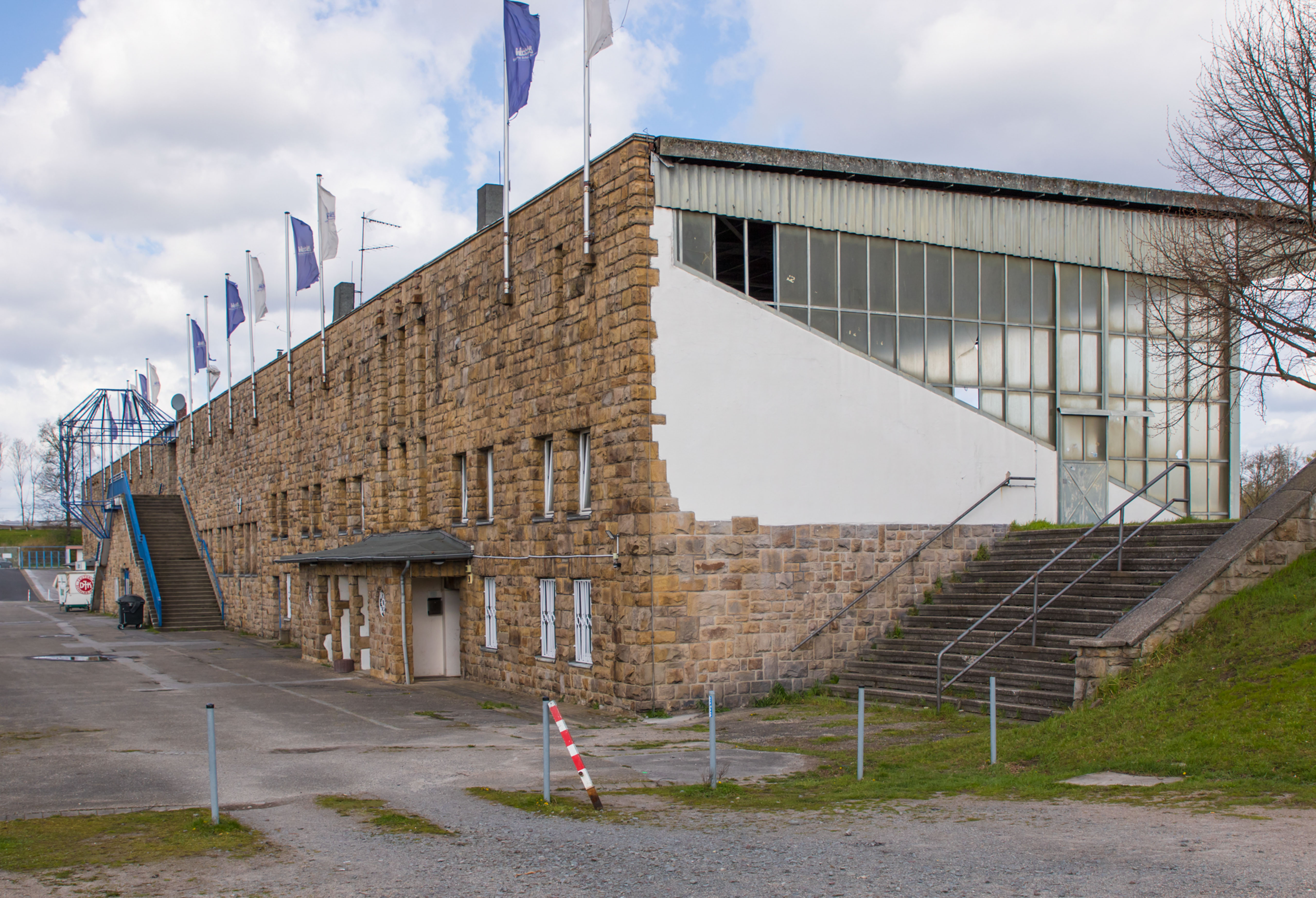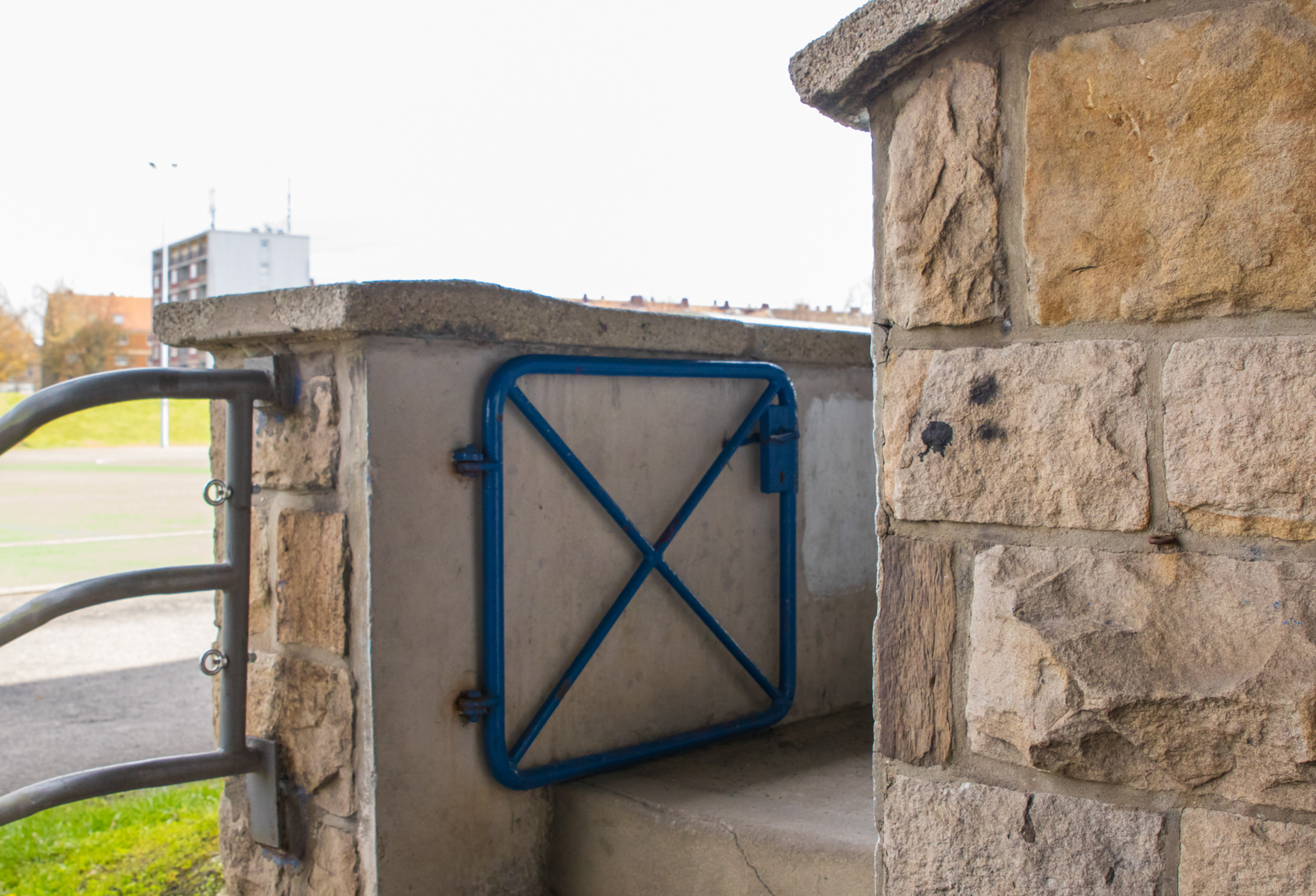 De man fotografeerde alles. De betonnen opstapjes. De oude stenen toegangspoort met de teksten Kampfbahn Glückauf en F.C. Gelsenkirchen-Schalke 04 E.V. De eigenaardige uitkijktoren aan de zijkant, die eruitzag alsof hij ooit meer had gezien dan hij nog mocht vertellen. Hij bleef hangen bij het contrast tussen de stenen hoofdtribune met haar houten bankjes en blauwe metalen steunen, en de kleine staantribune waarboven flatgebouwen en bouwkranen de horizon bezetten.