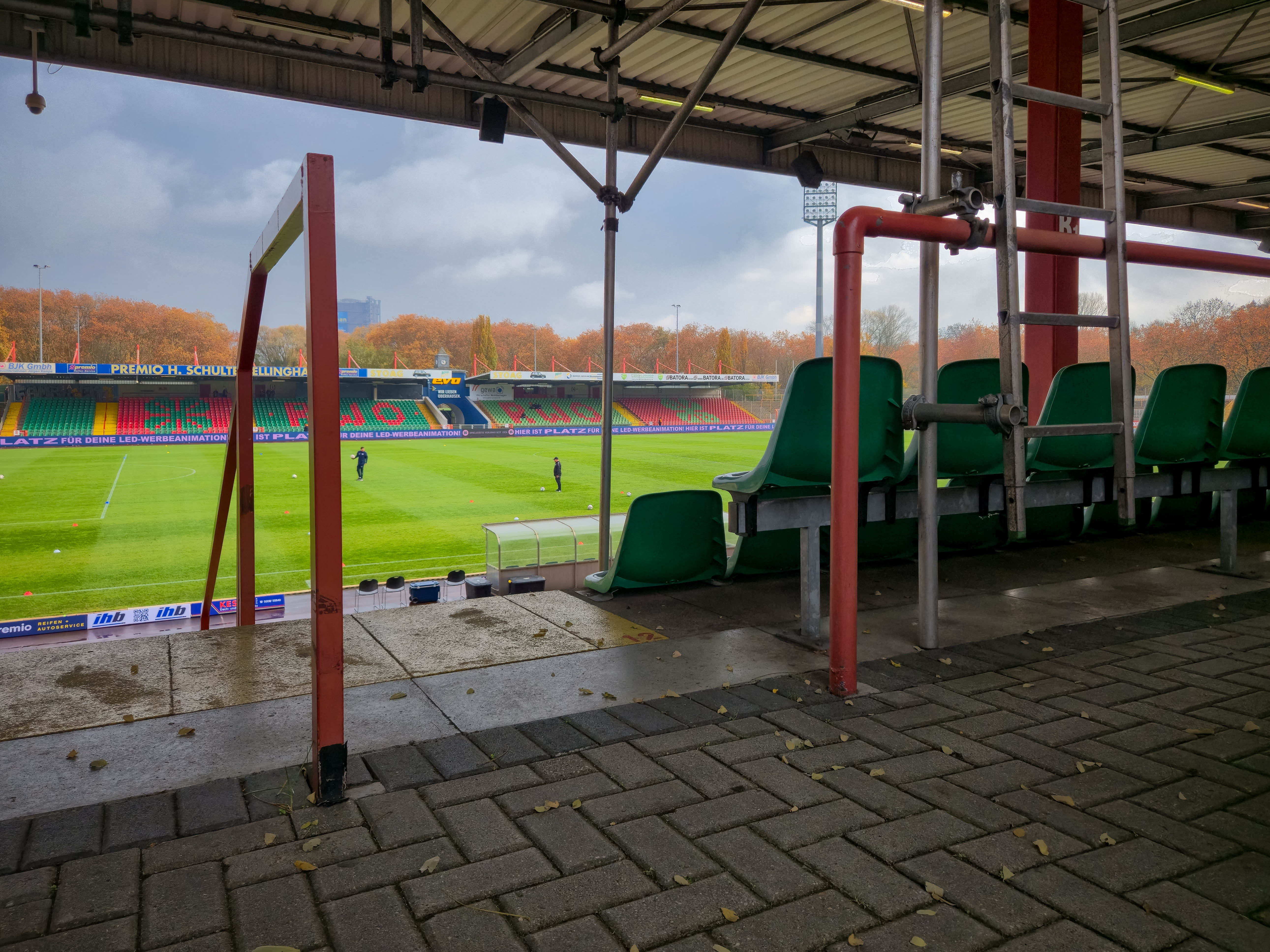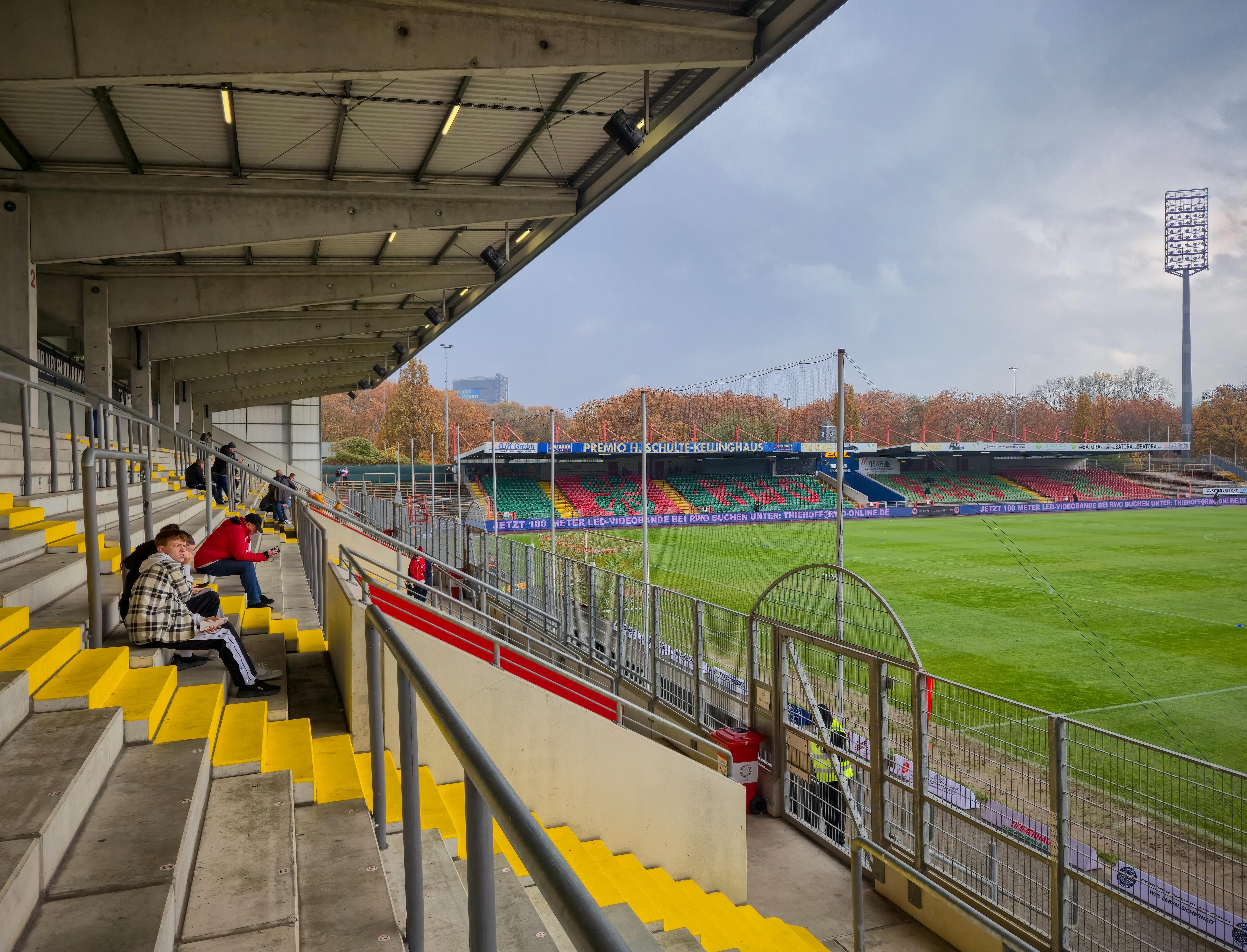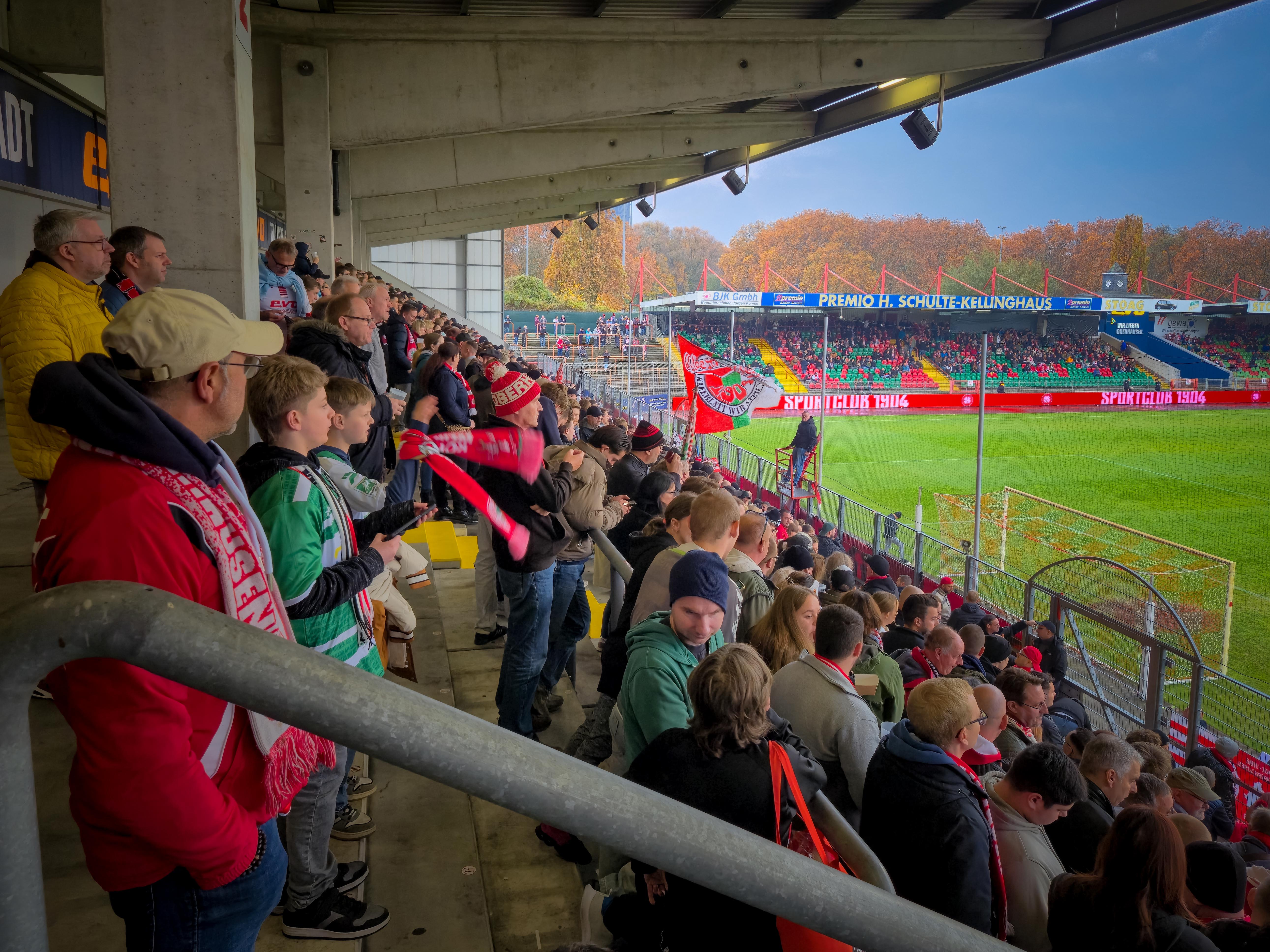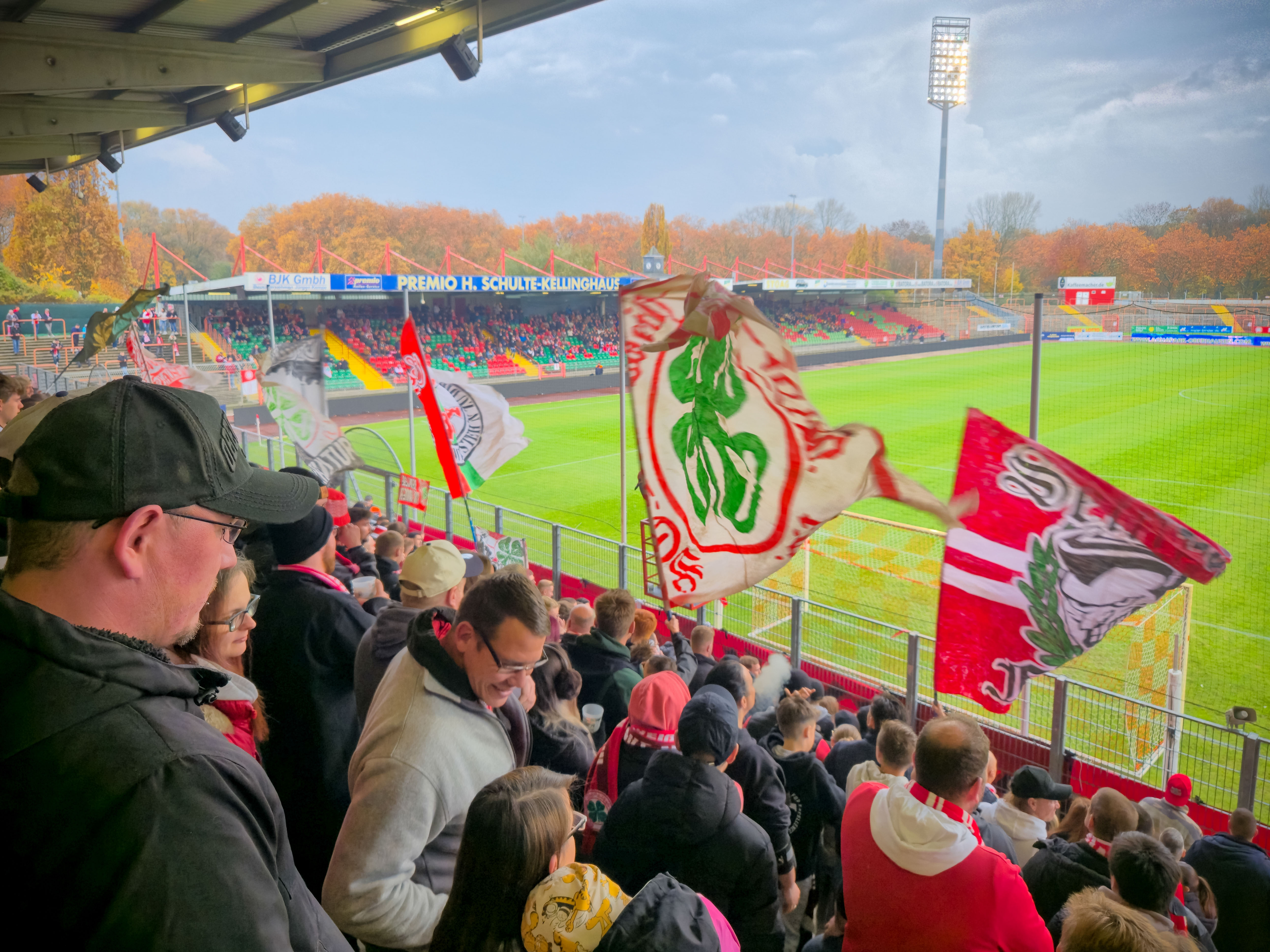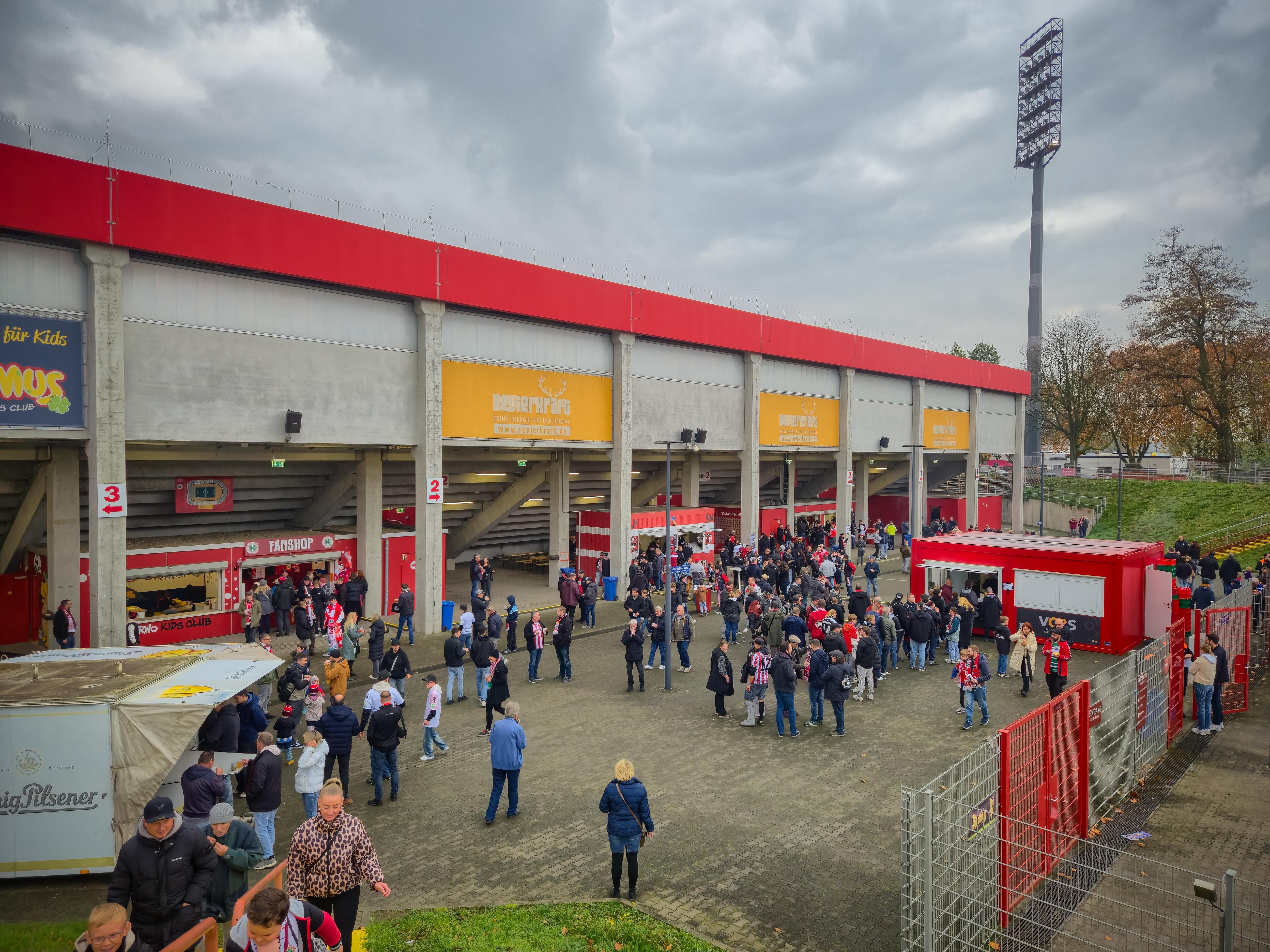 Want dat is Niederrhein. Een stadion dat niet perfect wil zijn. Een club die niet doet alsof ze Champions League spelen. Hier is voetbal nog rauw, ongepolijst, menselijk. Je krijgt piepende oren van de speakers, je ziet nauwelijks de wedstrijd door de vlaggen, en je maag blijft leeg omdat de catering de speelregels niet kent. Maar je ziel vult zich.