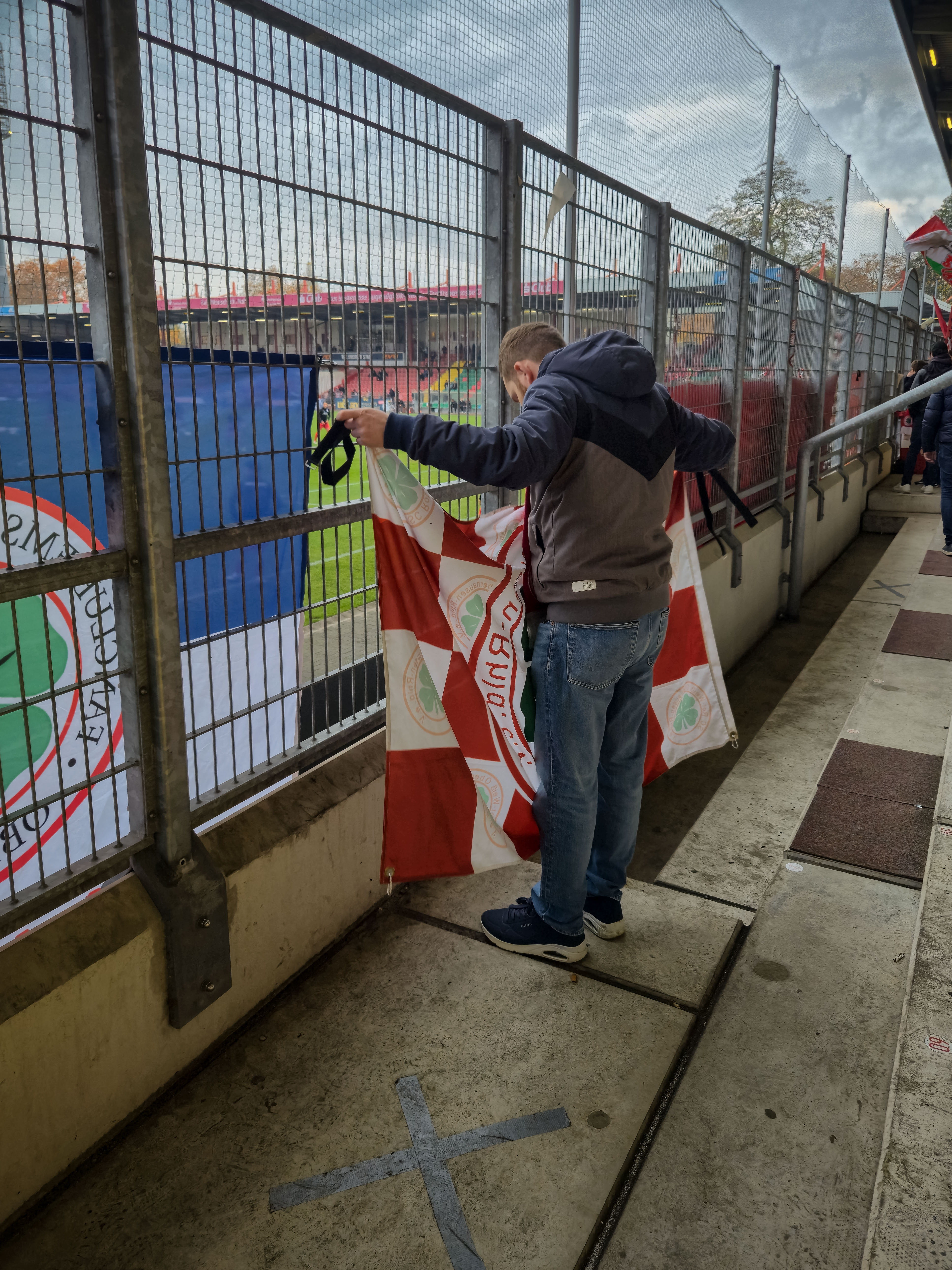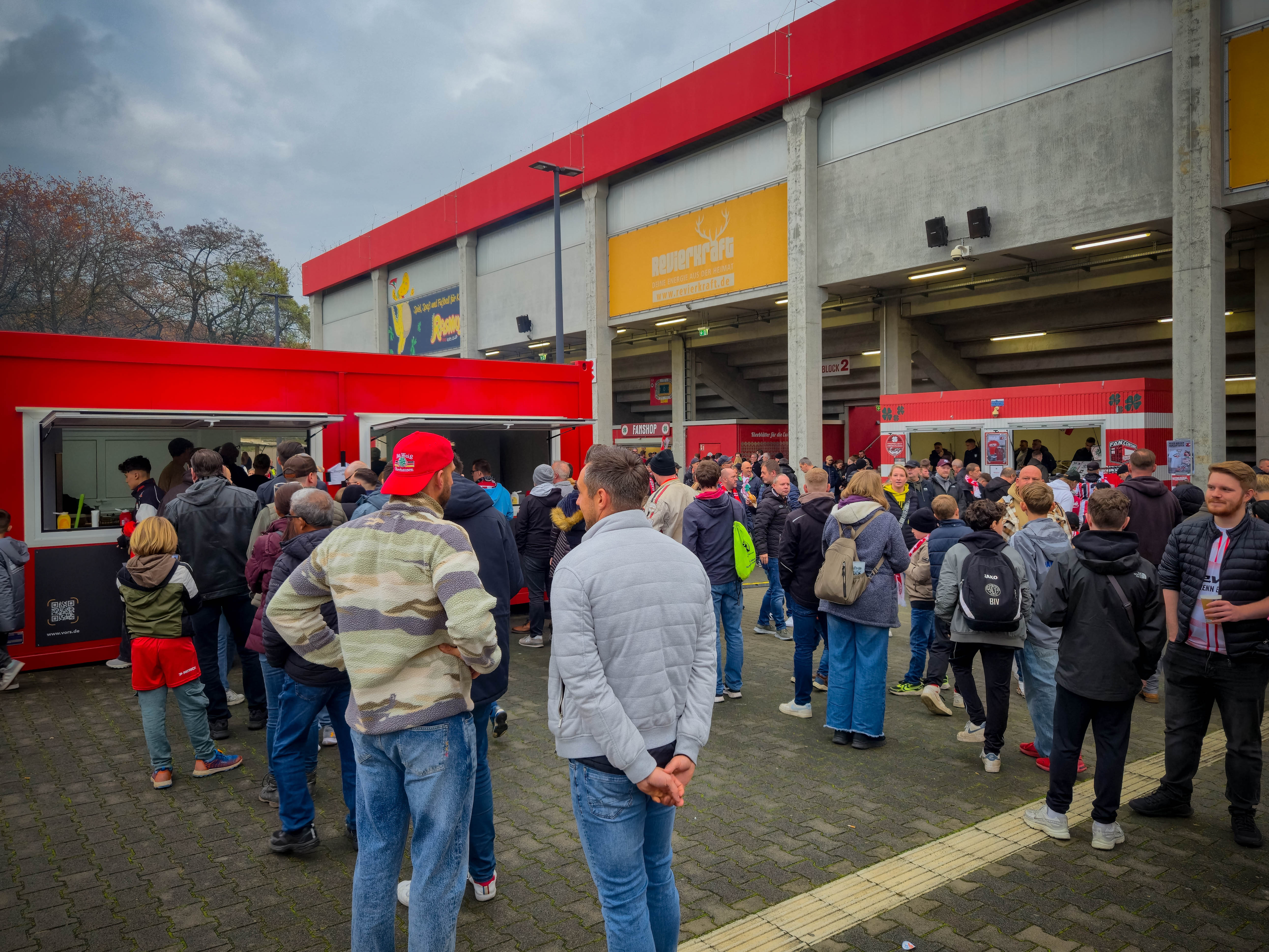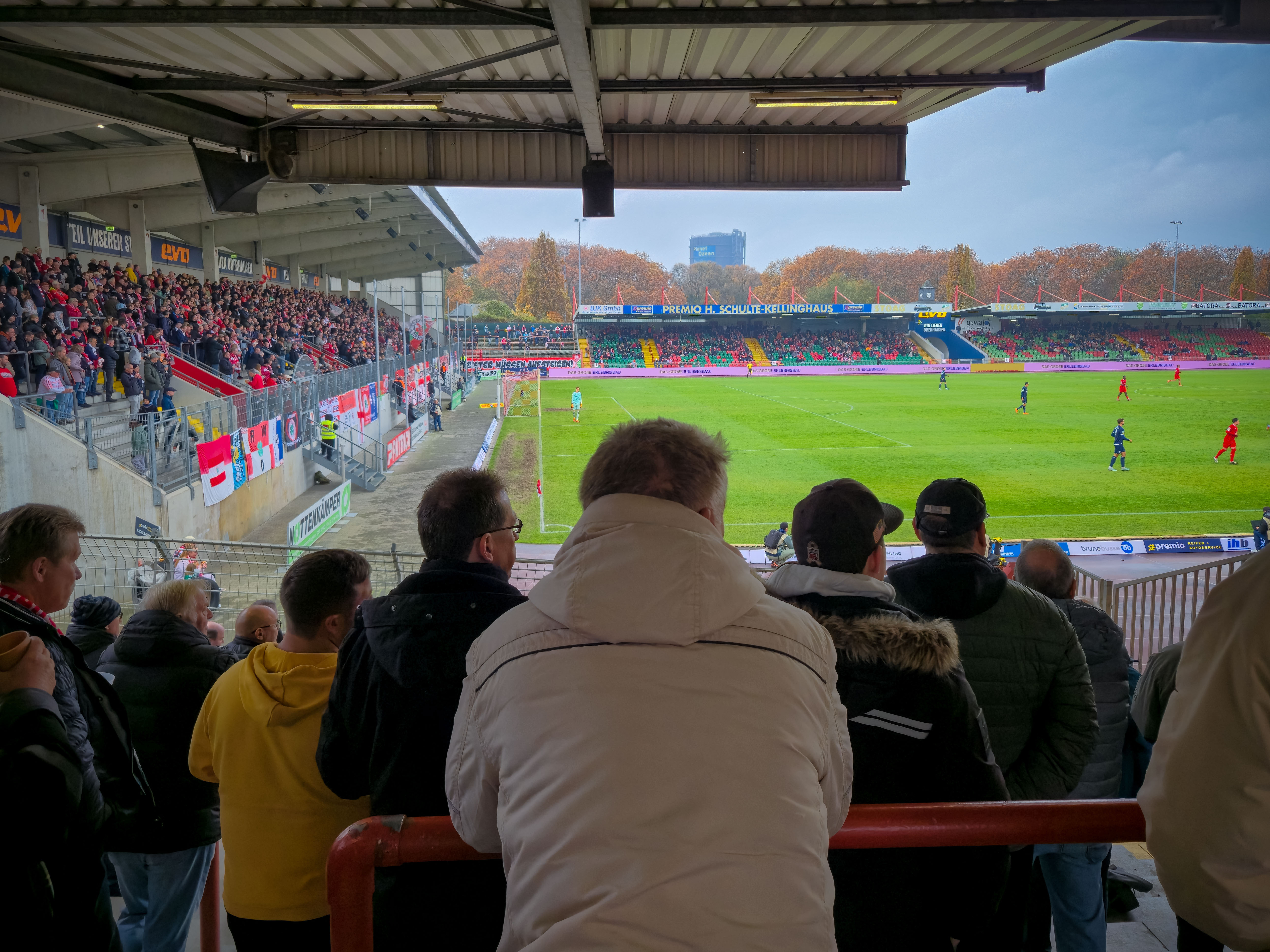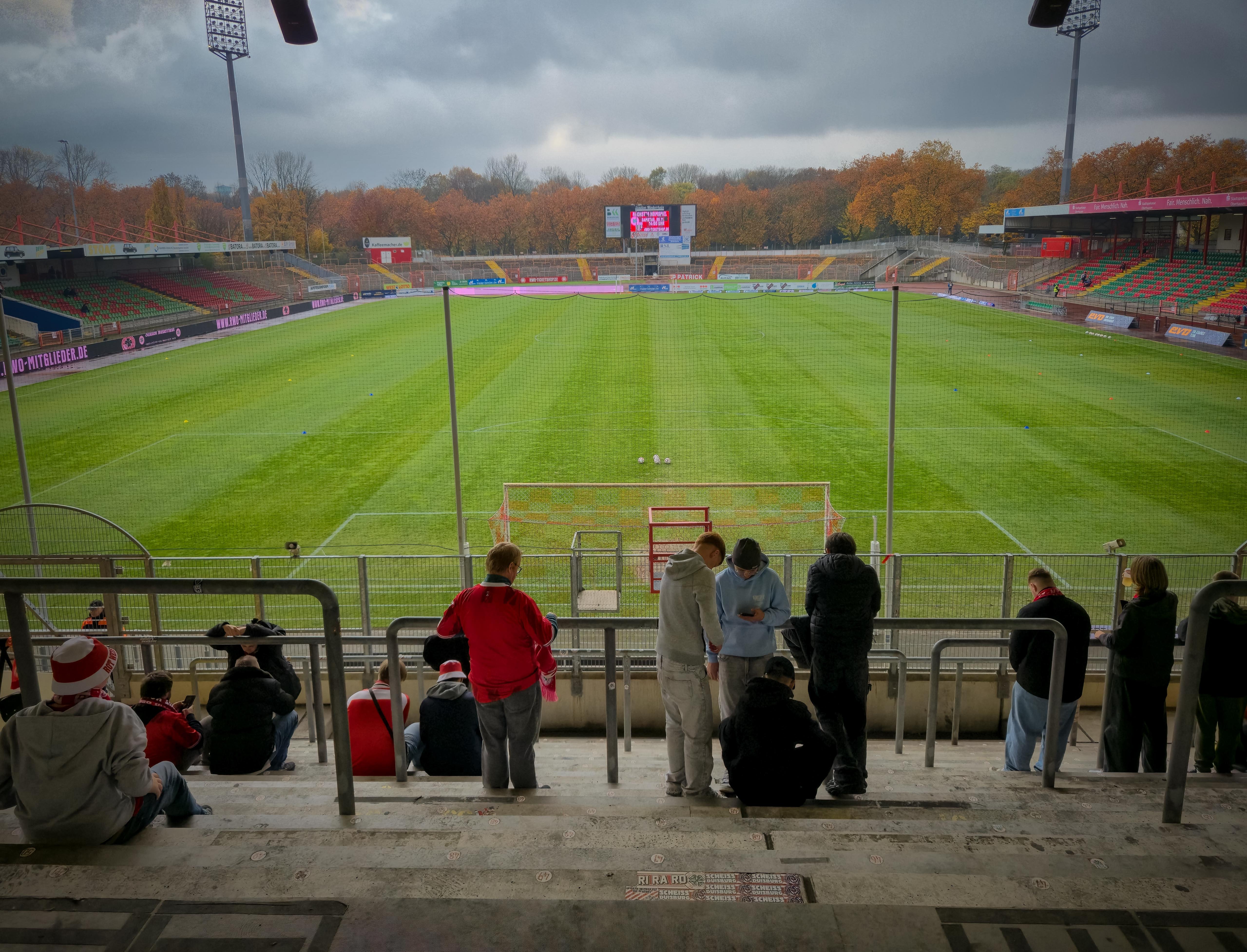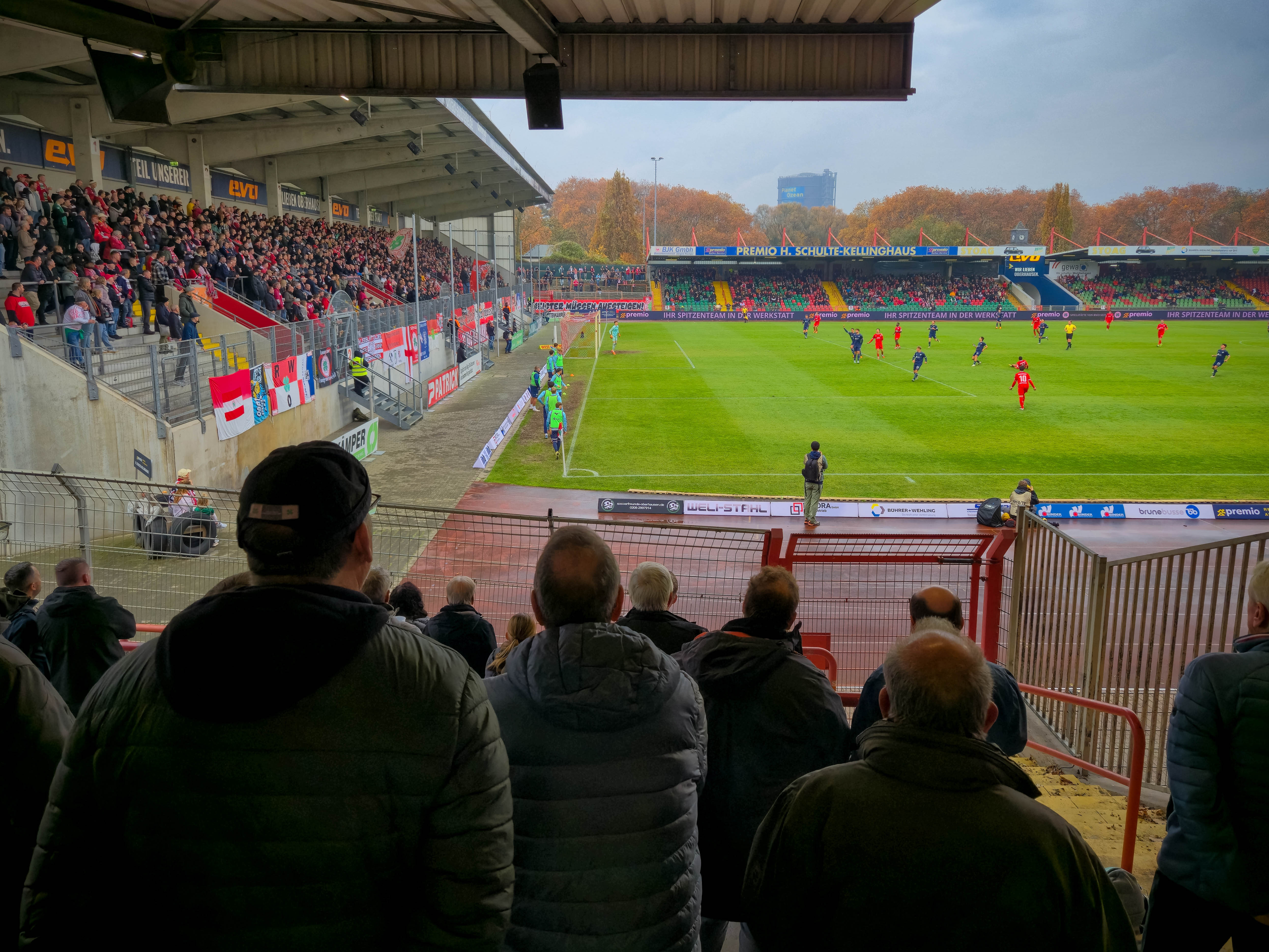 Want dat is Niederrhein. Een stadion dat niet perfect wil zijn. Een club die niet doet alsof ze Champions League spelen. Hier is voetbal nog rauw, ongepolijst, menselijk. Je krijgt piepende oren van de speakers, je ziet nauwelijks de wedstrijd door de vlaggen, en je maag blijft leeg omdat de catering de speelregels niet kent. Maar je ziel vult zich.