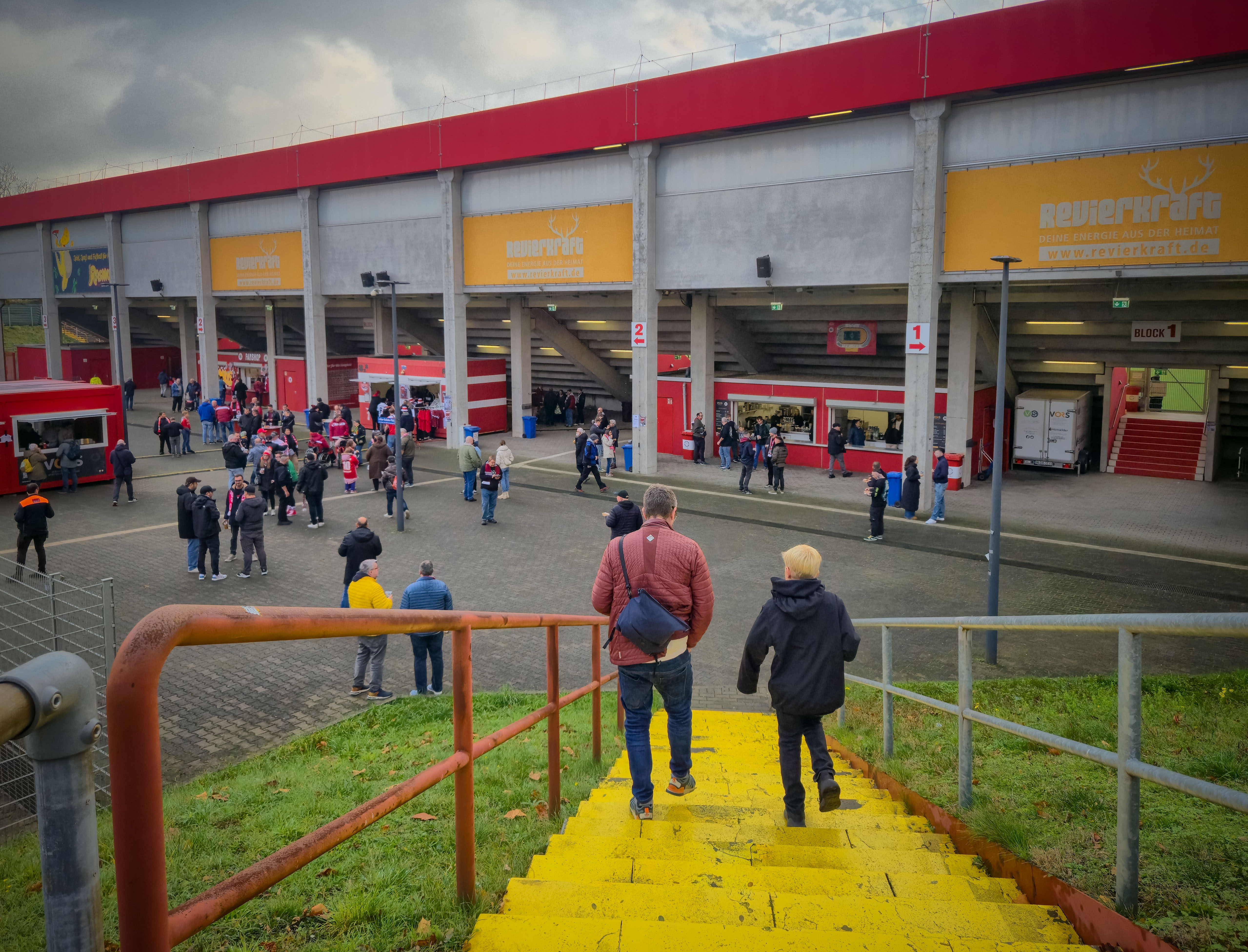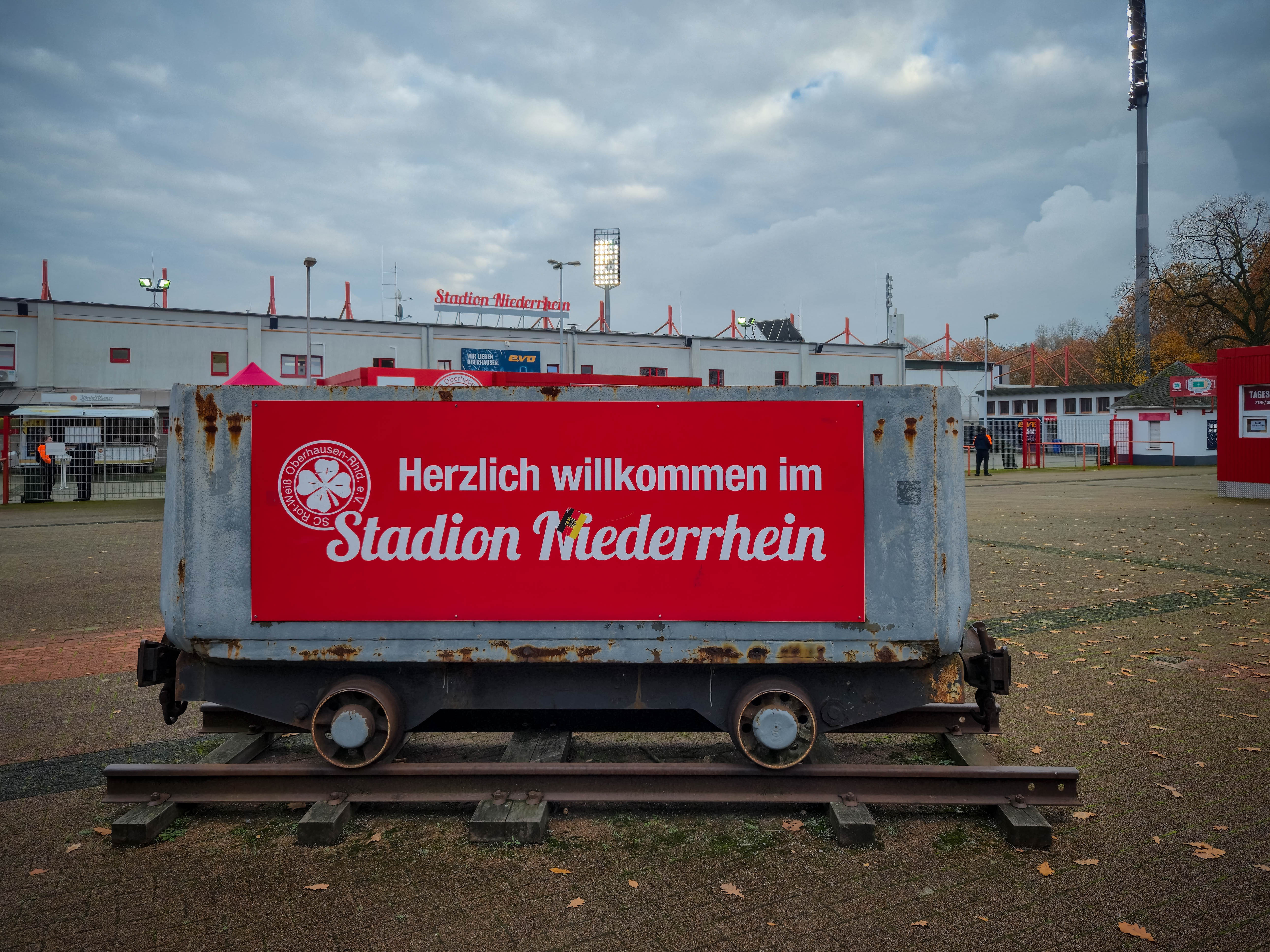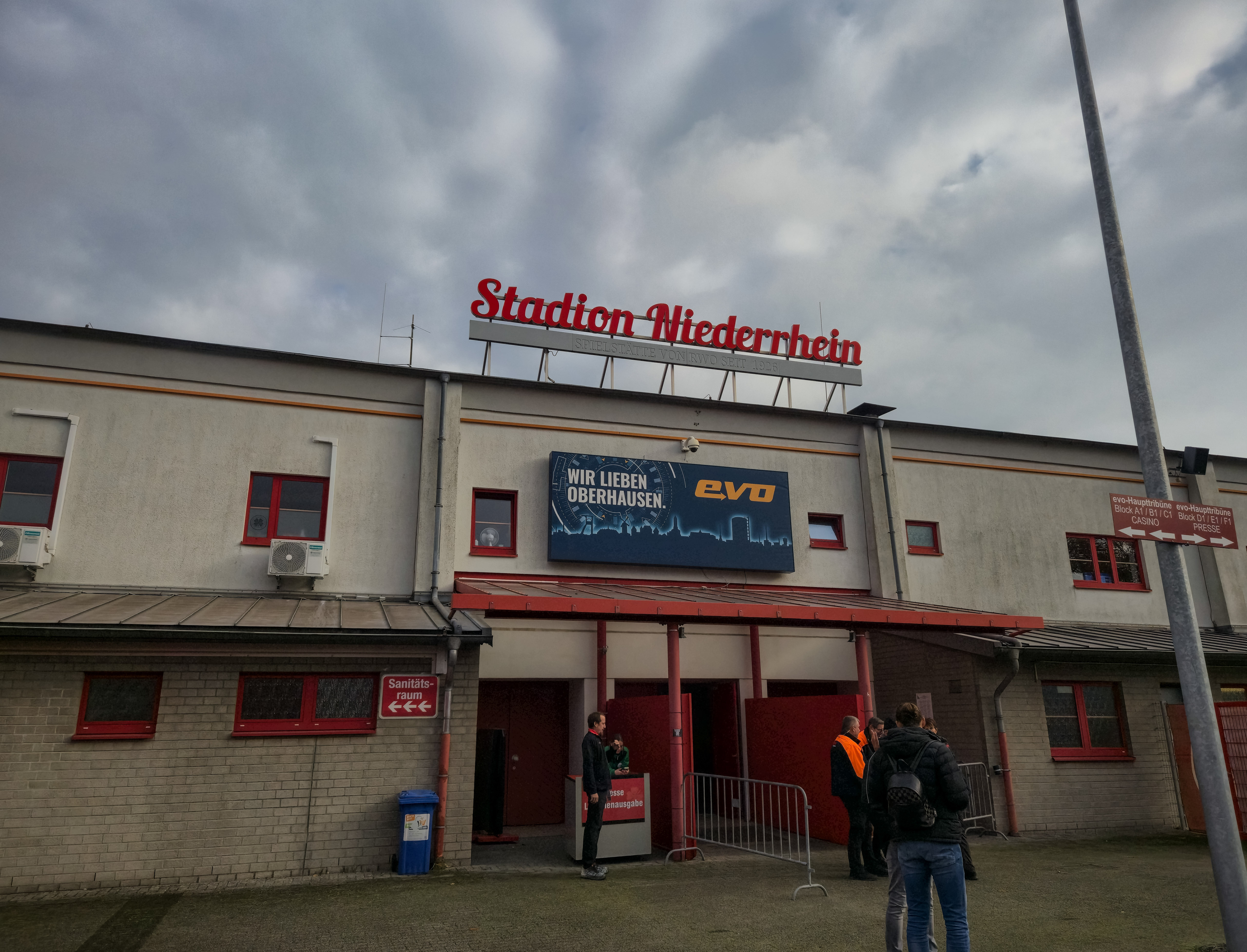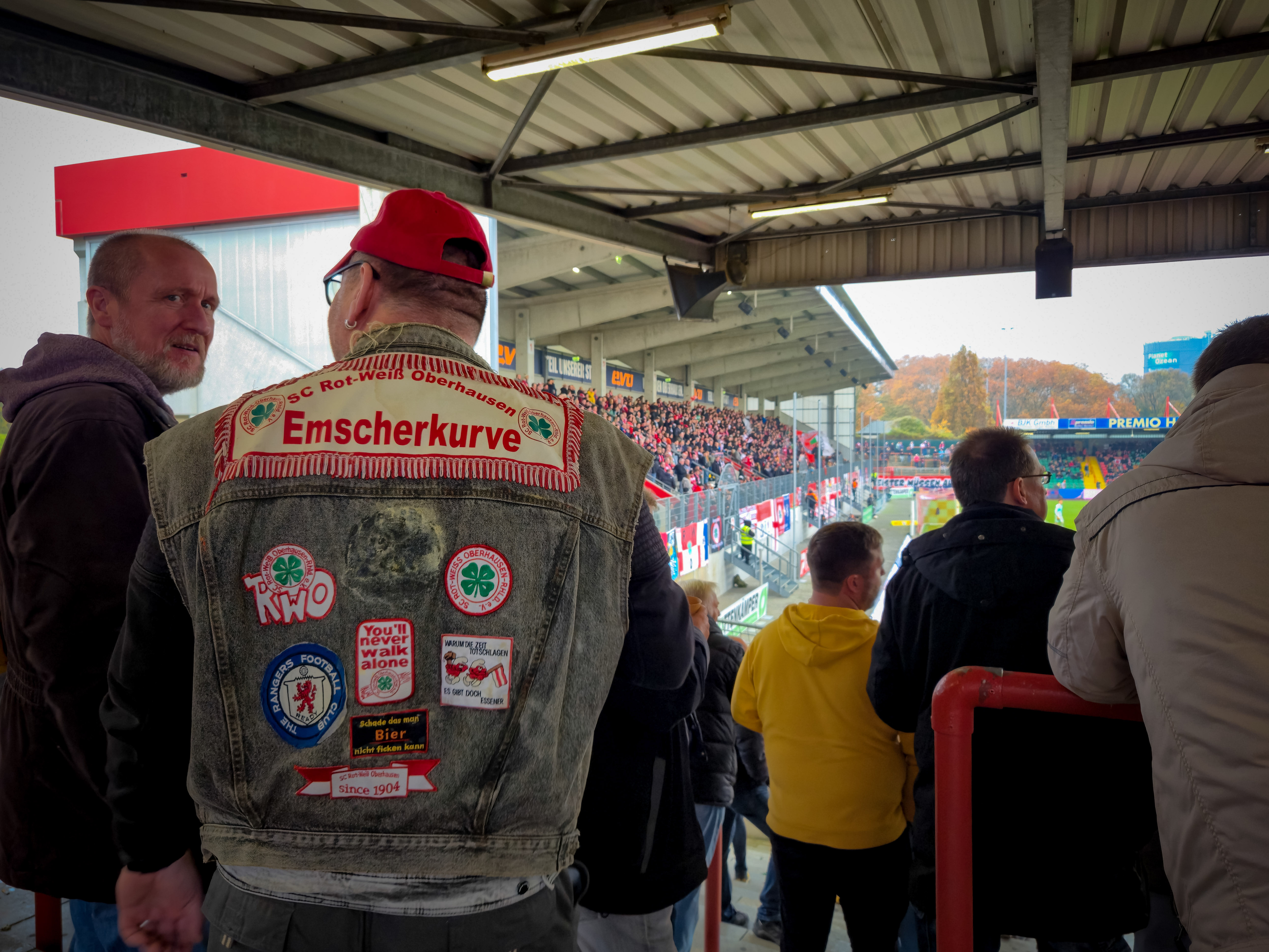 Niederrhein Stadion - Rot-Weiß OberhausenHet industrieterrein rondom het stadion versterkt de melancholie. Loodsen, fabrieken, roestige hekken. Het decor van een club die niet perfect wil zijn. Hier geen glimmende arena’s met sushi in de business lounge. Hier een lichtmast die je al vanaf de snelweg ziet. Een catering die de speelregels niet kent. Een capo die denkt dat hij DJ is.