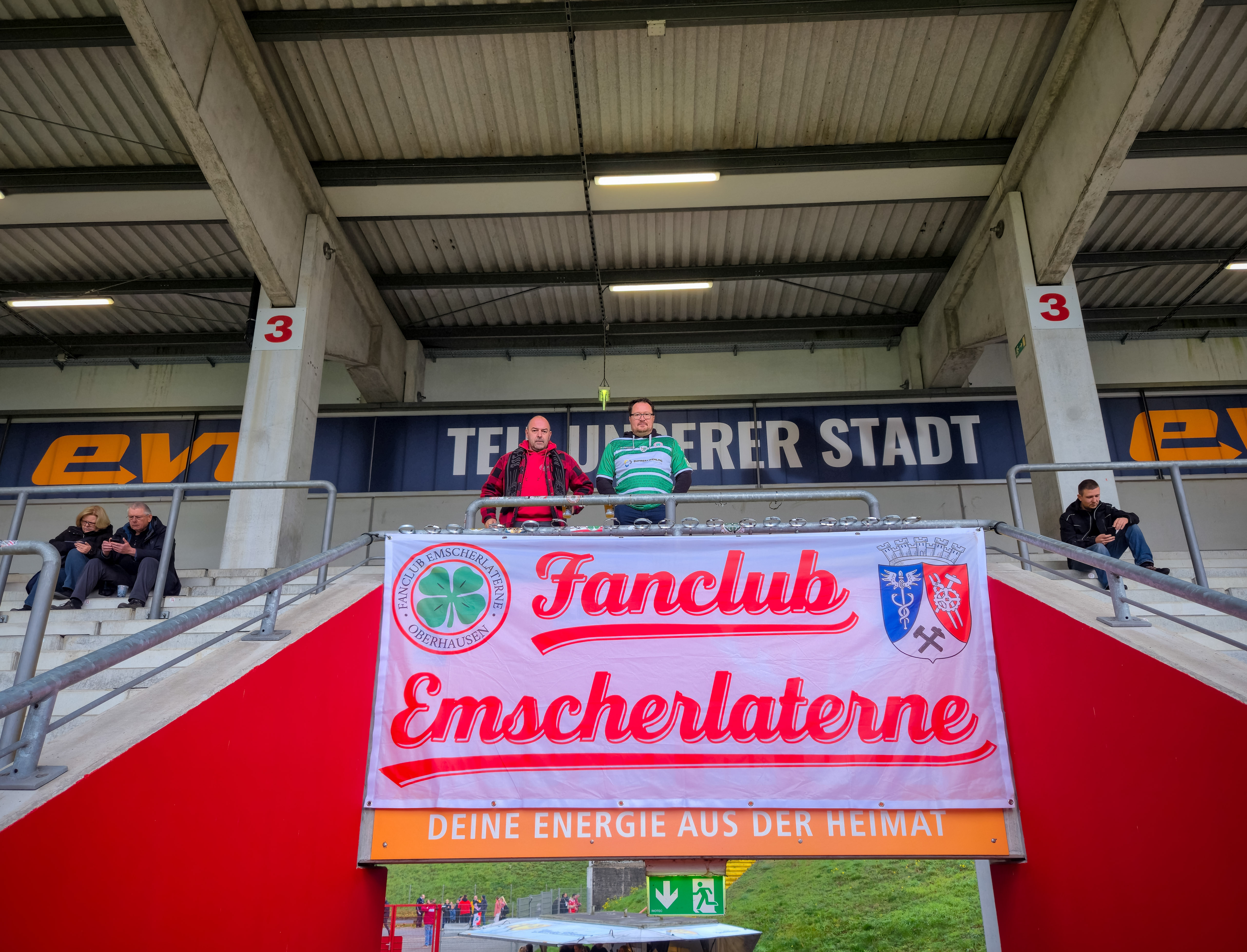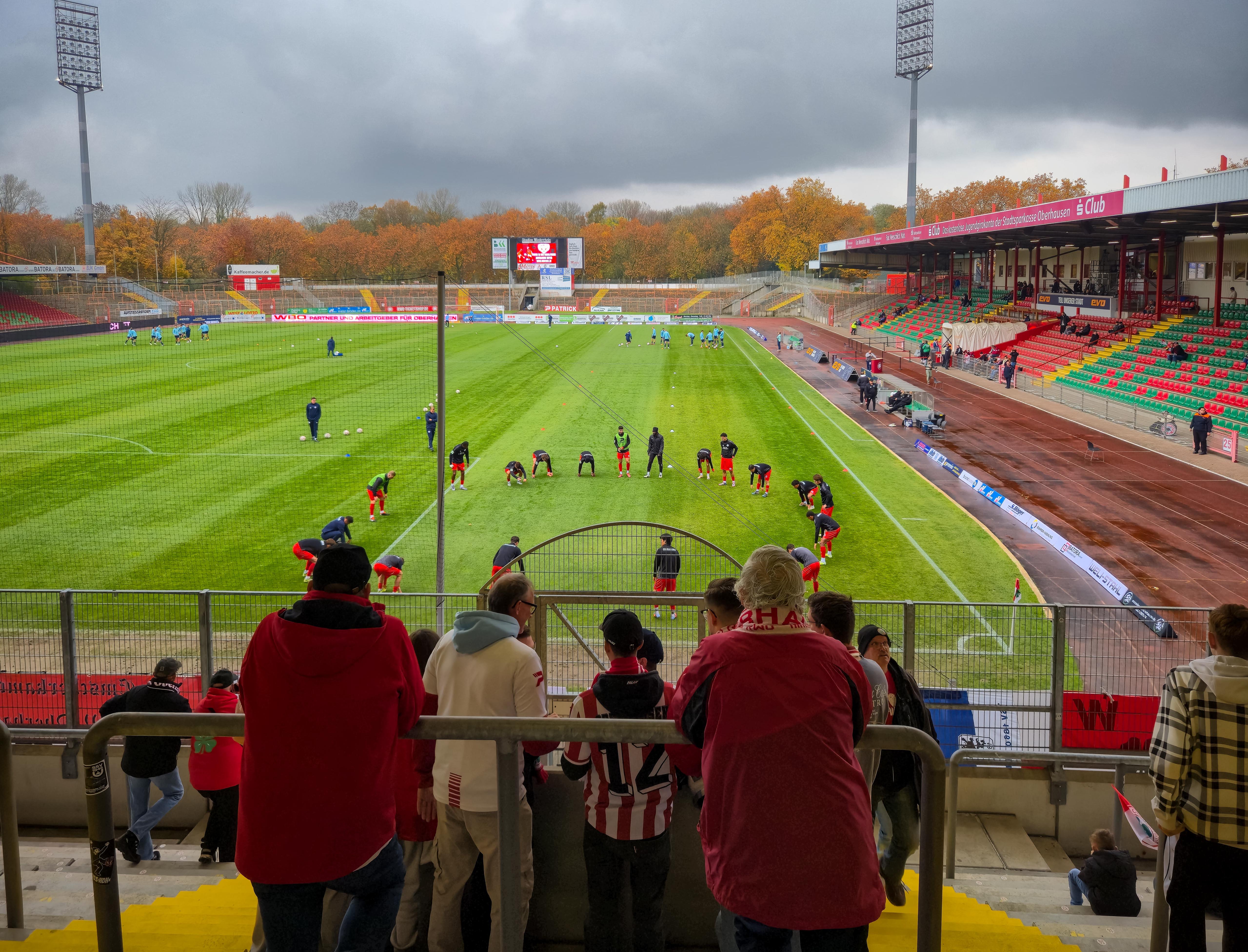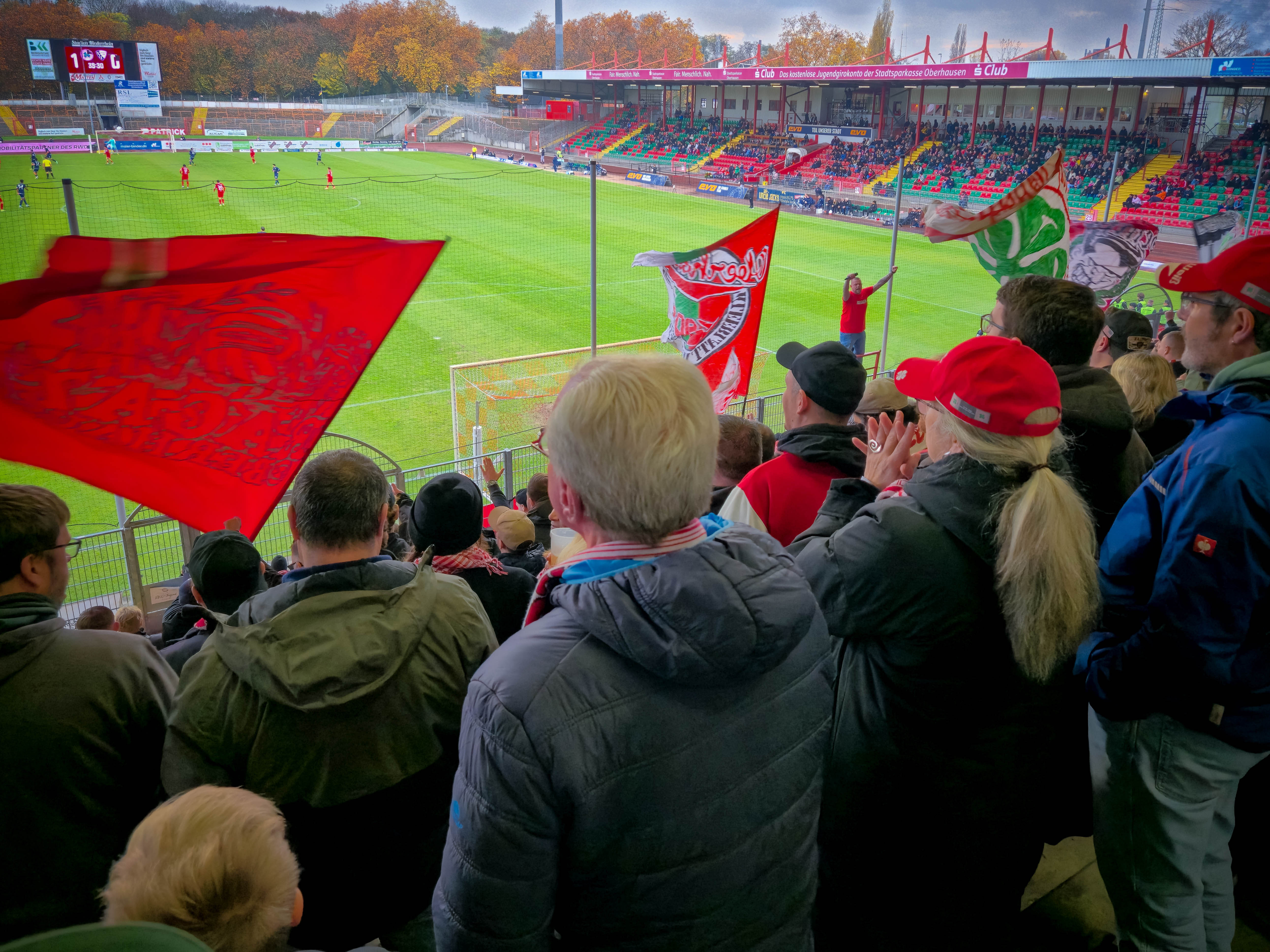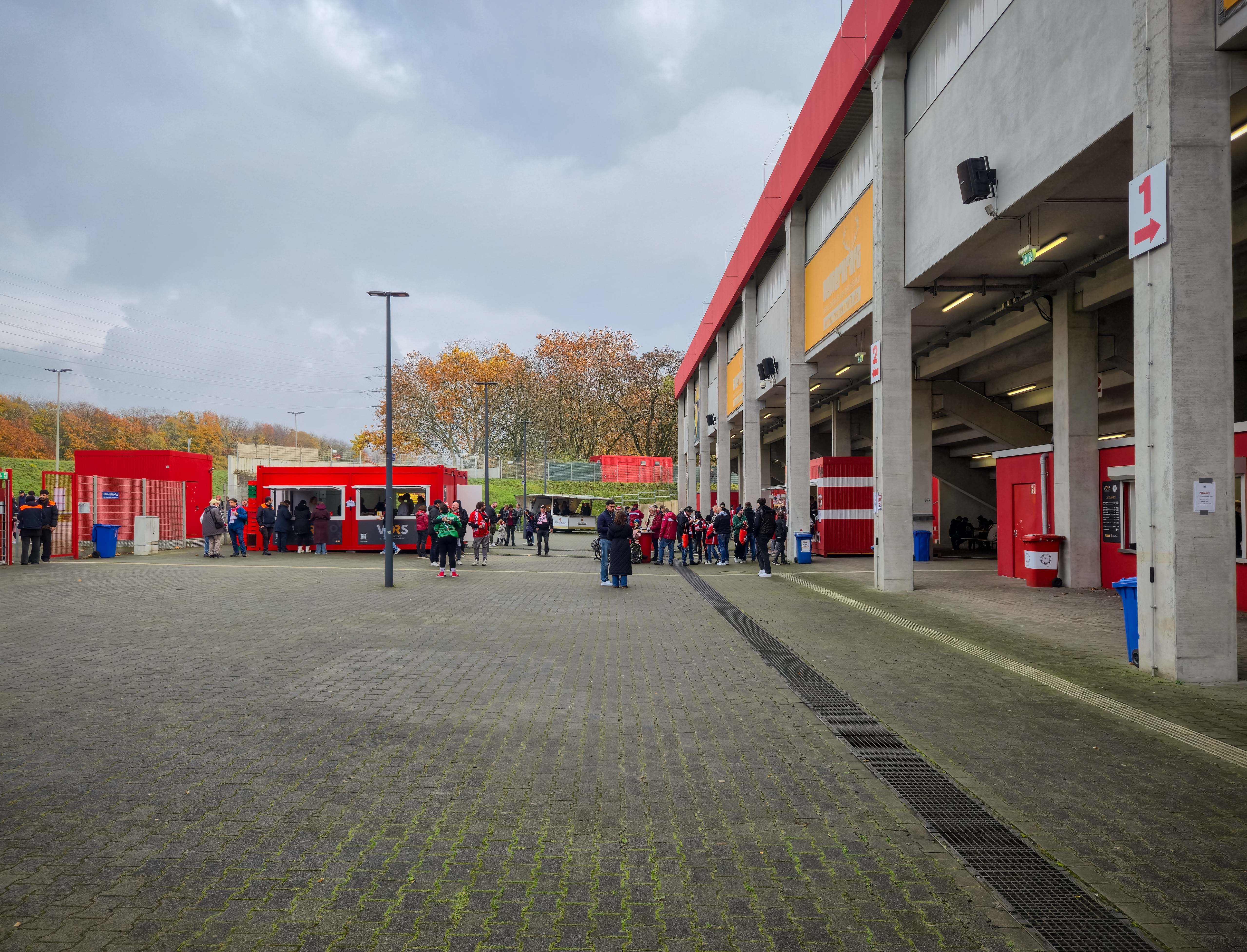 Niederrhein Stadion - Rot-Weiß OberhausenHet industrieterrein rondom het stadion versterkt de melancholie. Loodsen, fabrieken, roestige hekken. Het decor van een club die niet perfect wil zijn. Hier geen glimmende arena’s met sushi in de business lounge. Hier een lichtmast die je al vanaf de snelweg ziet. Een catering die de speelregels niet kent. Een capo die denkt dat hij DJ is.
