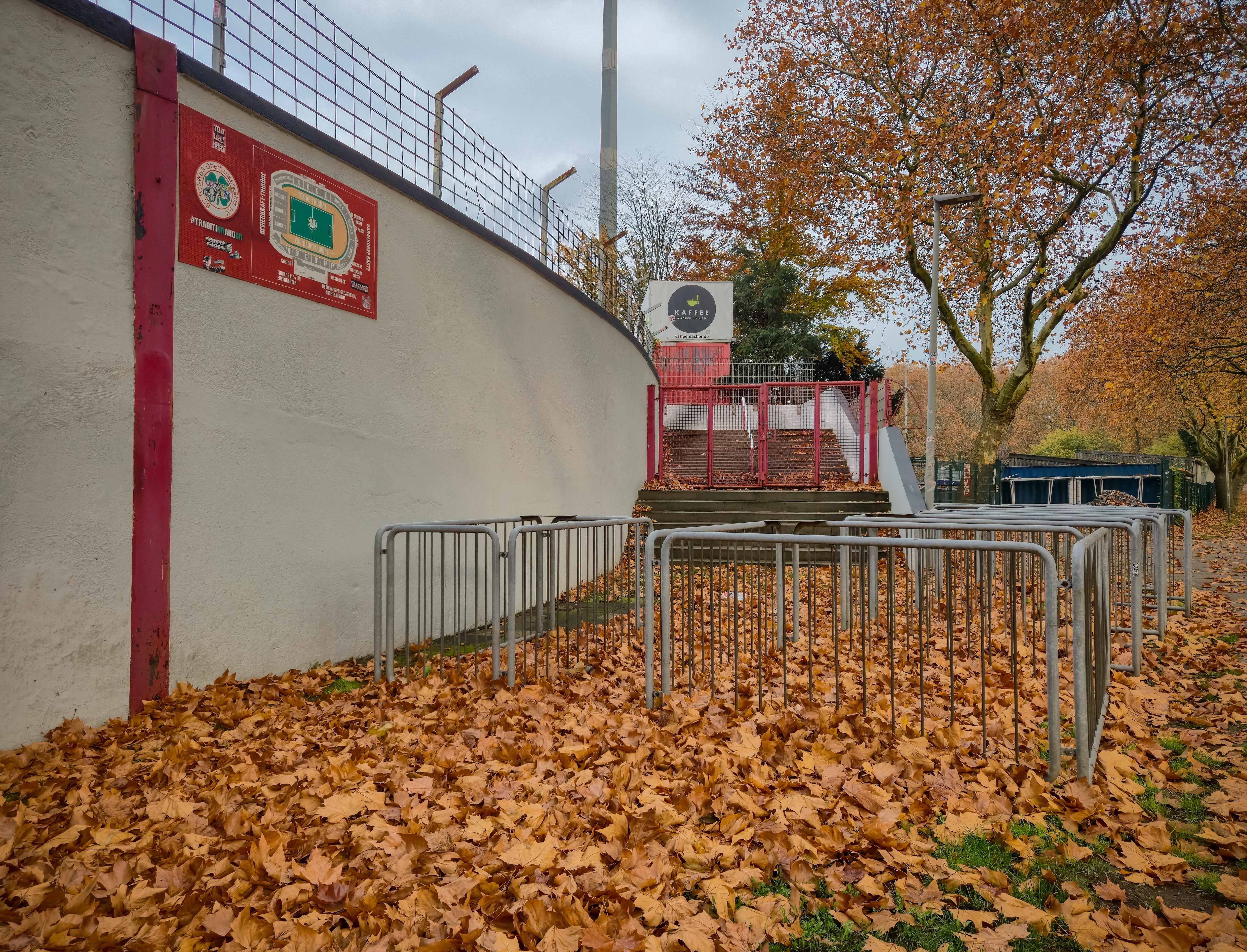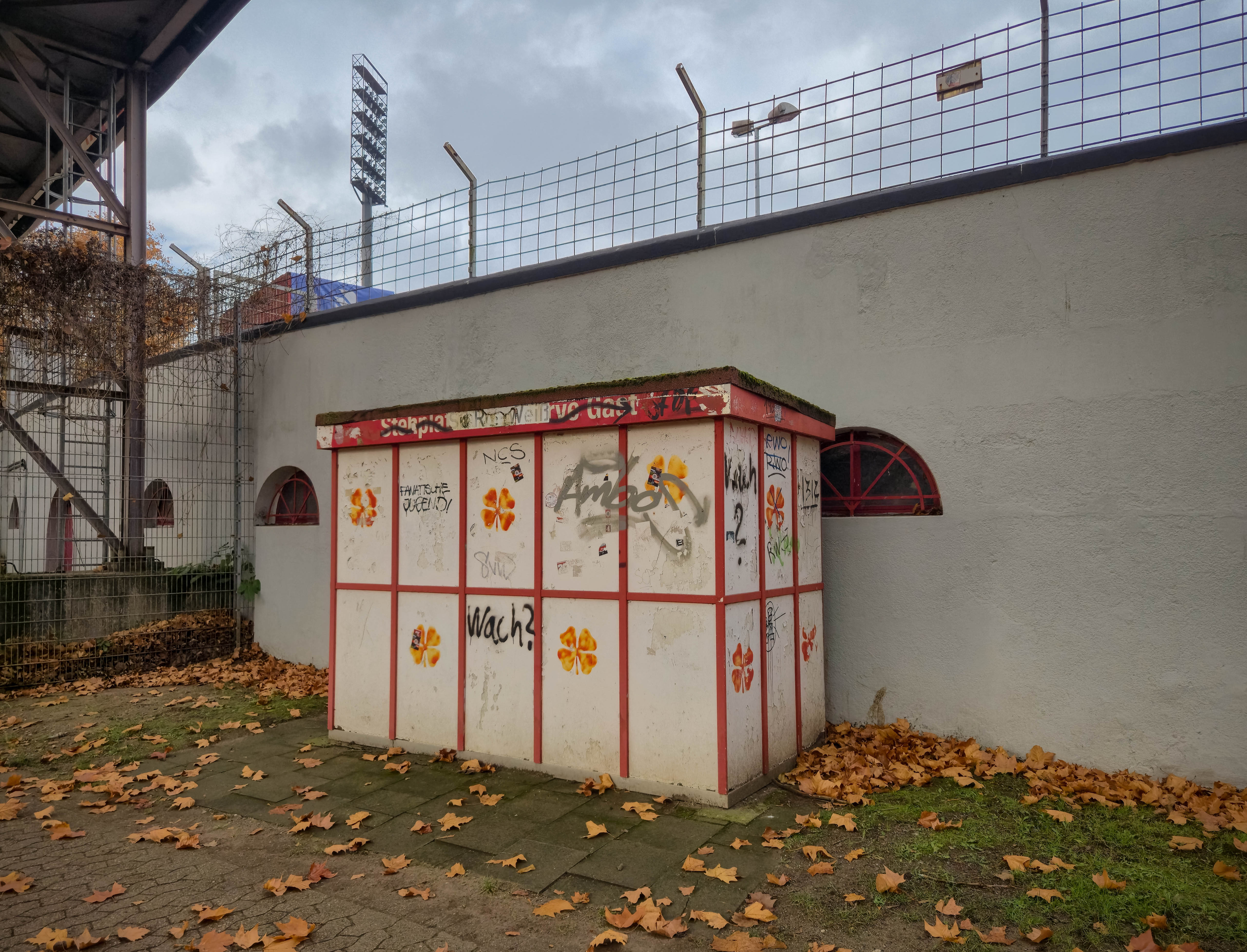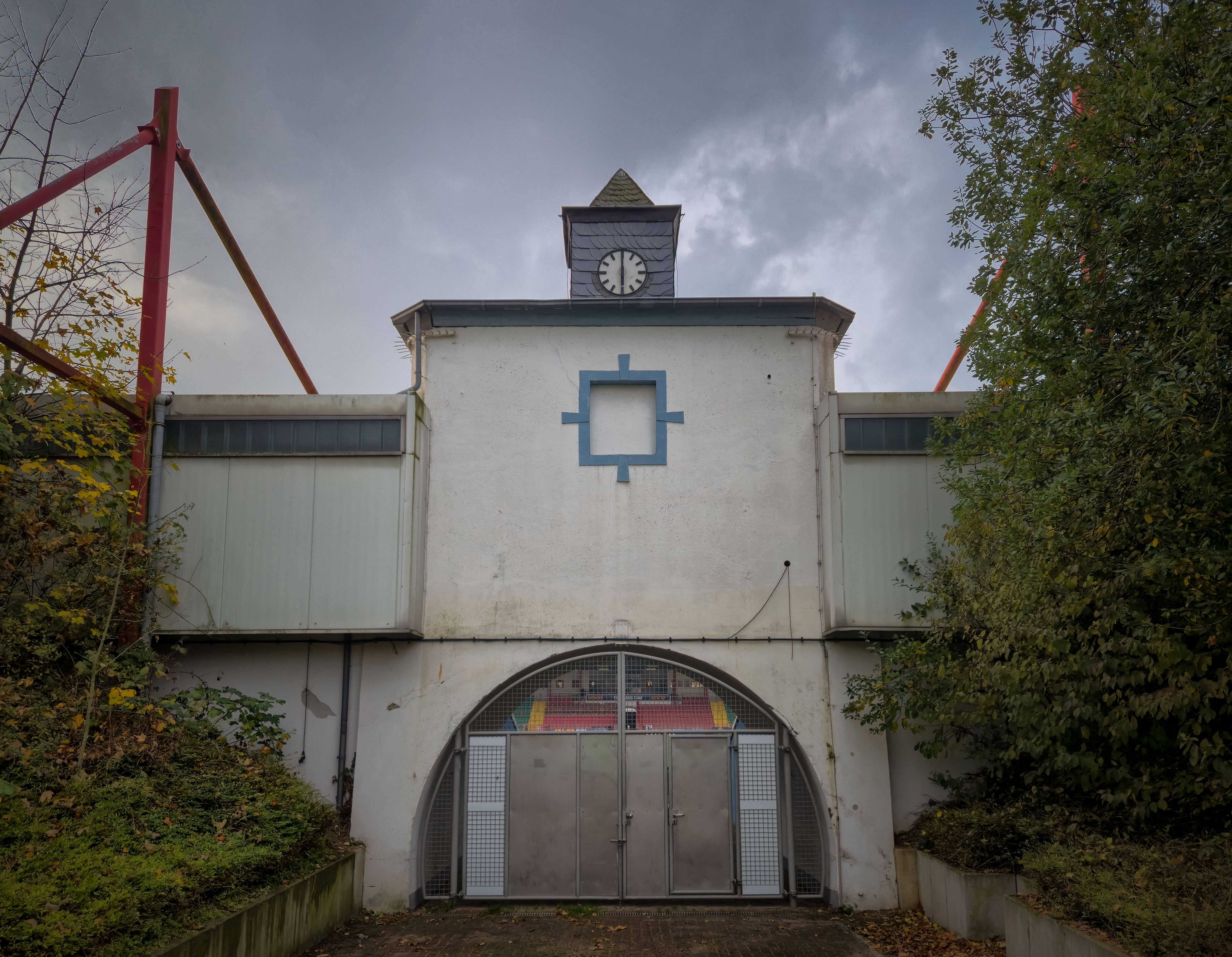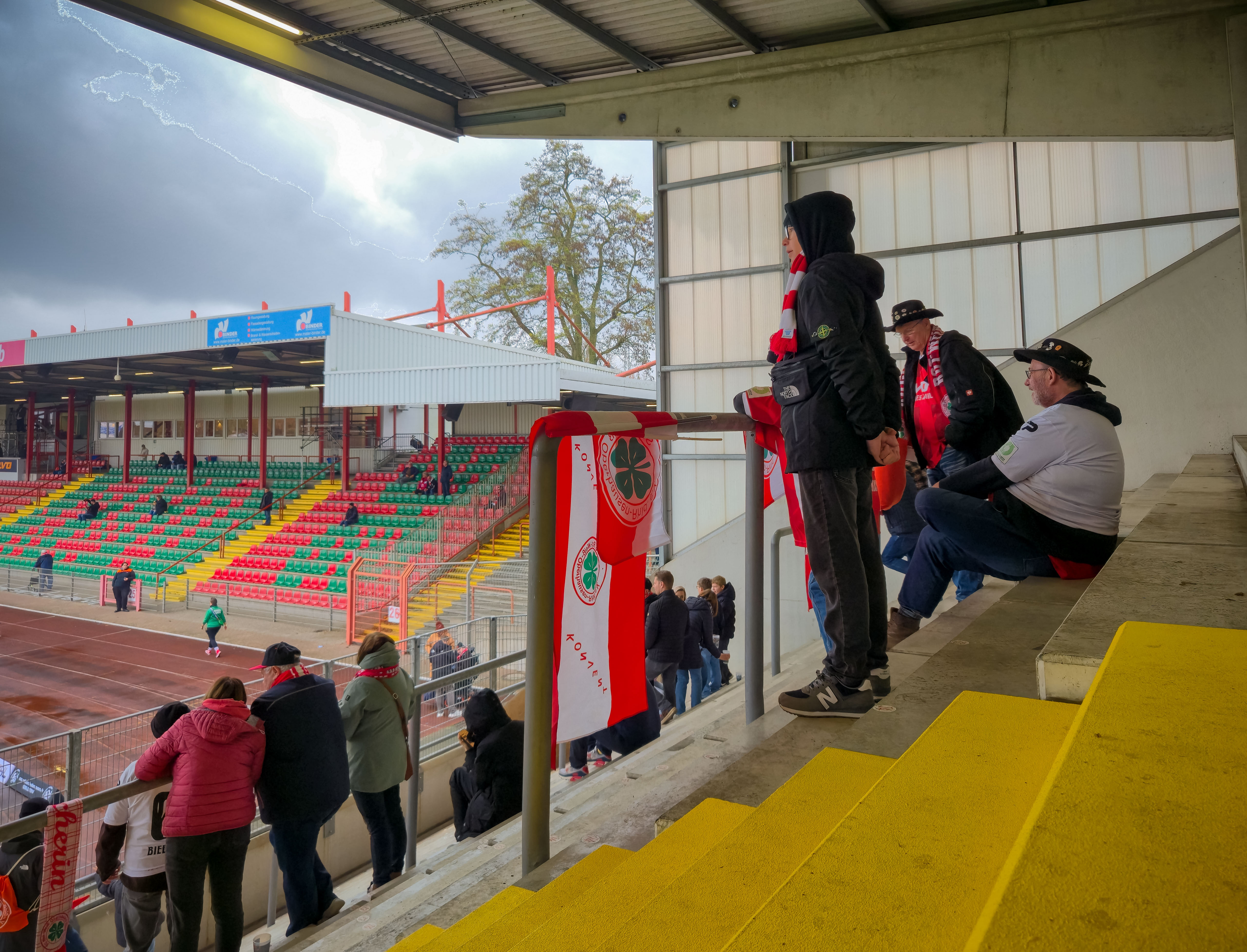 Niederrhein Stadion - Rot-Weiß OberhausenHet industrieterrein rondom het stadion versterkt de melancholie. Loodsen, fabrieken, roestige hekken. Het decor van een club die niet perfect wil zijn. Hier geen glimmende arena’s met sushi in de business lounge. Hier een lichtmast die je al vanaf de snelweg ziet. Een catering die de speelregels niet kent. Een capo die denkt dat hij DJ is.