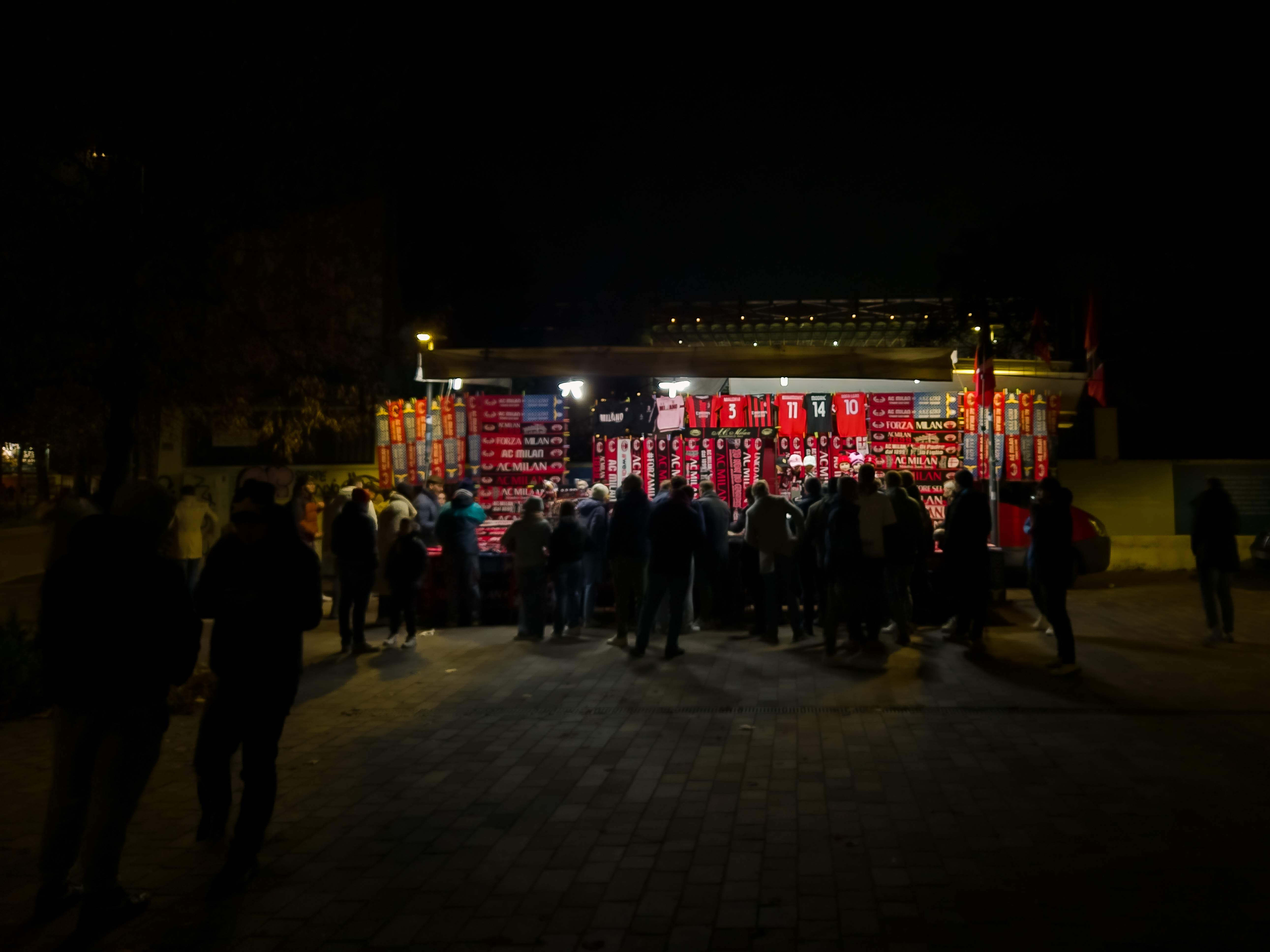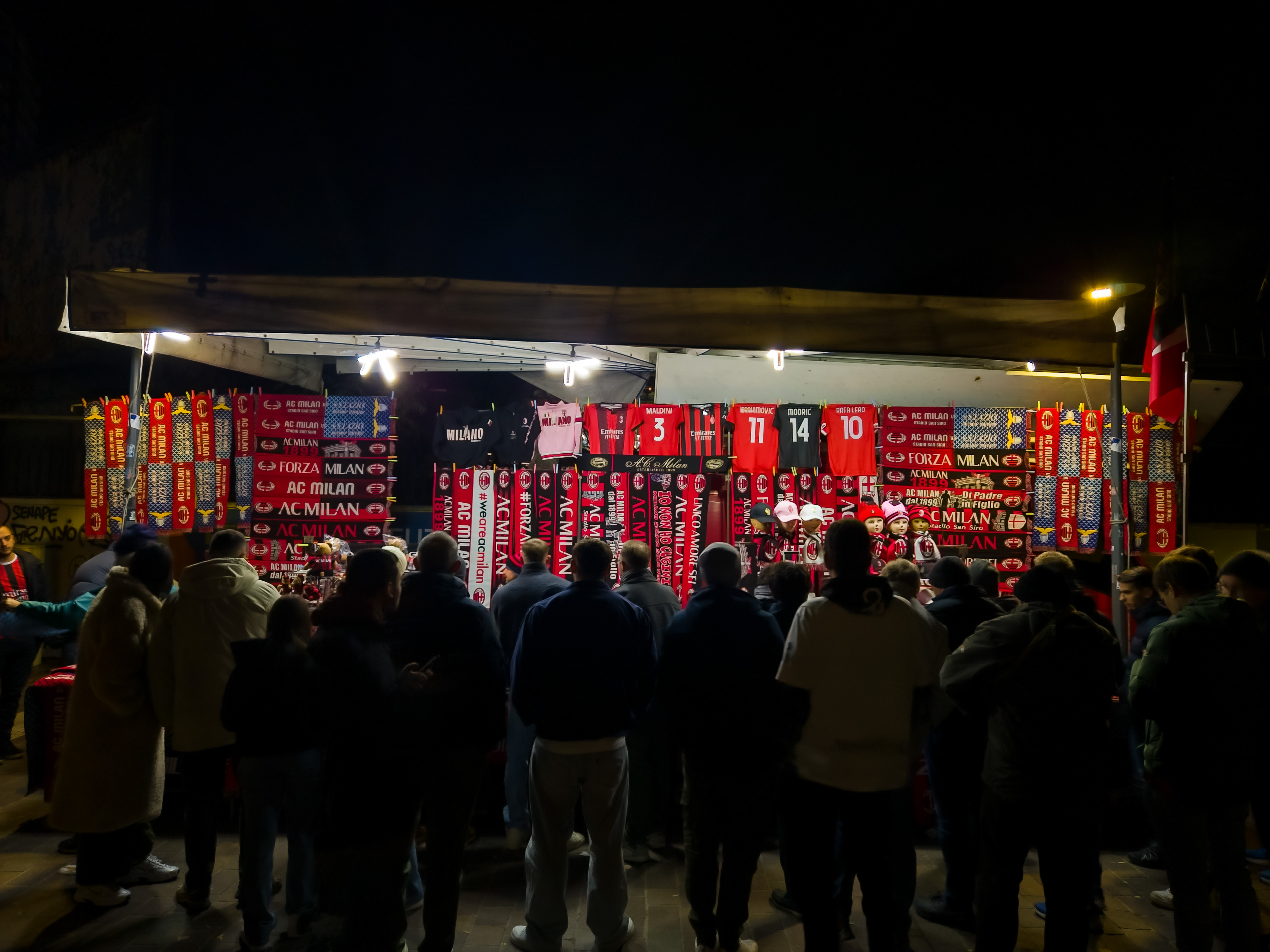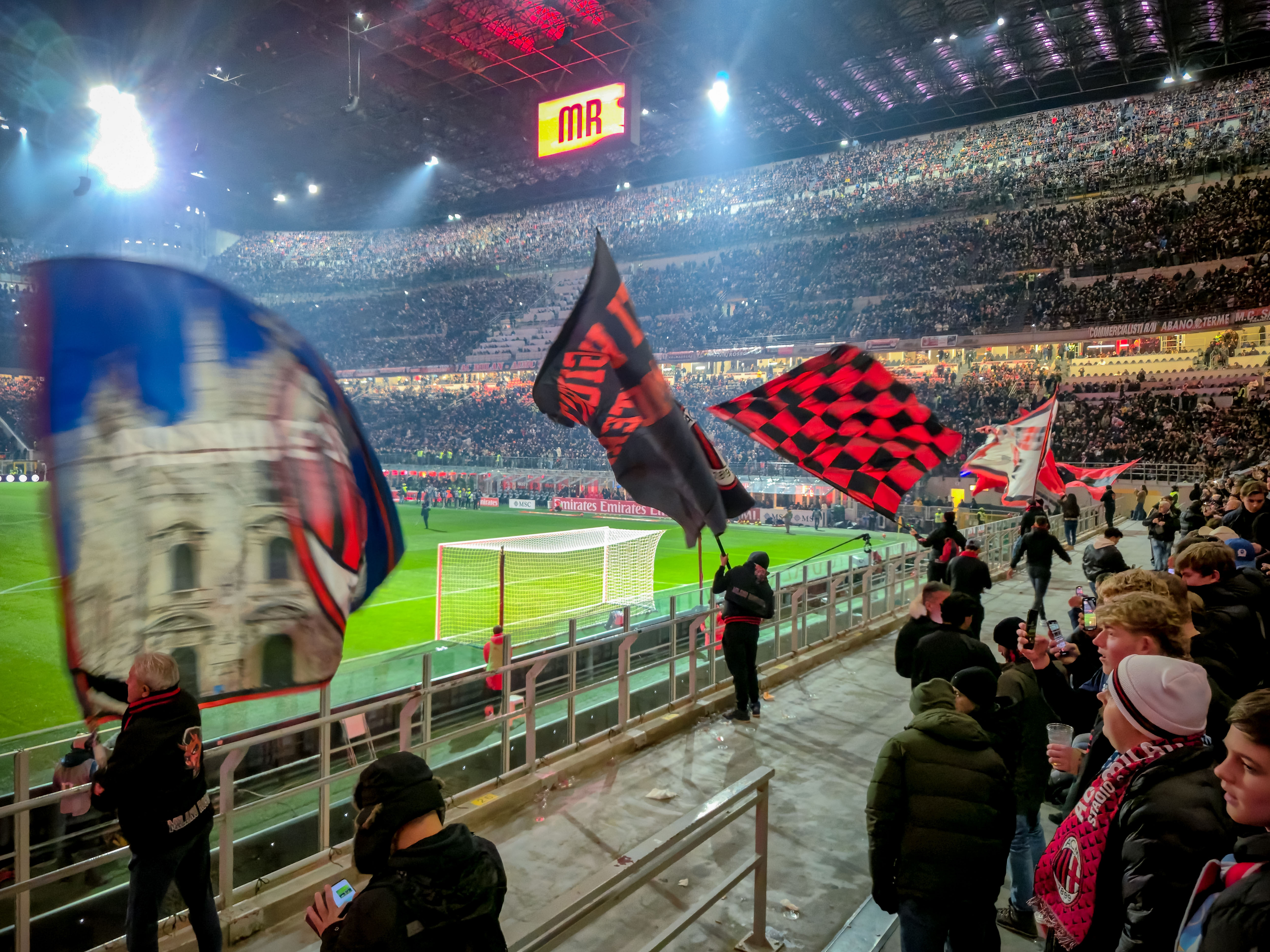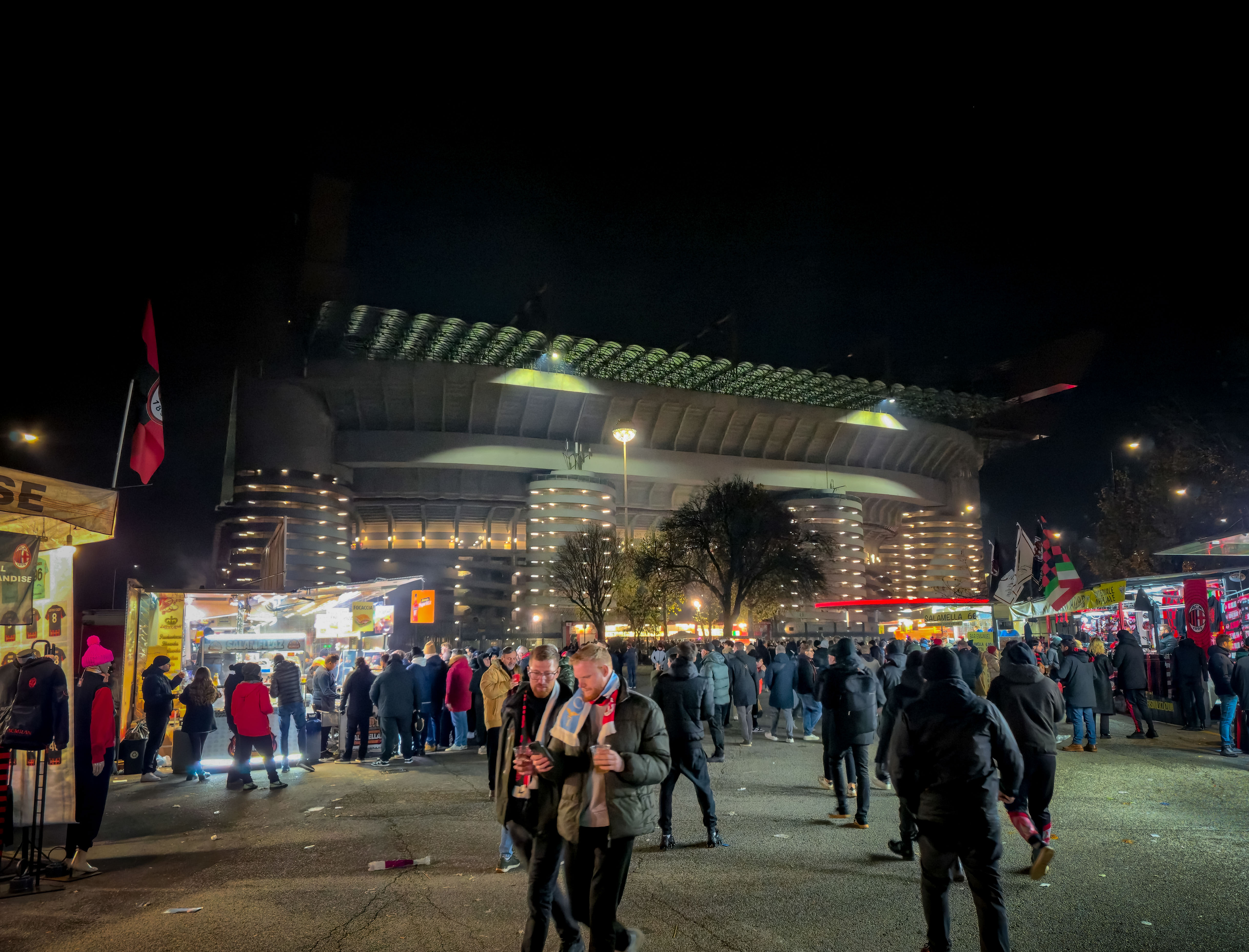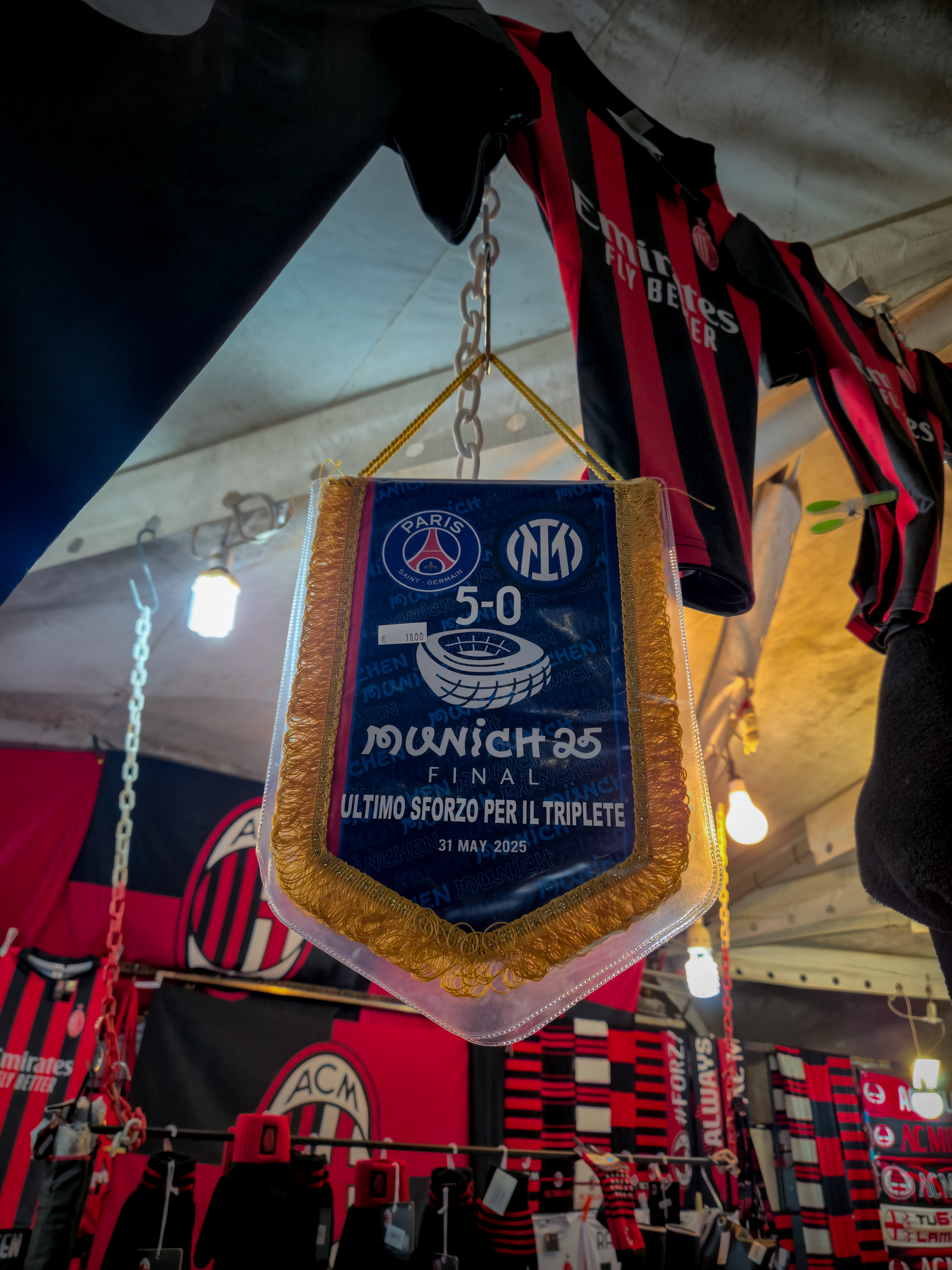 De aanloop begon al ver van het stadion. Op een plein, nog ruim buiten de schaduw van de torens, stond een merchandisekraampje waar het al druk was. Sjaals, shirts, vlaggen, alles rood-zwart. En tussen de Ibrahimović- en Maldini-shirts hing een vaantje van de Champions League-finale van 2025. PSG had Inter met liefst 5-0 verslagen. ‘ULTIMO SFORZO PER IL TRIPLETE’, stond erop. Laatste poging voor de treble. Voor vijftien euro kon je het kopen. Pure supportershumor. Milanisti lachten, Interisti keken weg. En ik? Ik kocht het niet, maar ik snapte het wel.