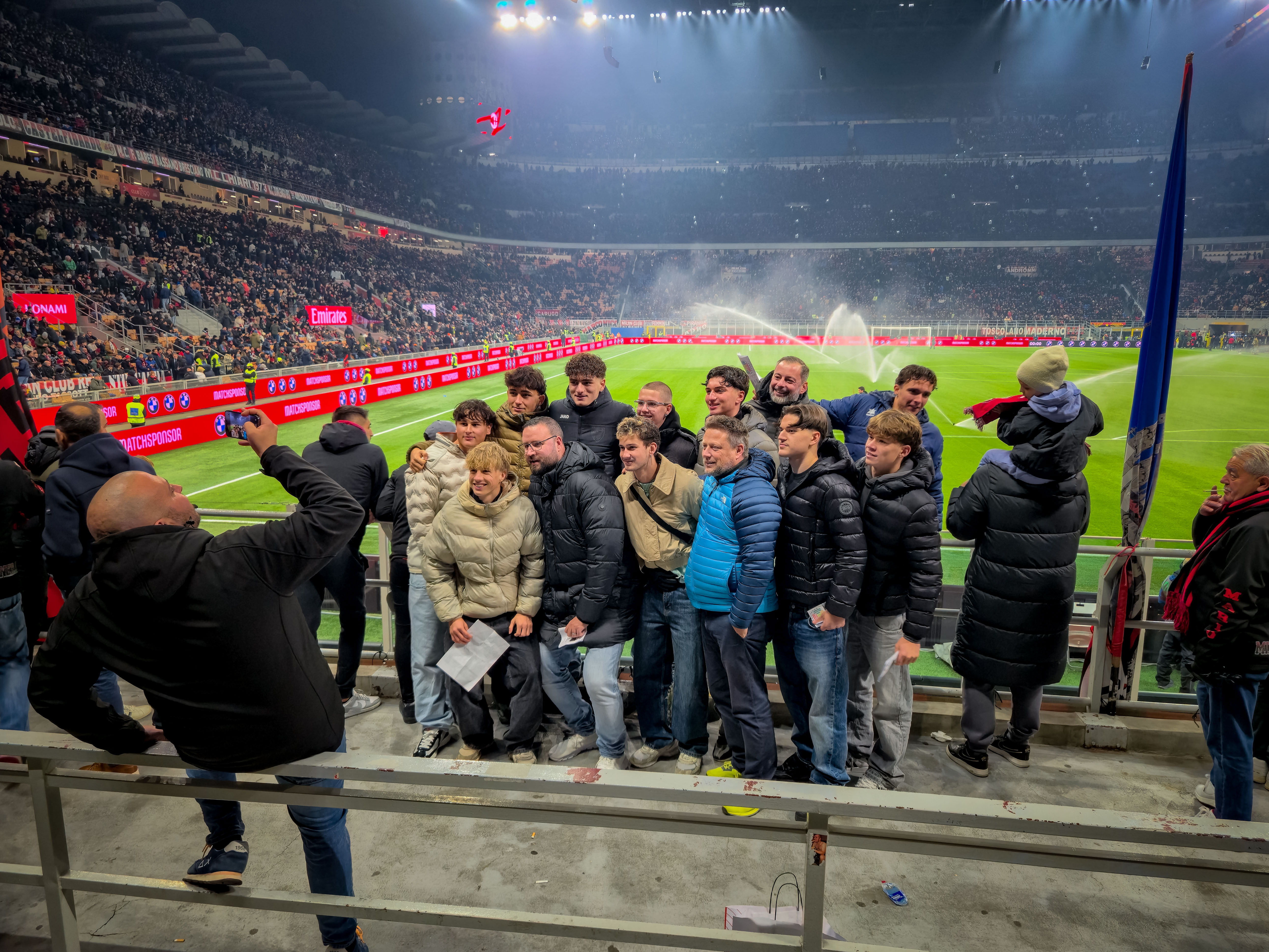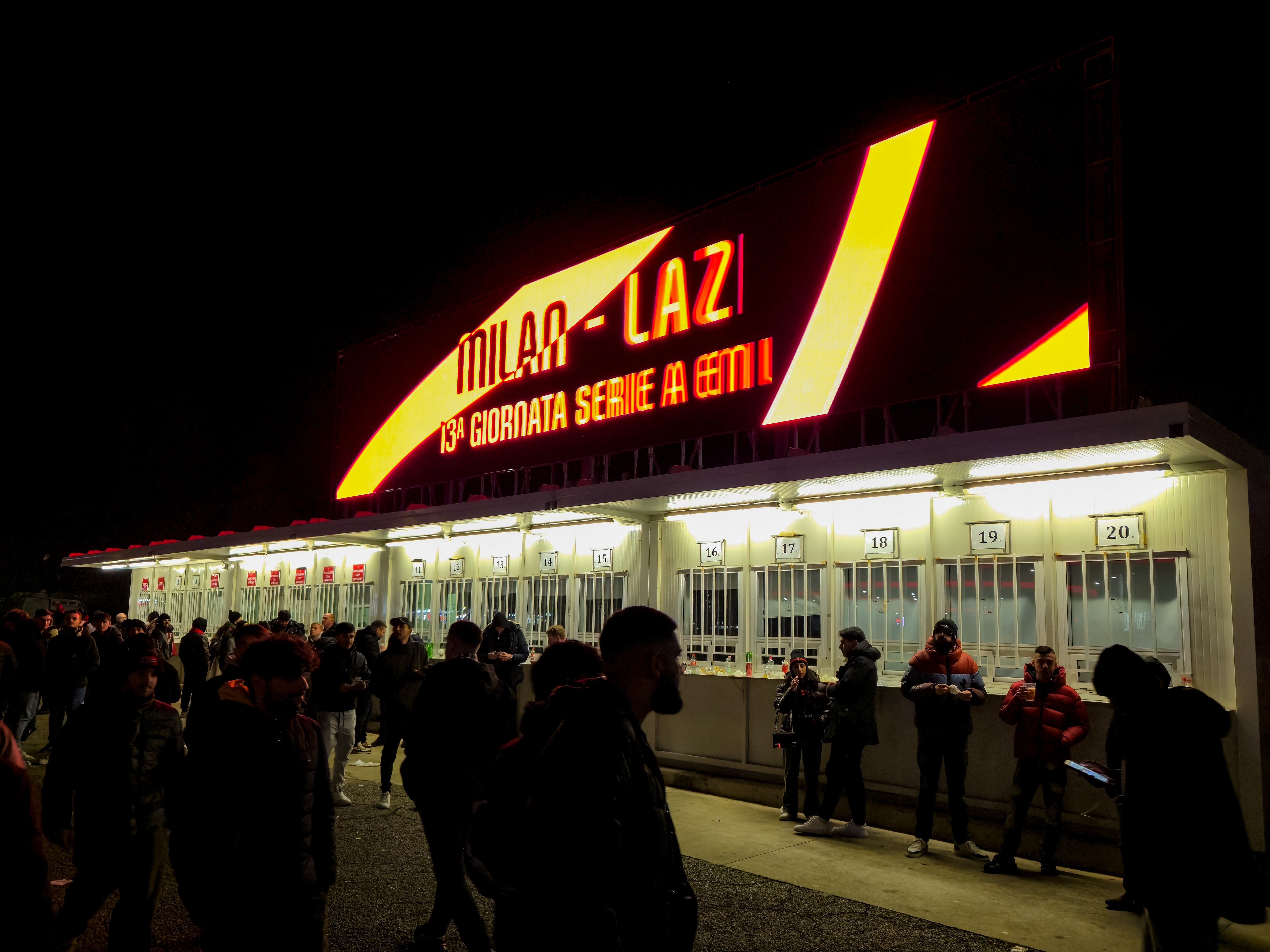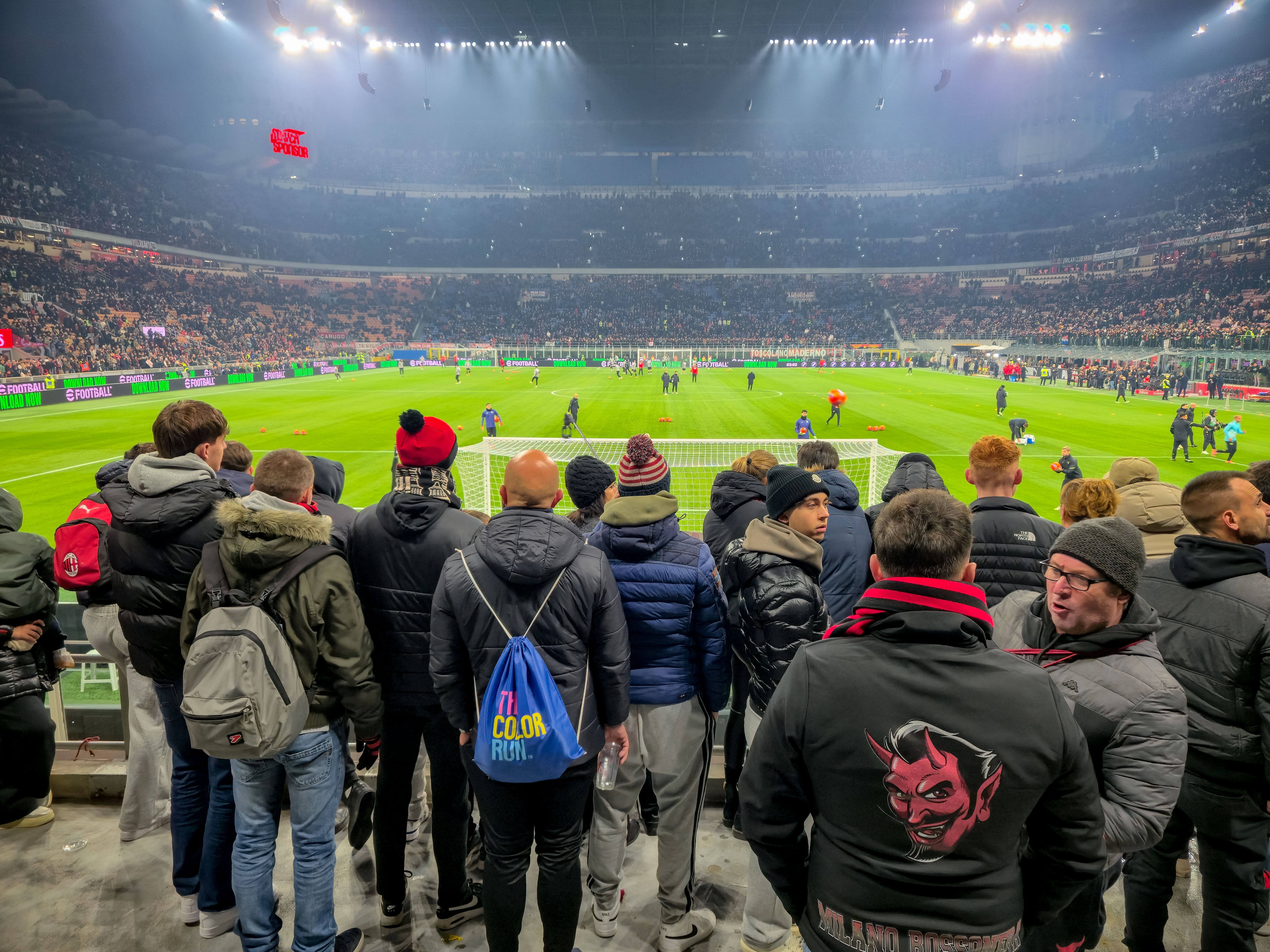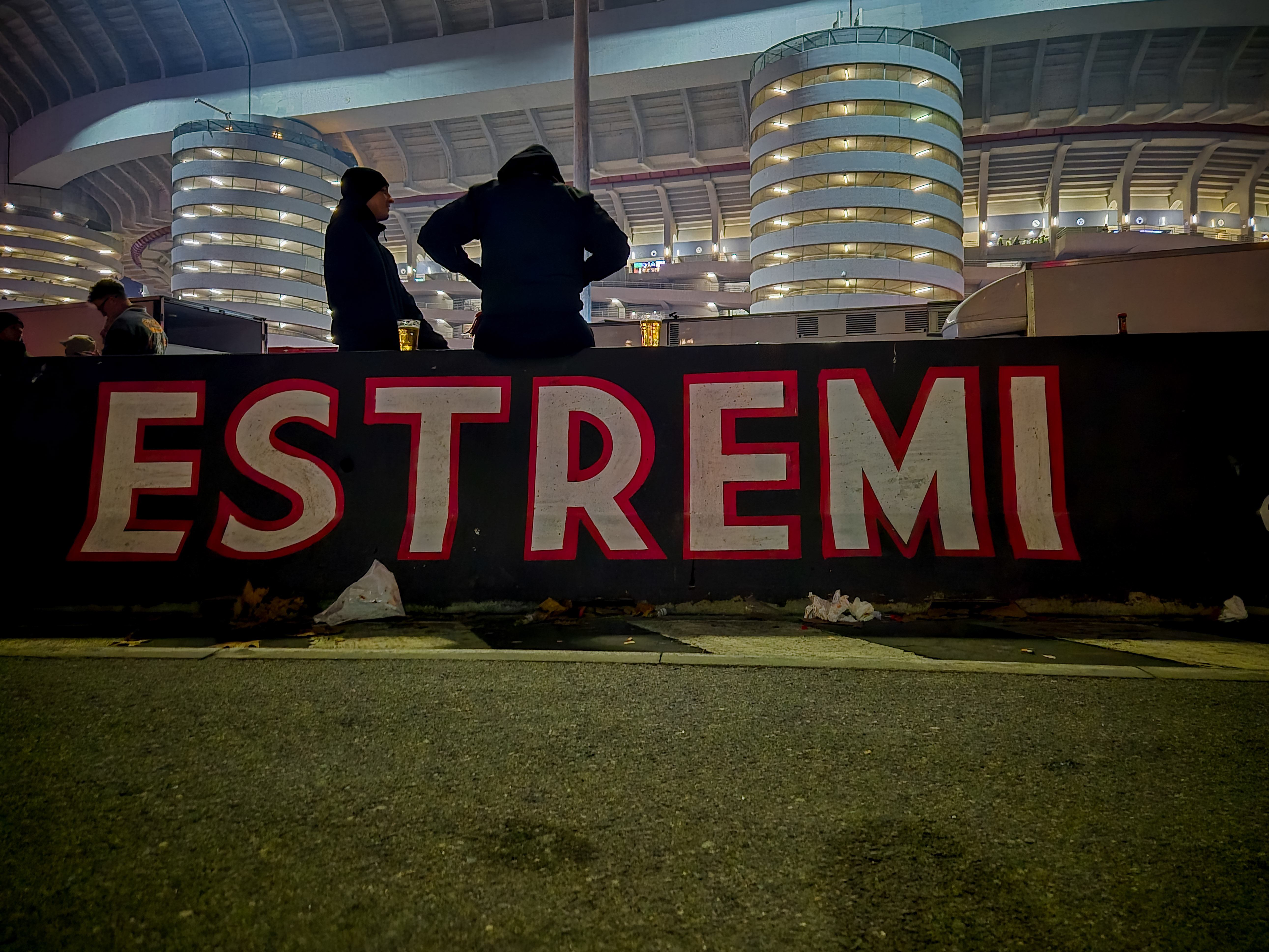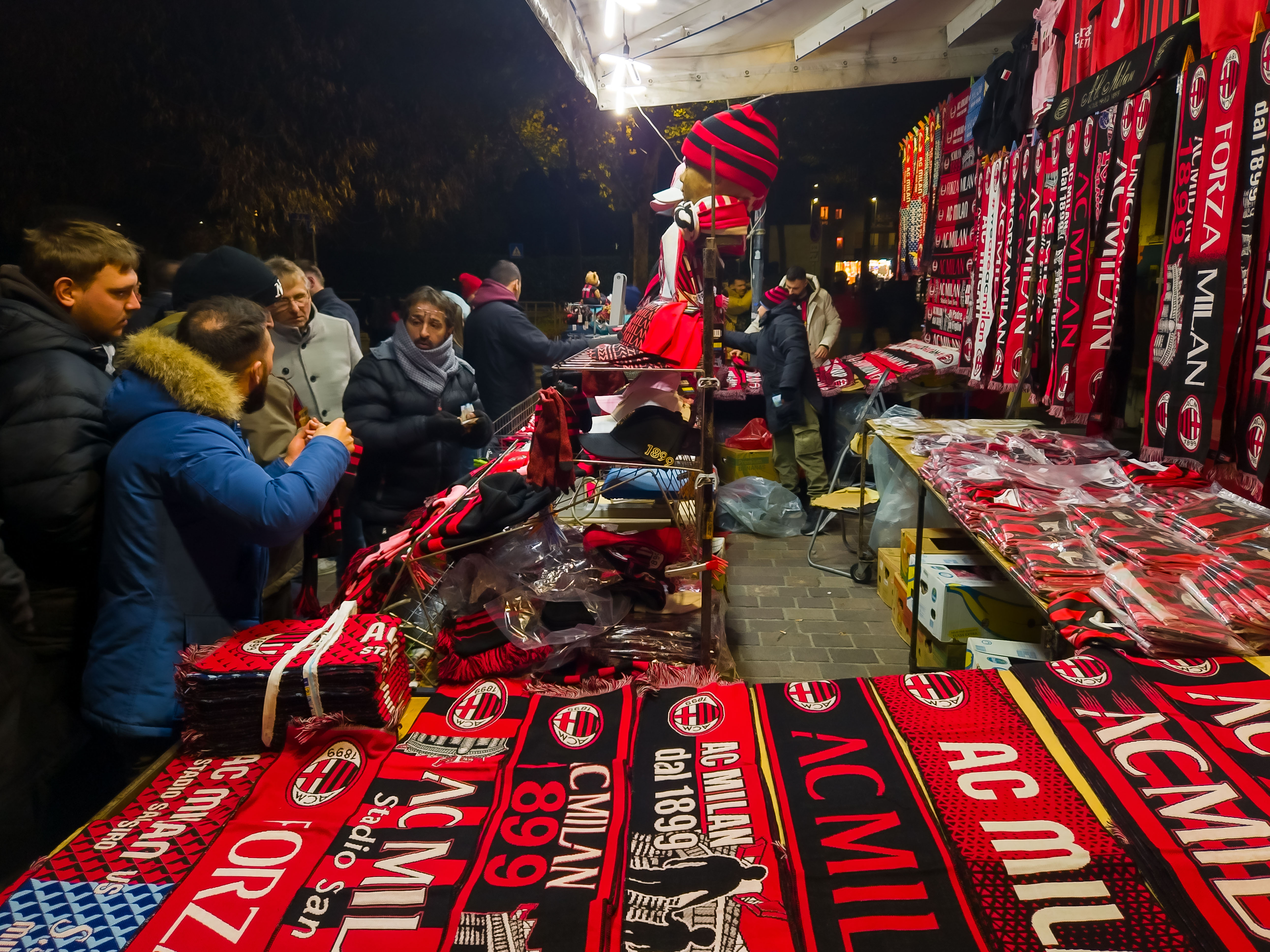 De aanloop begon al ver van het stadion. Op een plein, nog ruim buiten de schaduw van de torens, stond een merchandisekraampje waar het al druk was. Sjaals, shirts, vlaggen, alles rood-zwart. En tussen de Ibrahimović- en Maldini-shirts hing een vaantje van de Champions League-finale van 2025. PSG had Inter met liefst 5-0 verslagen. ‘ULTIMO SFORZO PER IL TRIPLETE’, stond erop. Laatste poging voor de treble. Voor vijftien euro kon je het kopen. Pure supportershumor. Milanisti lachten, Interisti keken weg. En ik? Ik kocht het niet, maar ik snapte het wel.
