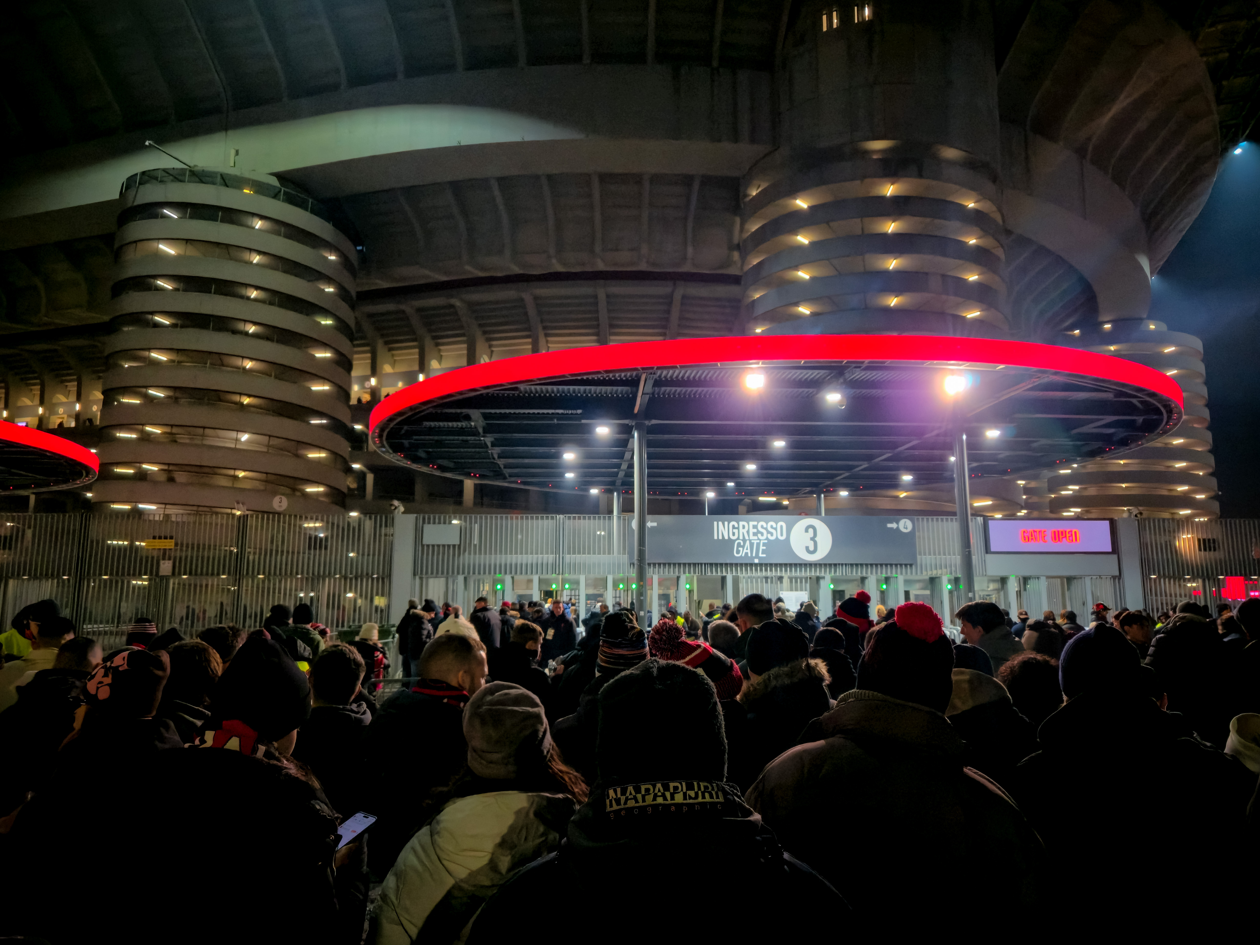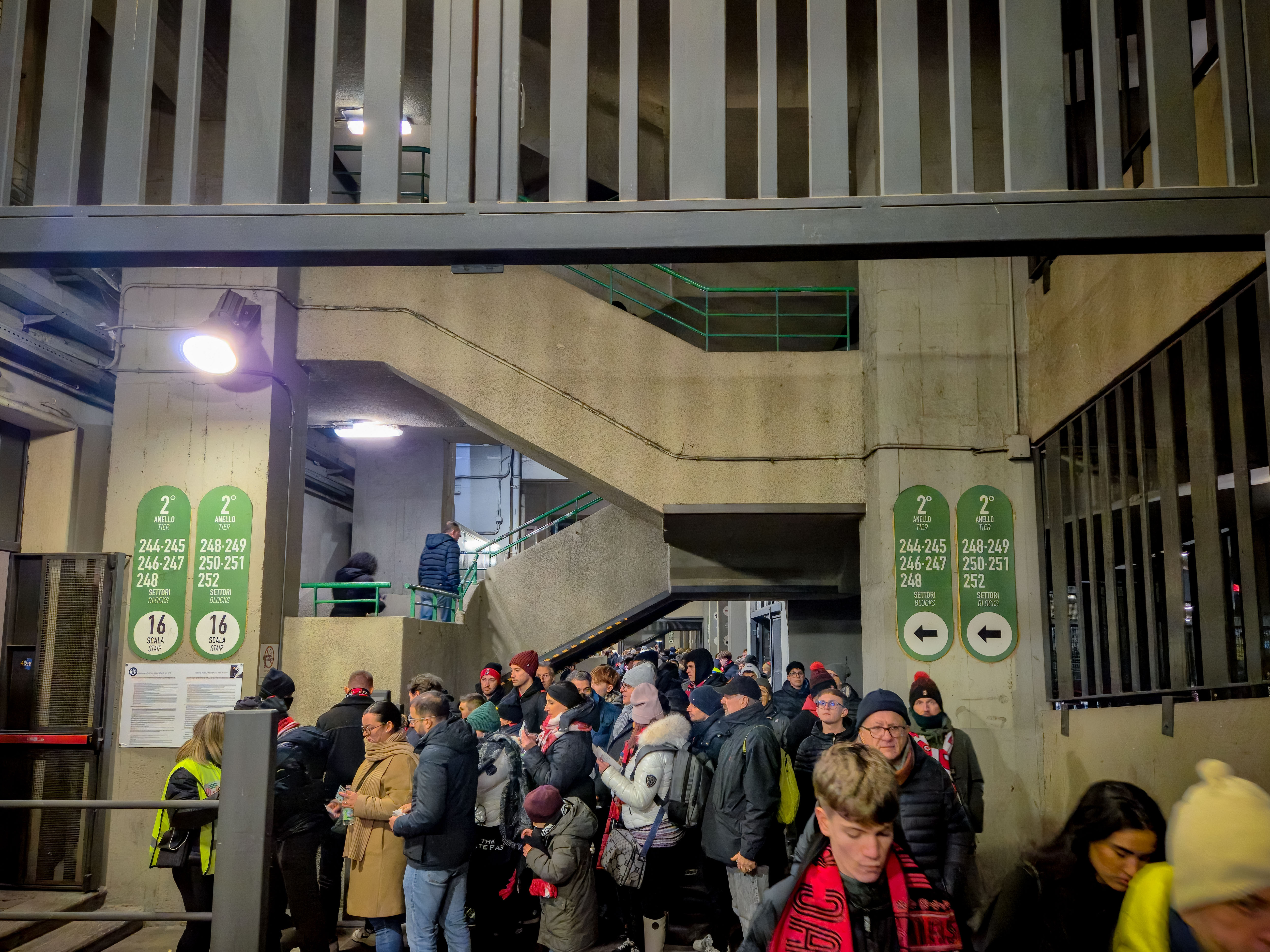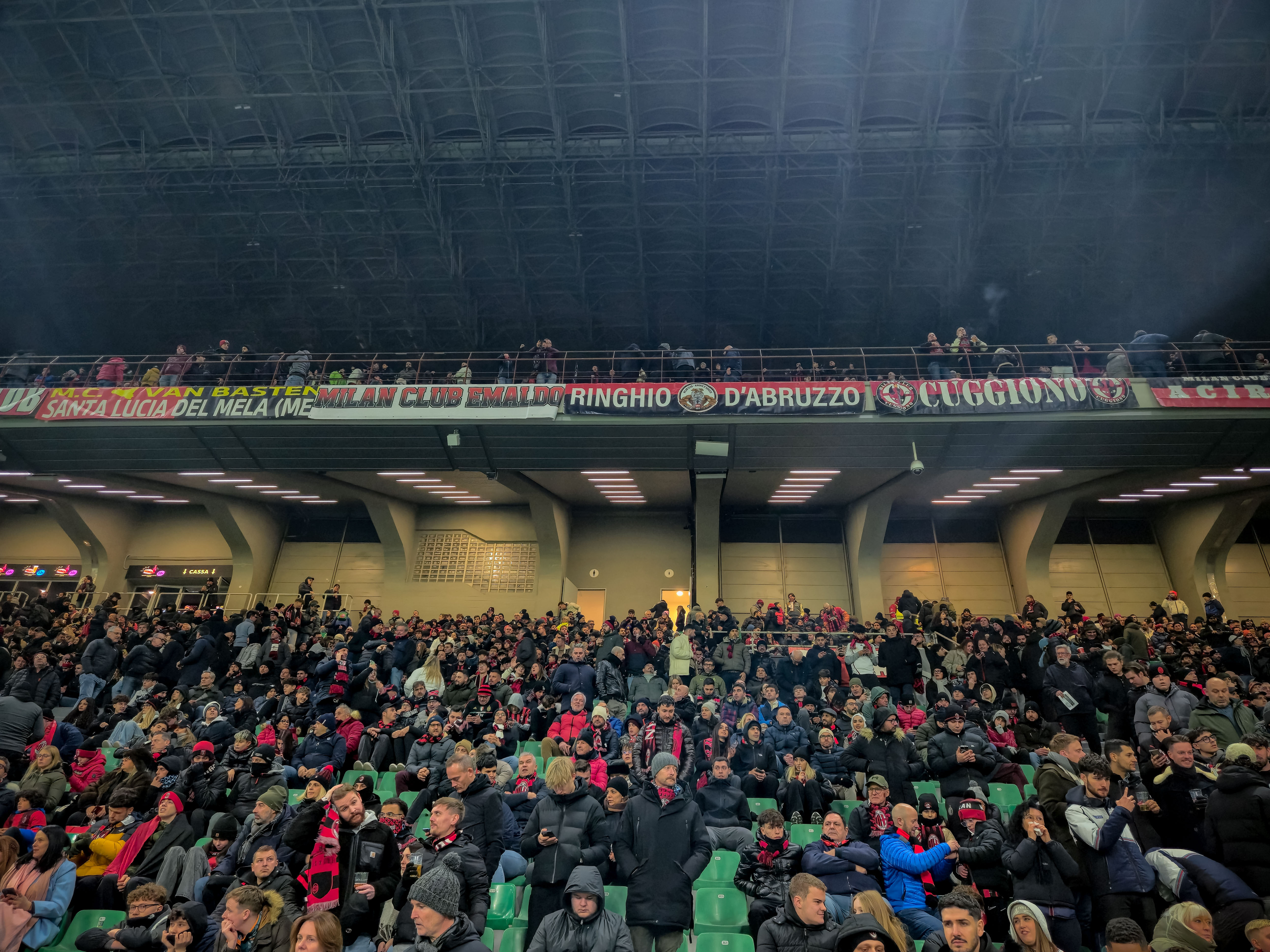 En dan sta je daar, eindelijk. In die torens die trillen als een betonnen orgel wanneer duizenden voeten tegelijk bewegen. Je voelt het halverwege de spiraaltrap. Een lichte vibratie, alsof het stadion zelf ademhaalt. Je ziet stoeltjes die scheef staan, alsof dadaïsme ook een tribune verdient. Het zijn geen grapjes van de architect, eerder een knipoog van het beton zelf. Je gaat zitten, voelt dat wiebeltje, en ineens lijkt elk doelpunt tien procent dramatischer. Alsof het stadion zelf meedoet in de emotie. Een decor dat niet neutraal wil zijn, maar zachtjes meespeelt. Je hoort de Curva Sud die tien seconden achterloopt met juichen, alsof er eerst een geheim bevel moet worden doorgegeven. Je voelt de koude tocht op driekwart hoogte, een Alpenwind die je eraan herinnert dat Italië niet altijd zon is.