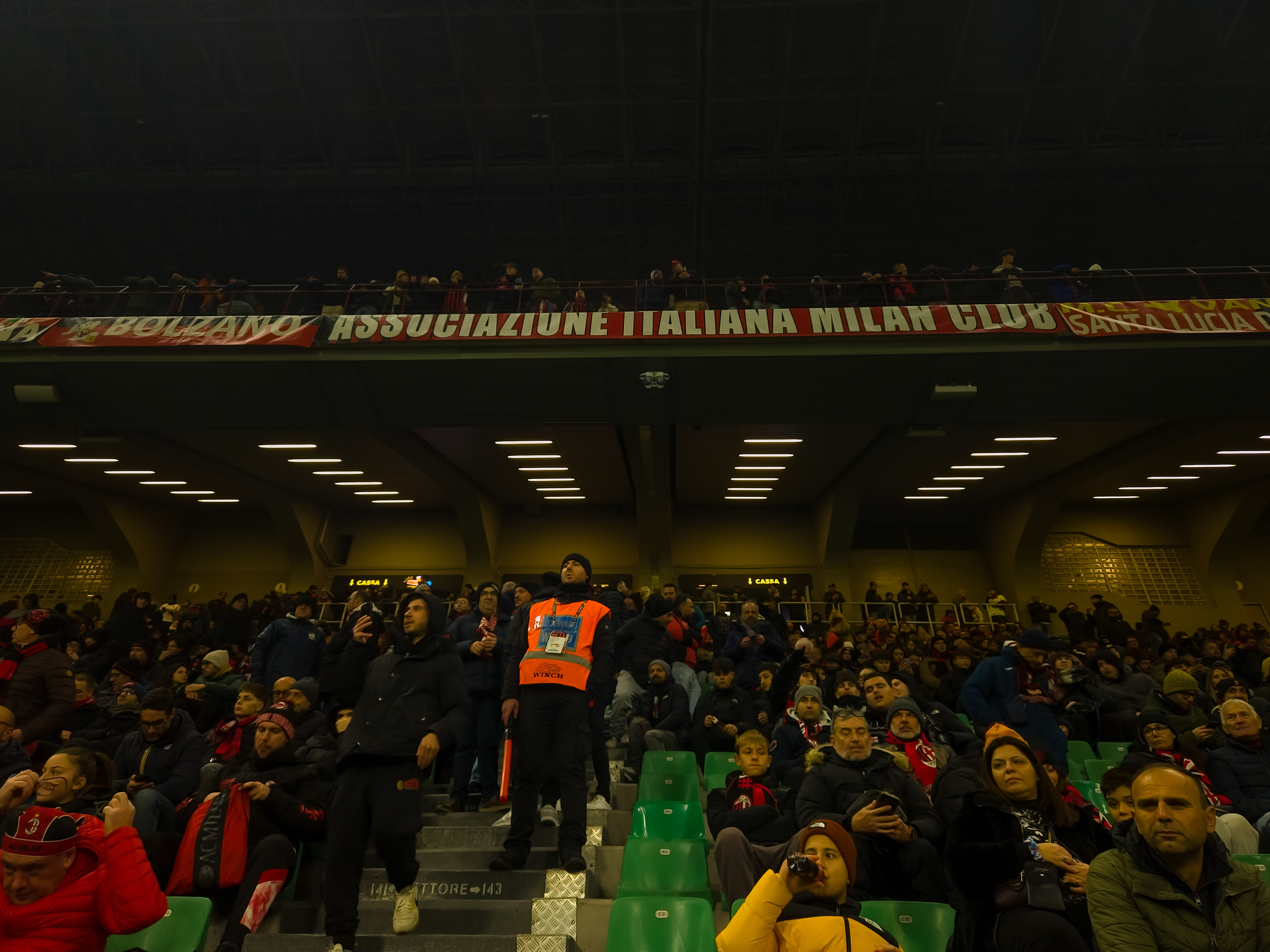 En ergens in dat geheel staat een steward in een fluorescerend hesje. Officieel aangesteld om orde te bewaren, maar San Siro is geen plek voor orde. Dus grijpt hij zijn kans. Hij roept niet alleen ‘sedetevi’ of ‘calma’, hij voorziet het hele vak van improvisatie. Hij wijst naar een laatkomer en zegt dat die beter bij Inter had kunnen gaan zitten. Hij geeft een denkbeeldige schoonmoeder de schuld van een gemiste kans. Hij imiteert de scheidsrechter met een gebaar dat meer weg heeft van commedia dell’arte dan van arbitrage. Het publiek lacht, soms lacht het hem uit, maar hij blijft doorgaan. Hij is de geheime stand-up van de avond. Een cabaretier in hesje die de tribune een extra laag geeft.