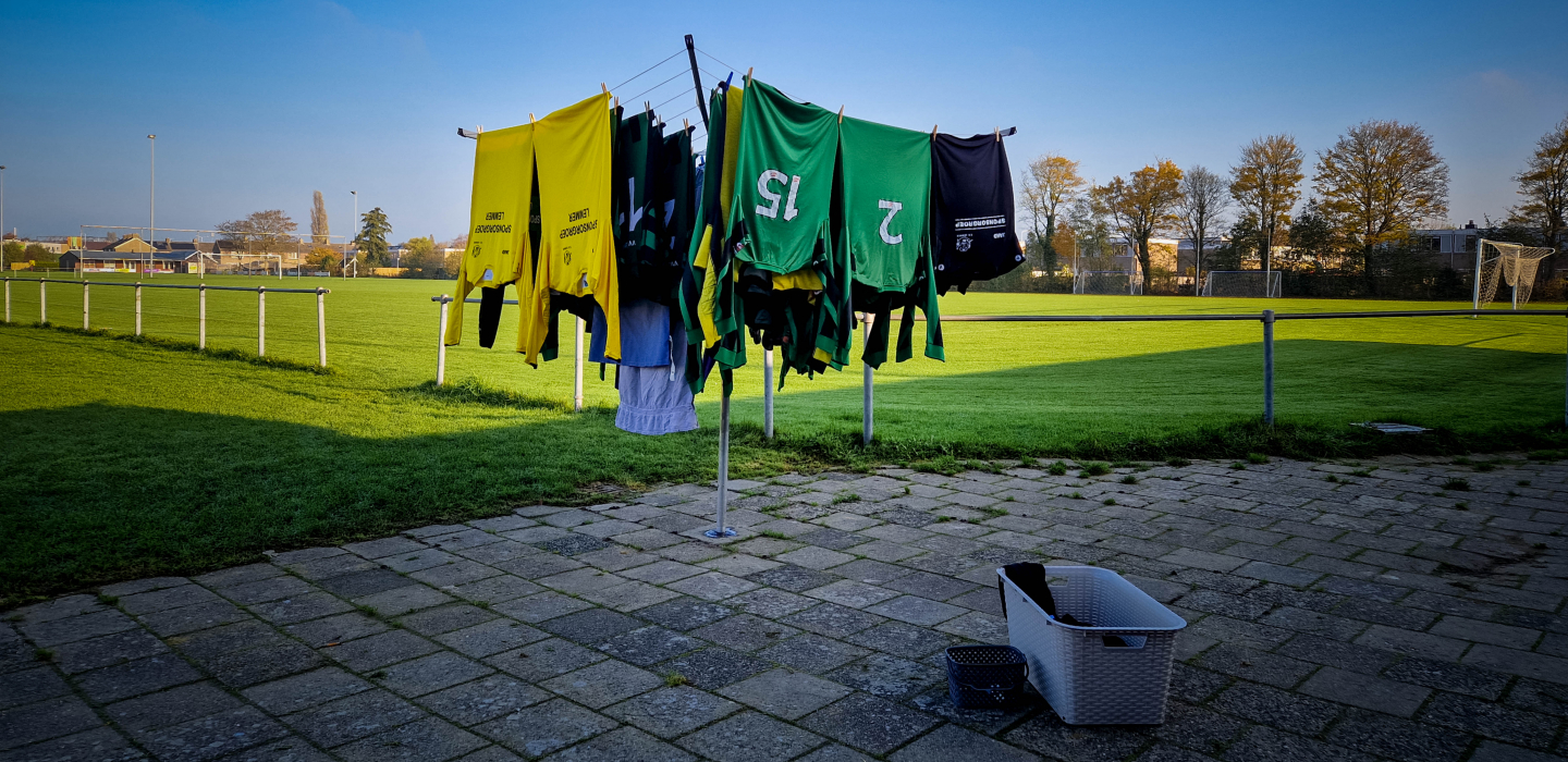 Dat ene detail zegt alles: voetbal is niet alleen doelpunten, glorie en promoties. Het is ook sokken die verdwijnen, modder die blijft kleven en vrijwilligers die maandagochtend vroeg de was doen.