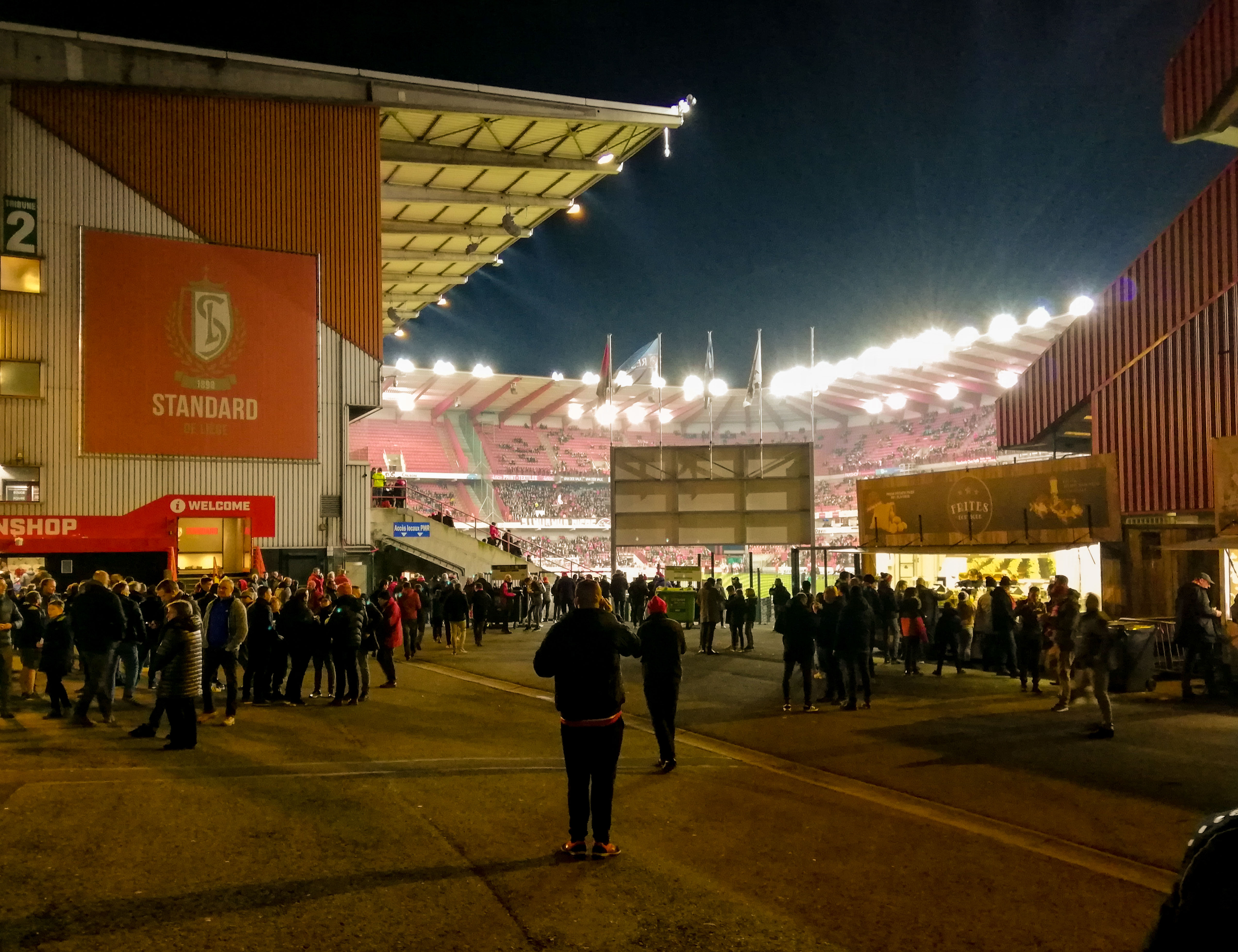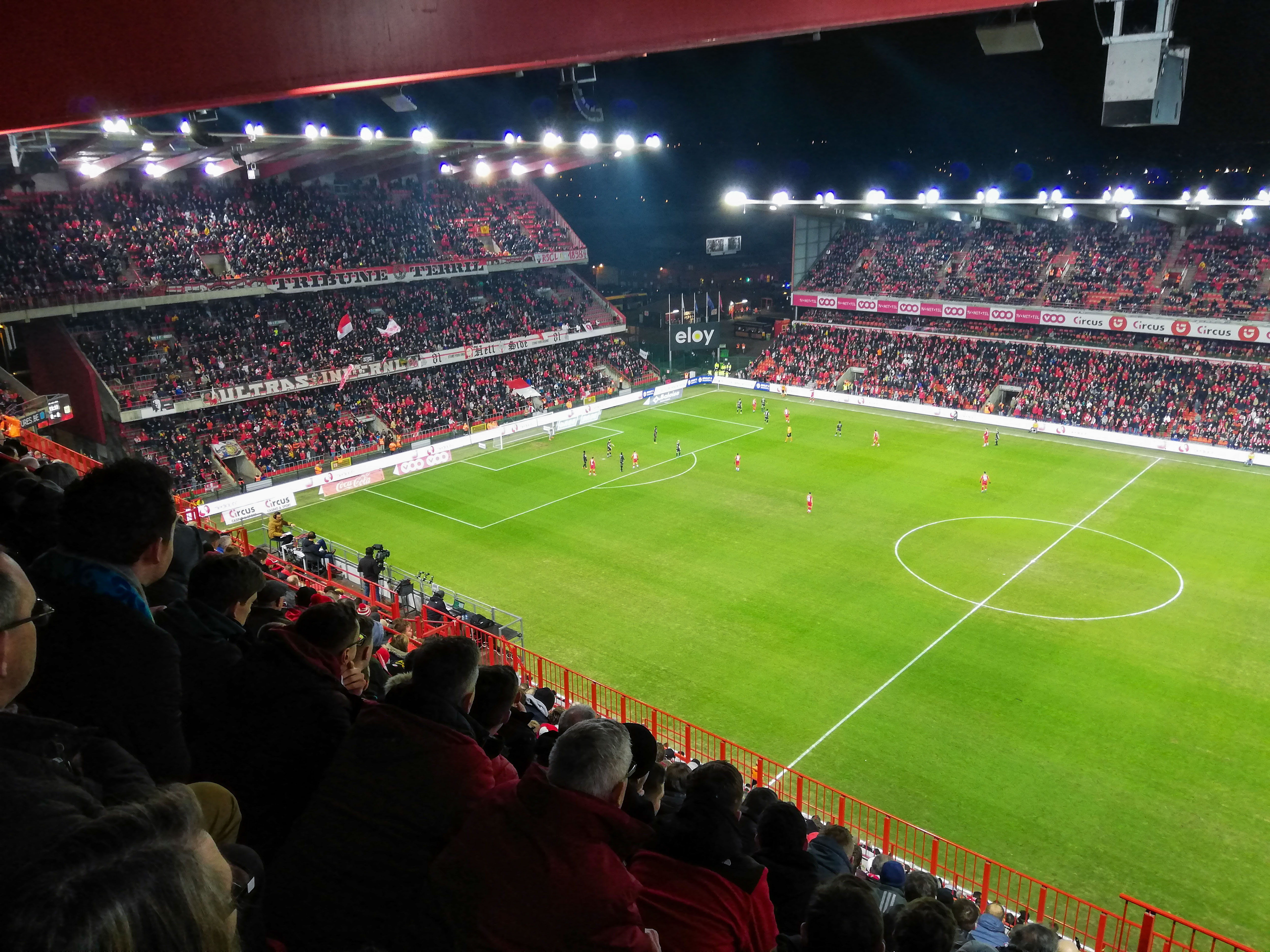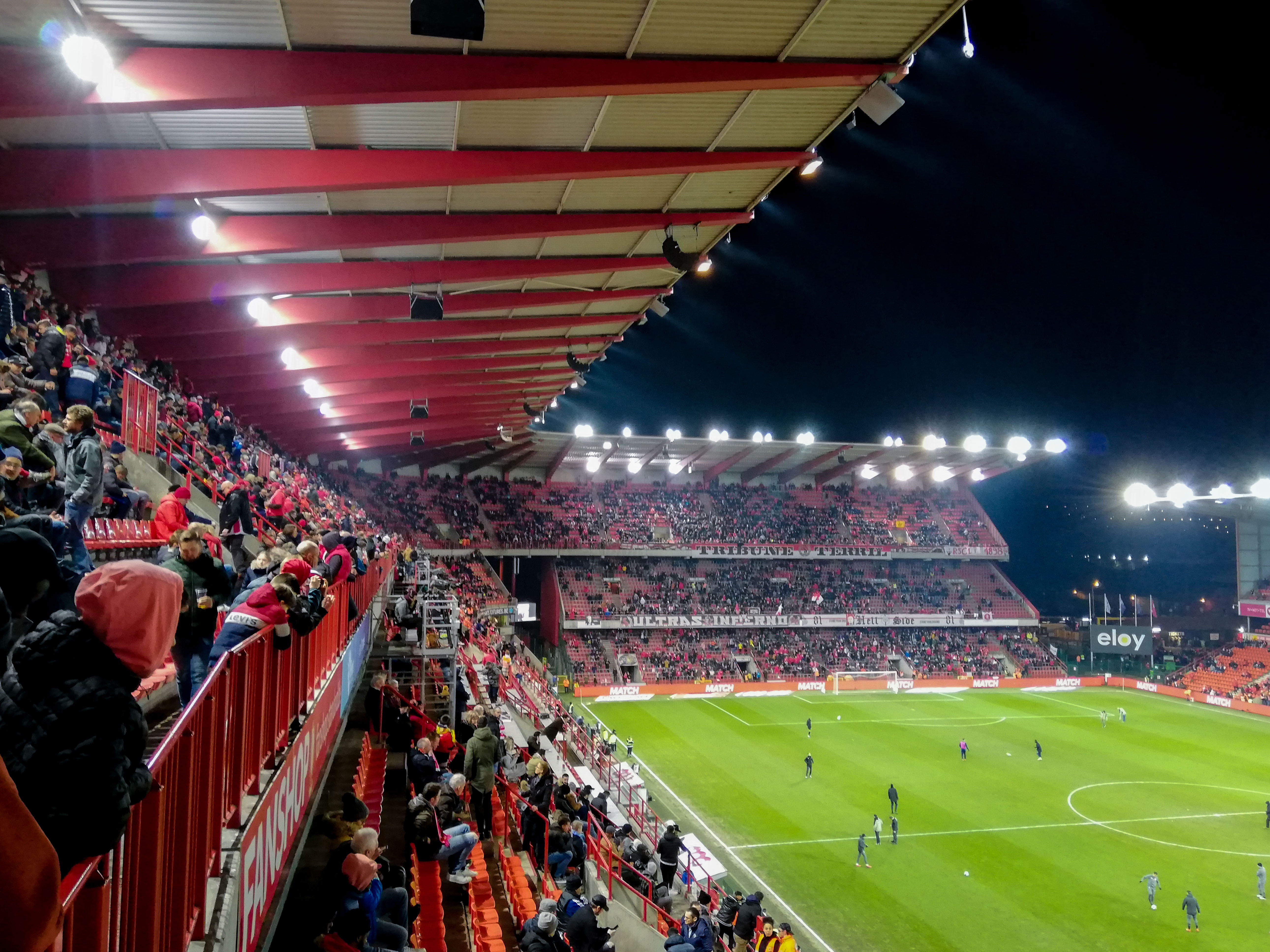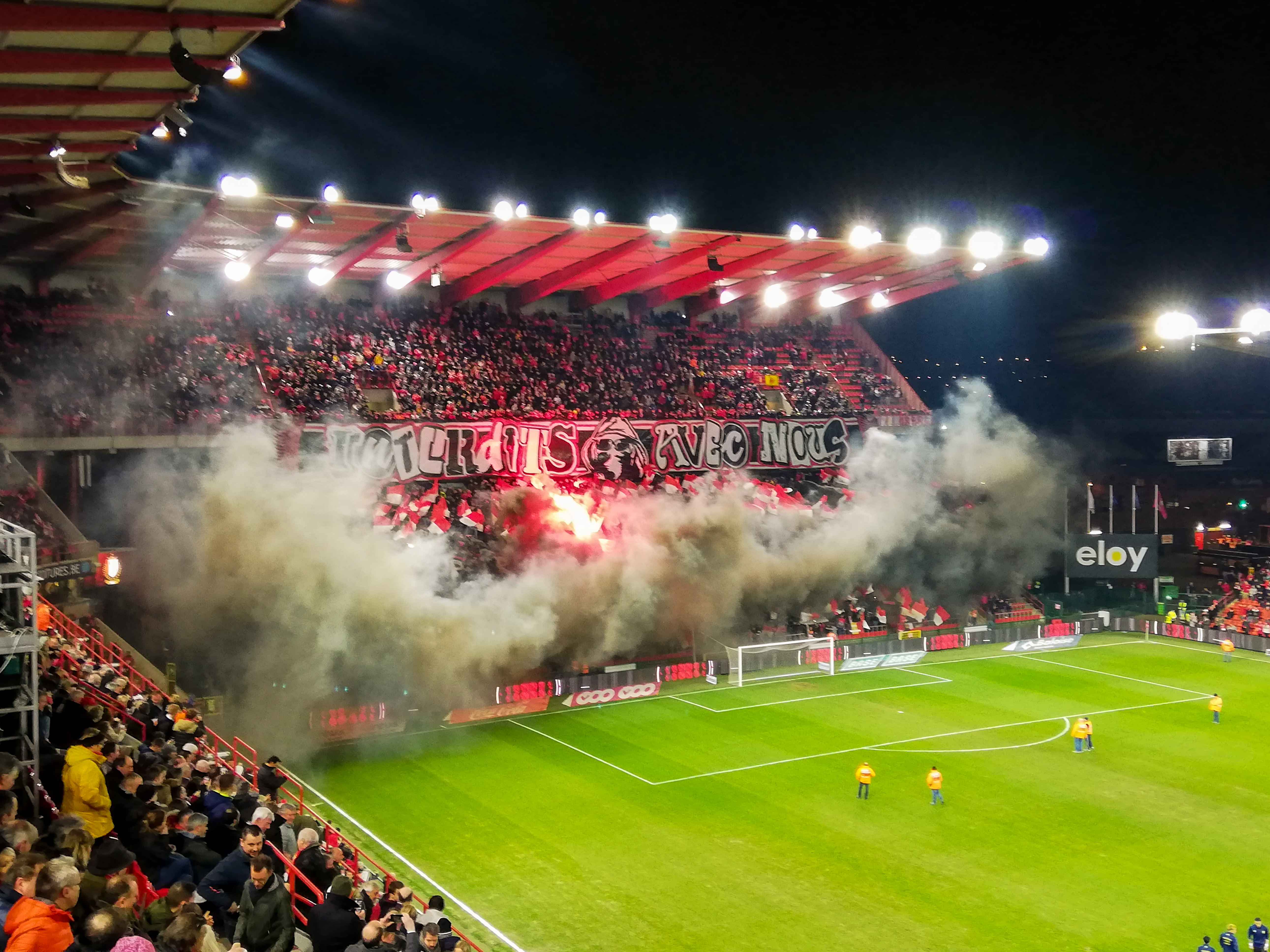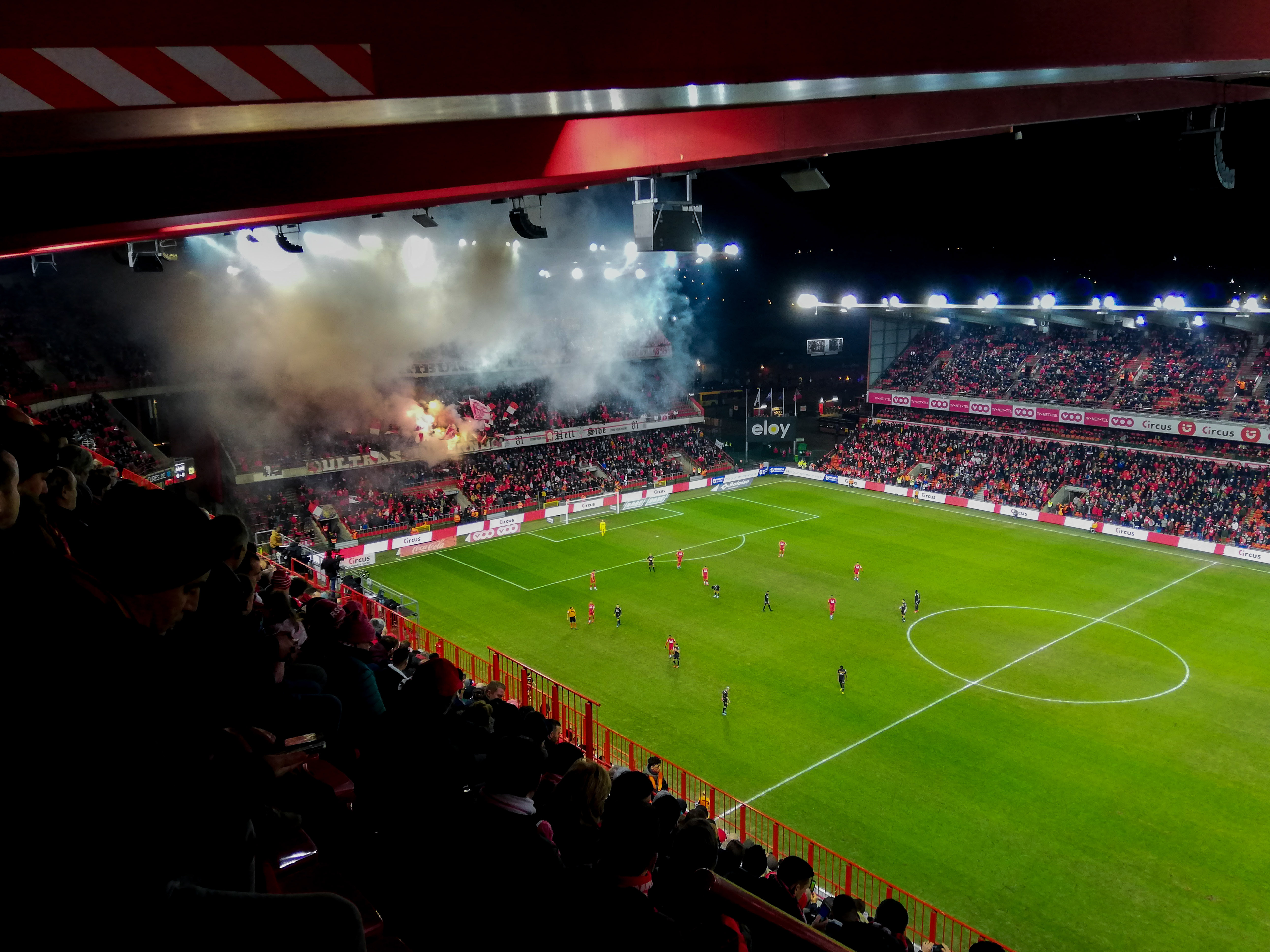 En dan, plots, Sclessin. Geen sierlijk bouwwerk, maar een betonnen muur die je opslokt. Steil, intimiderend, alsof de tribunes elk moment over je heen kunnen vallen. Het stadion is geen decor, het ís de stad. De lucht is zwaar, de spanning tastbaar. Voor de aftrap barst het los: fakkels, rook, vlaggen. Een vulkaan die uitbarst, een ritueel dat groter is dan de wedstrijd zelf. De tribunes zijn rauw en puur, een hartslag die je voelt in je borstkas. Hier wordt niet gekeken, hier wordt geleefd.