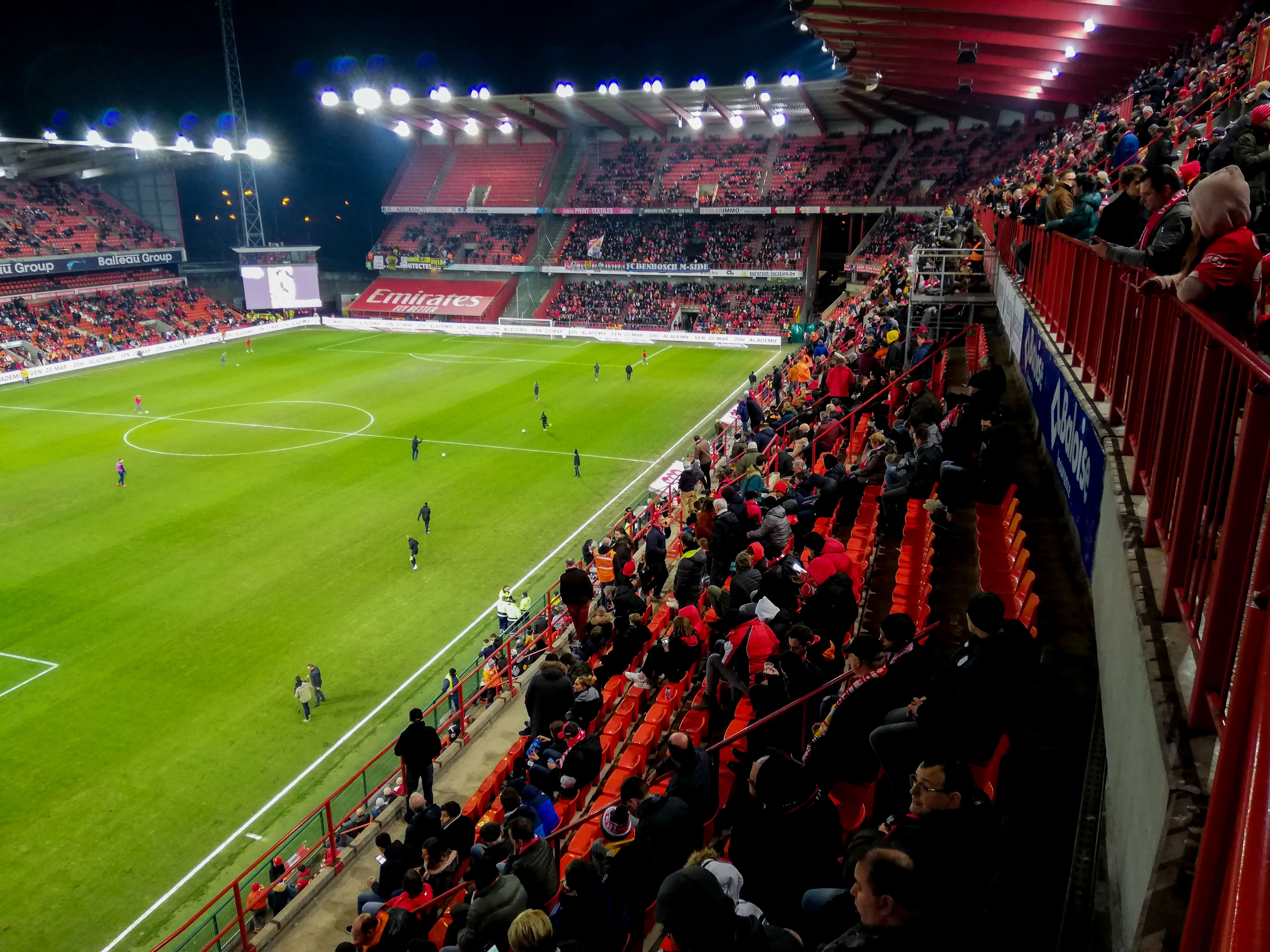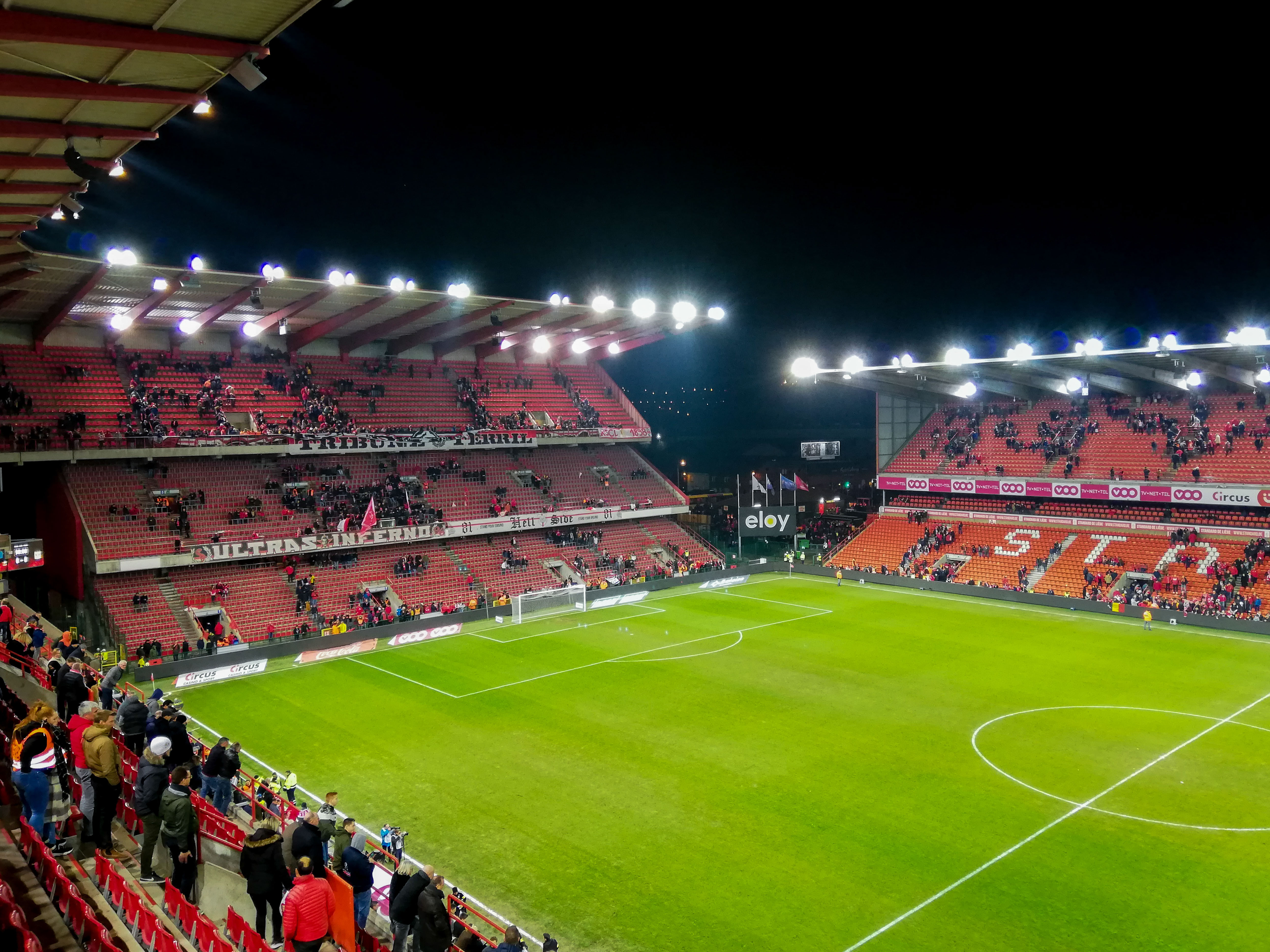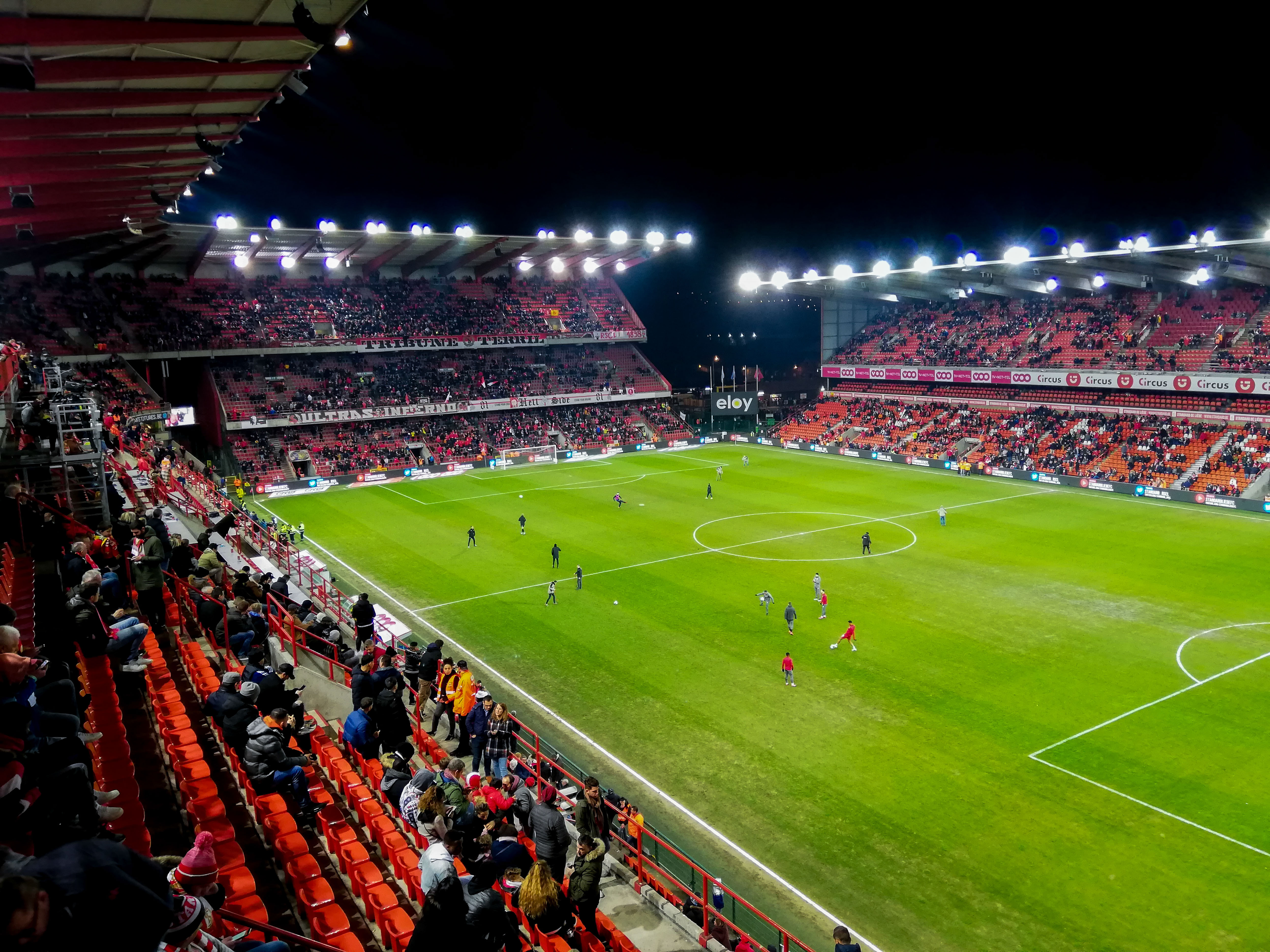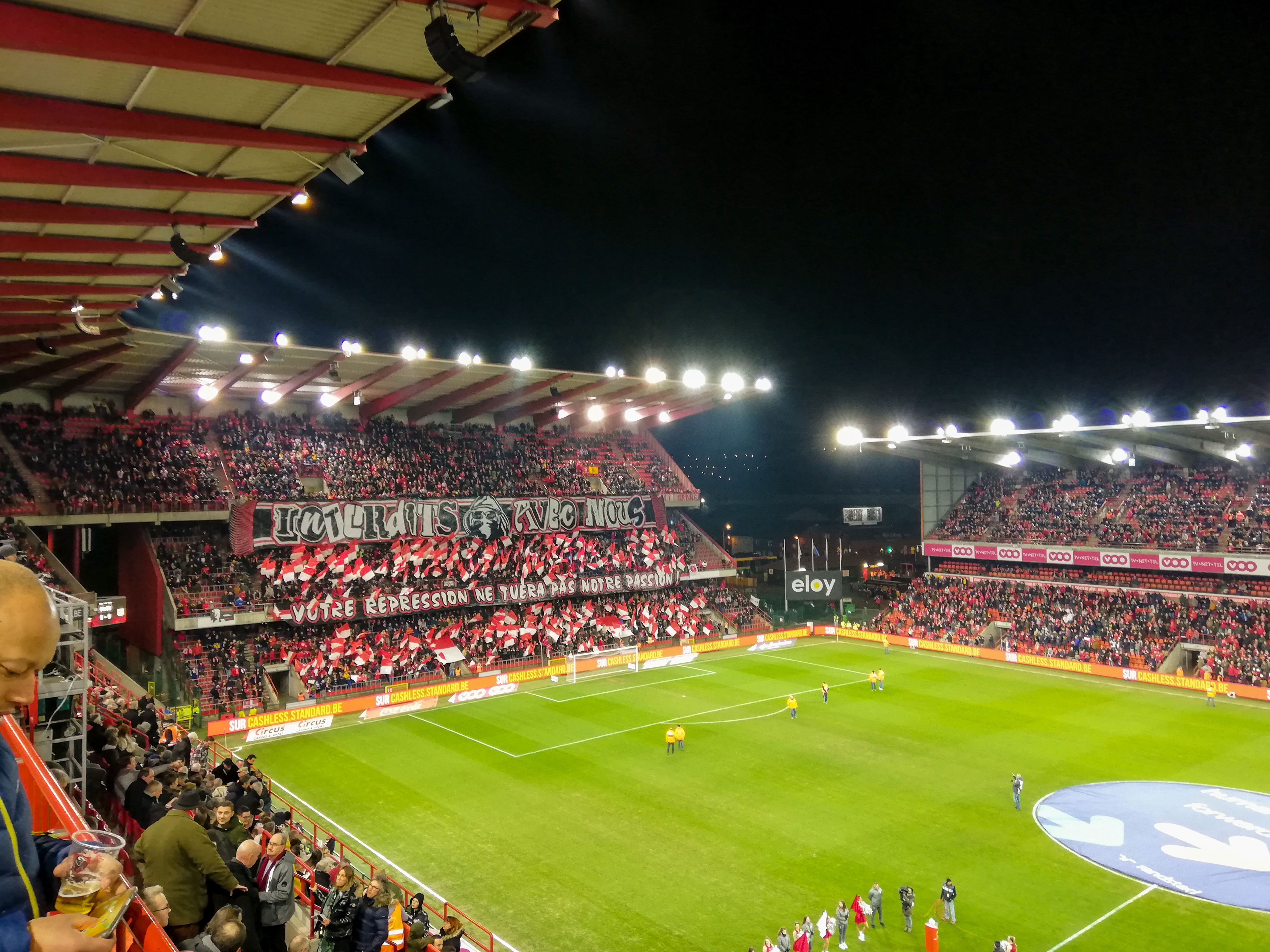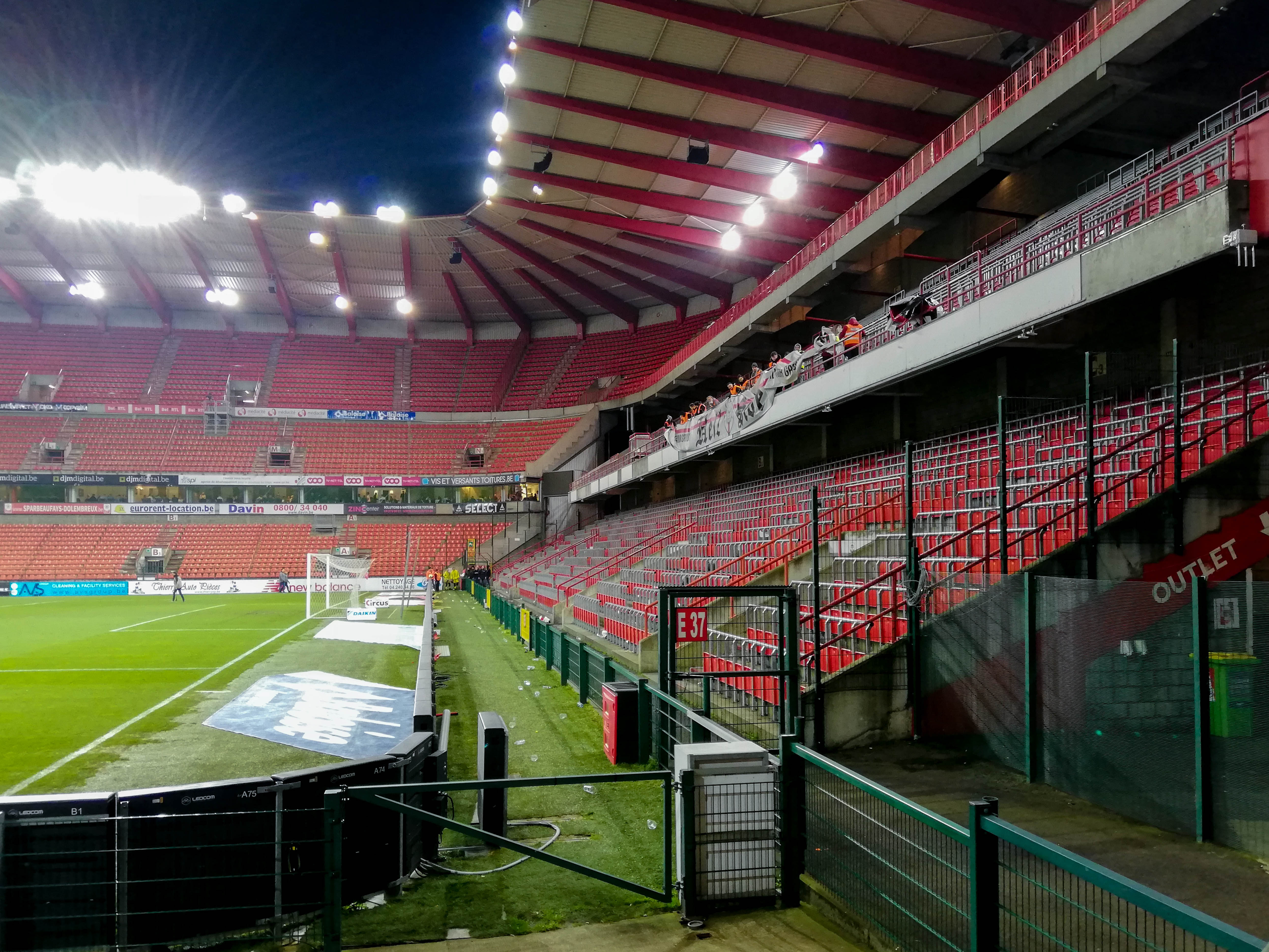 En dan, plots, Sclessin. Geen sierlijk bouwwerk, maar een betonnen muur die je opslokt. Steil, intimiderend, alsof de tribunes elk moment over je heen kunnen vallen. Het stadion is geen decor, het ís de stad. De lucht is zwaar, de spanning tastbaar. Voor de aftrap barst het los: fakkels, rook, vlaggen. Een vulkaan die uitbarst, een ritueel dat groter is dan de wedstrijd zelf. De tribunes zijn rauw en puur, een hartslag die je voelt in je borstkas. Hier wordt niet gekeken, hier wordt geleefd.