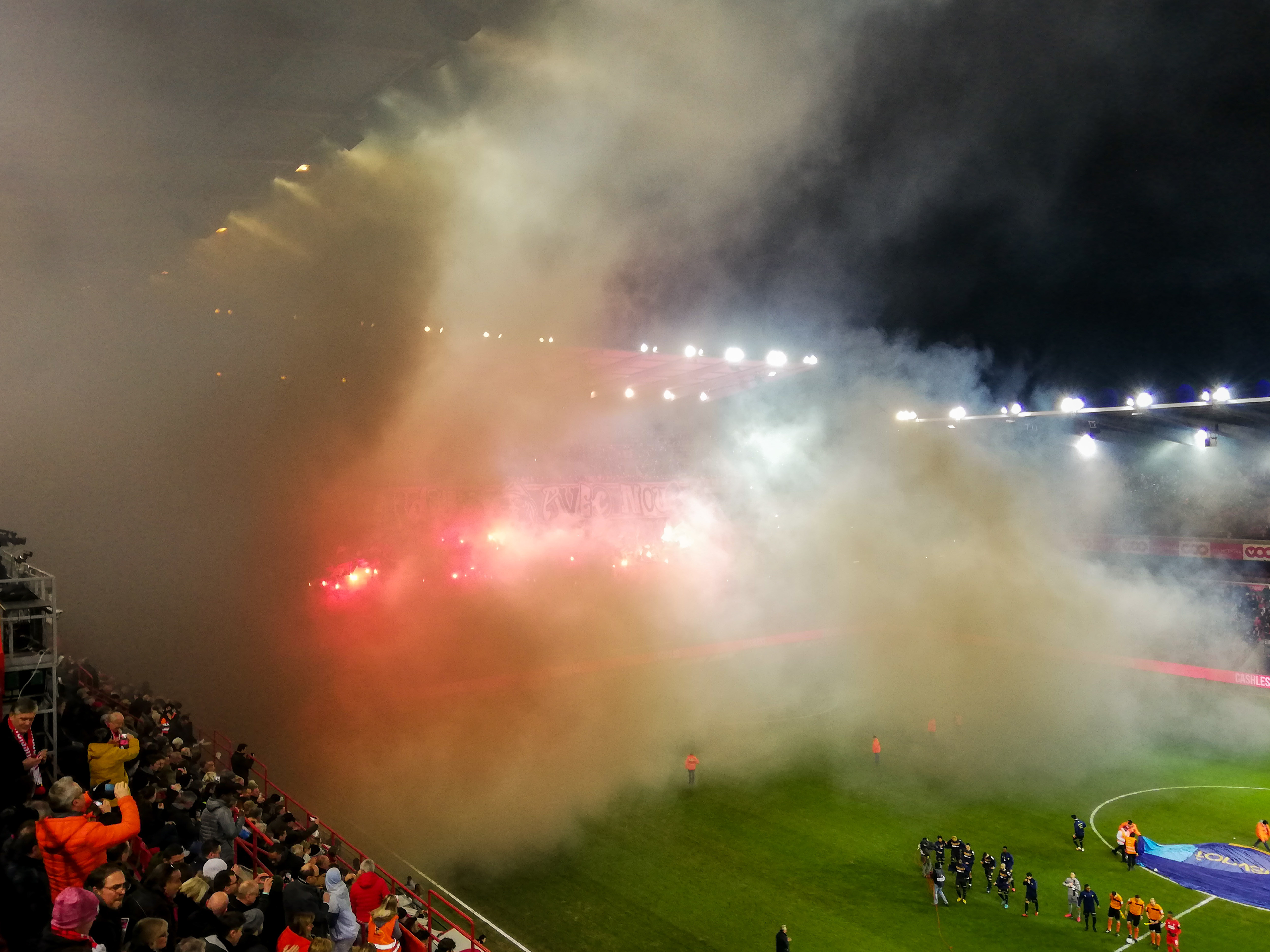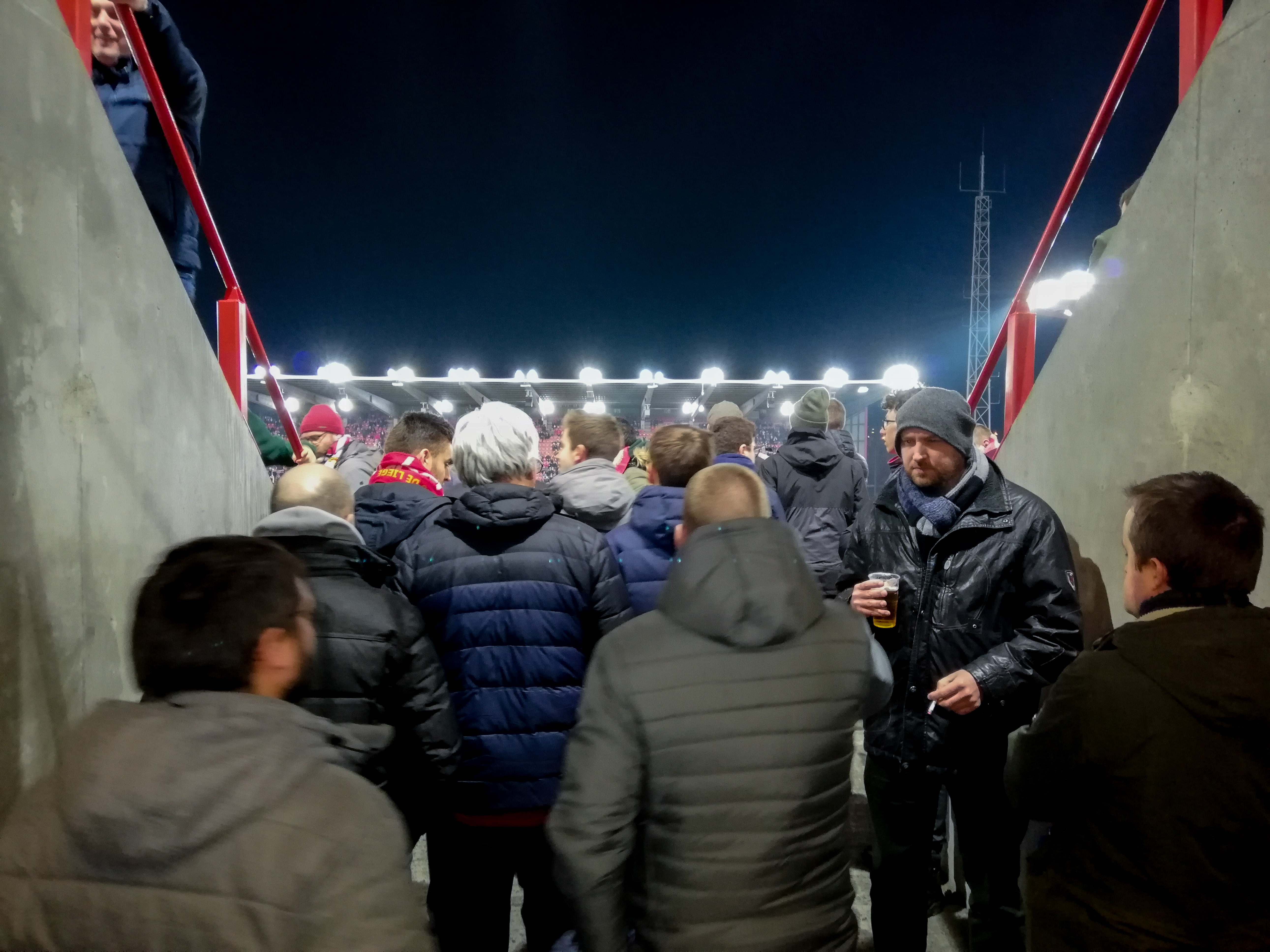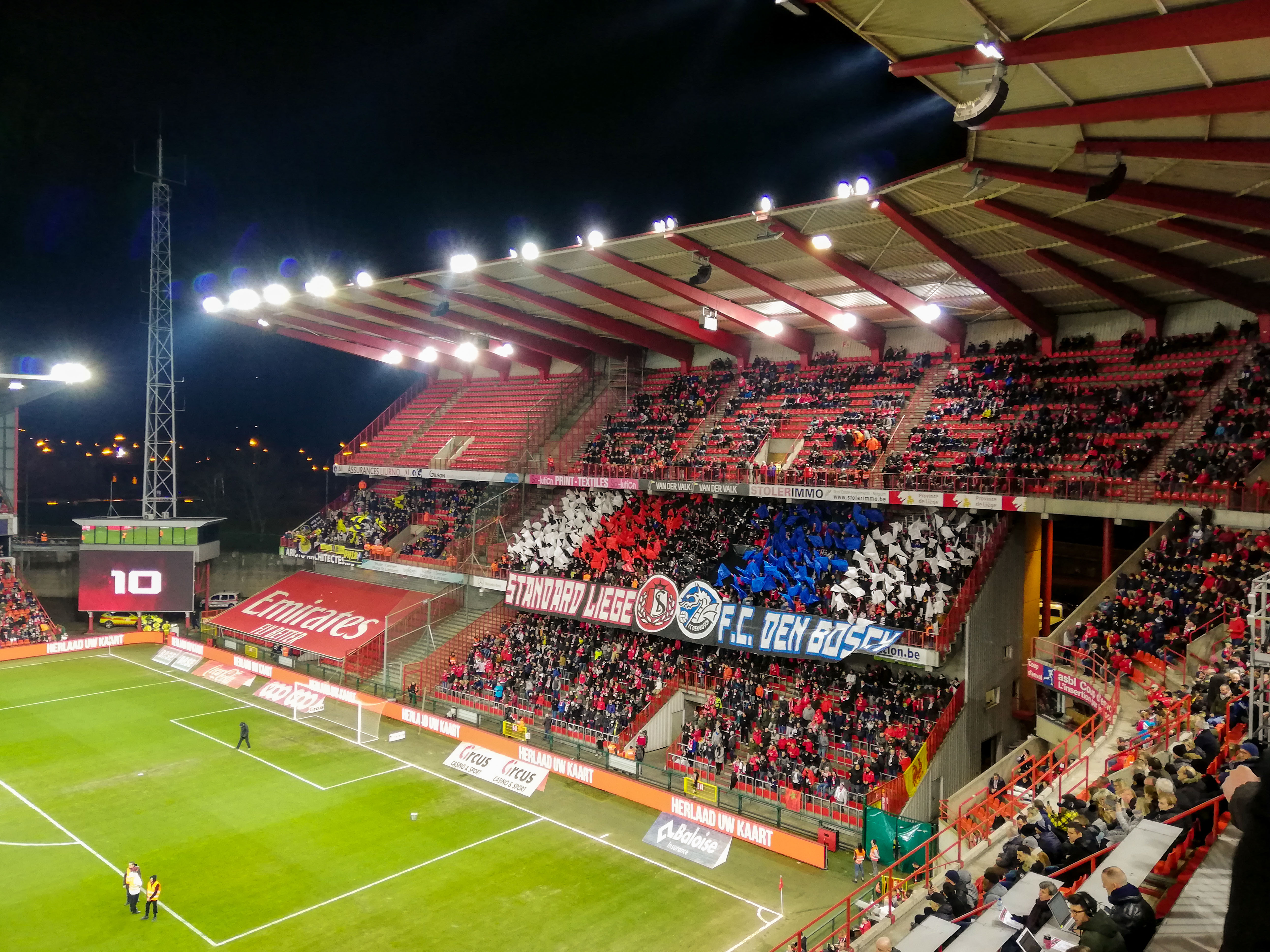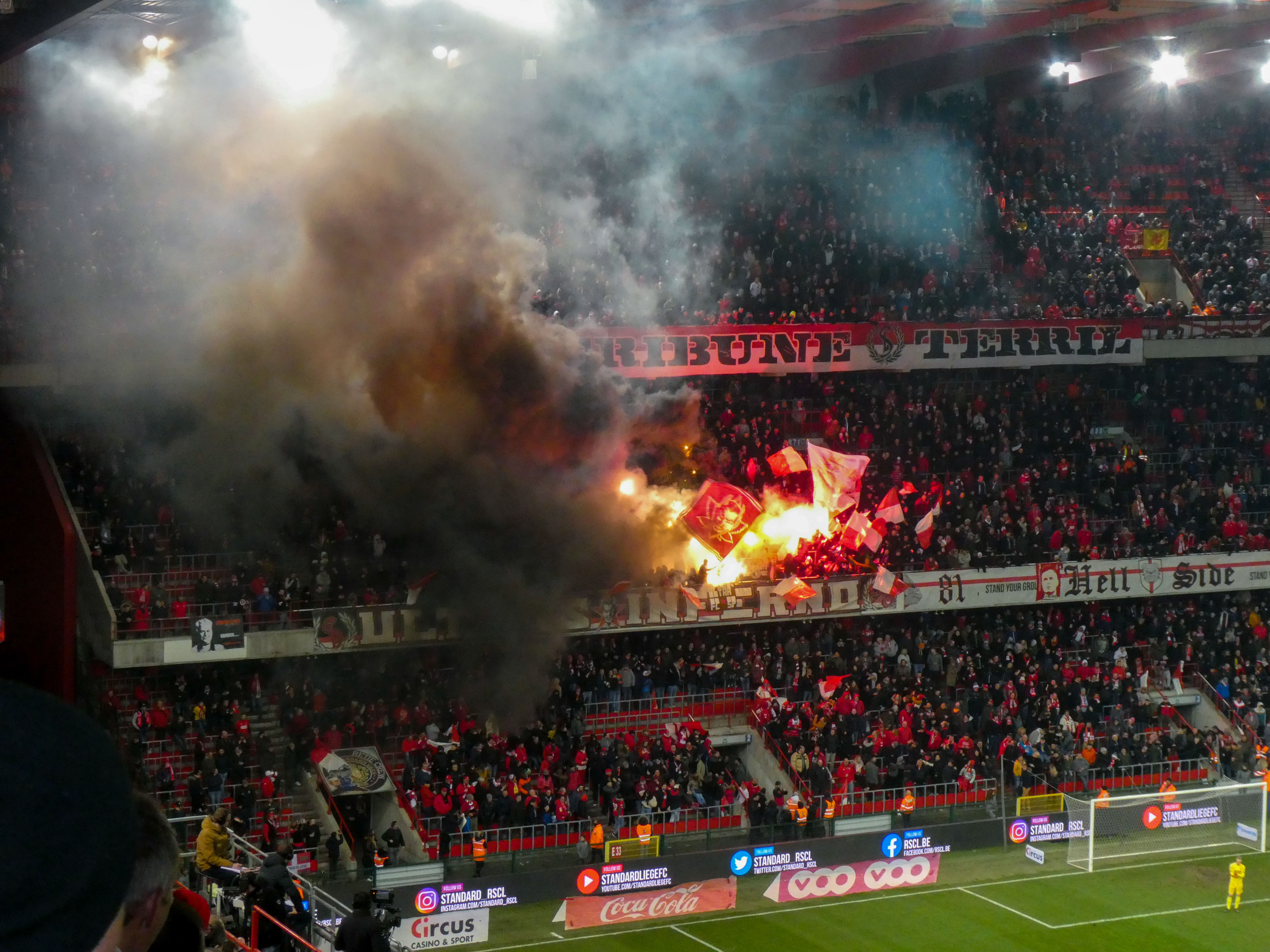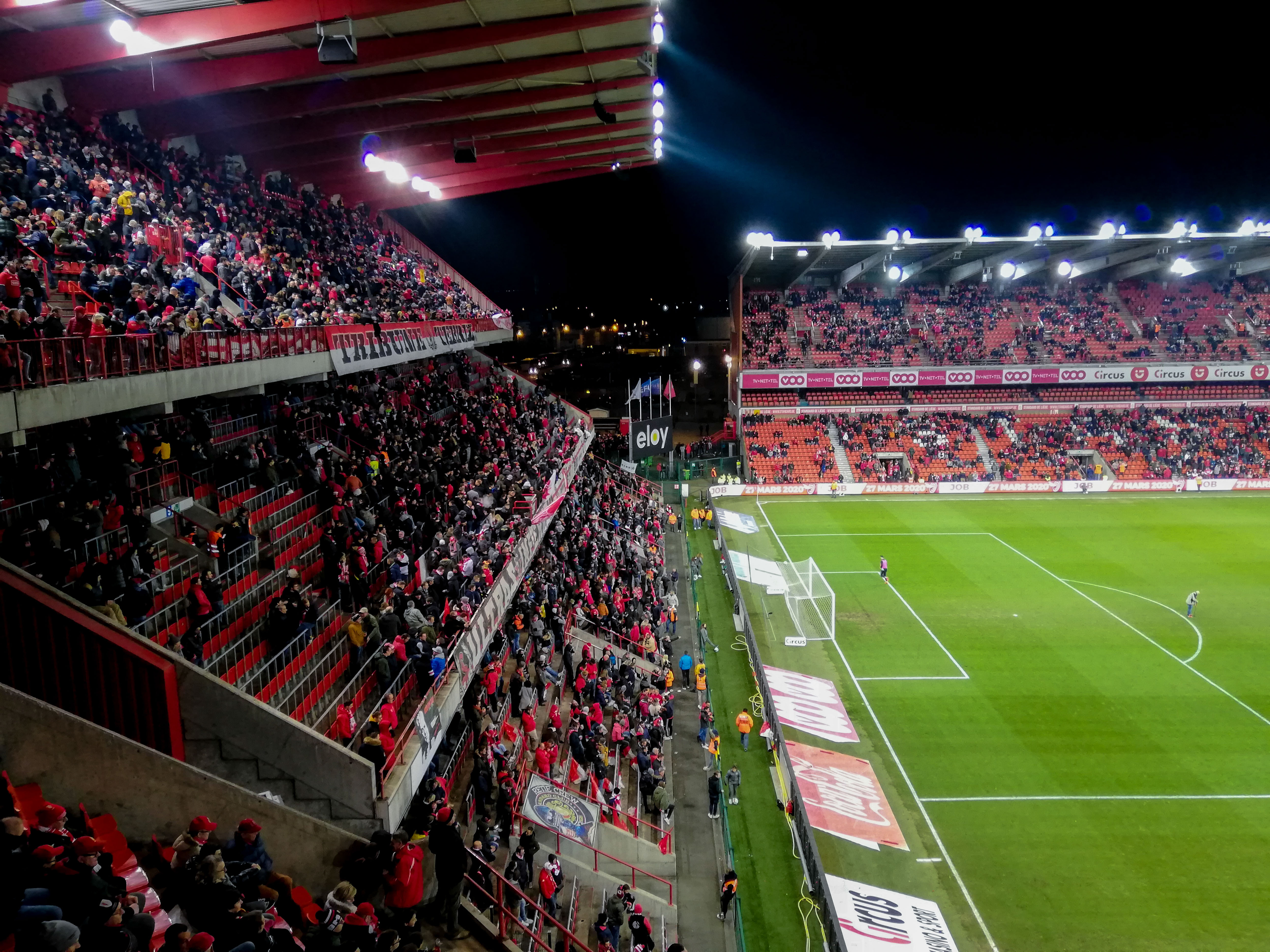 En dan, plots, Sclessin. Geen sierlijk bouwwerk, maar een betonnen muur die je opslokt. Steil, intimiderend, alsof de tribunes elk moment over je heen kunnen vallen. Het stadion is geen decor, het ís de stad. De lucht is zwaar, de spanning tastbaar. Voor de aftrap barst het los: fakkels, rook, vlaggen. Een vulkaan die uitbarst, een ritueel dat groter is dan de wedstrijd zelf. De tribunes zijn rauw en puur, een hartslag die je voelt in je borstkas. Hier wordt niet gekeken, hier wordt geleefd.