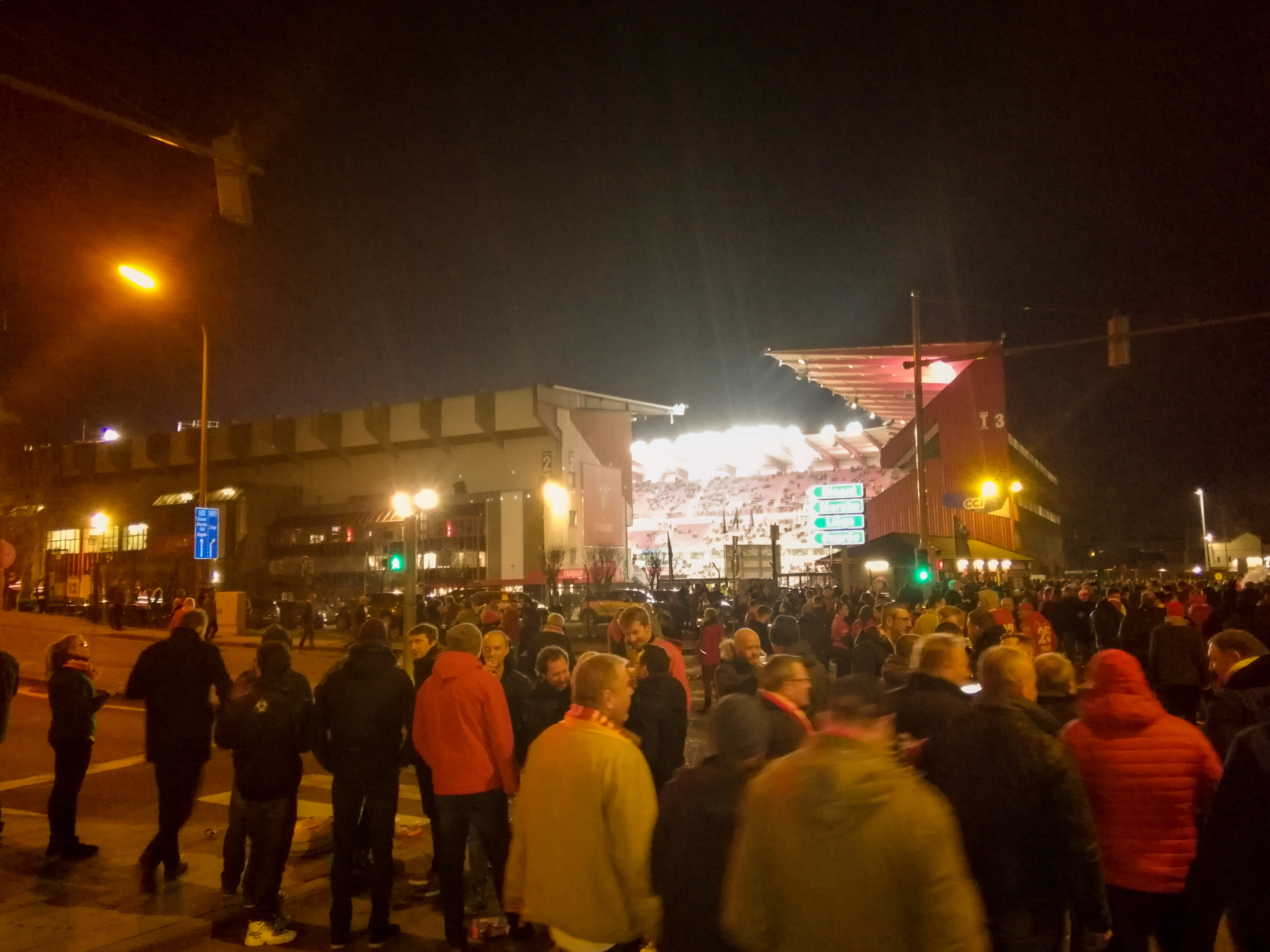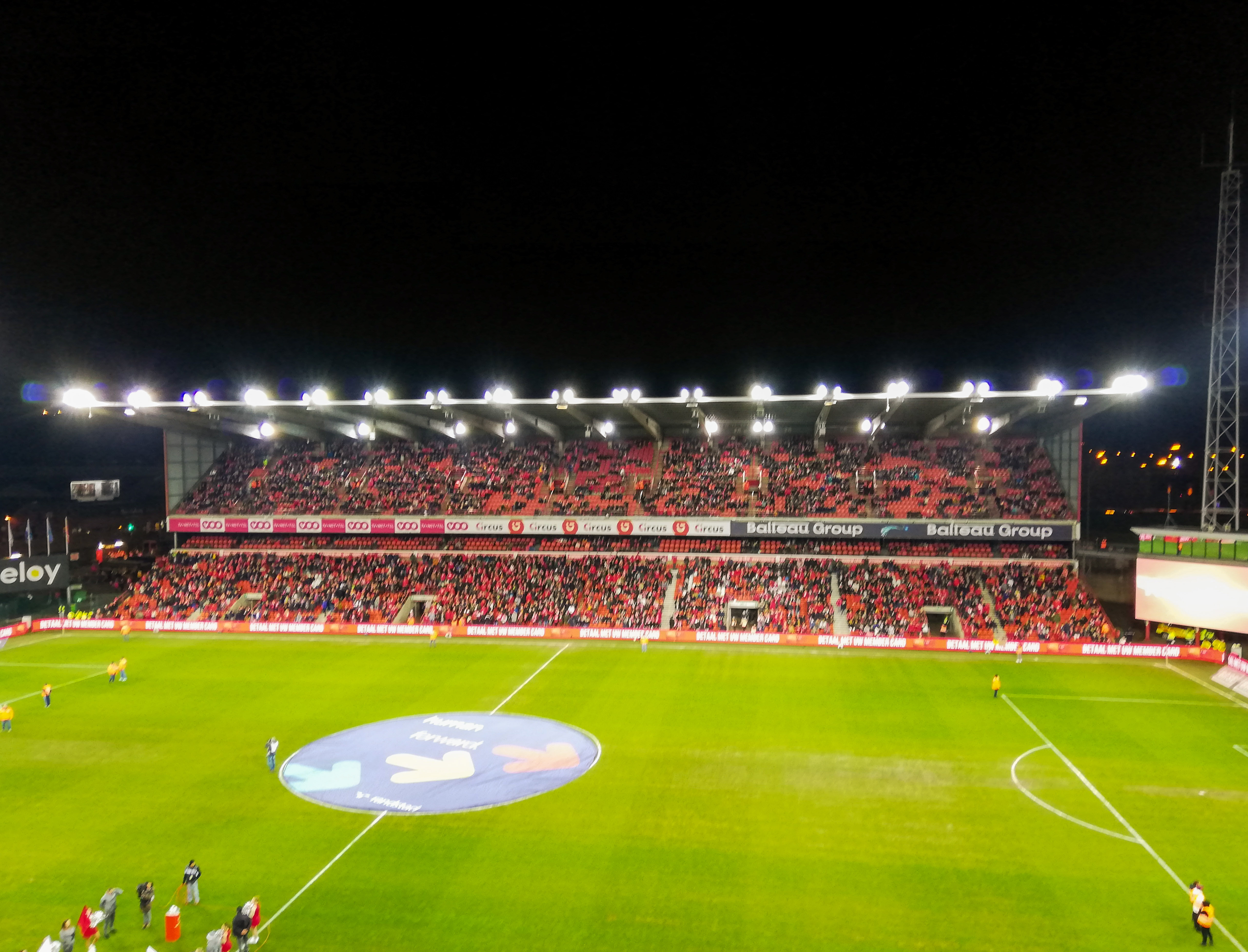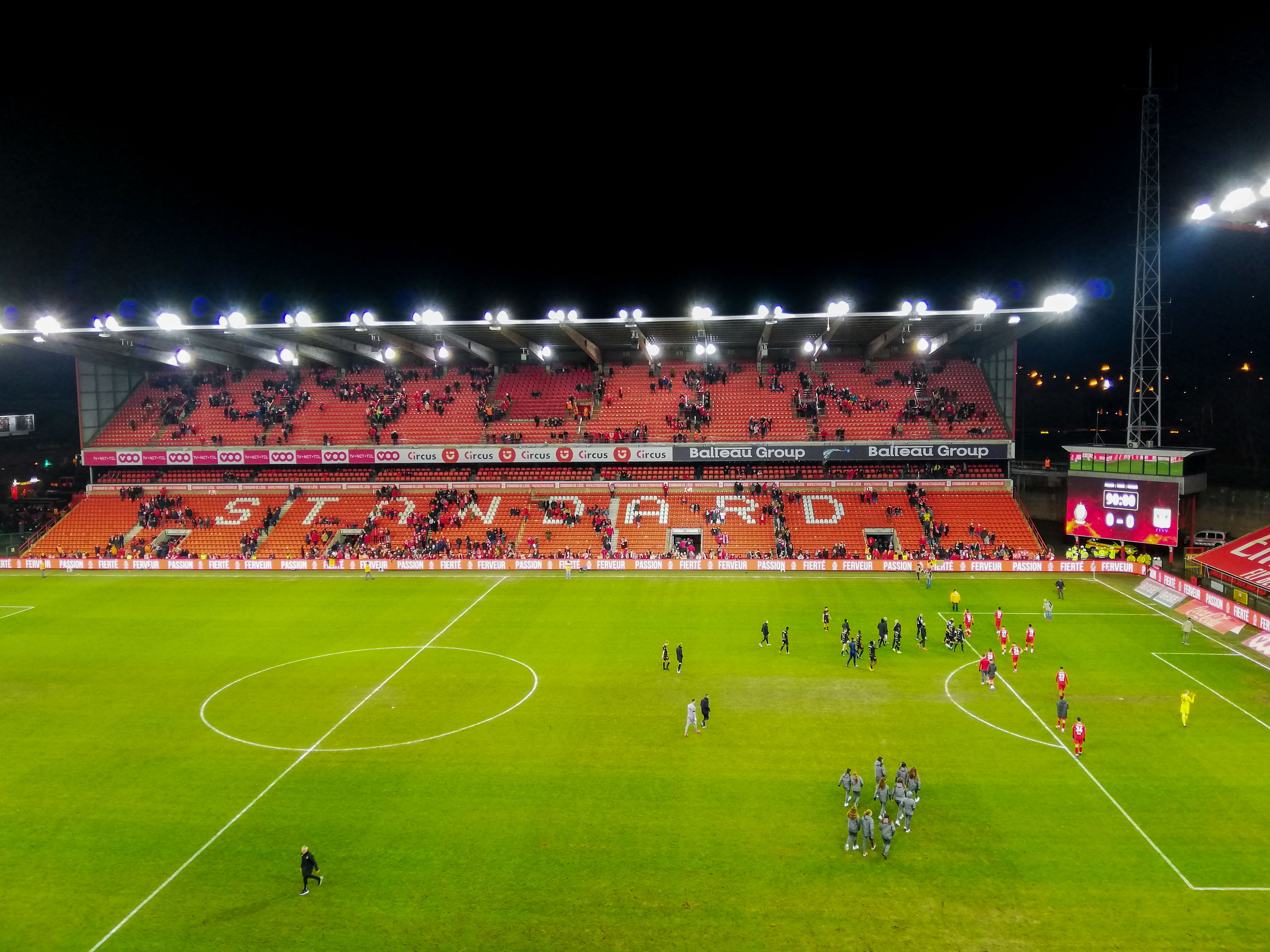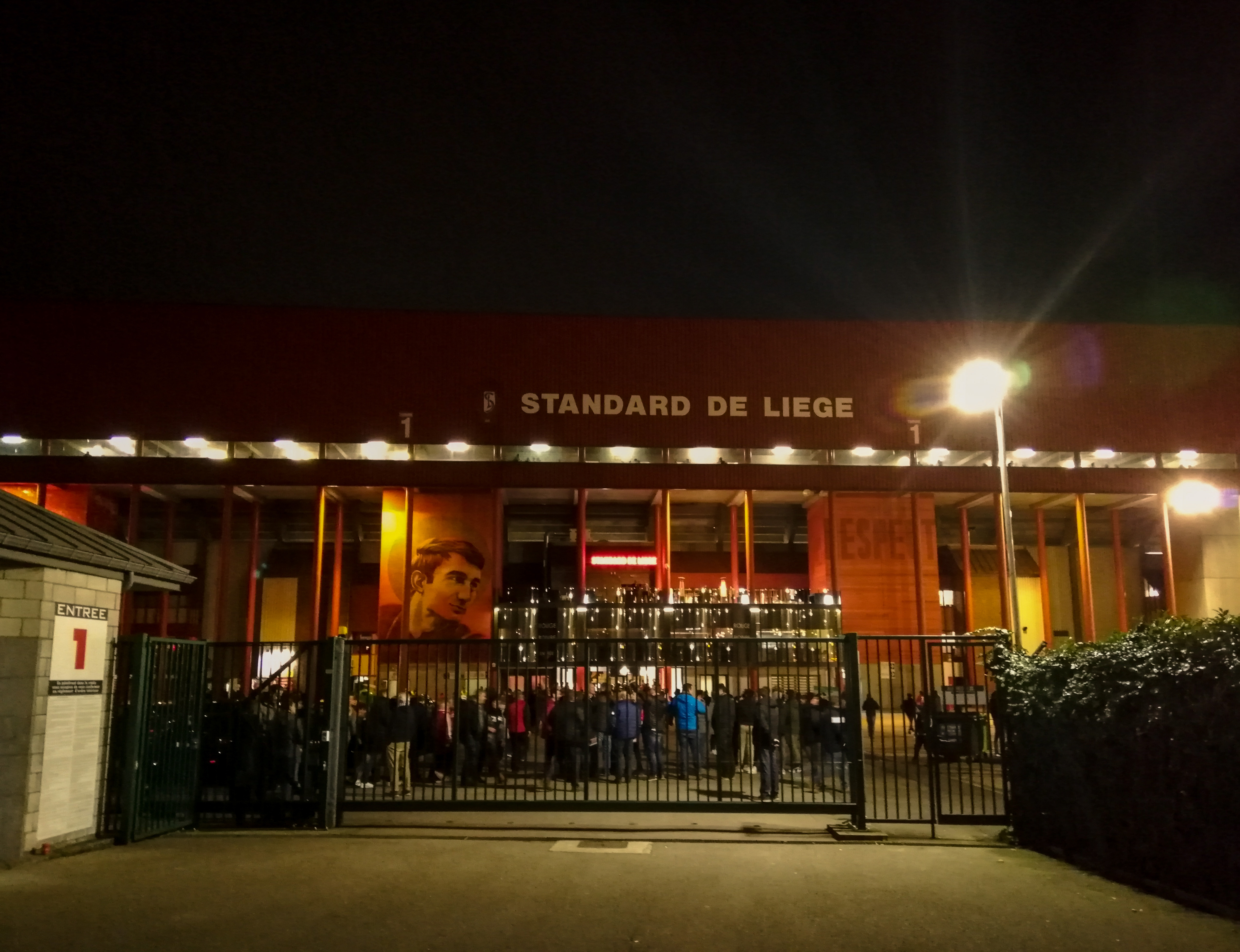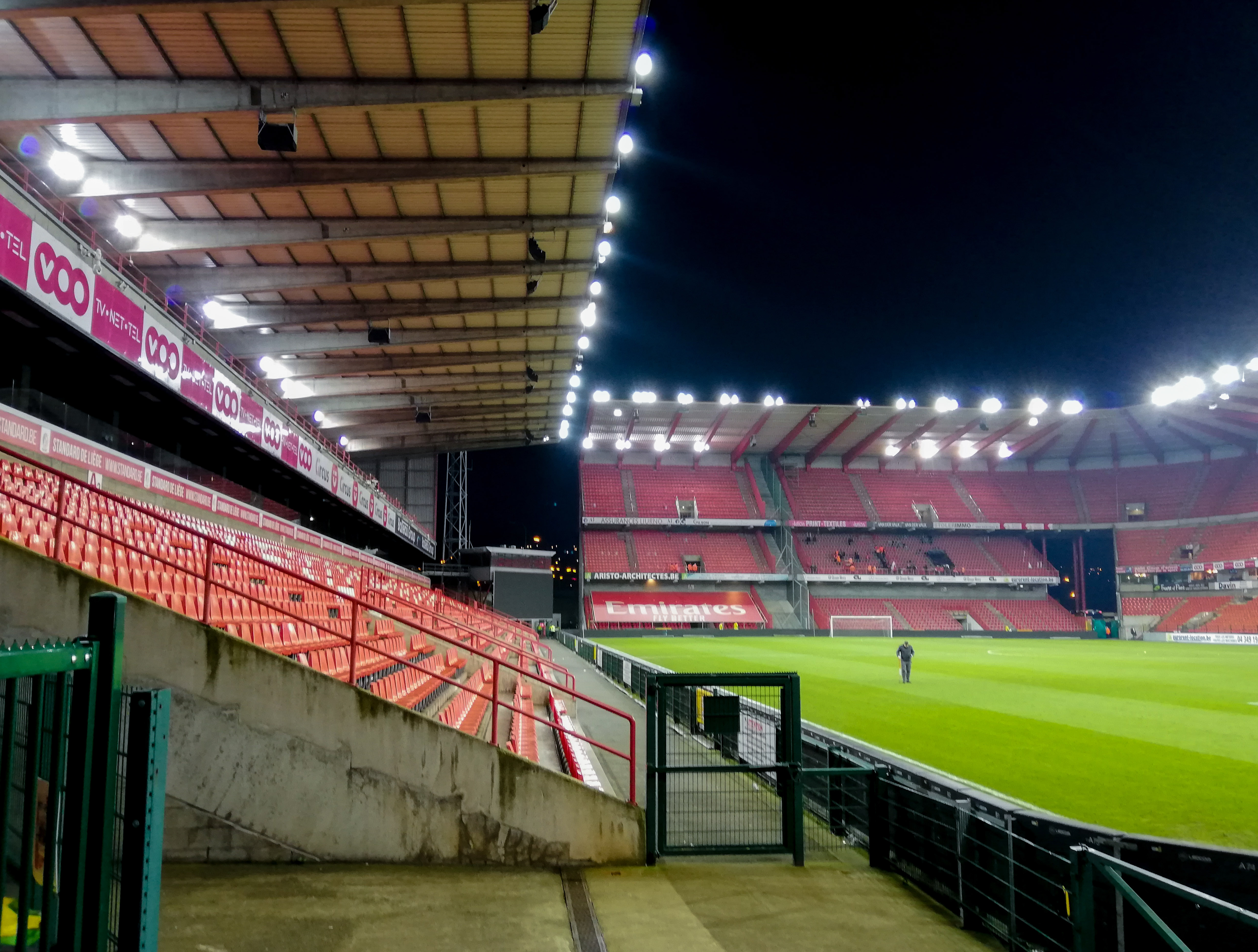 En dan, plots, Sclessin. Geen sierlijk bouwwerk, maar een betonnen muur die je opslokt. Steil, intimiderend, alsof de tribunes elk moment over je heen kunnen vallen. Het stadion is geen decor, het ís de stad. De lucht is zwaar, de spanning tastbaar. Voor de aftrap barst het los: fakkels, rook, vlaggen. Een vulkaan die uitbarst, een ritueel dat groter is dan de wedstrijd zelf. De tribunes zijn rauw en puur, een hartslag die je voelt in je borstkas. Hier wordt niet gekeken, hier wordt geleefd.