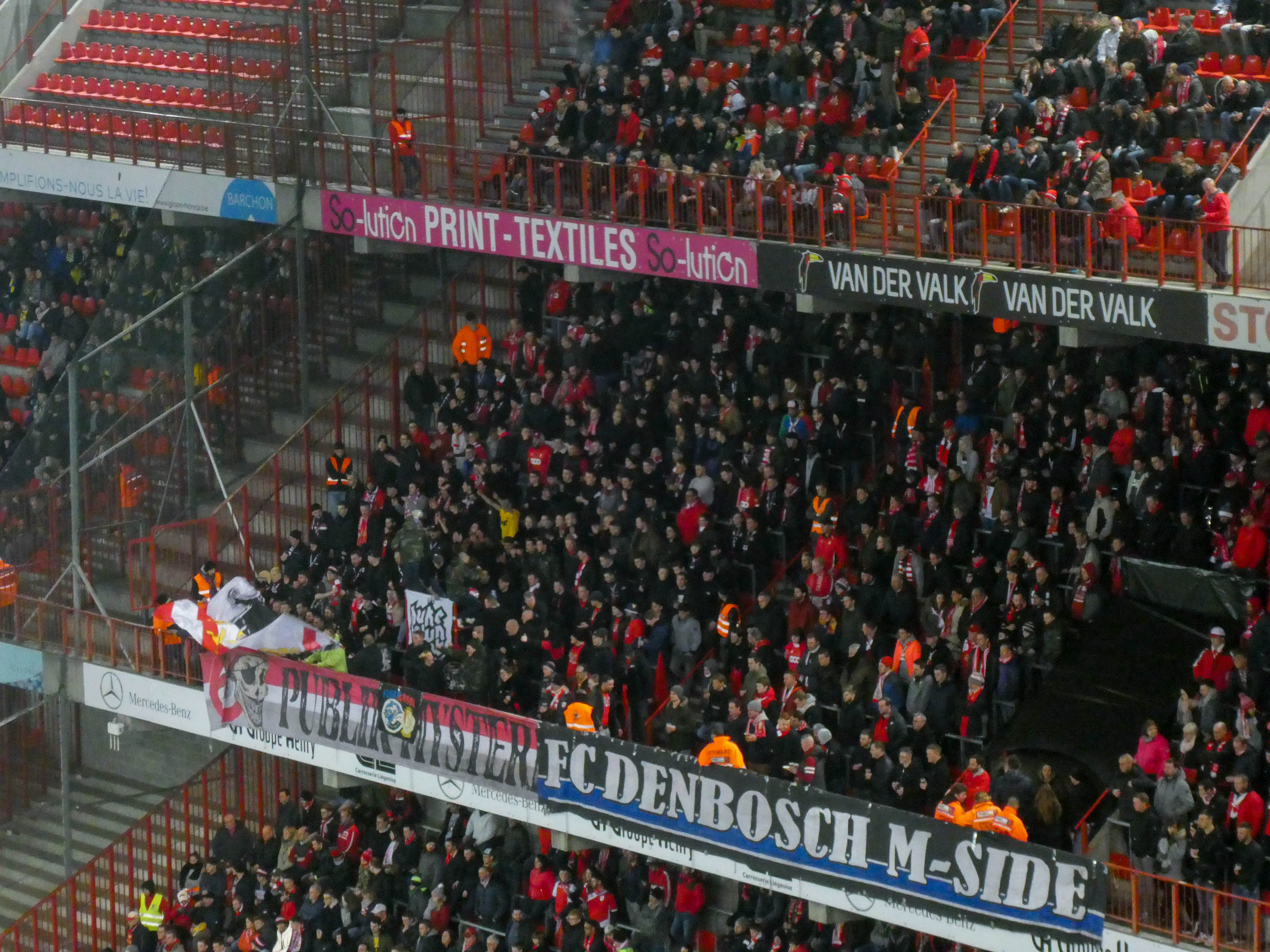 En dan, tussen de rode rook en de vurige vlaggenzee, ineens een spandoek dat niet thuishoort. FC Den Bosch. Alsof de Maas even verbonden is met de Dieze, alsof de supporterscultuur zelf een ondergronds netwerk vormt dat geen grenzen kent. Een glitch in de werkelijkheid, een knipoog die alleen de oplettende kijker ziet. Hier, in de hel van Sclessin, hangt plots een stukje Bossche ziel.