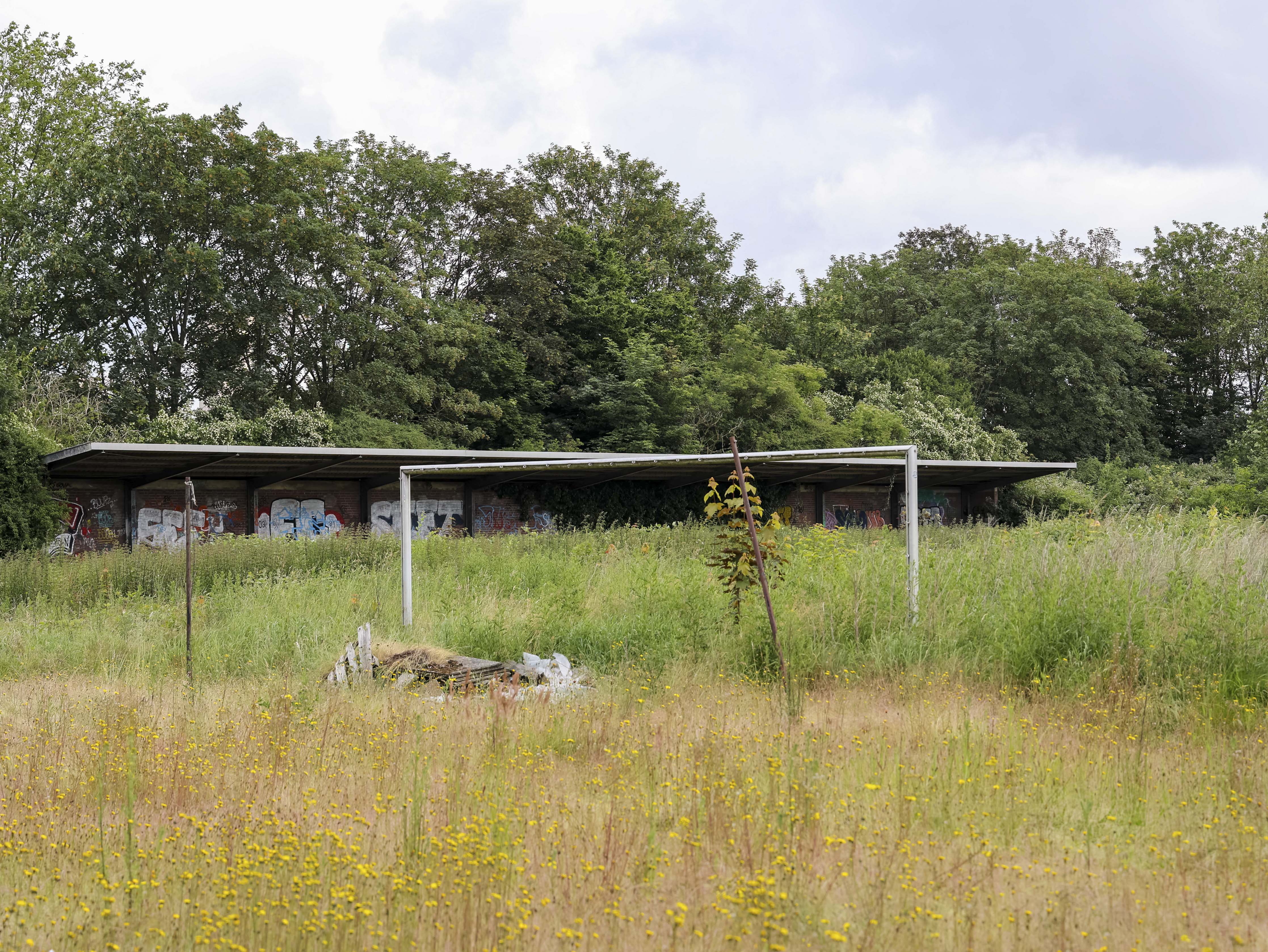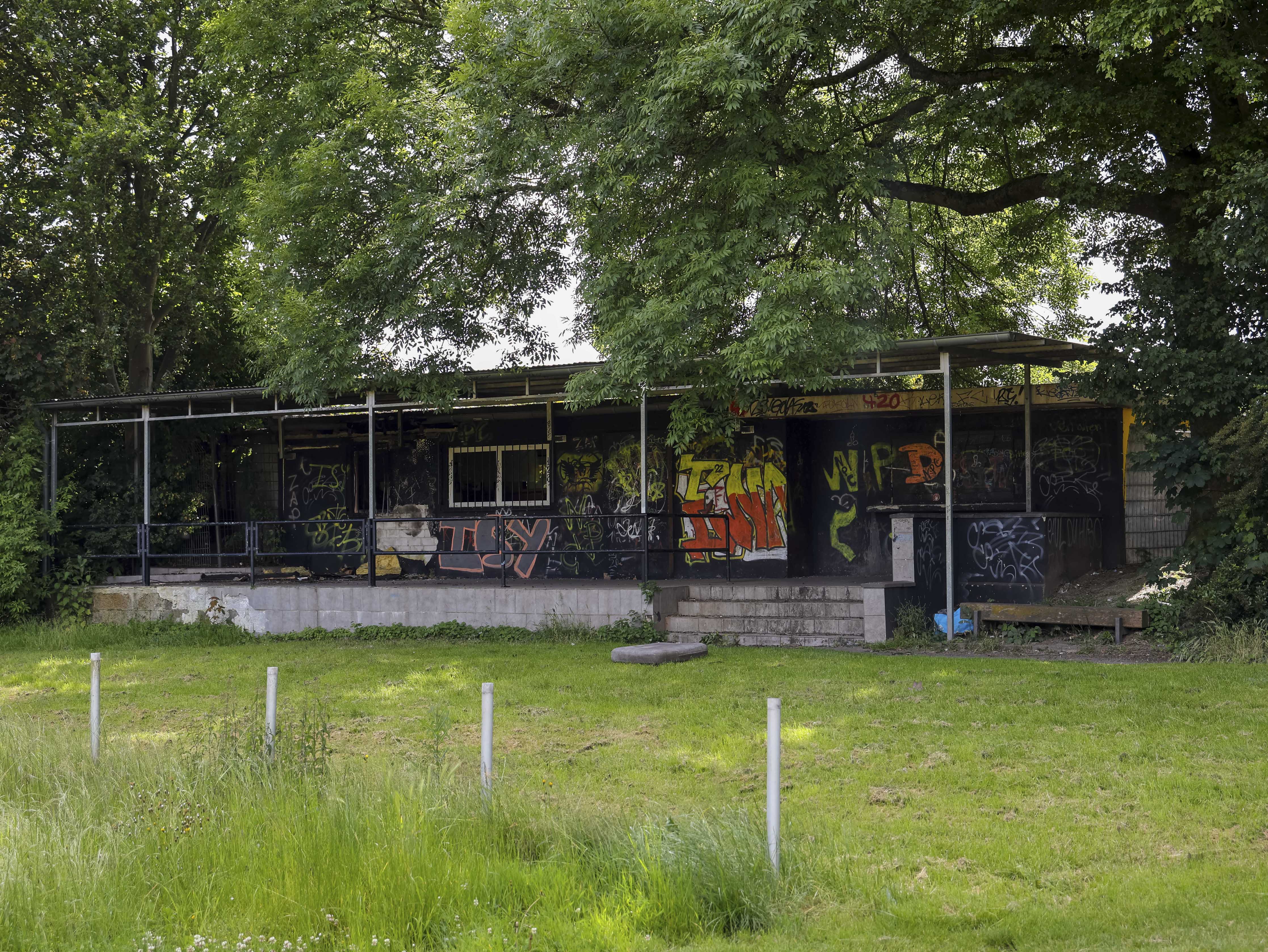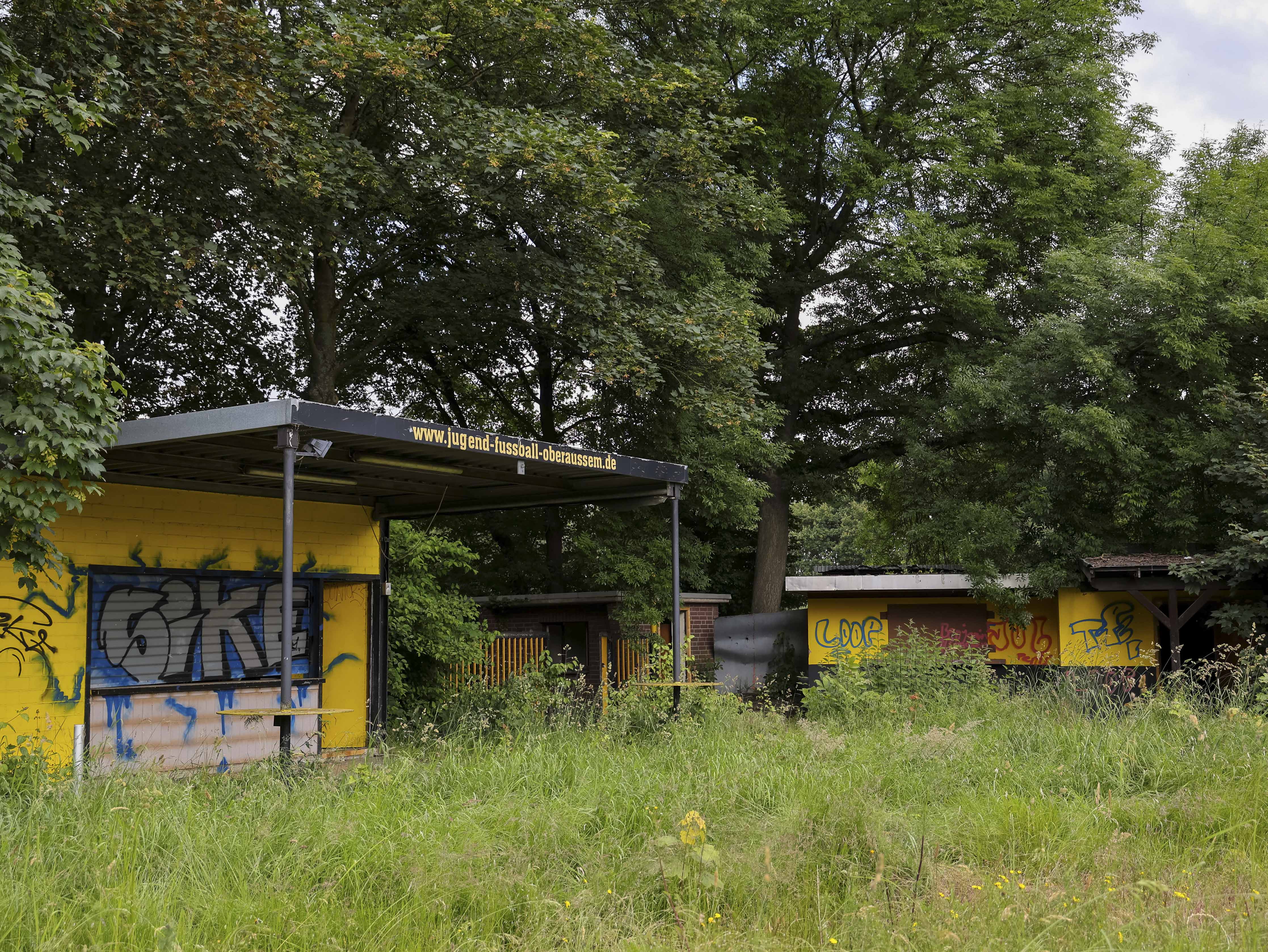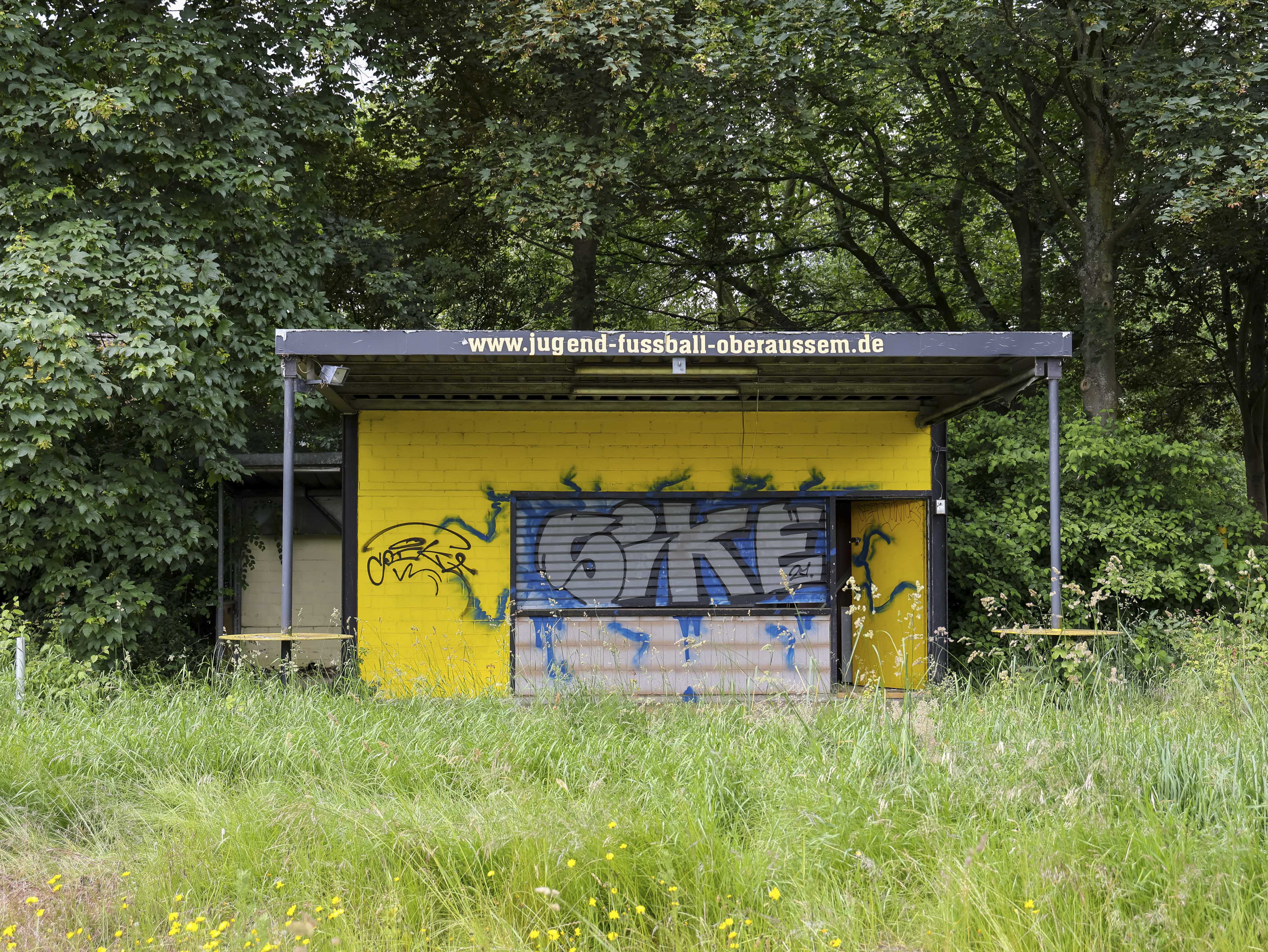 Naast de ticketbox staat het clubgebouw. Geel geschilderd, of wat daar nog van over is. Op het dak staat een URL: www.jugend-fussball-oberaussem.de. Een digitale grafsteen. De club leeft nog ergens, diep in het geheugen van het internet. Binnen hangt de deur scheef in haar hengsels. Het plafond ligt op de grond, in lange houten stroken. Een massieve kastenwand staat er nog. Graffiti overal. Gebroken ramen kijken uit op wat ooit het spelersgebied was. Dit waren de kleedkamers. Hier trokken spelers hun shirts aan voor wedstrijden in de Kreisliga D. Hier werden op dinsdagavonden trainingen besproken. Hier stonden jeugdteams op zaterdag te wachten op hun beurt. Peptalks, teleurstellingen, kleine overwinningen. Nu is er alleen puin. En stilte.