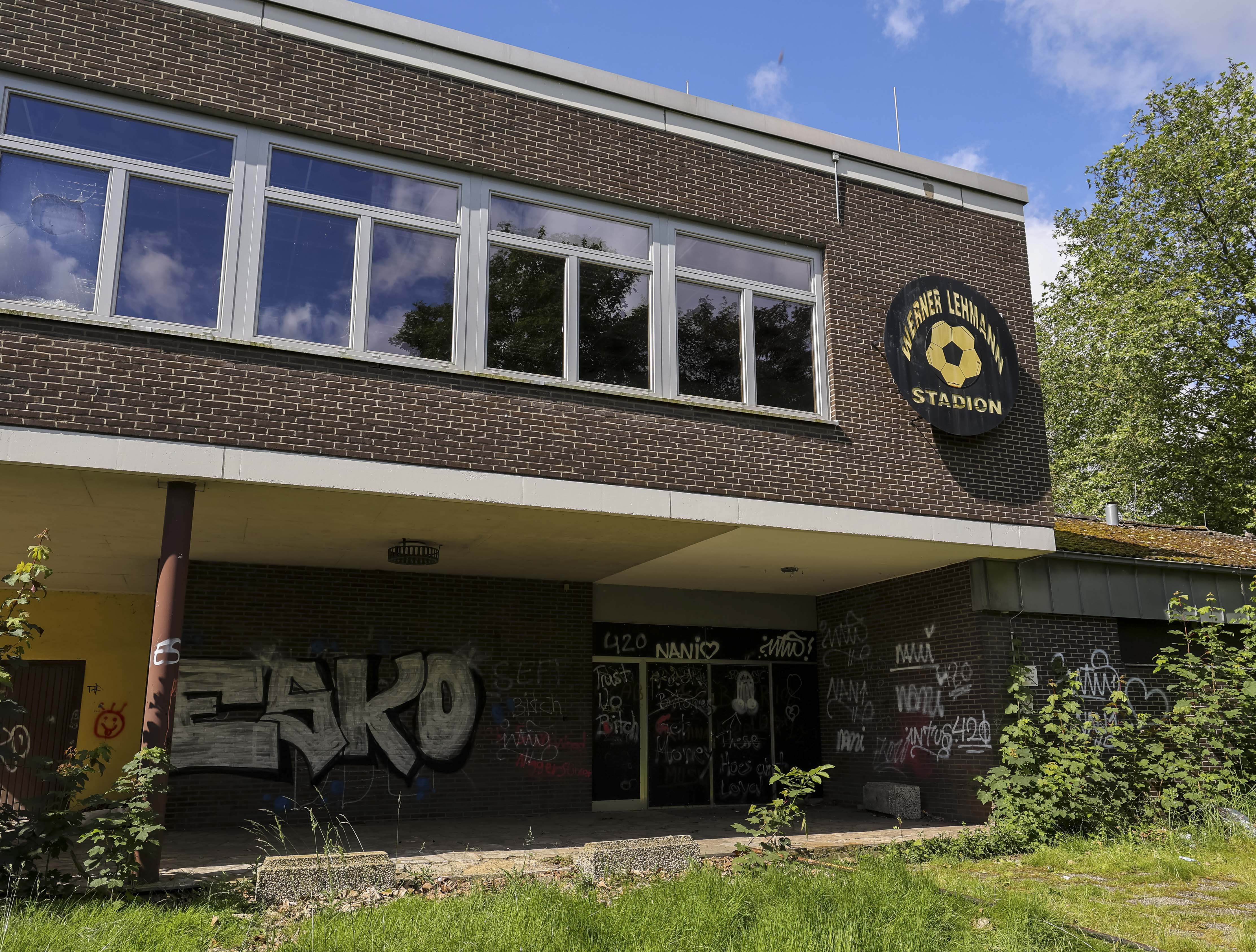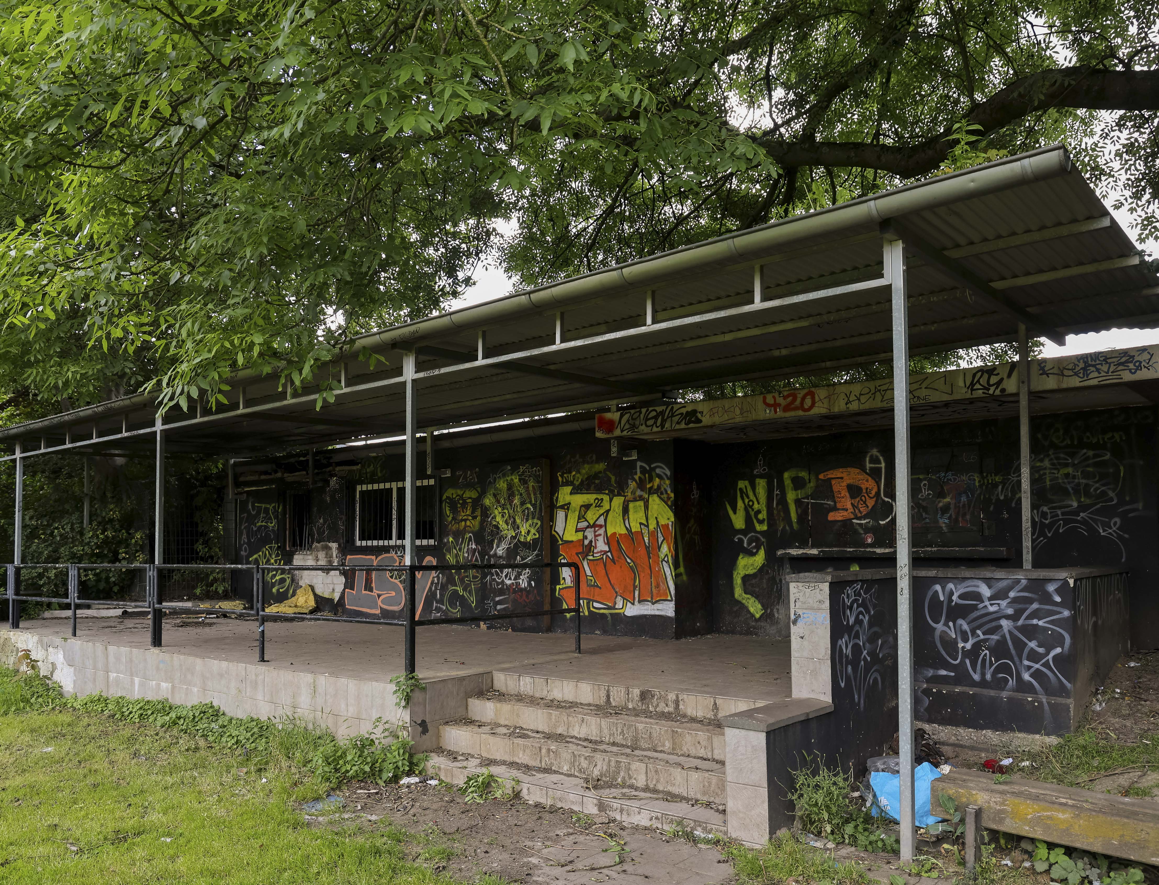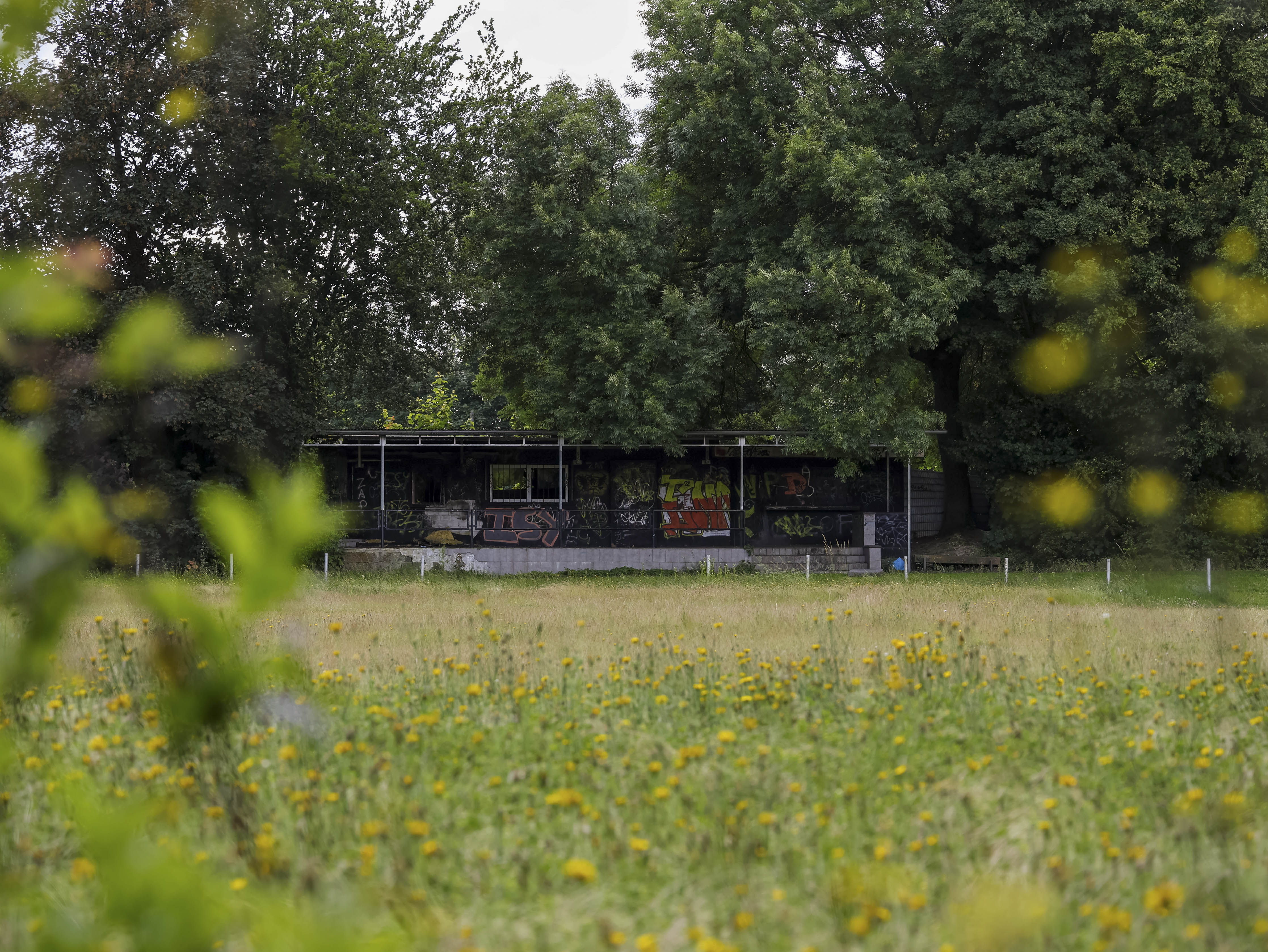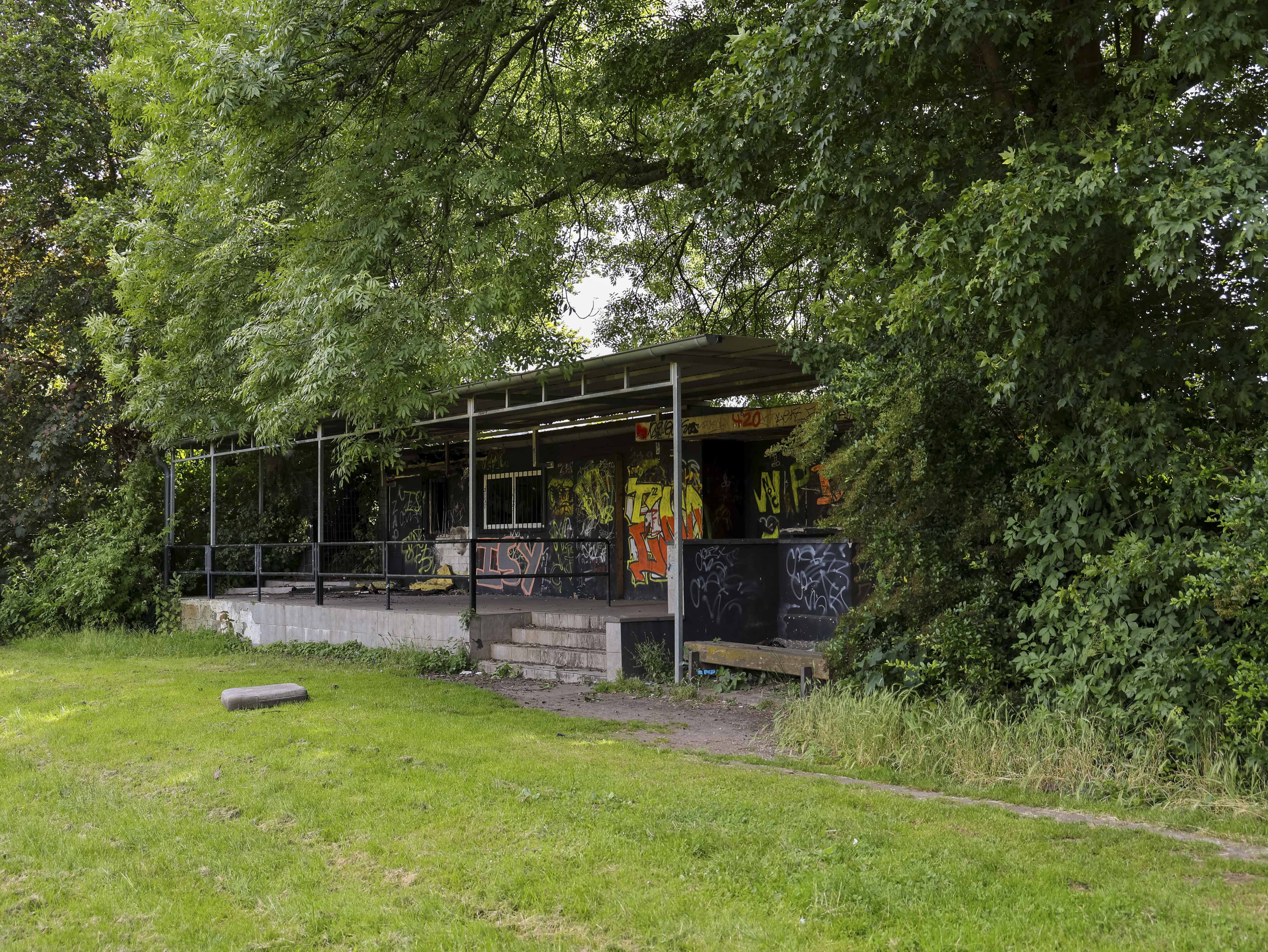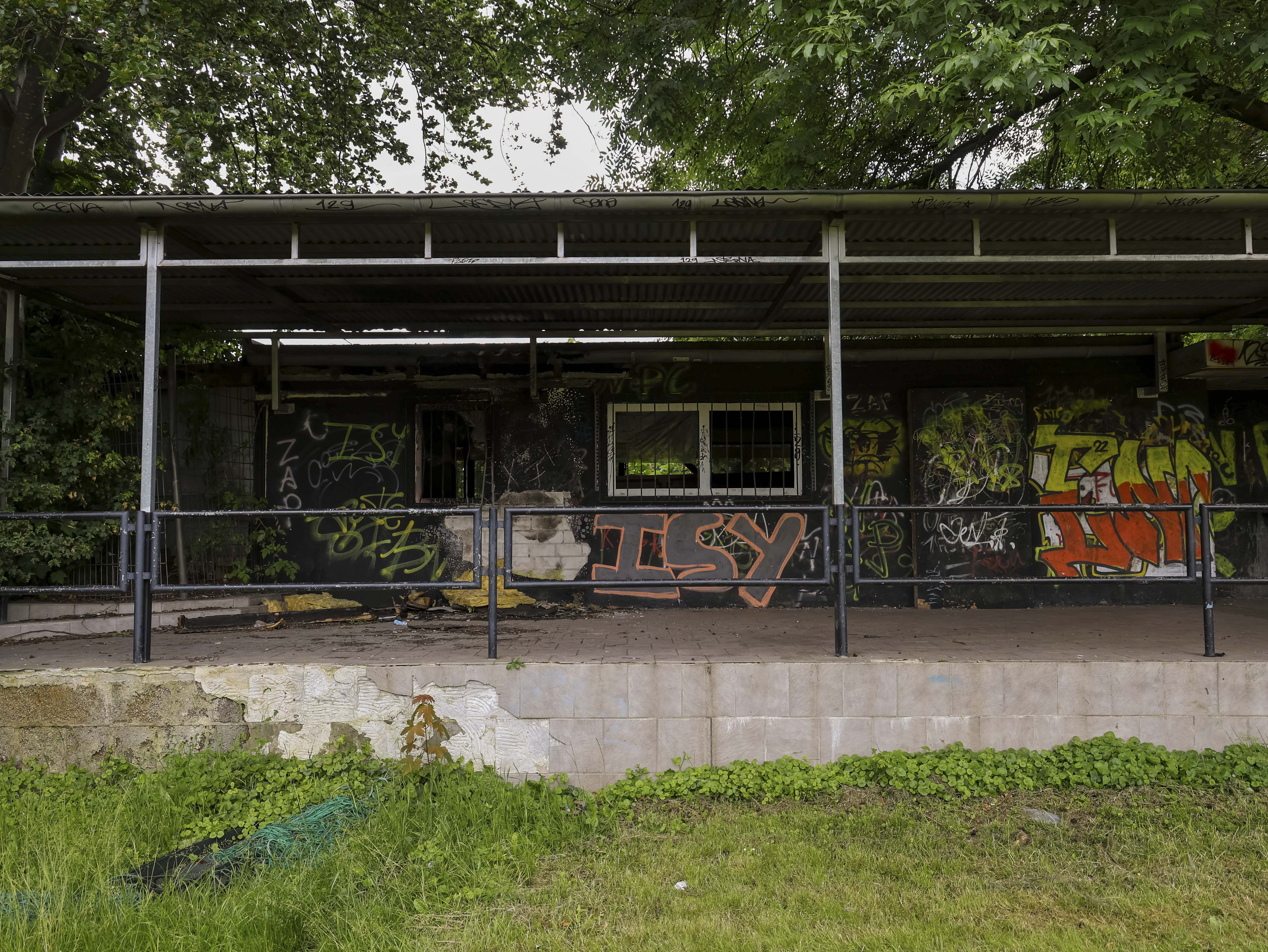 Naast de ticketbox staat het clubgebouw. Geel geschilderd, of wat daar nog van over is. Op het dak staat een URL: www.jugend-fussball-oberaussem.de. Een digitale grafsteen. De club leeft nog ergens, diep in het geheugen van het internet. Binnen hangt de deur scheef in haar hengsels. Het plafond ligt op de grond, in lange houten stroken. Een massieve kastenwand staat er nog. Graffiti overal. Gebroken ramen kijken uit op wat ooit het spelersgebied was. Dit waren de kleedkamers. Hier trokken spelers hun shirts aan voor wedstrijden in de Kreisliga D. Hier werden op dinsdagavonden trainingen besproken. Hier stonden jeugdteams op zaterdag te wachten op hun beurt. Peptalks, teleurstellingen, kleine overwinningen. Nu is er alleen puin. En stilte.