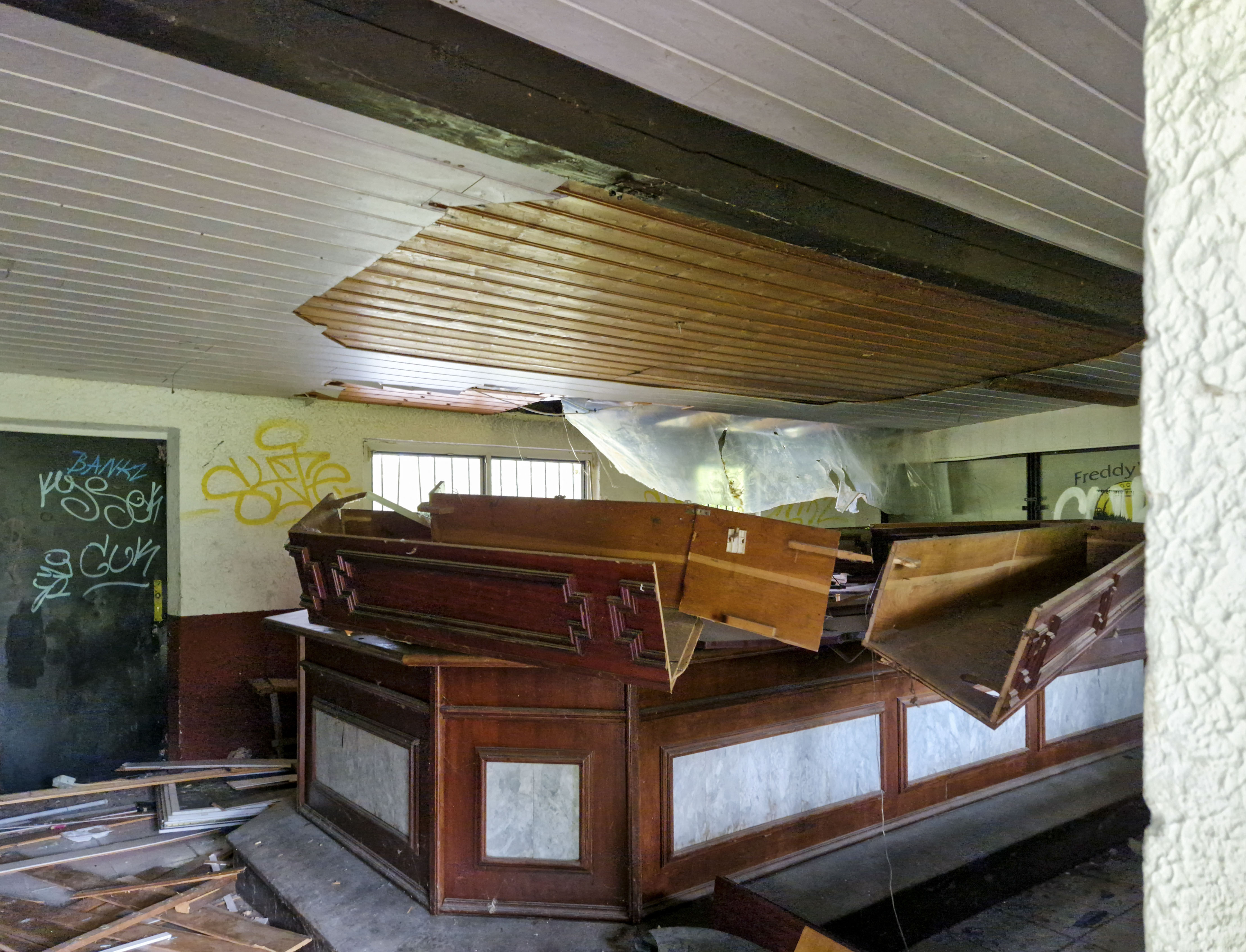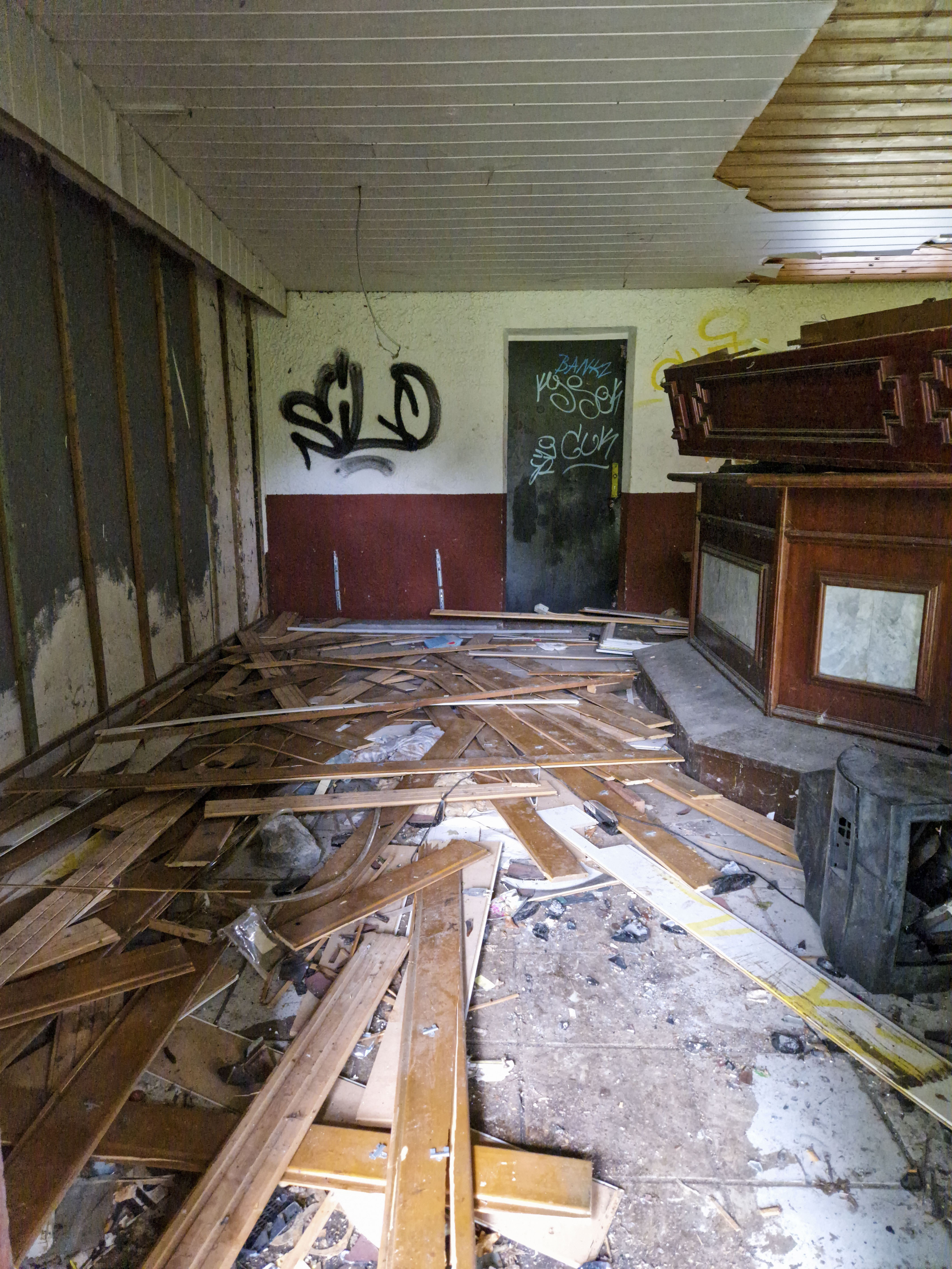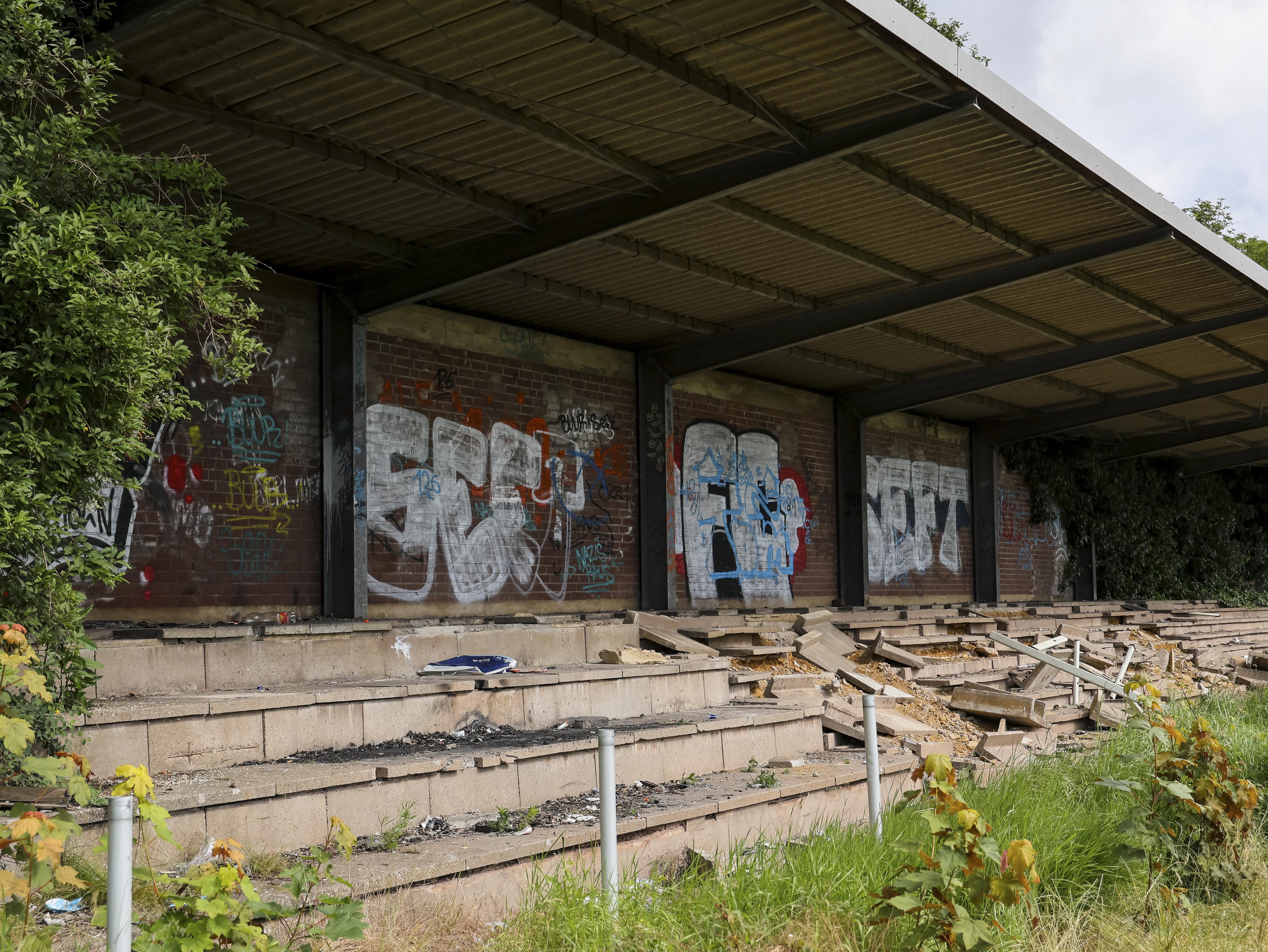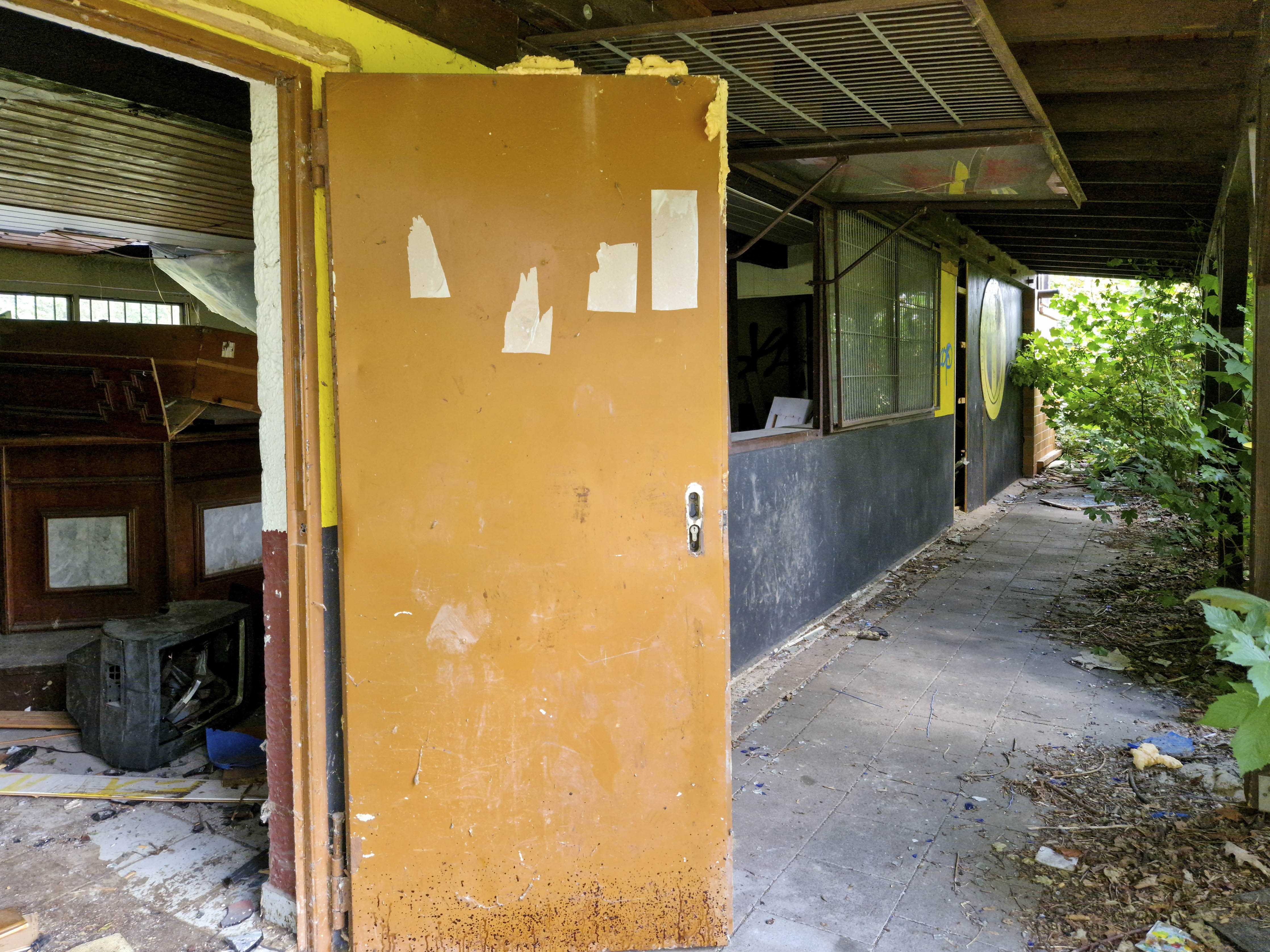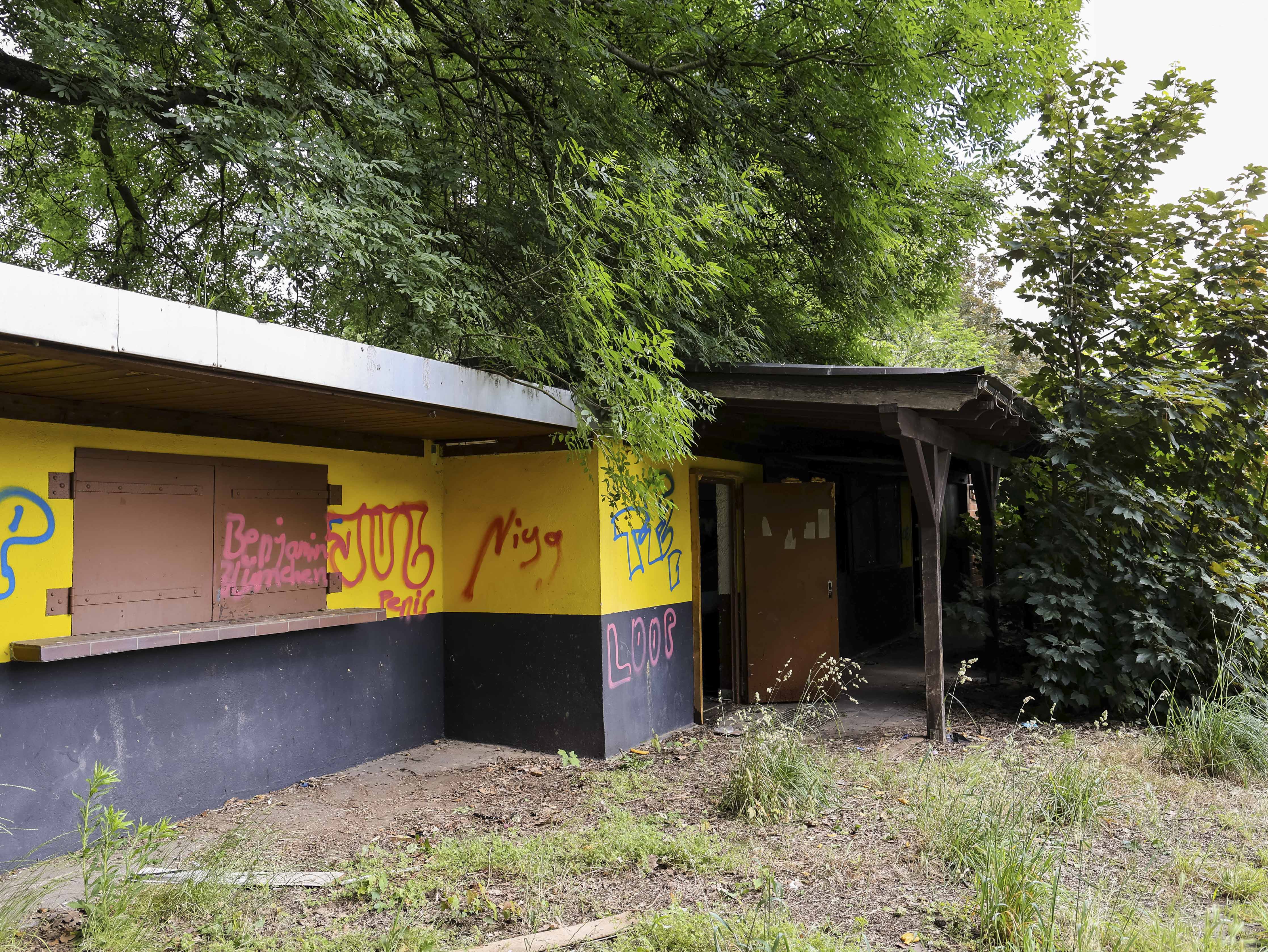 Naast de ticketbox staat het clubgebouw. Geel geschilderd, of wat daar nog van over is. Op het dak staat een URL: www.jugend-fussball-oberaussem.de. Een digitale grafsteen. De club leeft nog ergens, diep in het geheugen van het internet. Binnen hangt de deur scheef in haar hengsels. Het plafond ligt op de grond, in lange houten stroken. Een massieve kastenwand staat er nog. Graffiti overal. Gebroken ramen kijken uit op wat ooit het spelersgebied was. Dit waren de kleedkamers. Hier trokken spelers hun shirts aan voor wedstrijden in de Kreisliga D. Hier werden op dinsdagavonden trainingen besproken. Hier stonden jeugdteams op zaterdag te wachten op hun beurt. Peptalks, teleurstellingen, kleine overwinningen. Nu is er alleen puin. En stilte.
