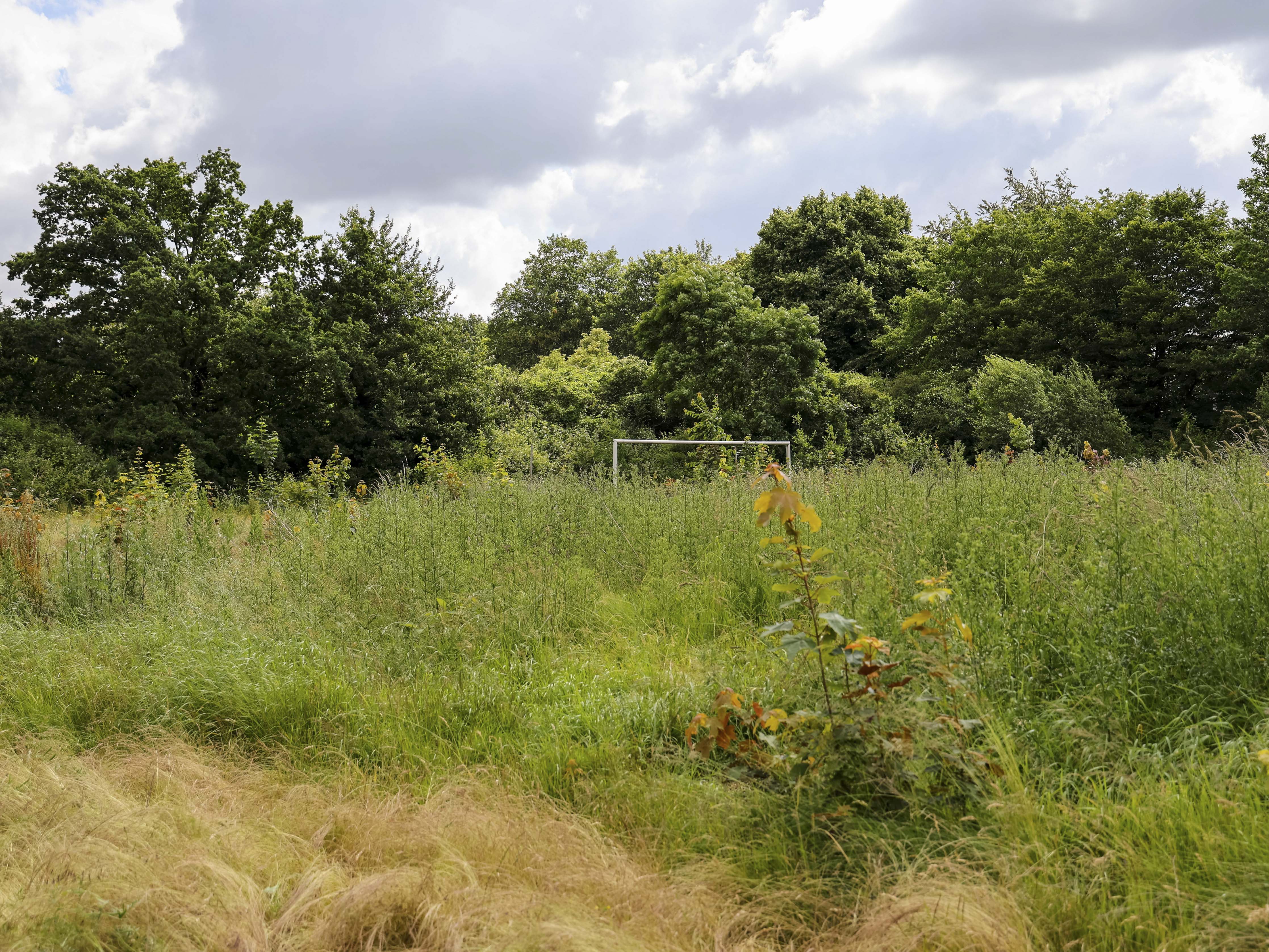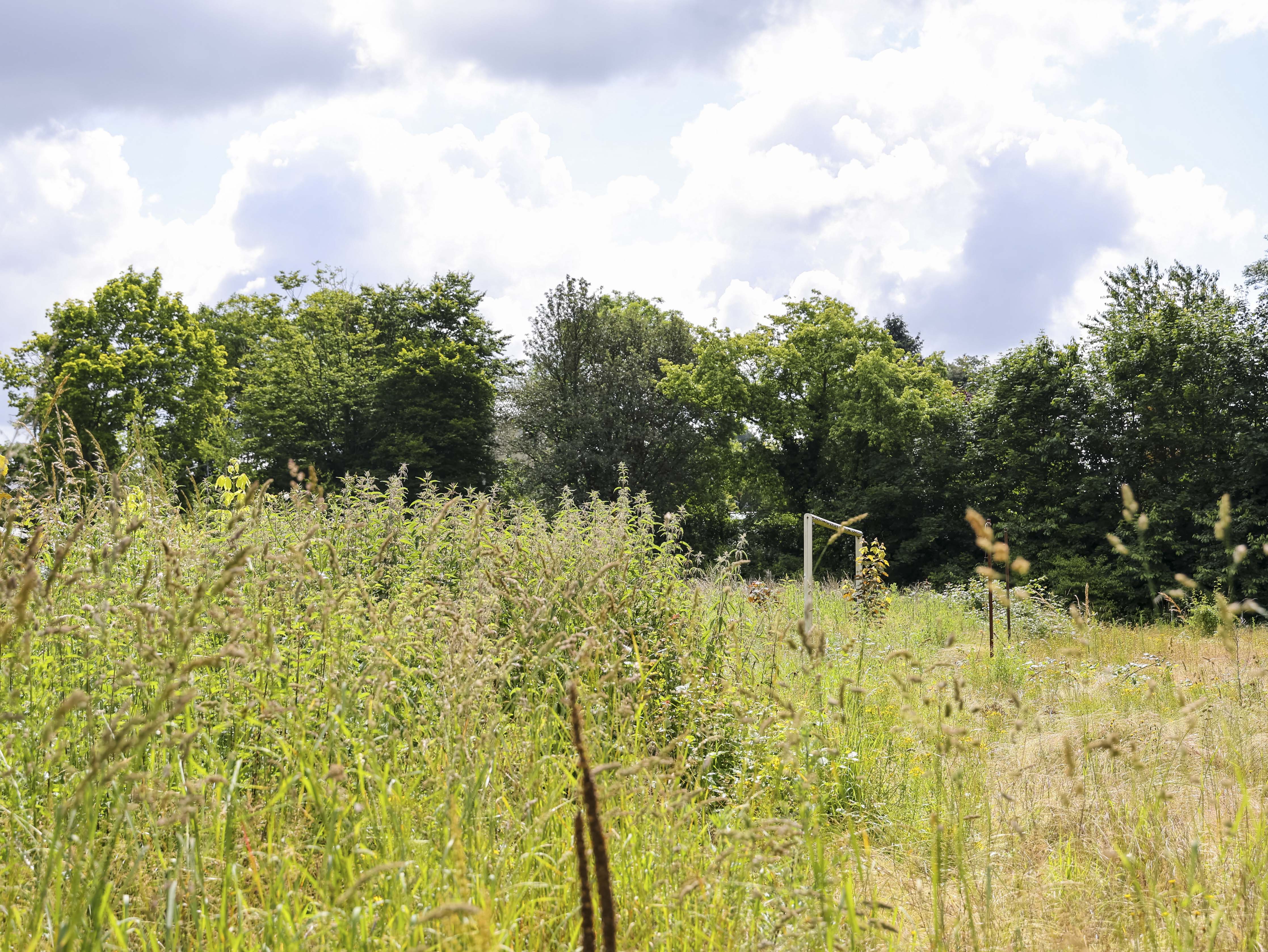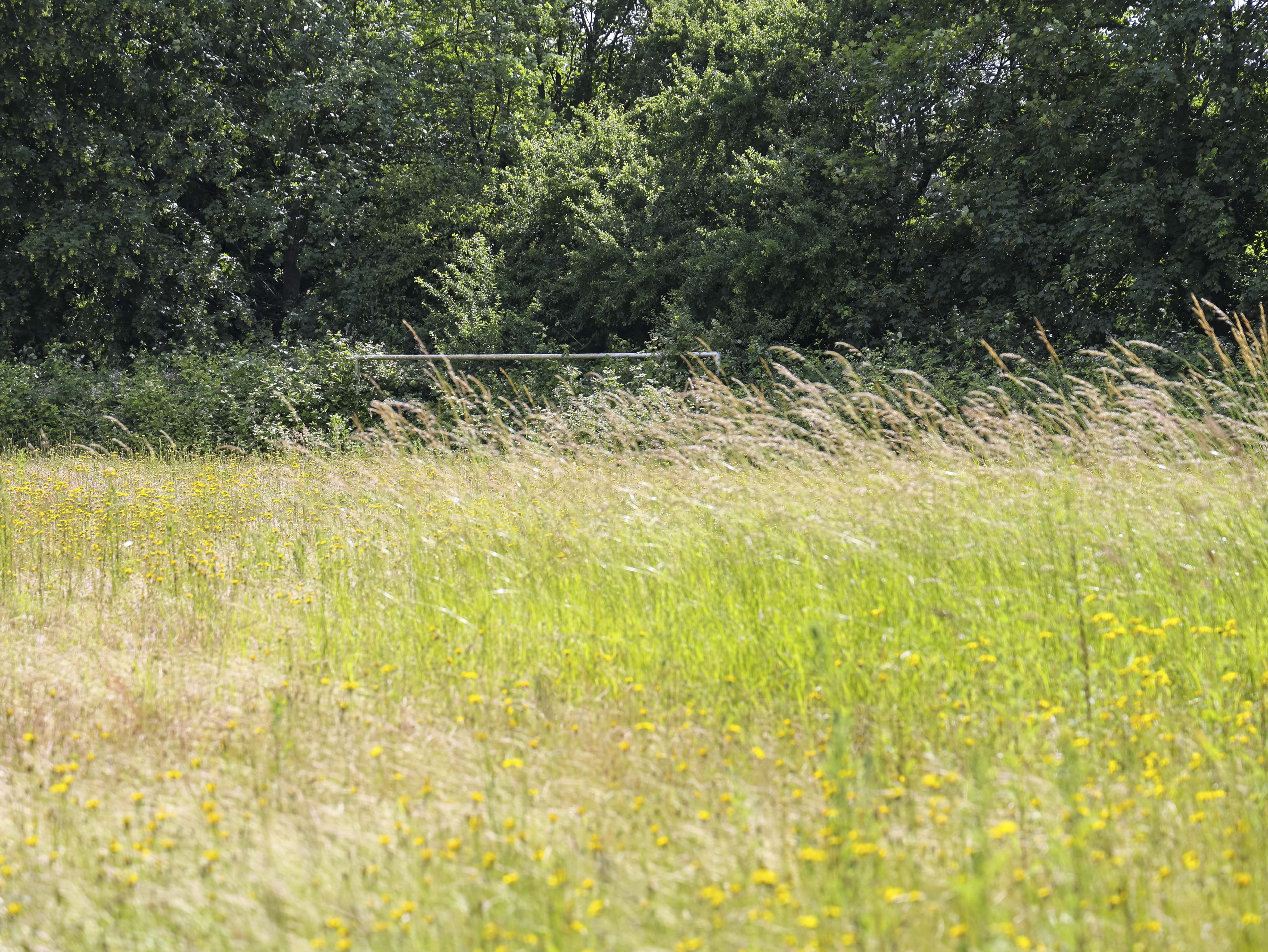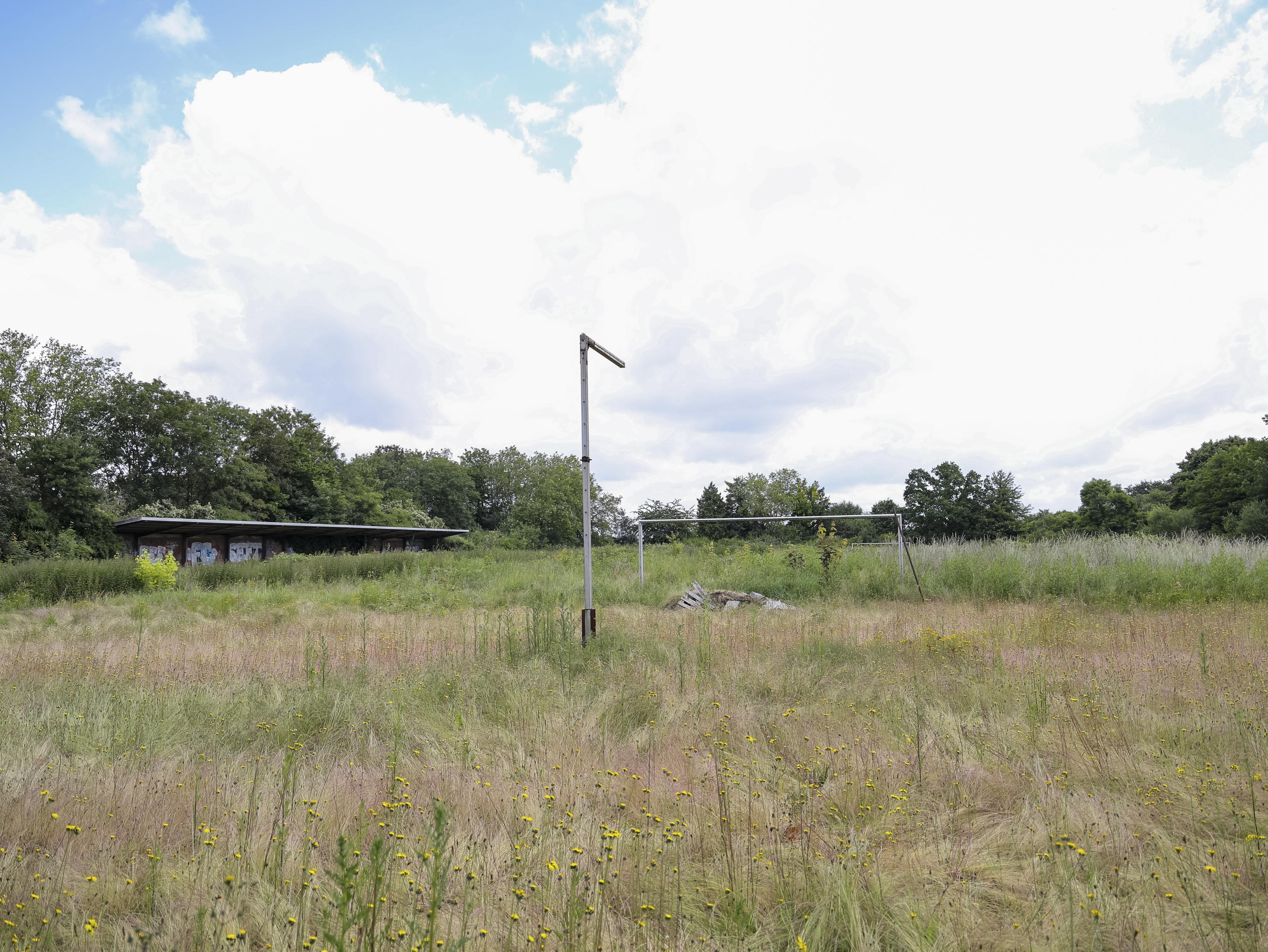 Het hoofdveld is geen veld meer. Het lijkt op een akker die ooit is ingezaaid maar nooit geoogst. Het onkruid staat zo hoog dat ik er nauwelijks overheen kijk. Gele bloemen kleuren wat ooit strak gemaaid gras was, waar spelers slidings inzetten en duels uitvochten. De natuur heeft hier geen compromis gesloten. Ze heeft gewonnen.