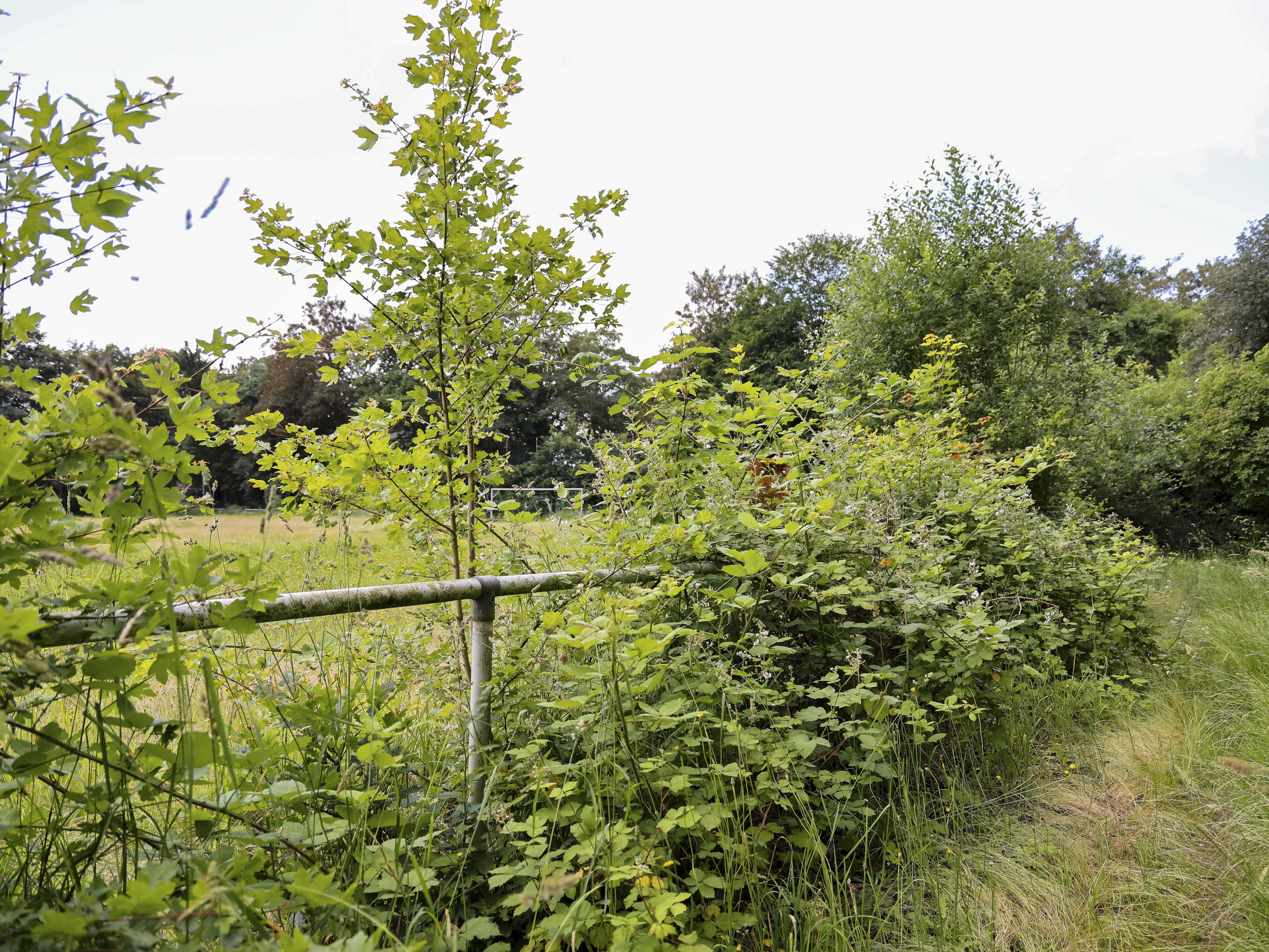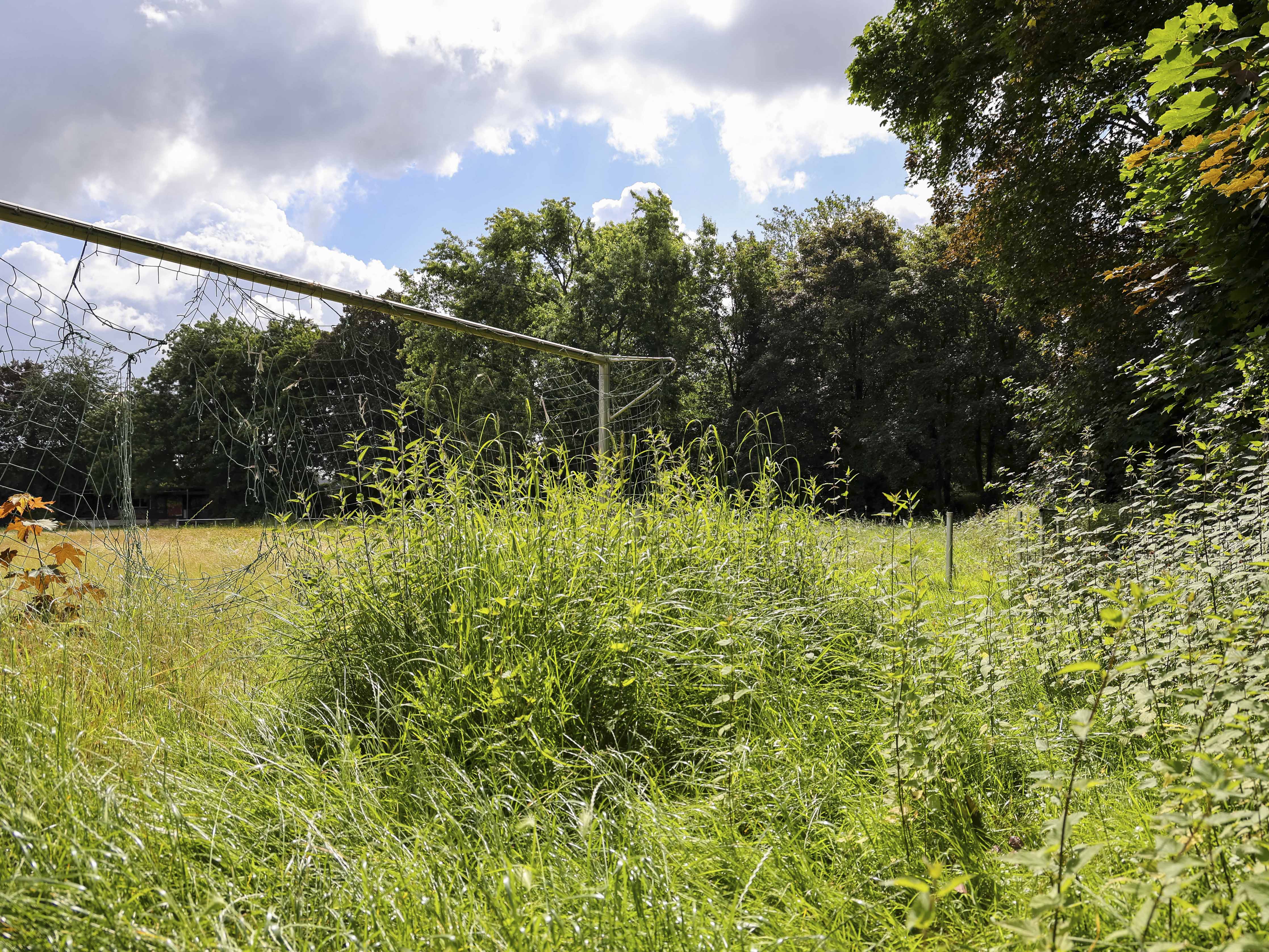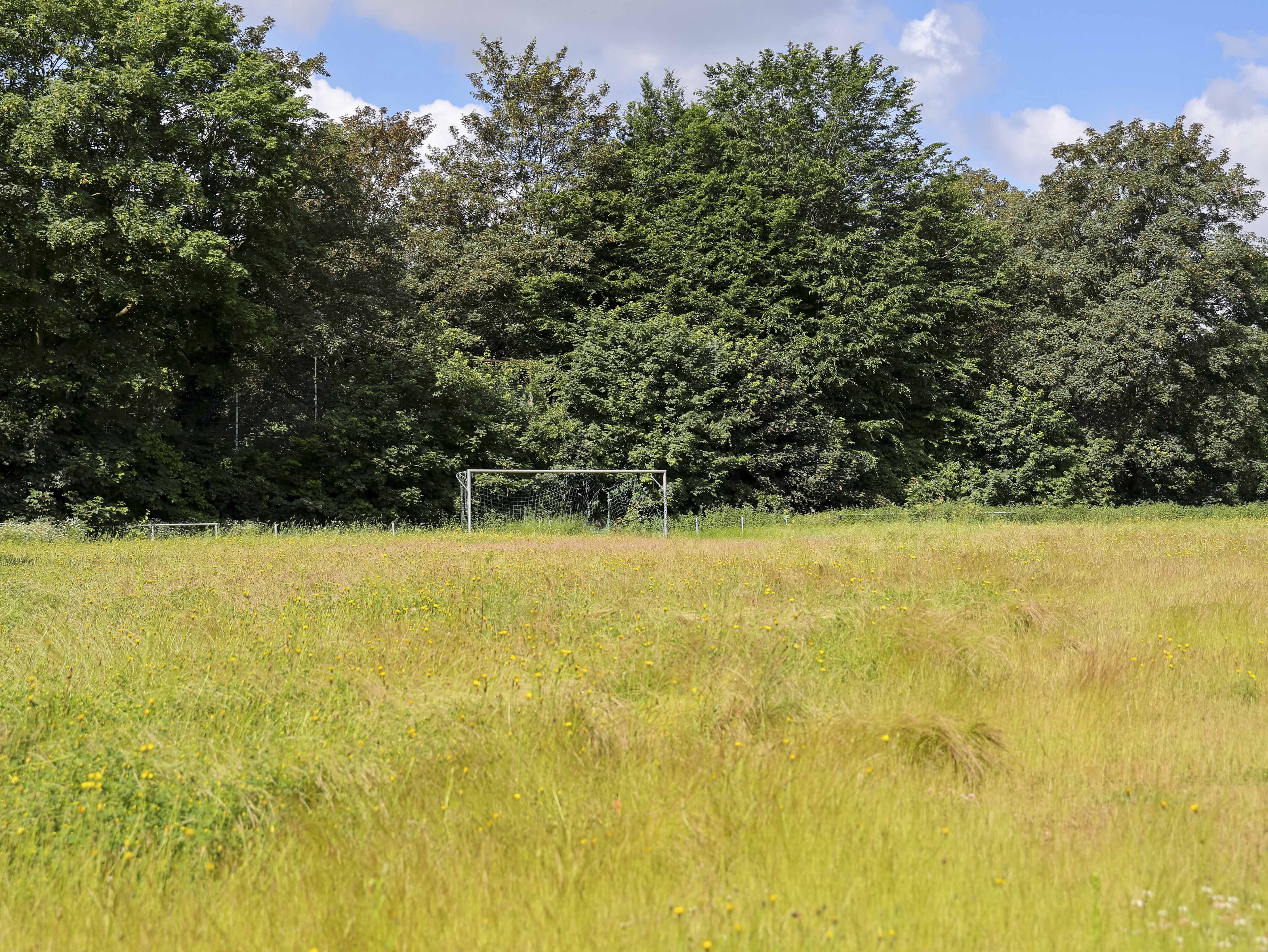 Het hoofdveld is geen veld meer. Het lijkt op een akker die ooit is ingezaaid maar nooit geoogst. Het onkruid staat zo hoog dat ik er nauwelijks overheen kijk. Gele bloemen kleuren wat ooit strak gemaaid gras was, waar spelers slidings inzetten en duels uitvochten. De natuur heeft hier geen compromis gesloten. Ze heeft gewonnen.