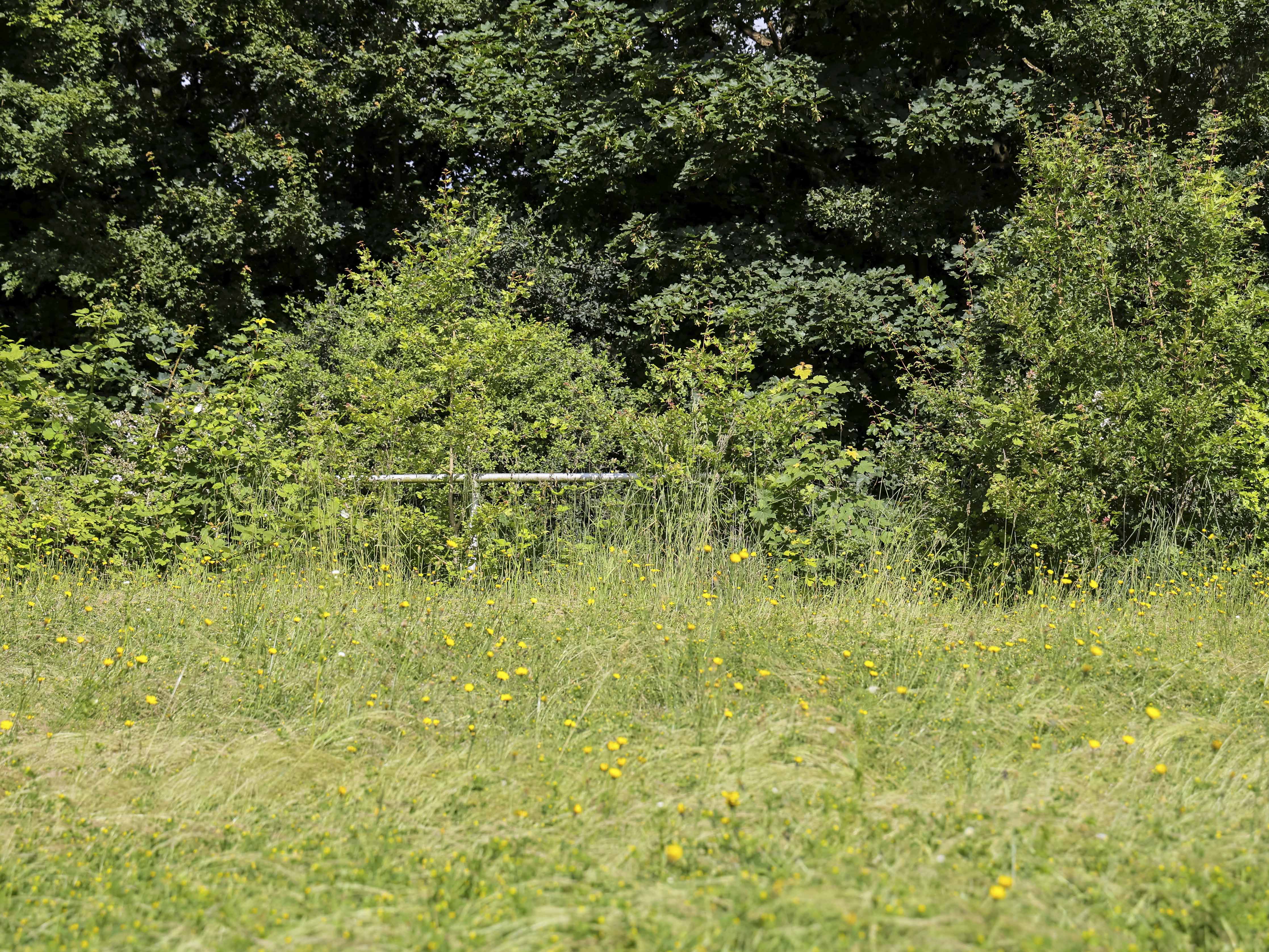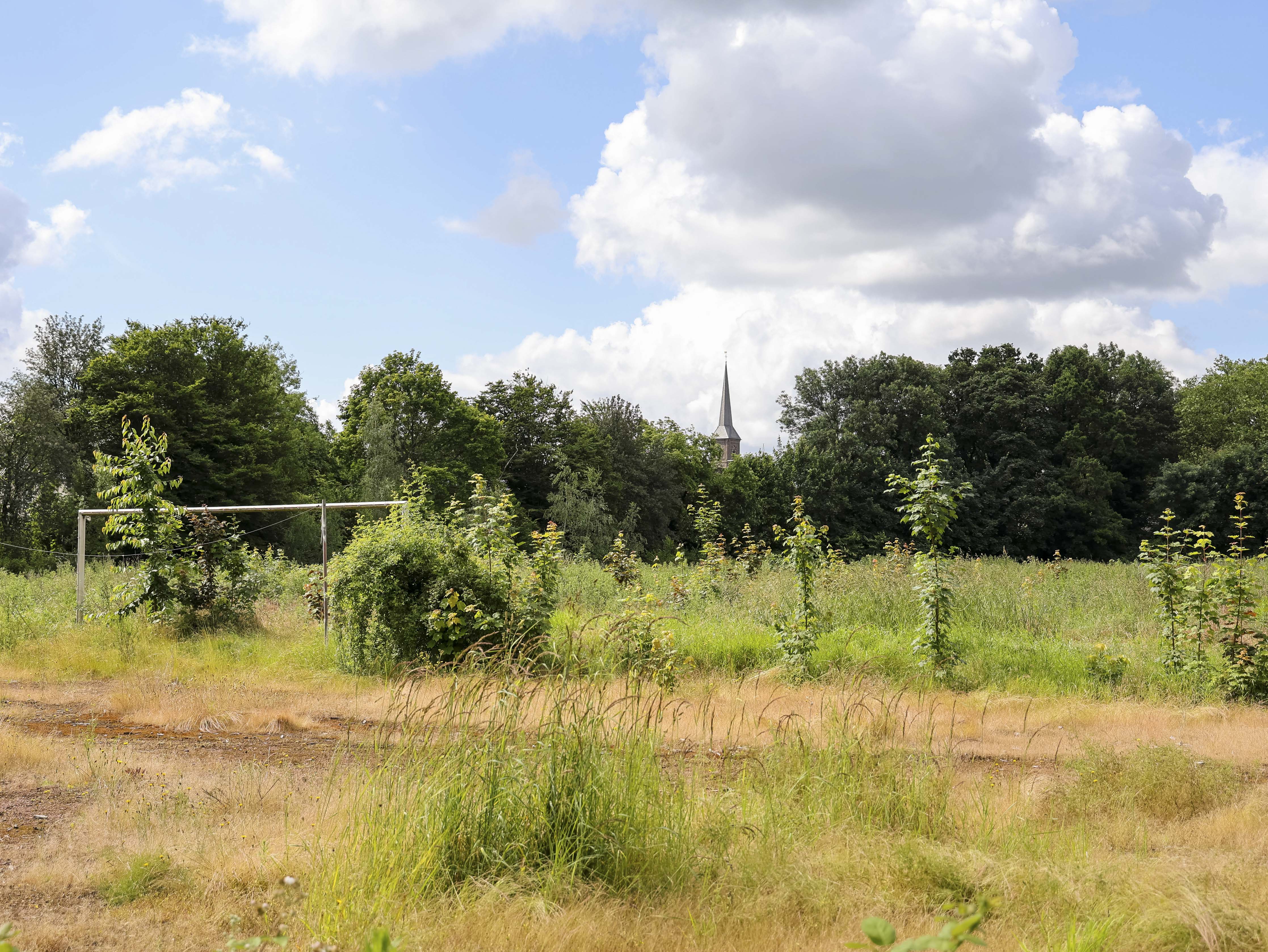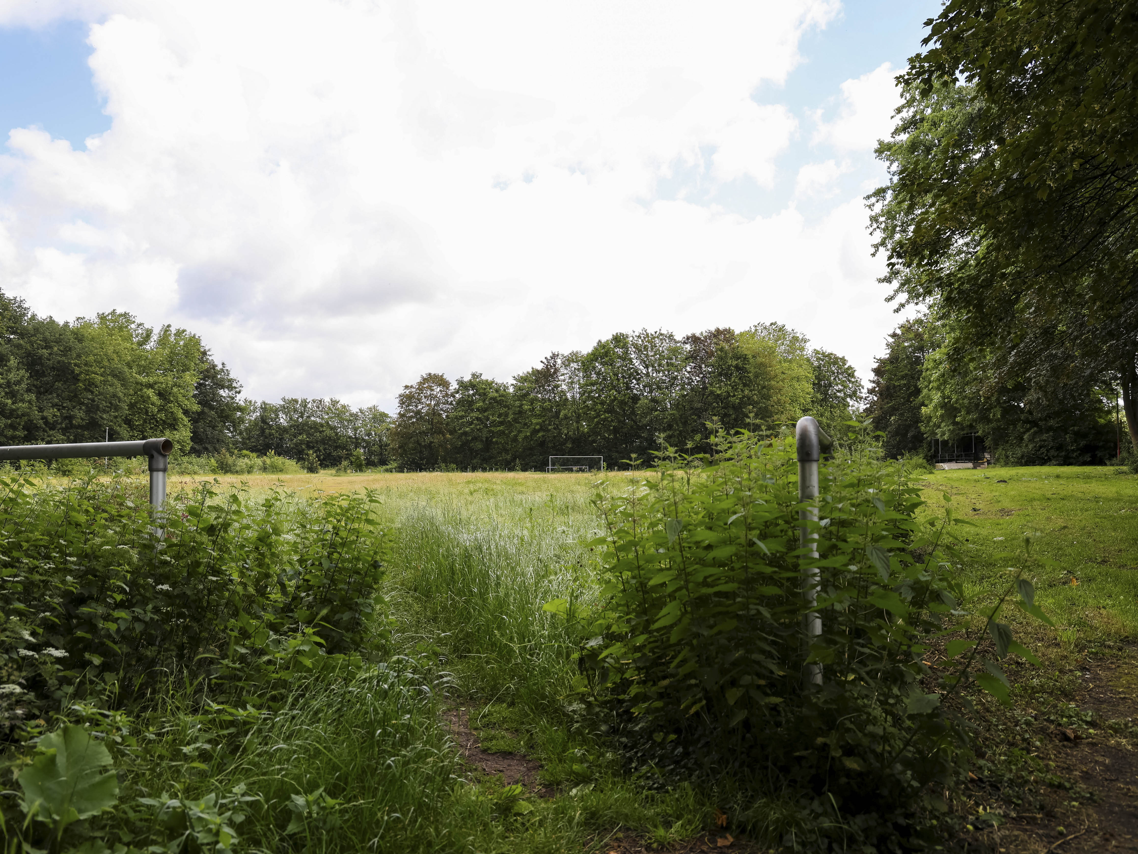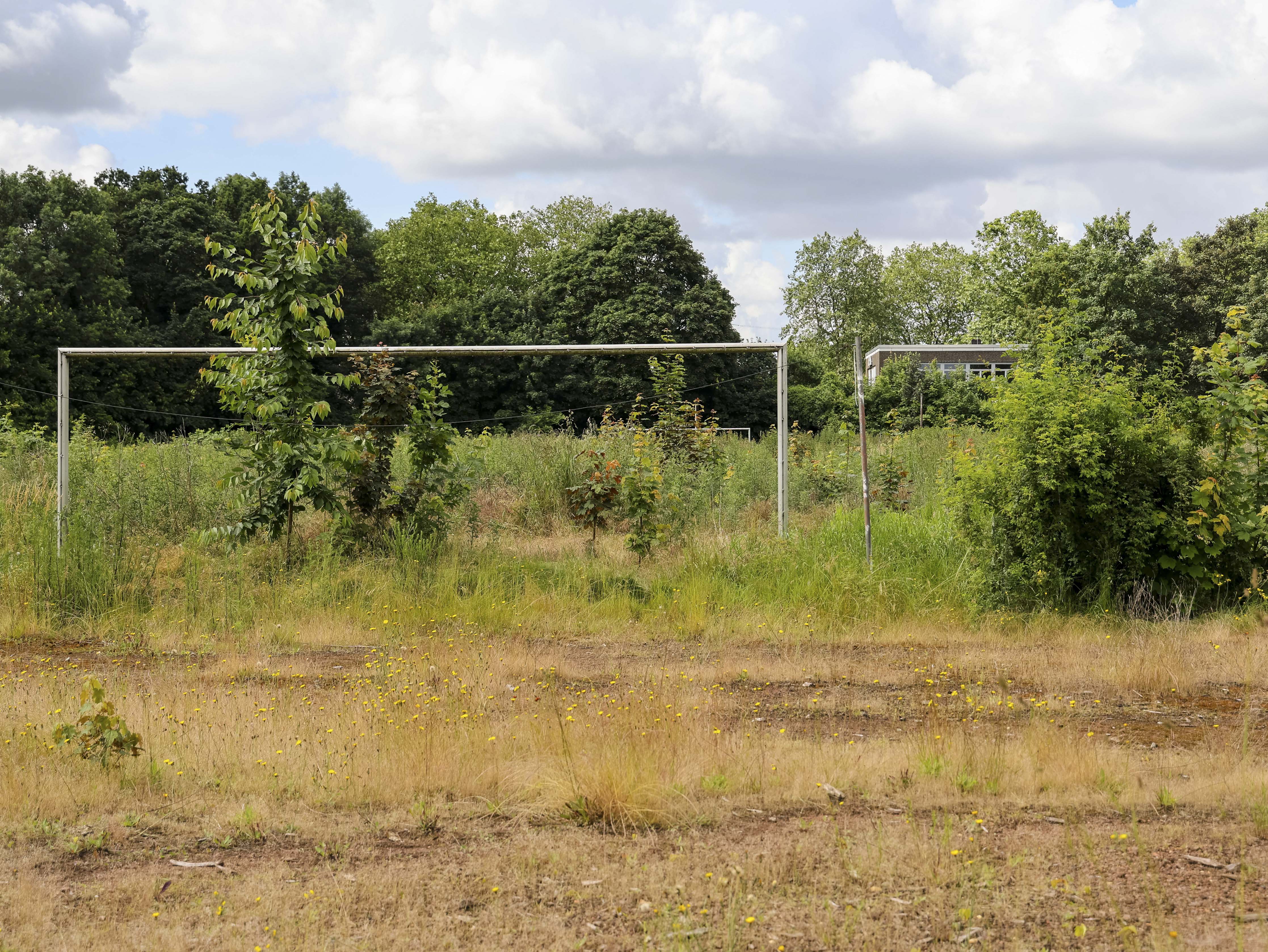 Het hoofdveld is geen veld meer. Het lijkt op een akker die ooit is ingezaaid maar nooit geoogst. Het onkruid staat zo hoog dat ik er nauwelijks overheen kijk. Gele bloemen kleuren wat ooit strak gemaaid gras was, waar spelers slidings inzetten en duels uitvochten. De natuur heeft hier geen compromis gesloten. Ze heeft gewonnen.