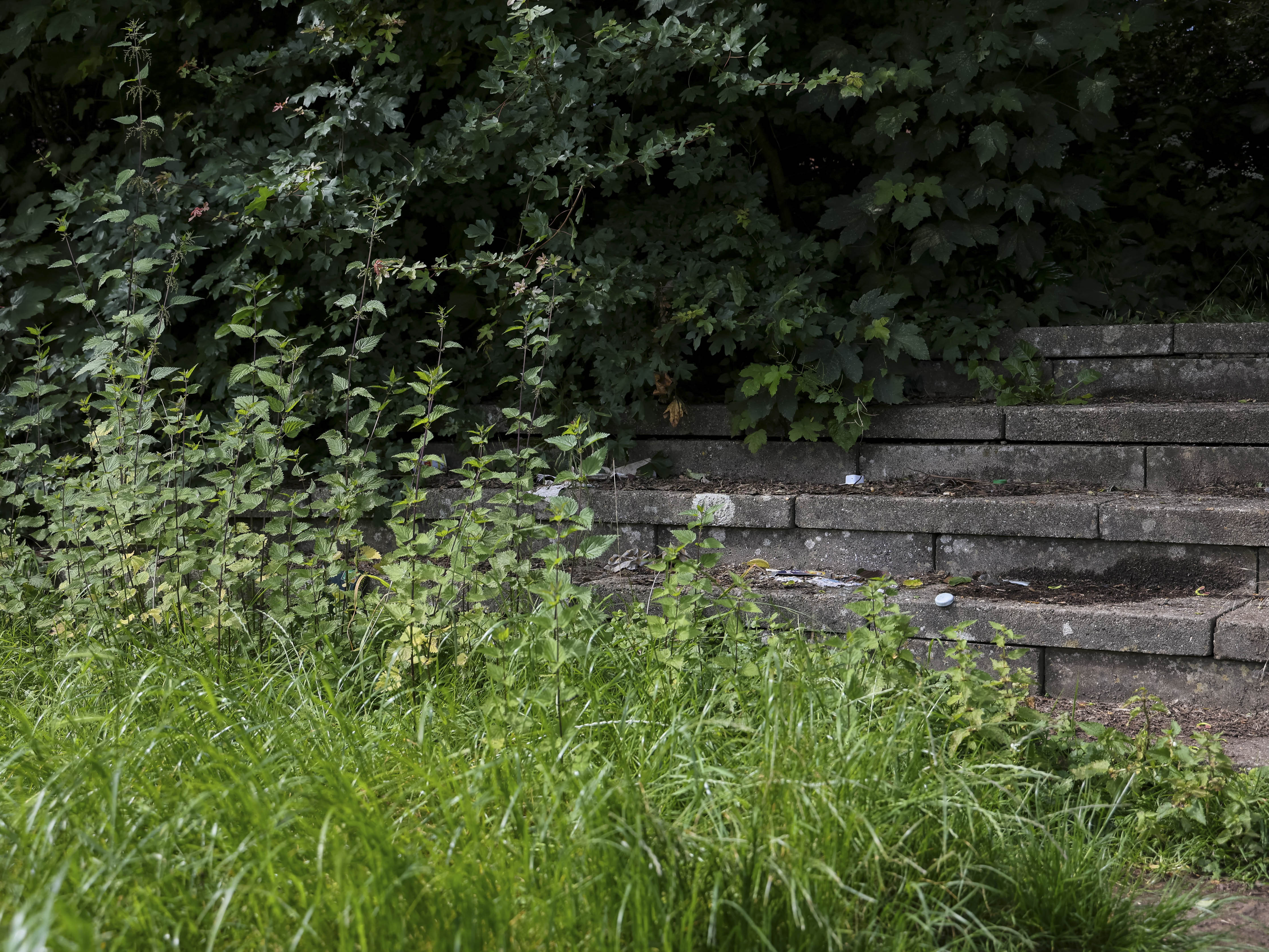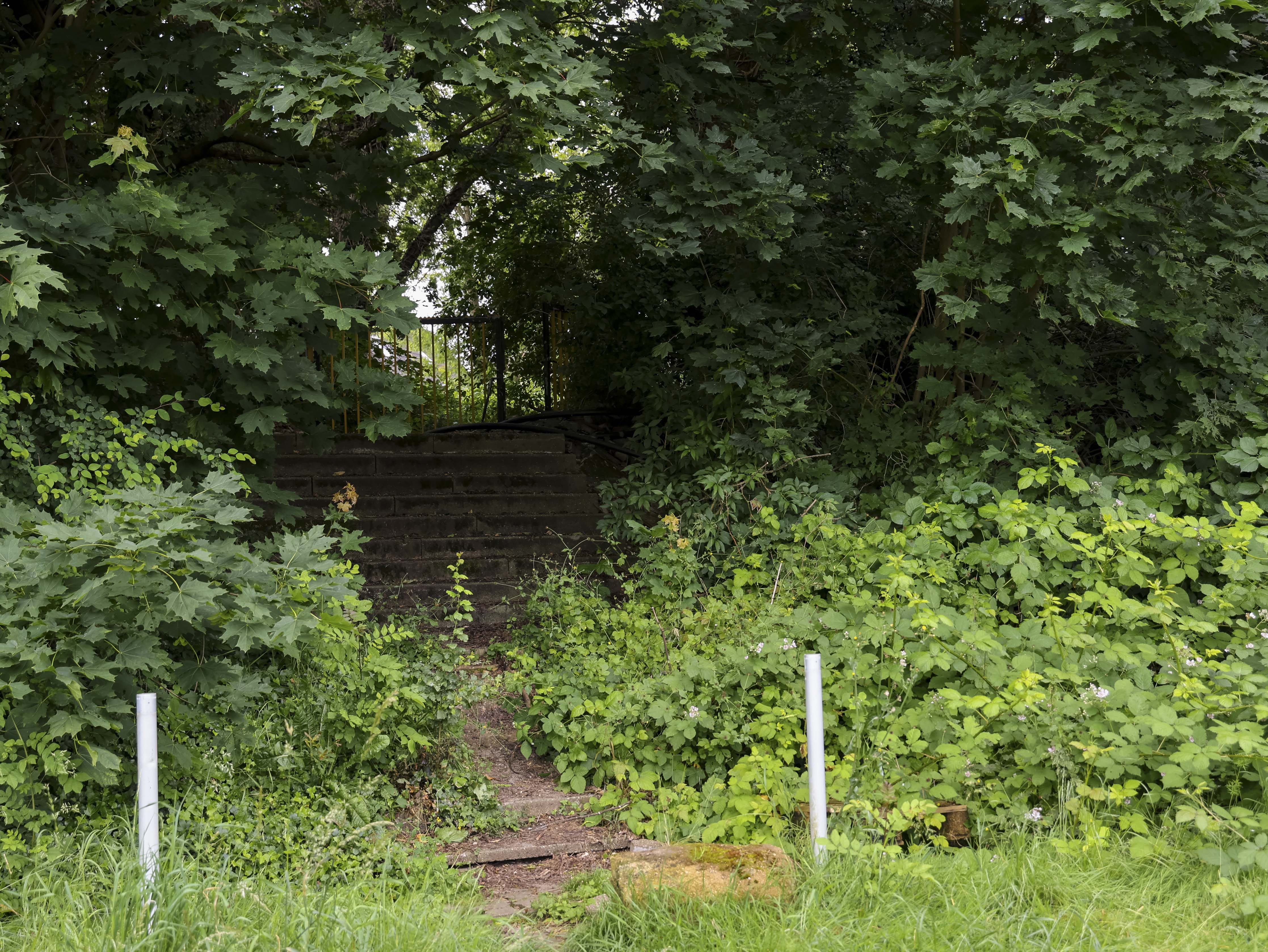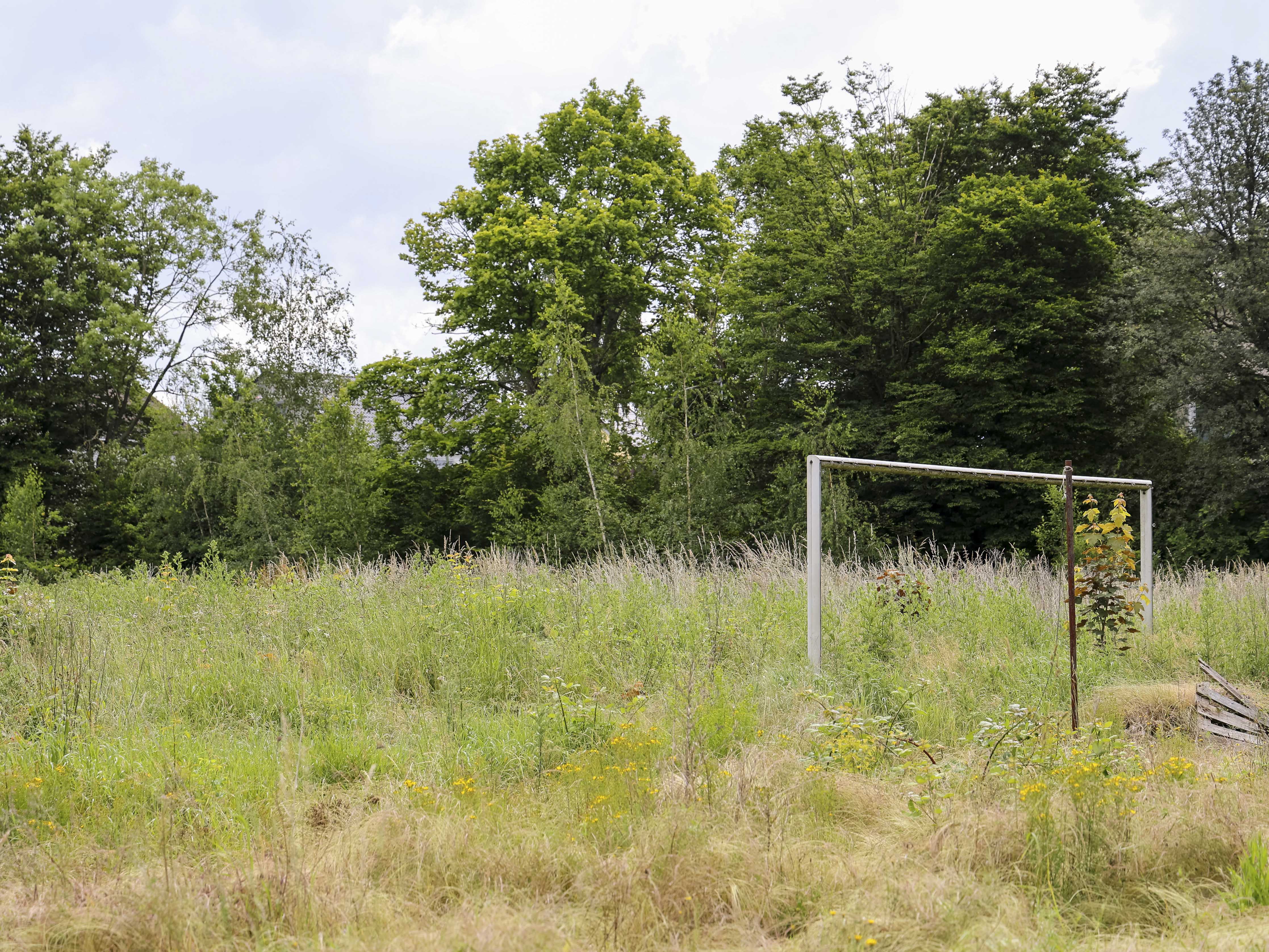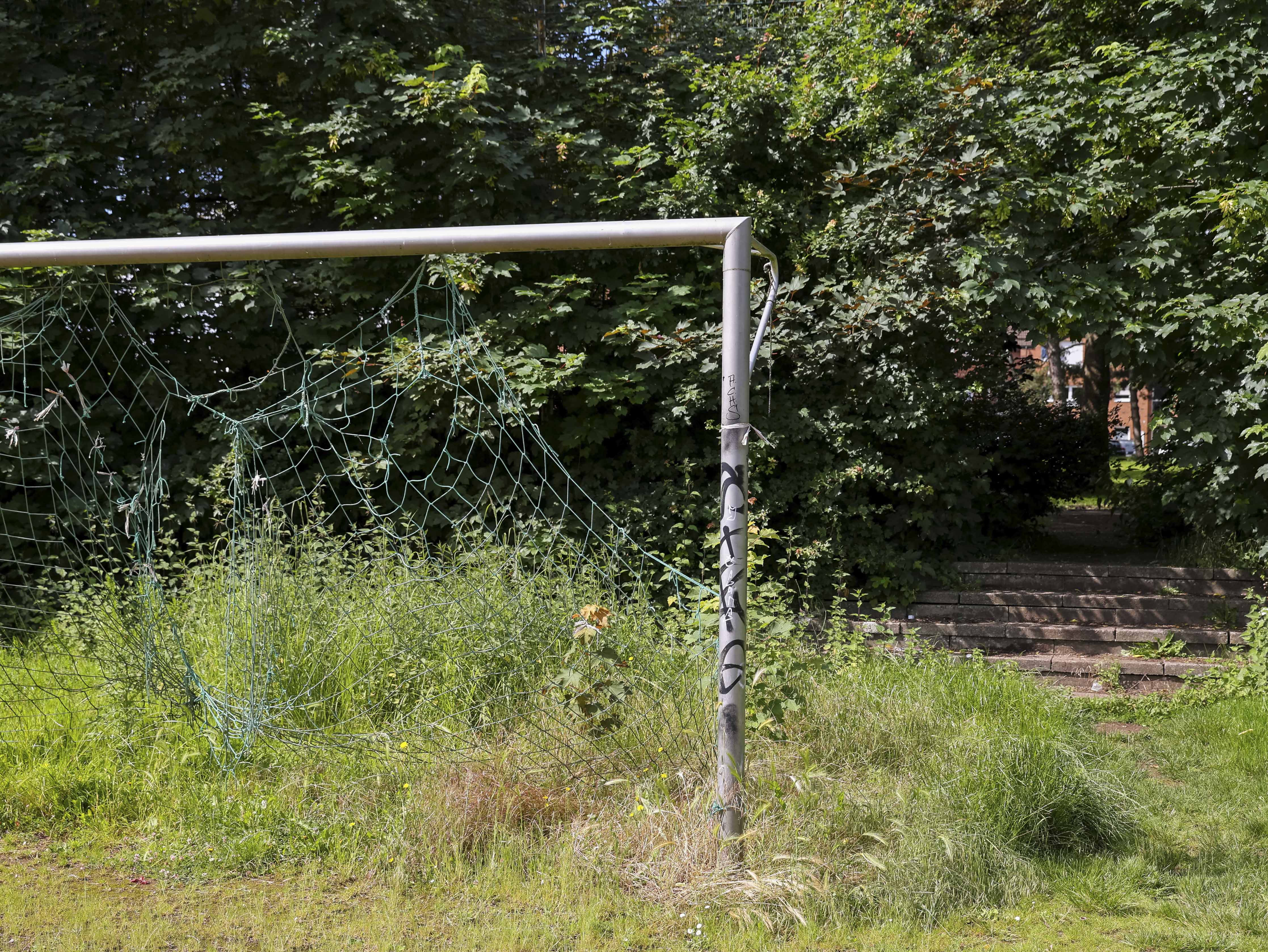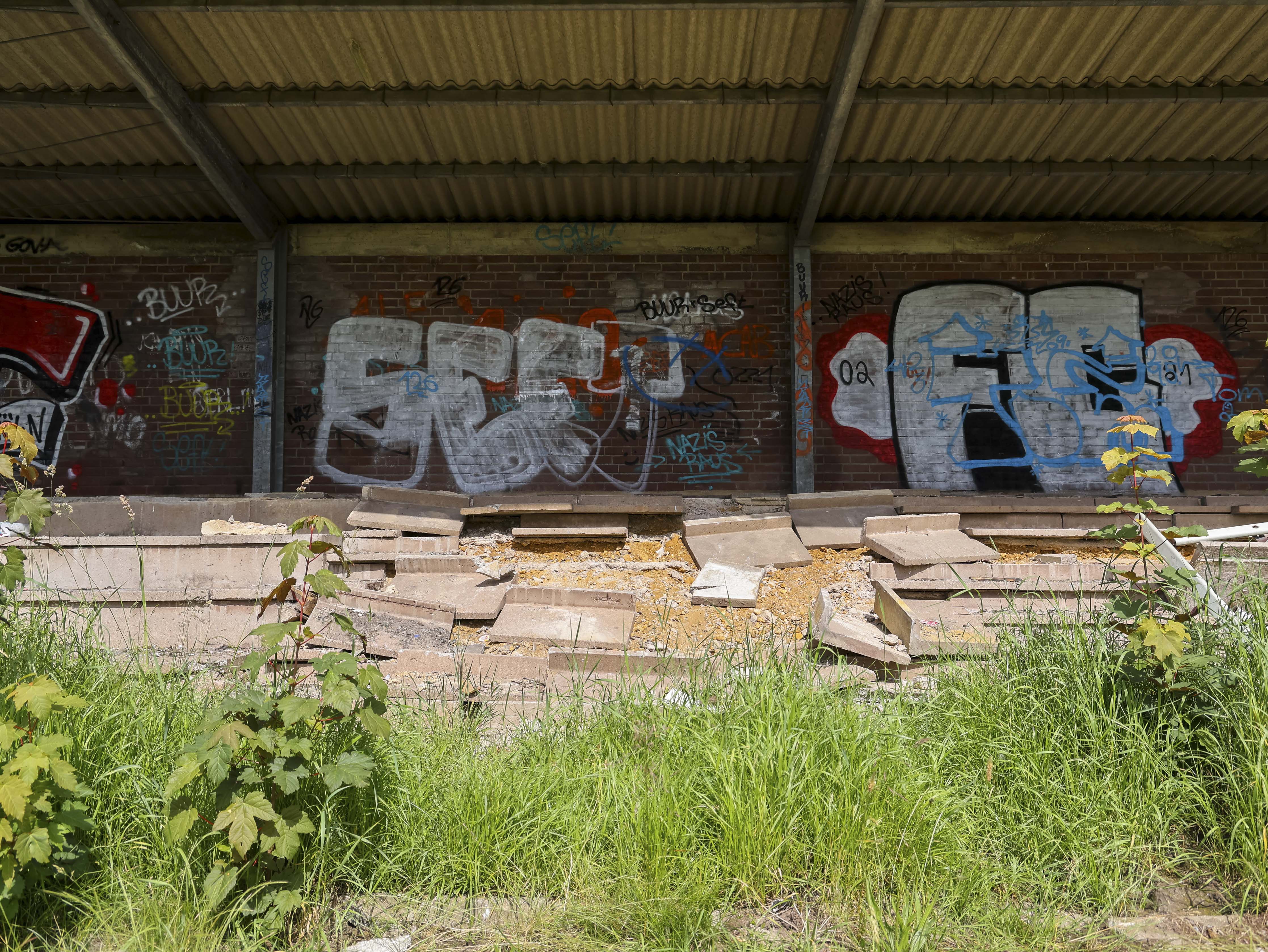 Dan zie ik de tribune. Deels ingestort. Betonnen platen lijken richting de uitgang te schuiven, alsof ook zij besloten hebben dat het hier genoeg is geweest. Sommige delen hangen gevaarlijk scheef. Insecten schieten op uit het hoge gras. Dit is hun wereld nu. Het gras staat zo hoog dat het over de spelers heen zou kijken. Wie hier voetbalt, raakt de bal kwijt voordat hij hem ziet.
