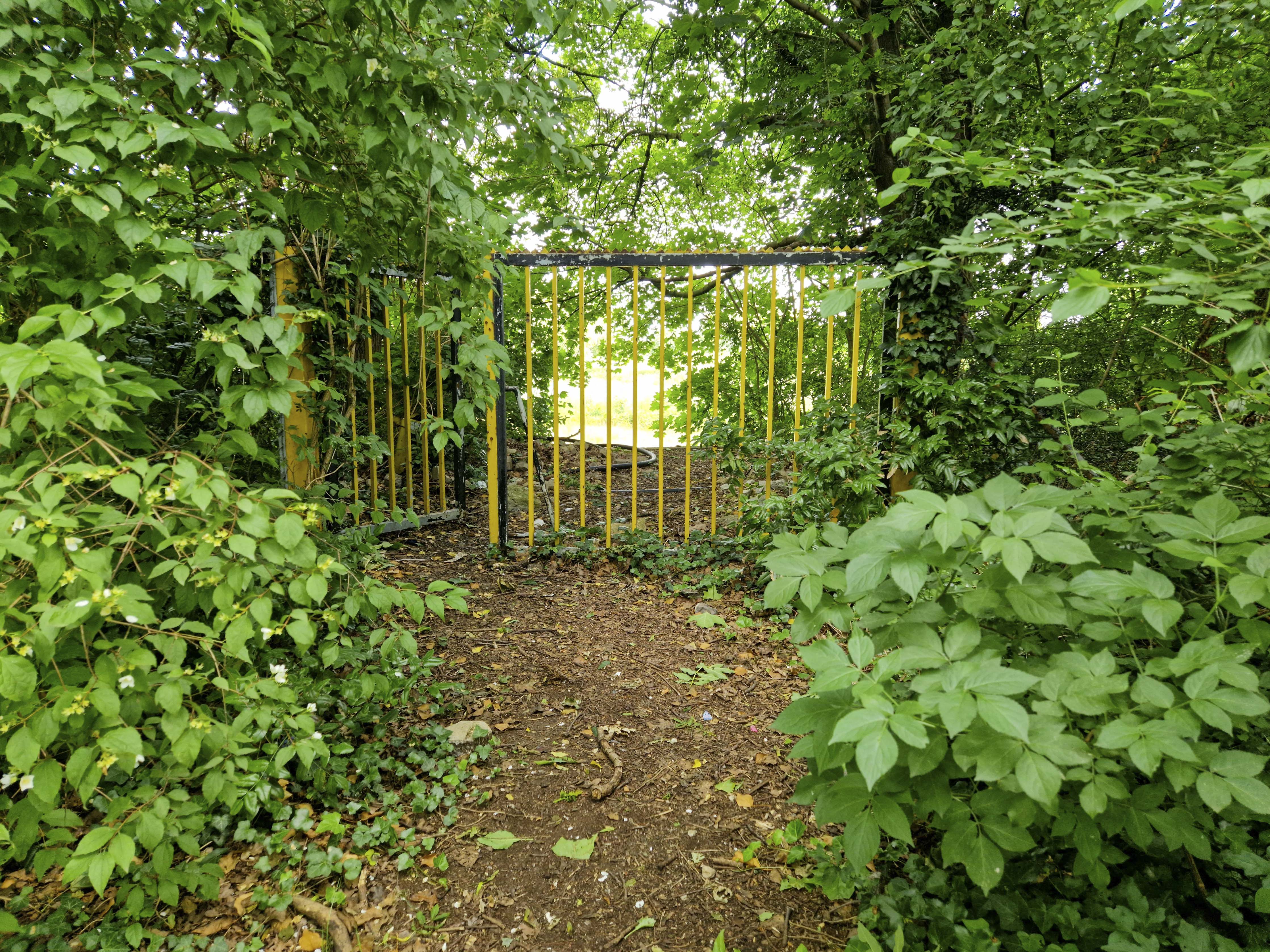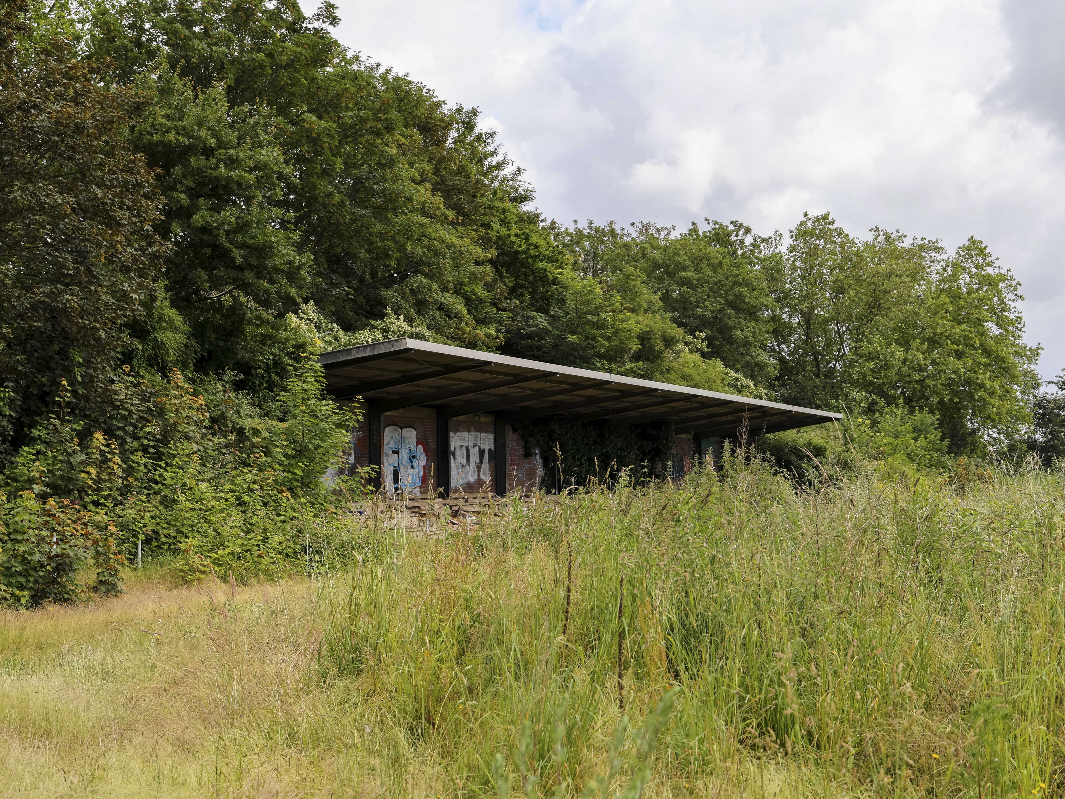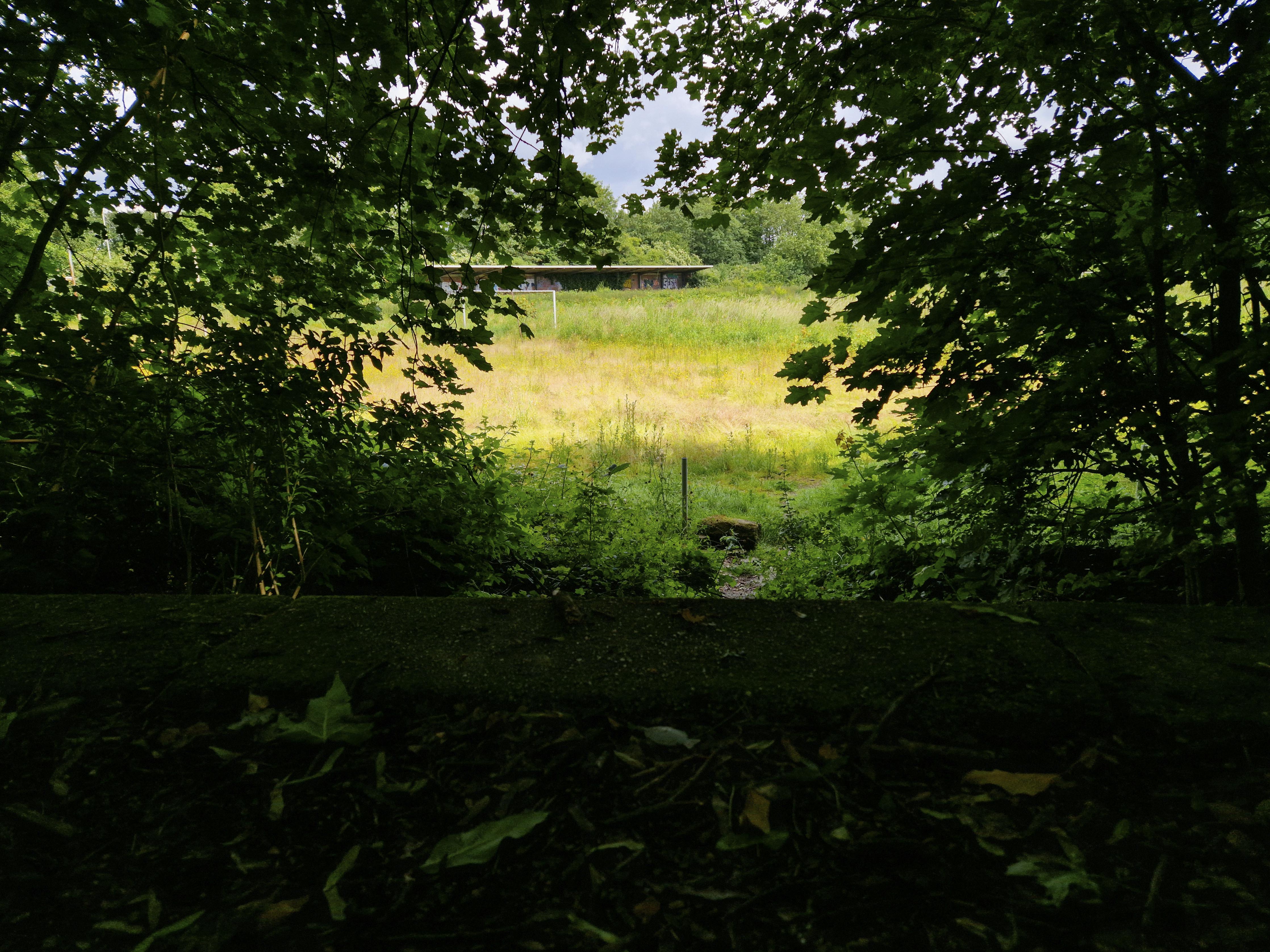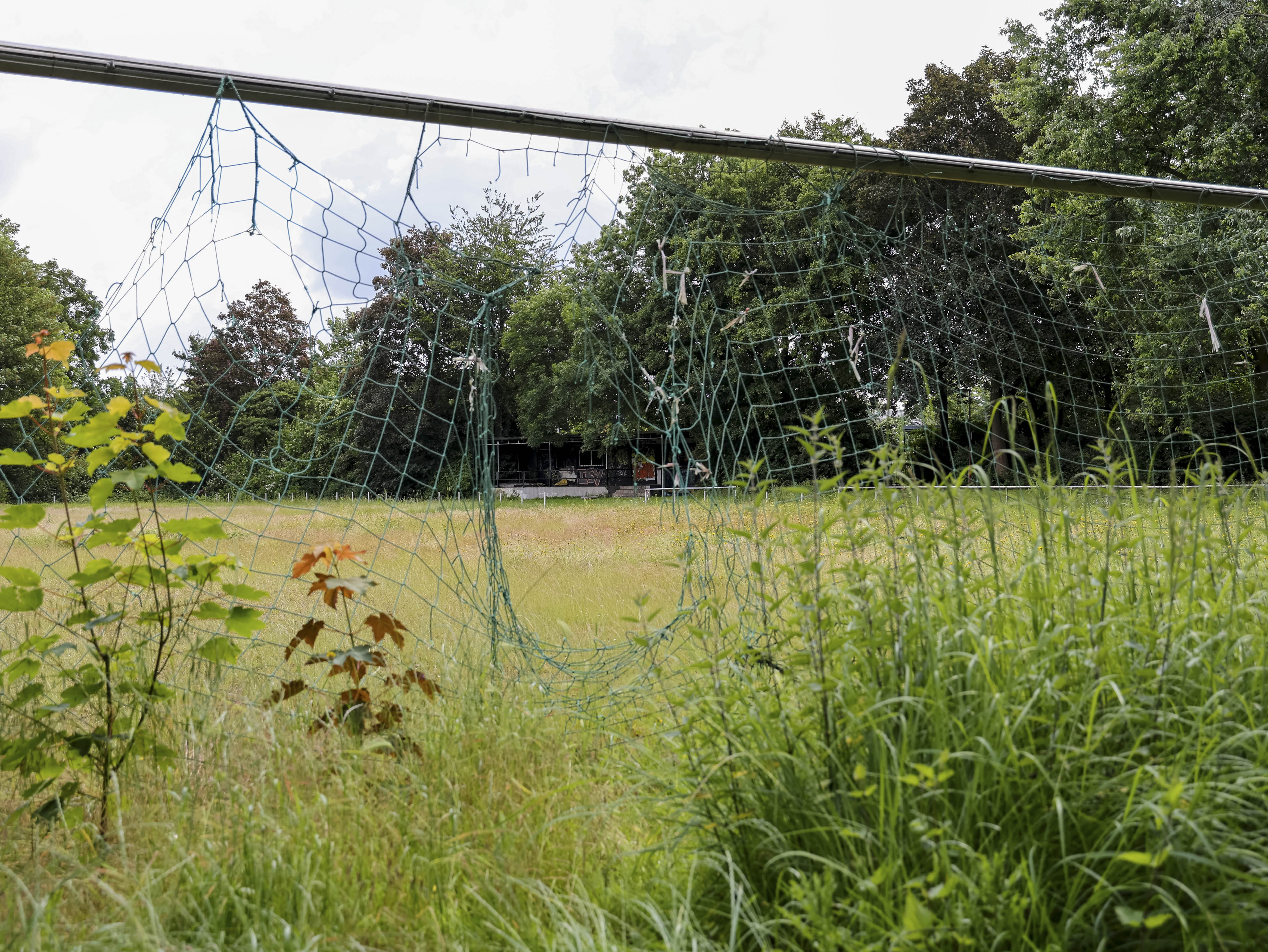 Het veld zelf ligt er verrassend goed bij. De doelen staan er nog, compleet met netten, al zitten er gaten in alsof ze jarenlang geen keeper meer hebben gezien. Hier en daar wat onkruid, ruigere plekken waar het gras zijn eigen gang gaat, maar verder oogt het verzorgd. Kort gemaaid. Bewaakt. Alsof iemand weigert dit veld volledig los te laten. Met een beetje verbeelding zou hier morgen afgetrapt kunnen worden. Ik maak snel wat foto’s. Er staan meer plekken op de planning vandaag, meer verlaten terreinen die ontdekt willen worden. Tot ik, langs de zijlijn, iets zie wat ik hier niet had verwacht.
