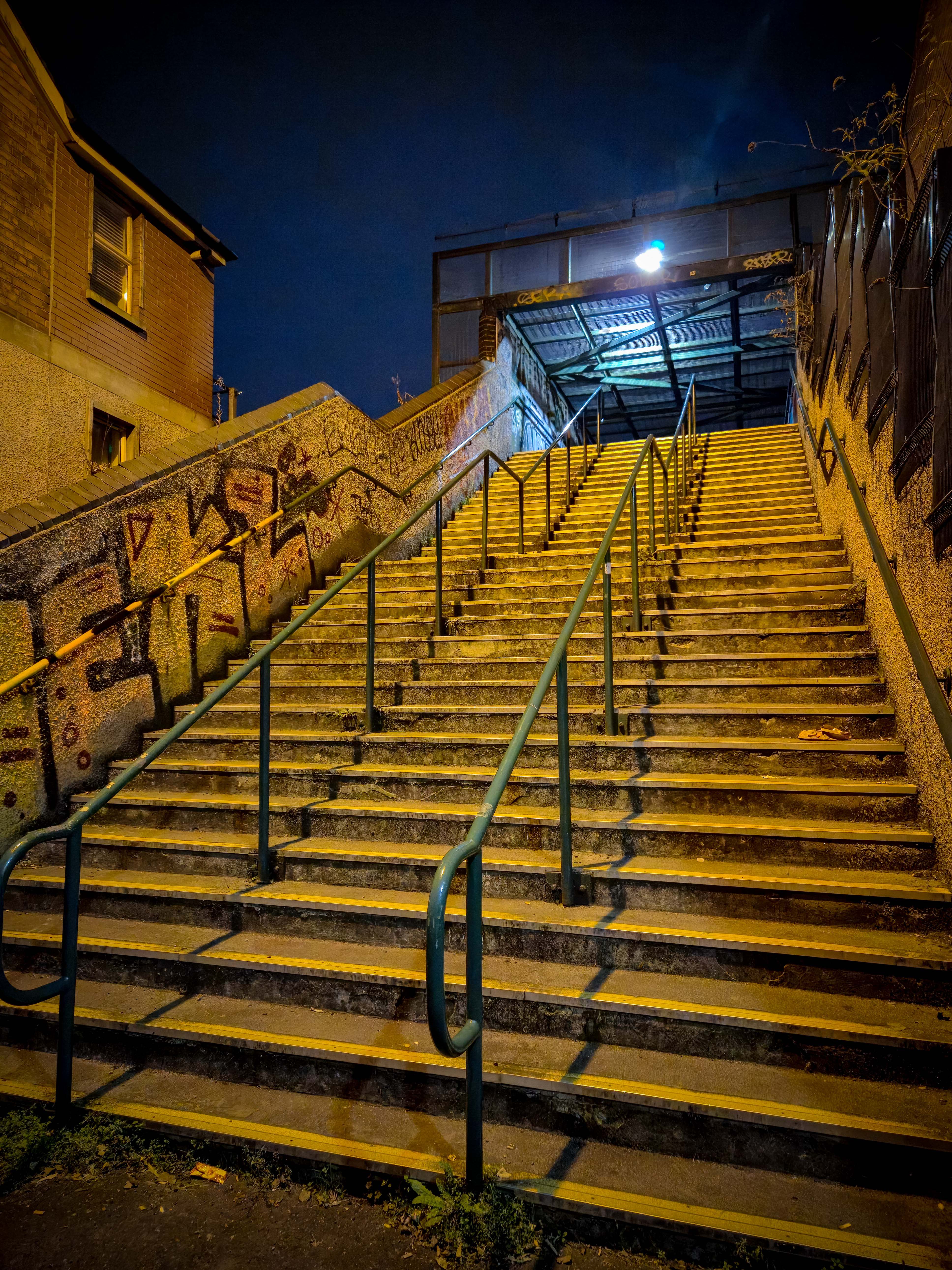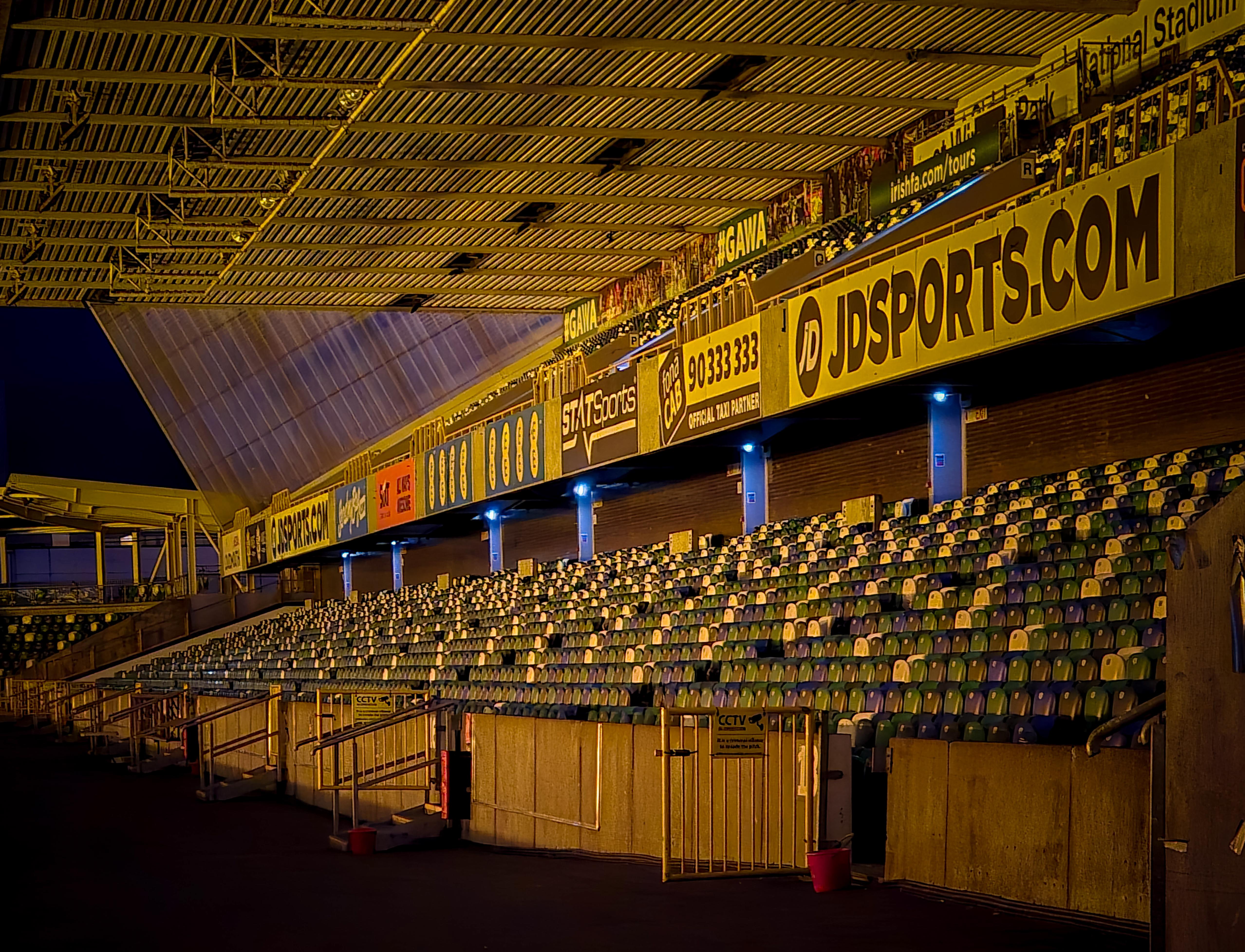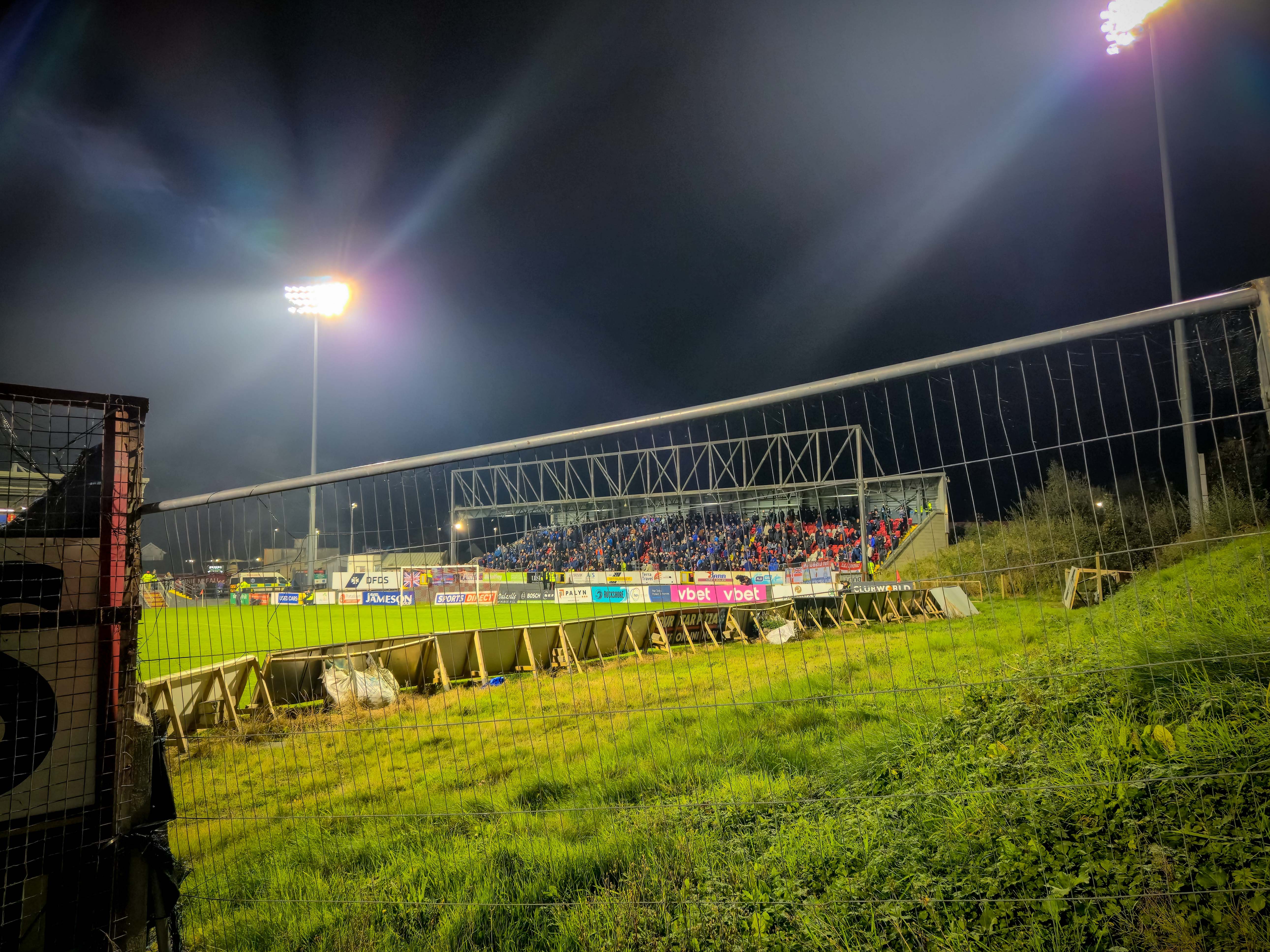 Later die dag neem ik met mijn groundhopmaatjes de trein naar Portadown. De coupé is beslagen, de ramen tonen een stad die langzaam achter ons verdwijnt. Linfield speelt uit, en wij reizen mee. Shamrock Park is gerenoveerd, strak en netjes, behalve één tribune. Afgekeurd, verlaten, ontdaan van haar stoeltjes. Een skelet van beton dat weigert te verdwijnen. Ik draai mijn rug naar de wedstrijd en kijk naar haar. Elke scheur is een herinnering, elke afbladderende verf een echo van een lied dat hier ooit werd gezongen. Ze heeft alles gezien: triomfen, tranen, kinderen die voor het eerst over de reling keken. Nu mag ze niet meer mee, maar ze blijft kijken. En ik weet: dit is waarom ik van stadions hou. Niet om comfort, niet om perfectie, maar om ziel.