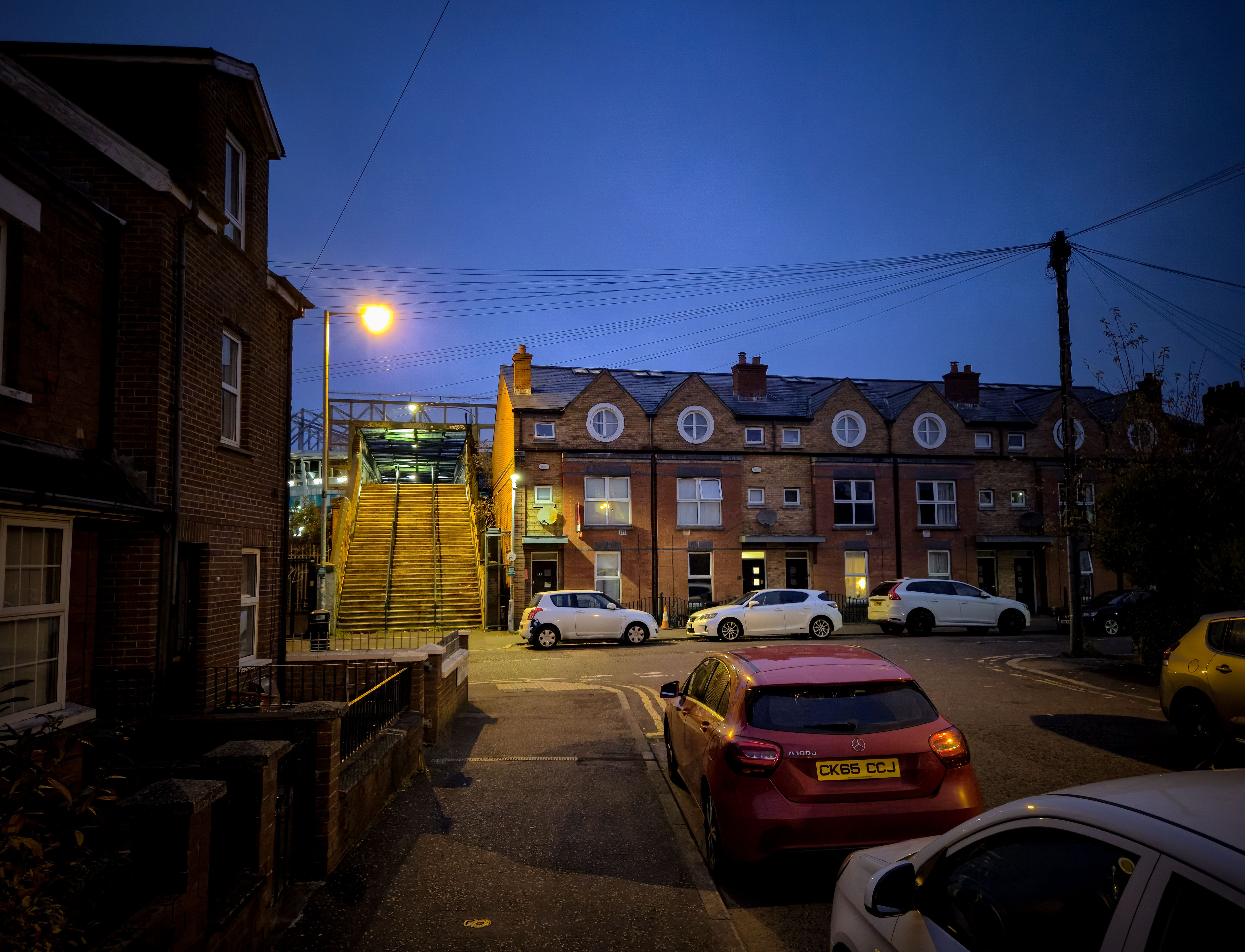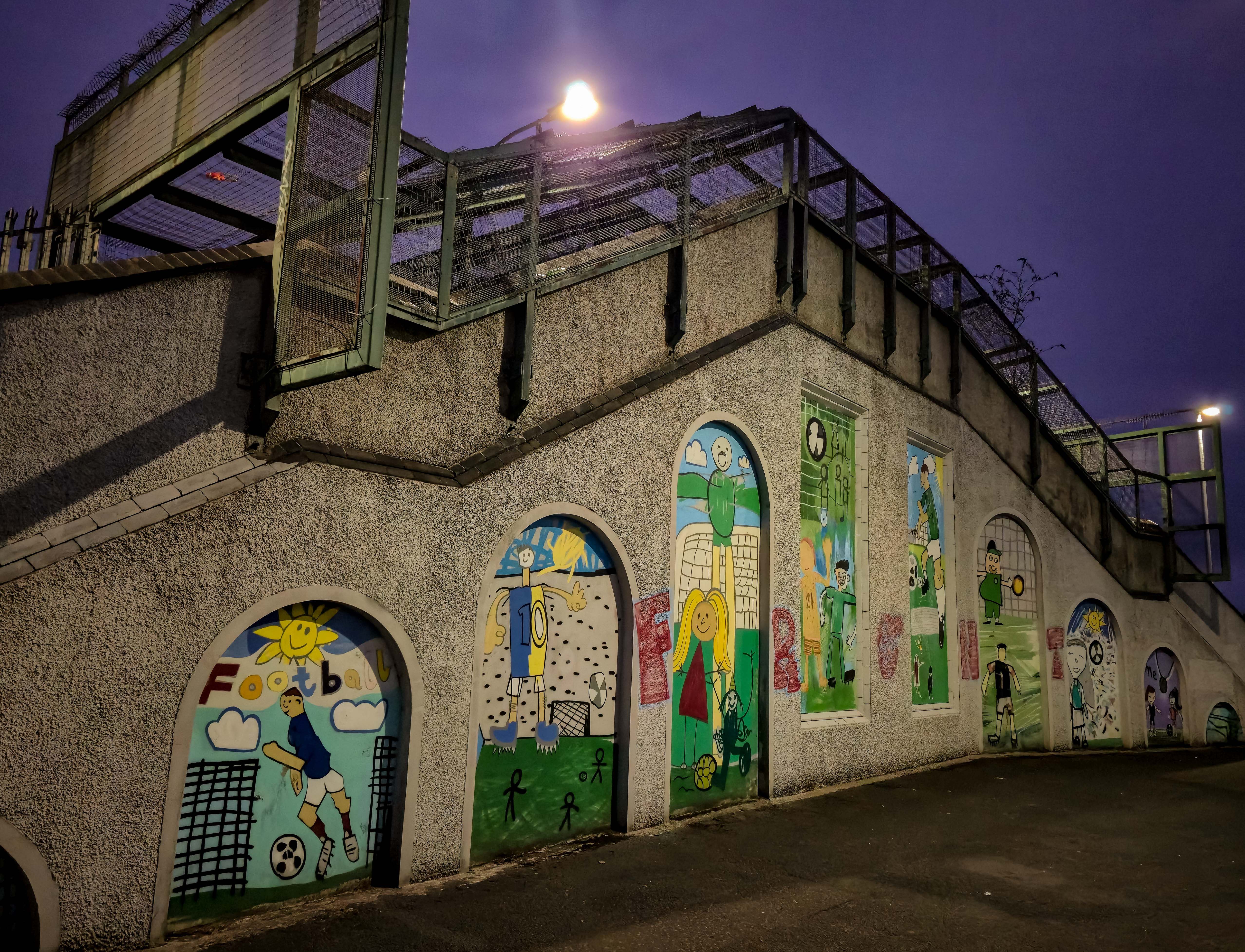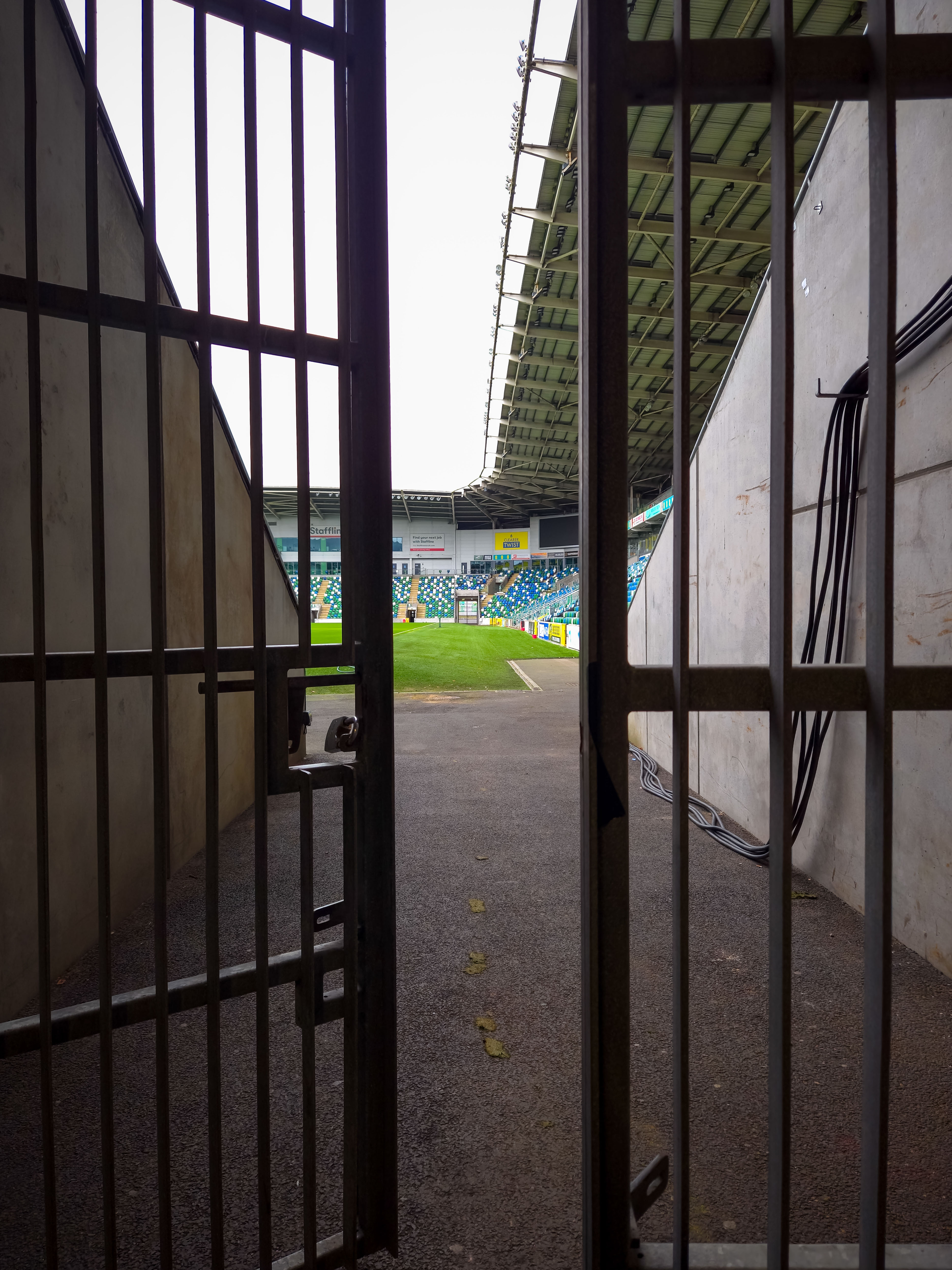 Ik ben alleen op pad. De wijk slaapt nog, maar Windsor Park ademt al. Geen pompeuze entree, geen boulevard van glas en staal, maar een poort die je bijna voorbij zou lopen. En toch: achter die poort klopt het hart van Linfield, de machtigste club van Noord‑Ierland. Hier wappert de Union Jack niet alleen op vlaggen, maar ook in overtuigingen. Dit is het domein van de protestantse gemeenschap, die Belfast ziet als deel van het Verenigd Koninkrijk. Zelfs in de stilte voel je dat dit stadion meer is dan beton en stoeltjes: het is een symbool, een stellingname, een thuis.