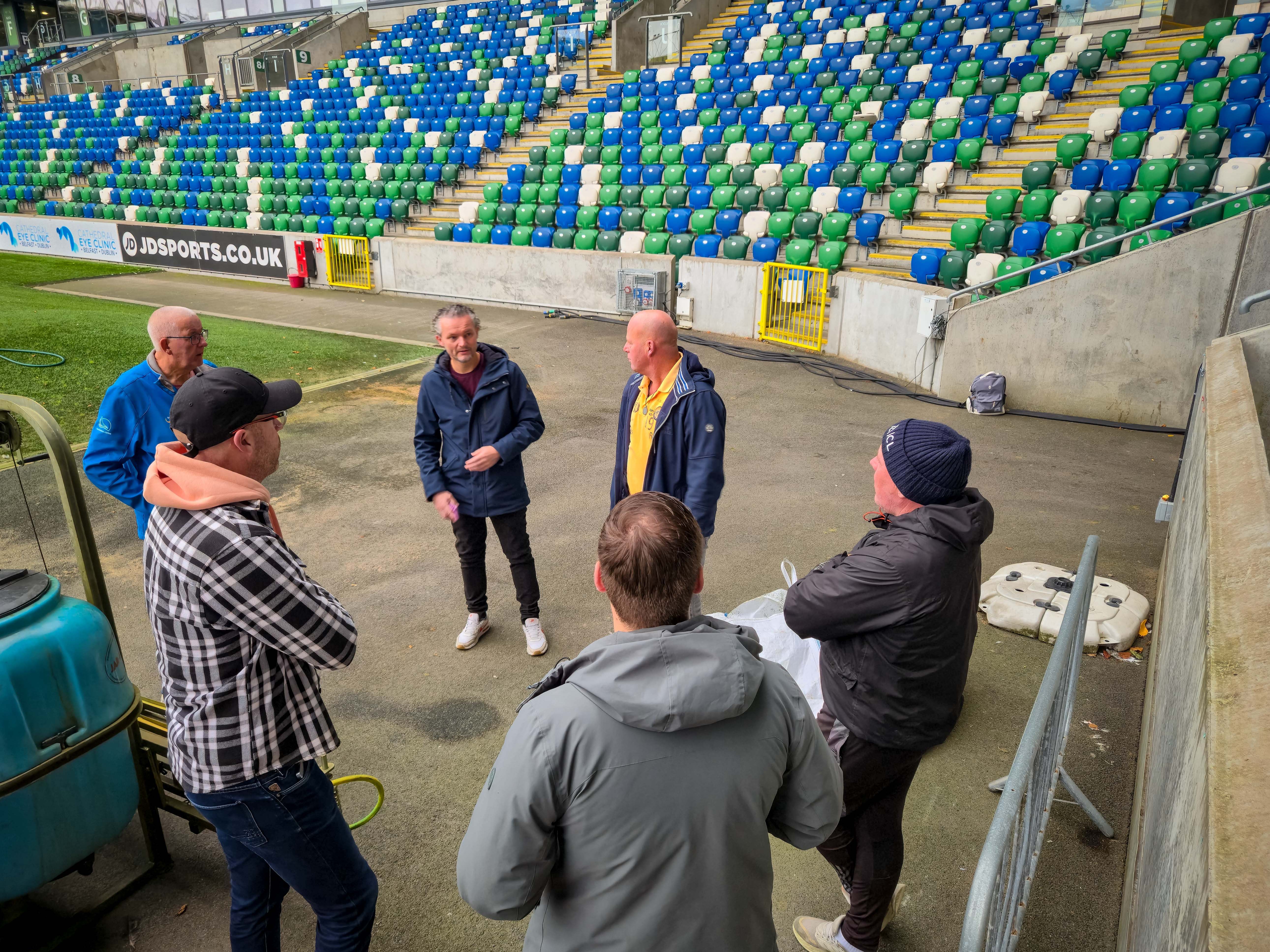De volgende ochtend sta ik opnieuw bij Windsor Park. Dit keer niet alleen, maar met al mijn maten. Het is matchday in Belfast, maar niet voor Linfield — vandaag speelt Glentoran. Toch vertelt Matt zijn verhaal opnieuw, met dezelfde passie, alsof de nacht niets heeft veranderd. En misschien is dat de essentie van Linfield: een club die groter is dan de competitie, een stadion dat nationaal symbool is, maar dat toch gedragen wordt door mensen als Matt. Terwijl de uitbreiding naar dertigduizend stoelen al in de lucht hangt, blijft hij gewoon het gras aaien. Grootmacht en eenvoud, naast elkaar.